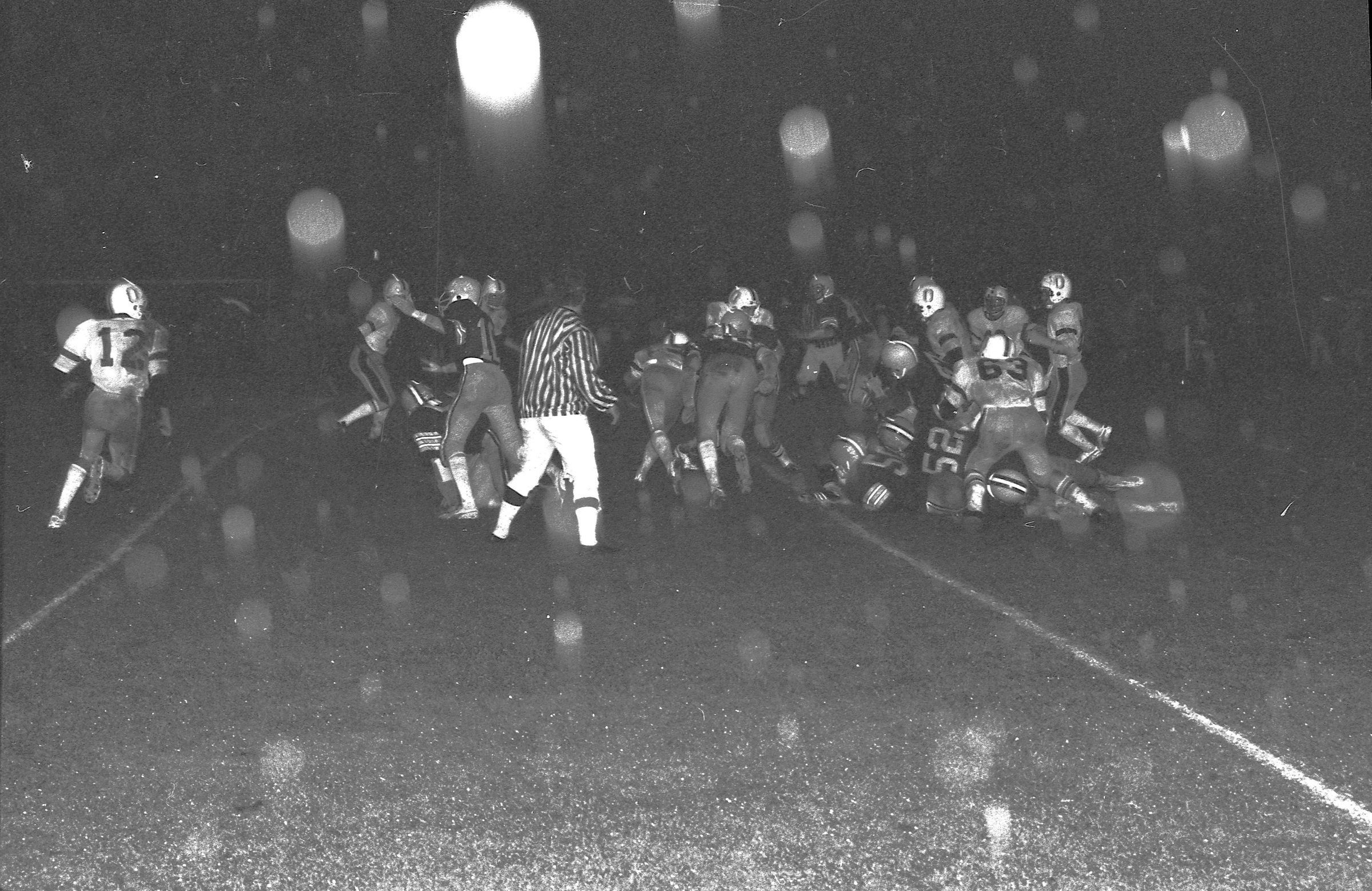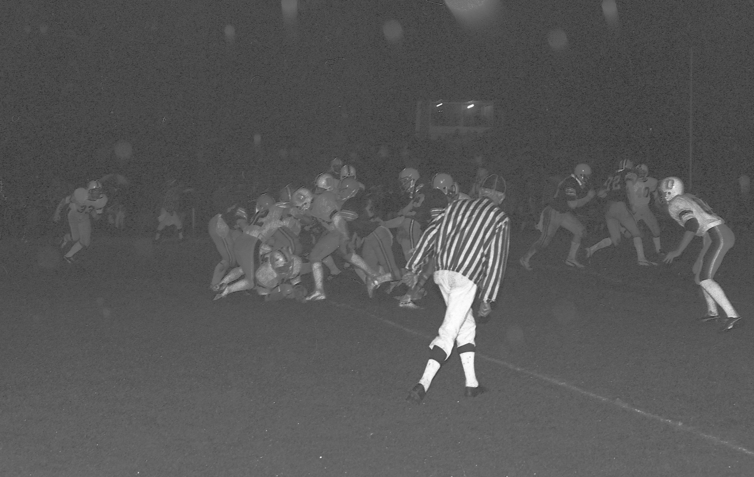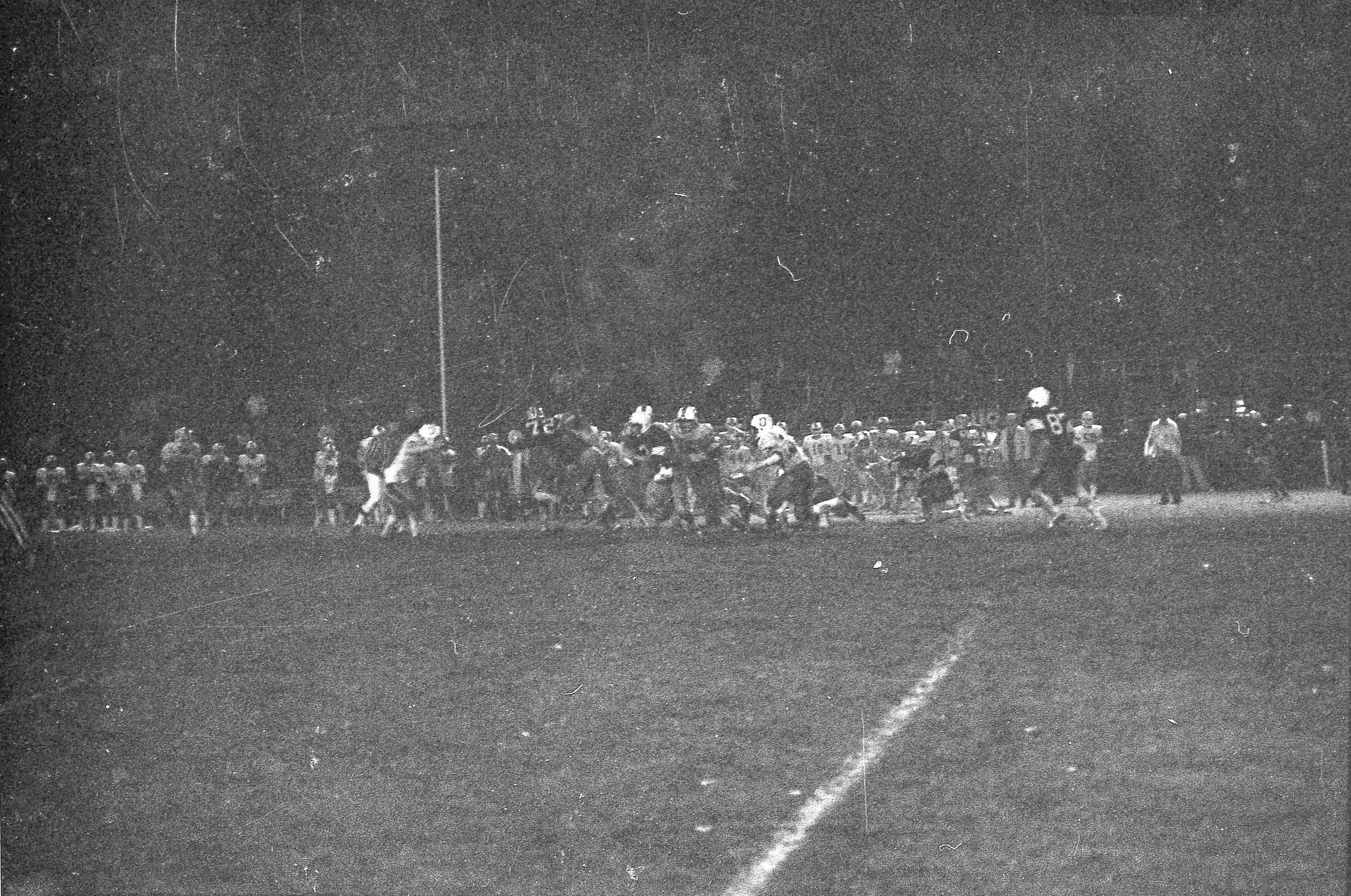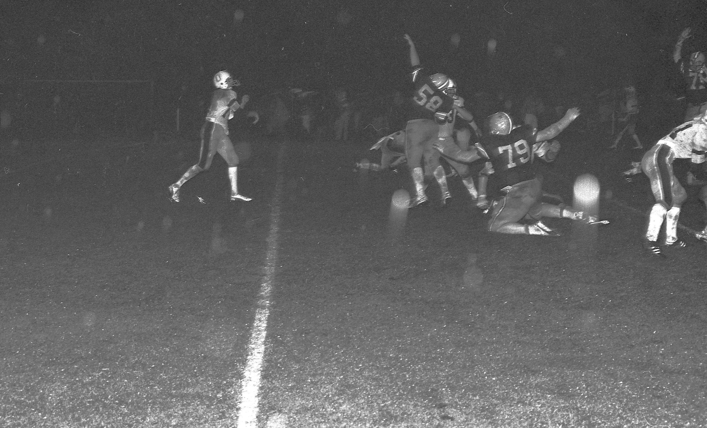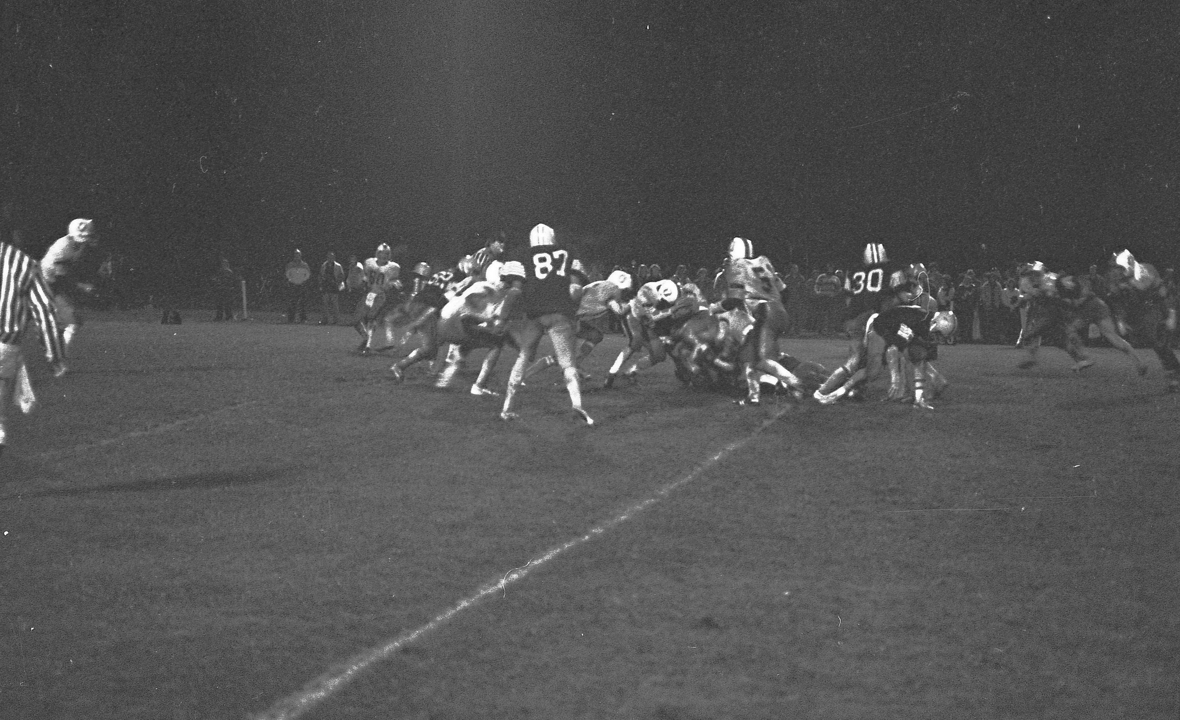 Football, 1979. These six black and white film negative strips were created for the Lacey Leader newspaper. These images show a (likely high school) football game being played.Made/Created