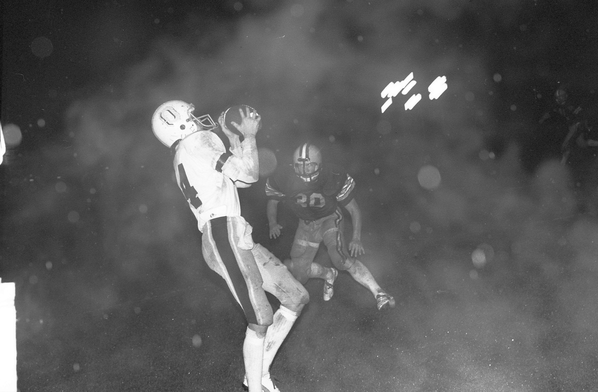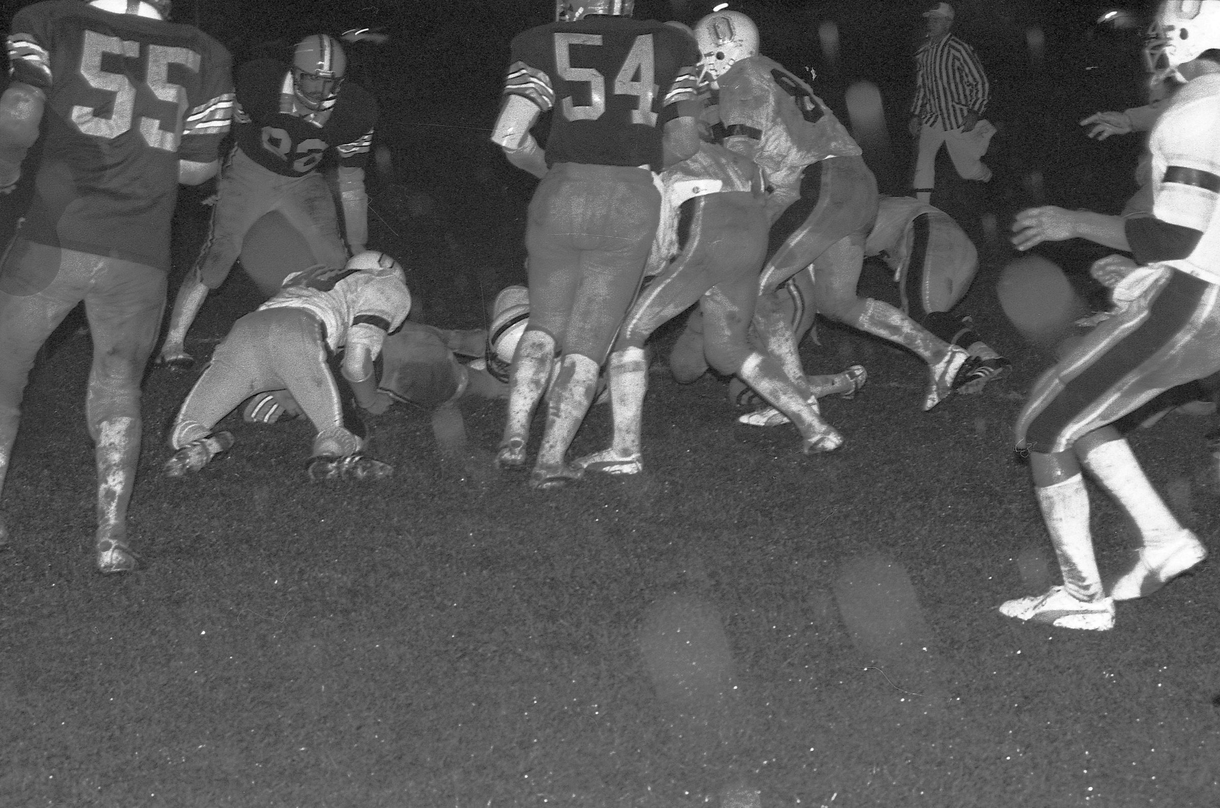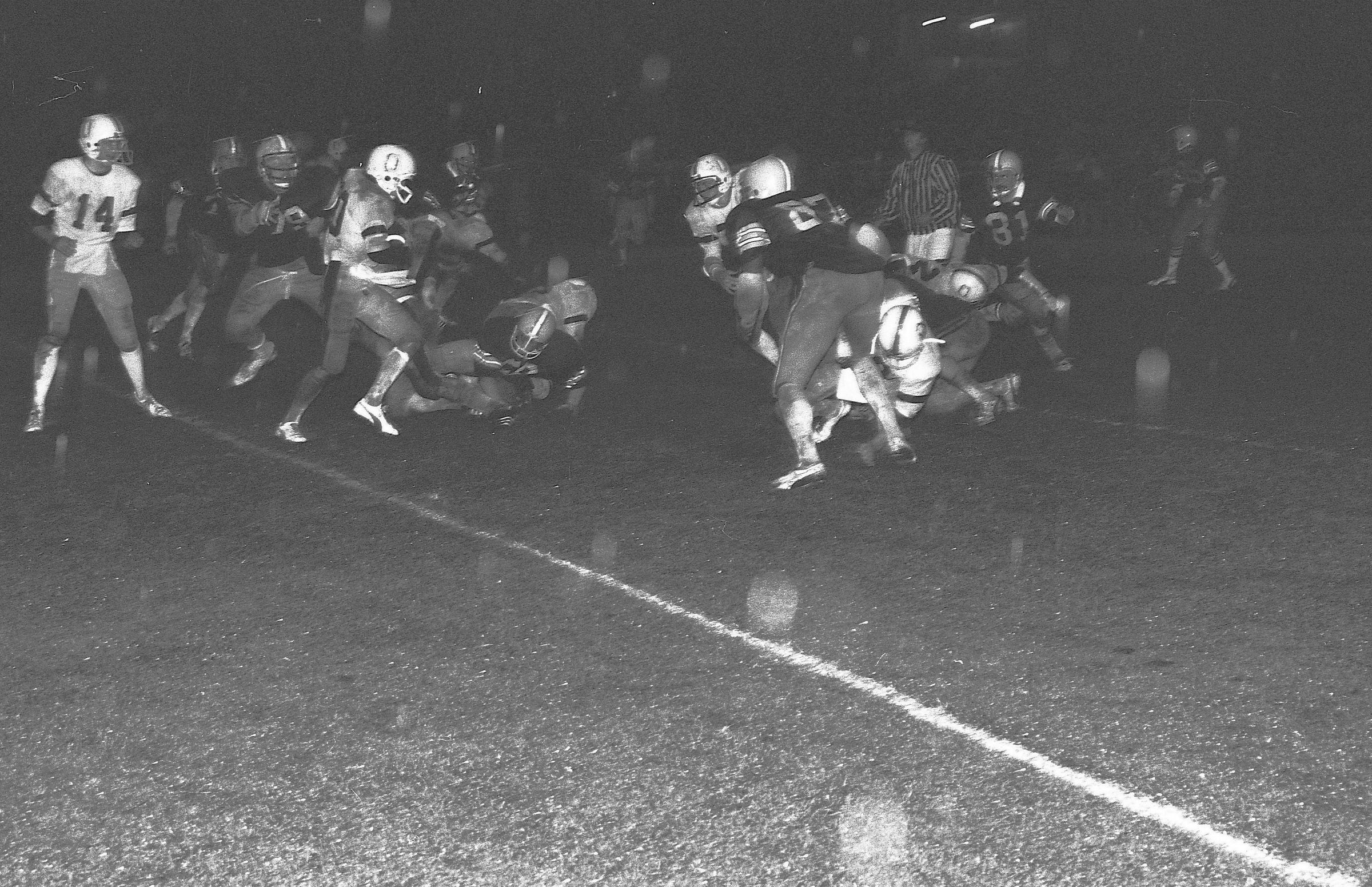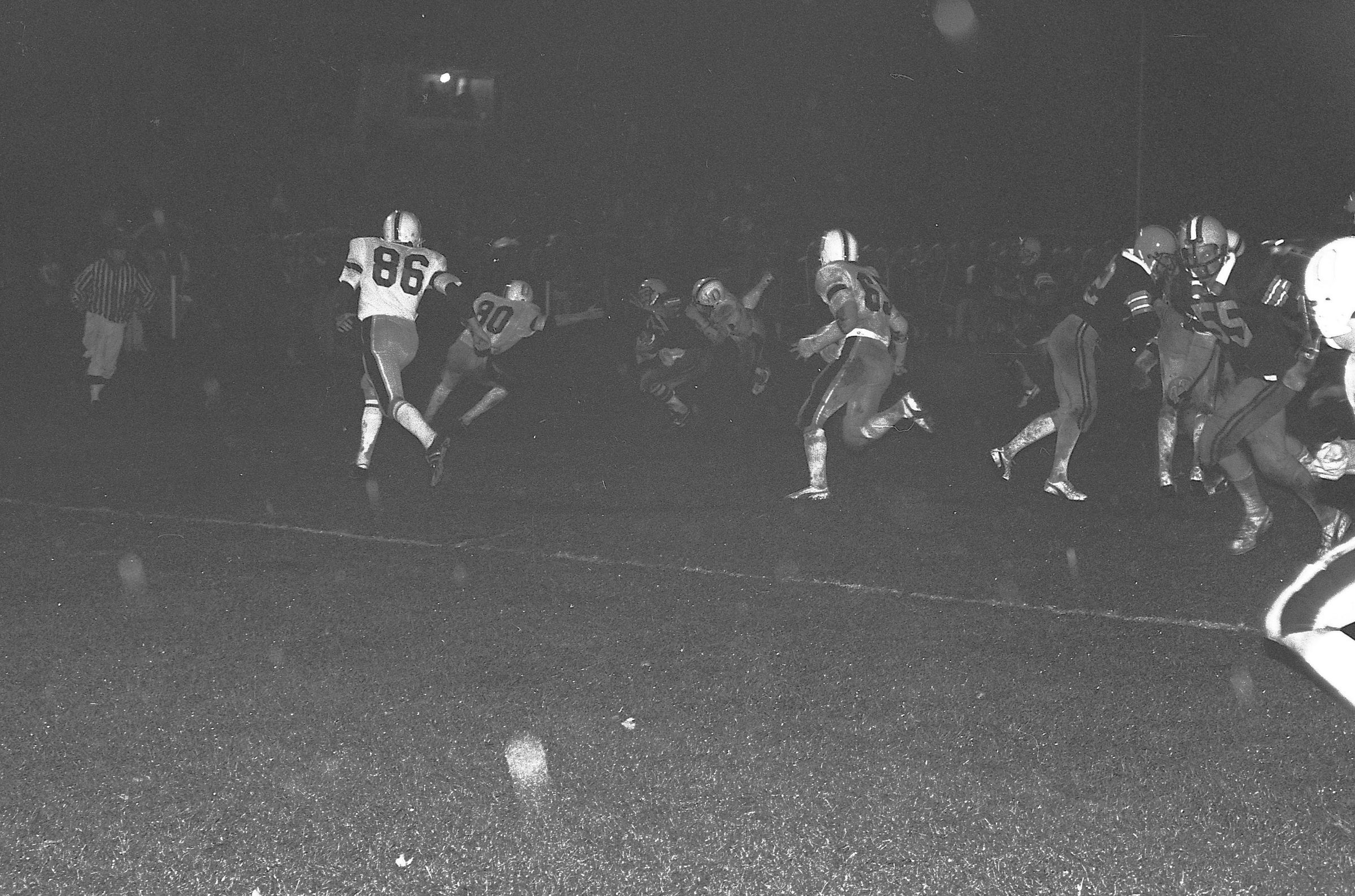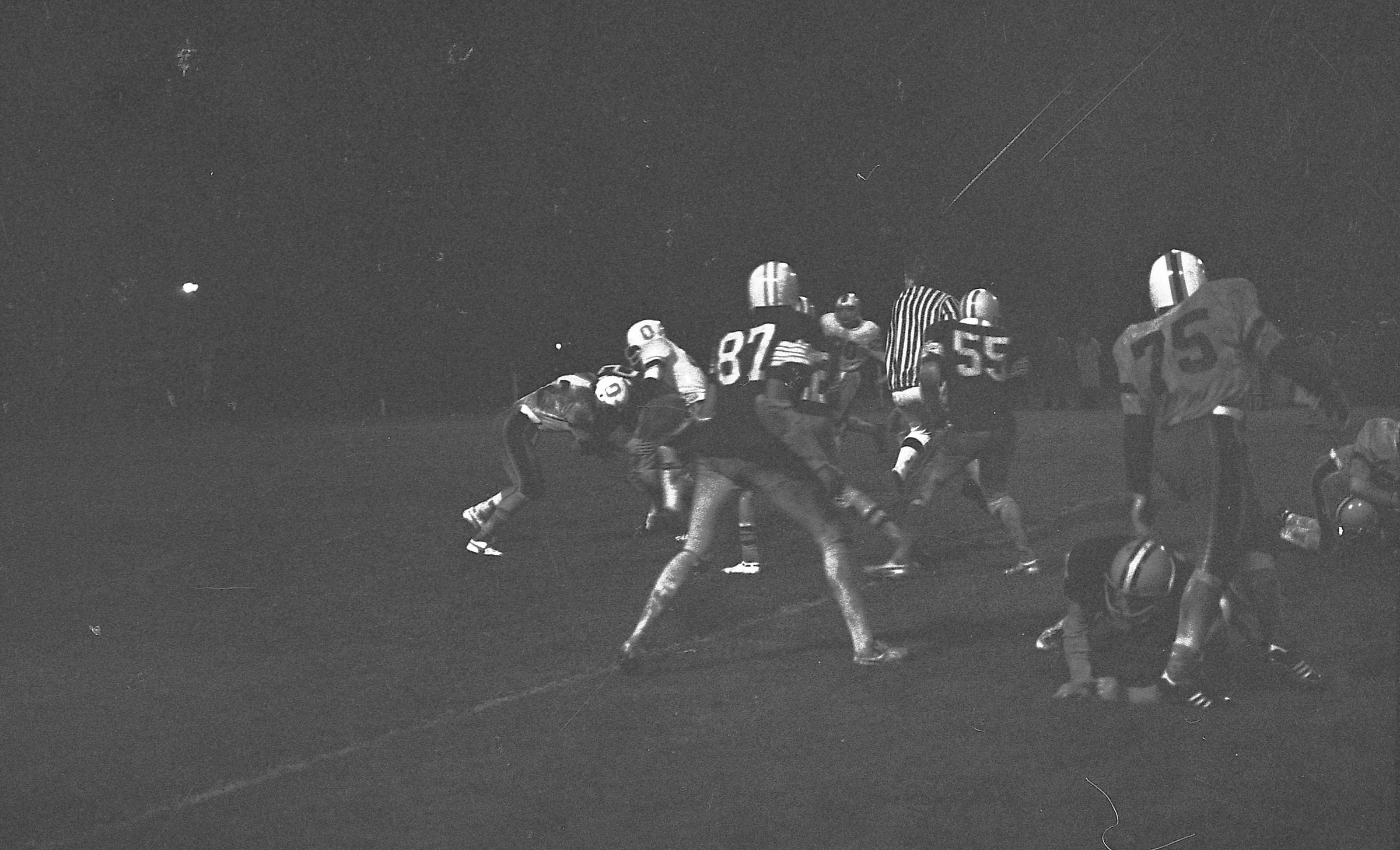 Football, 1979. These six black and white film negative strips were created for the Lacey Leader newspaper. These images show a (likely high school) football game being played.Made/Created