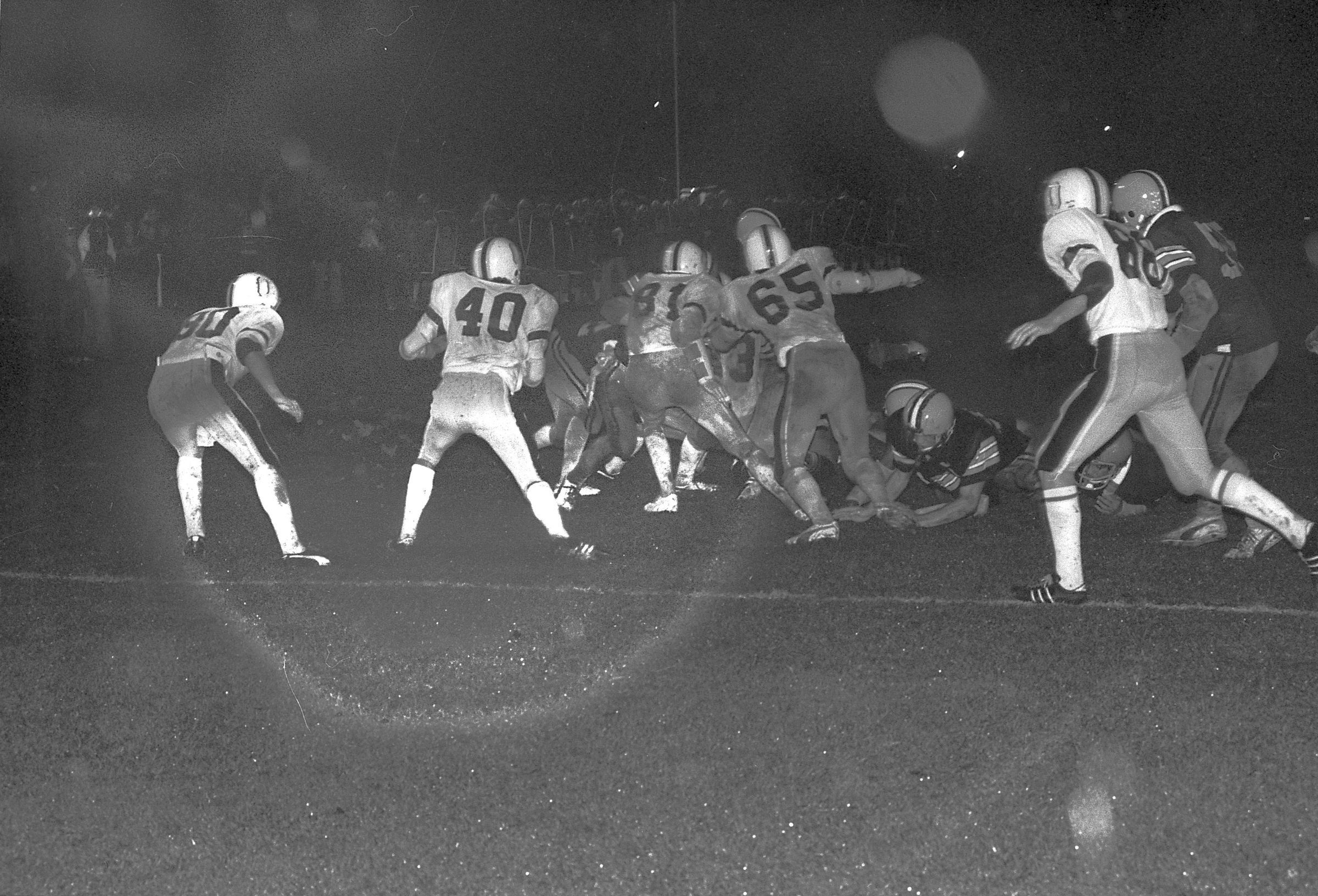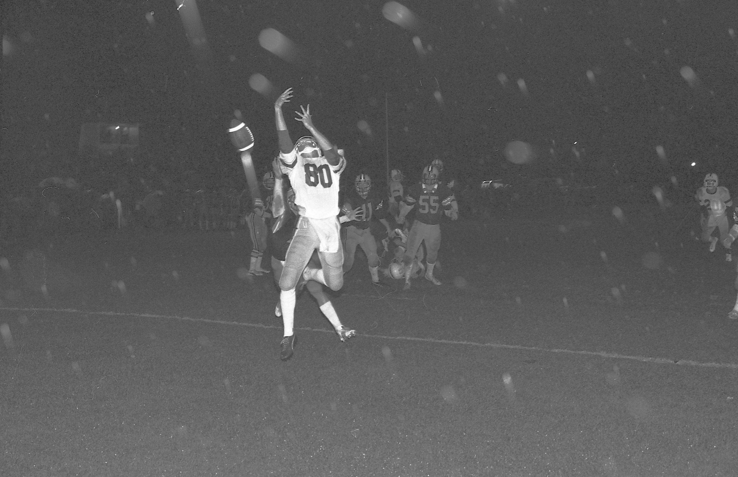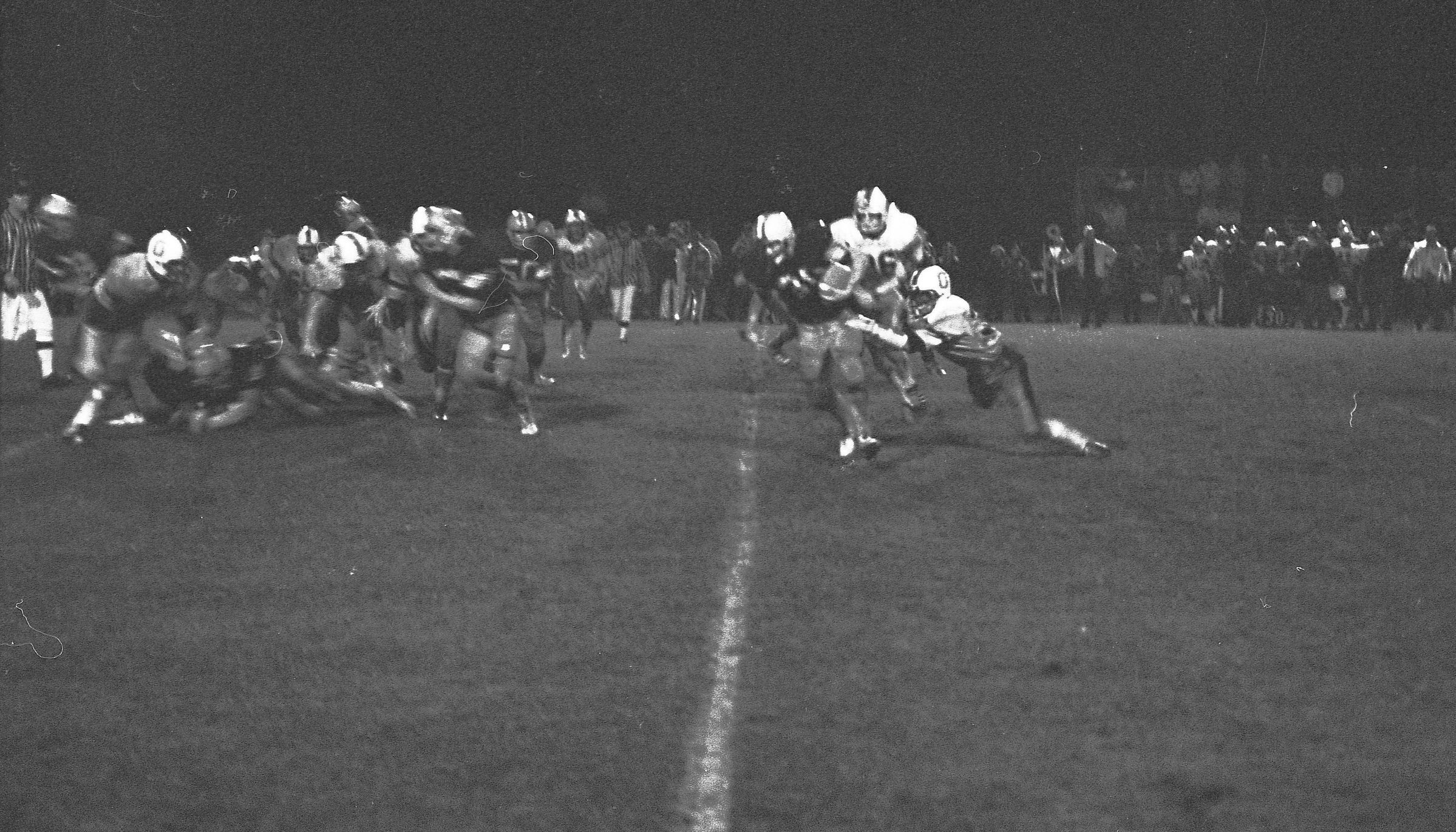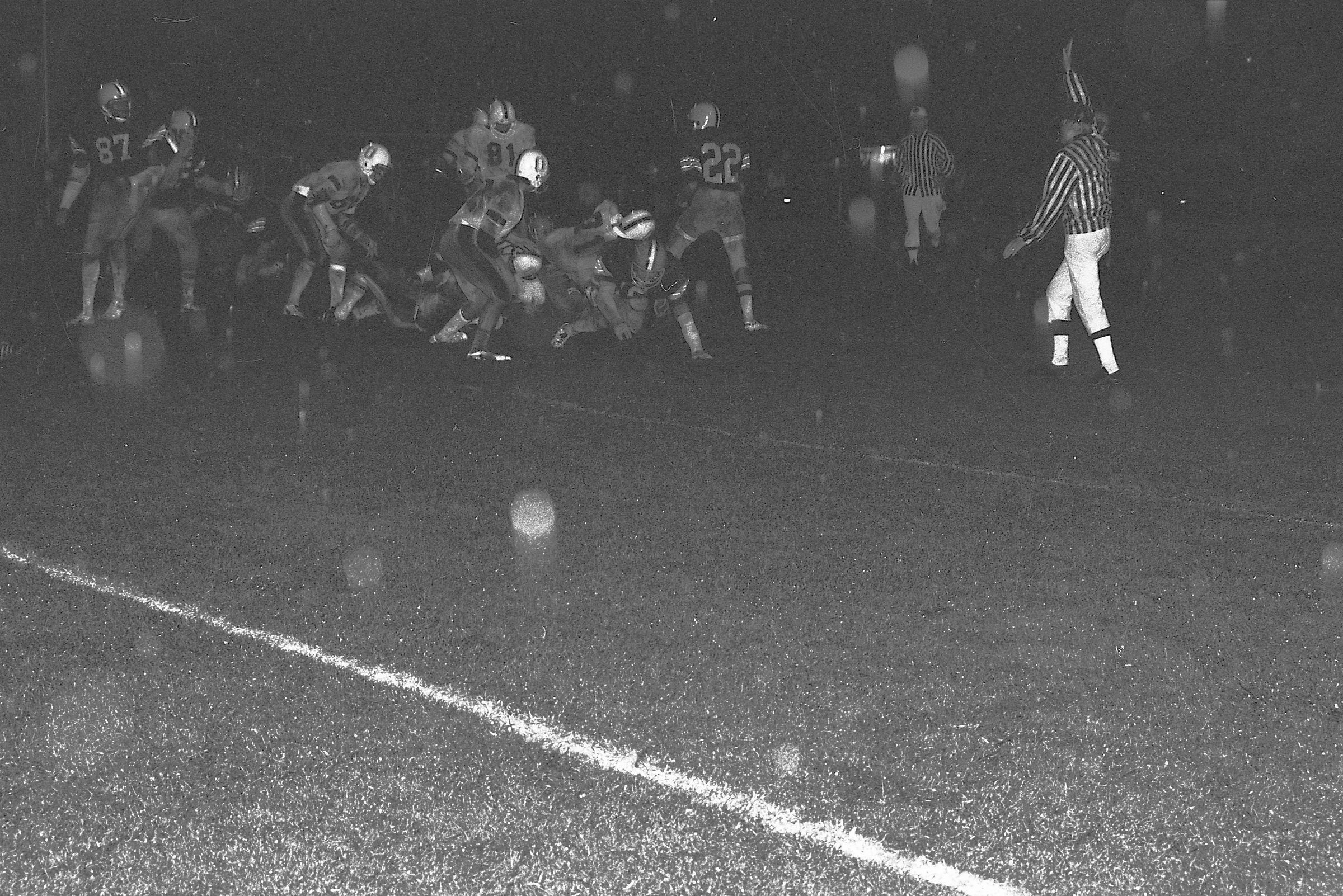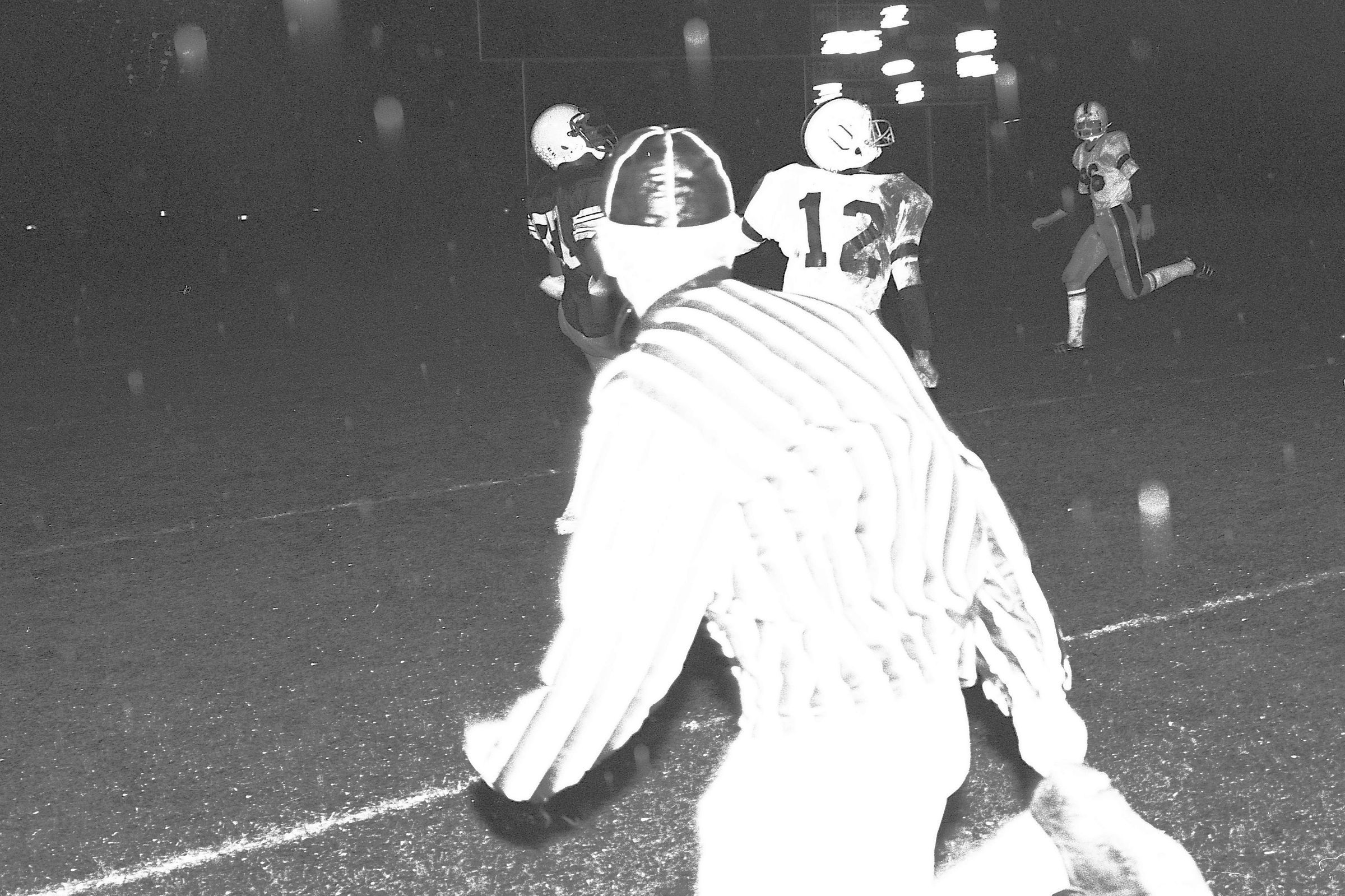 Football, 1979. These six black and white film negative strips were created for the Lacey Leader newspaper. These images show a (likely high school) football game being played.Made/Created