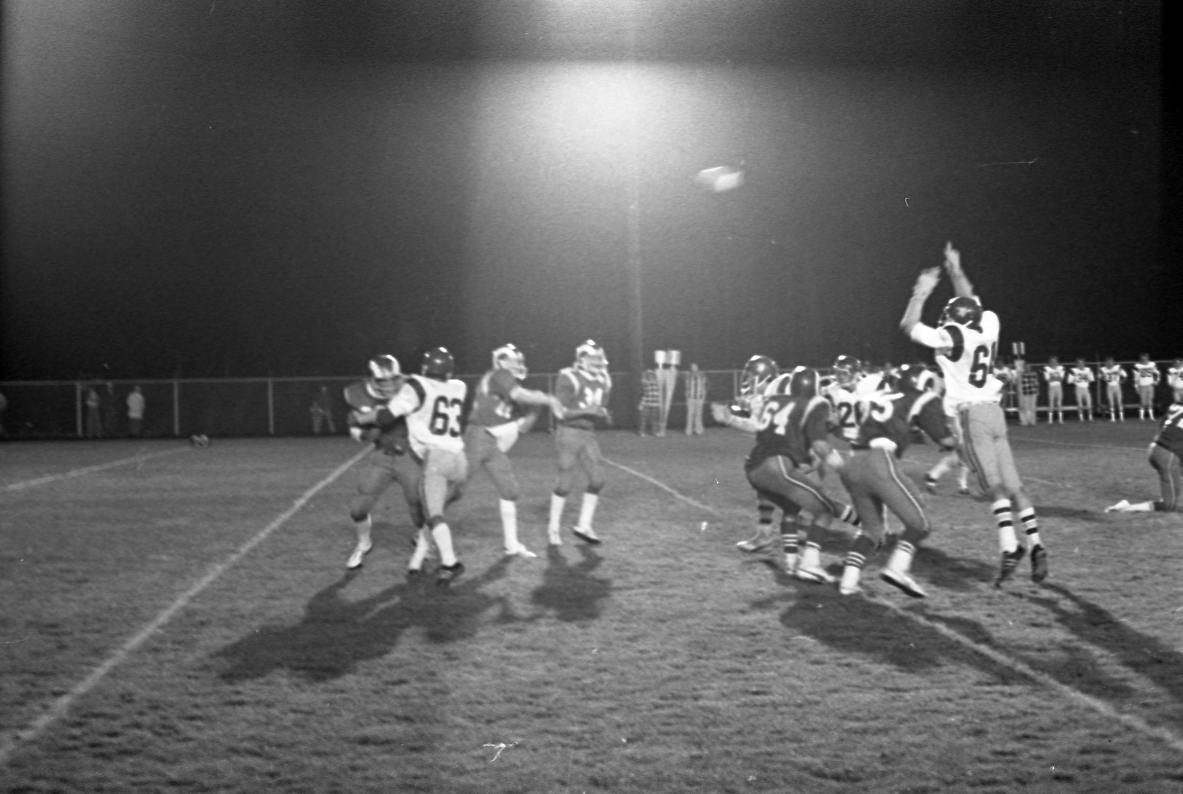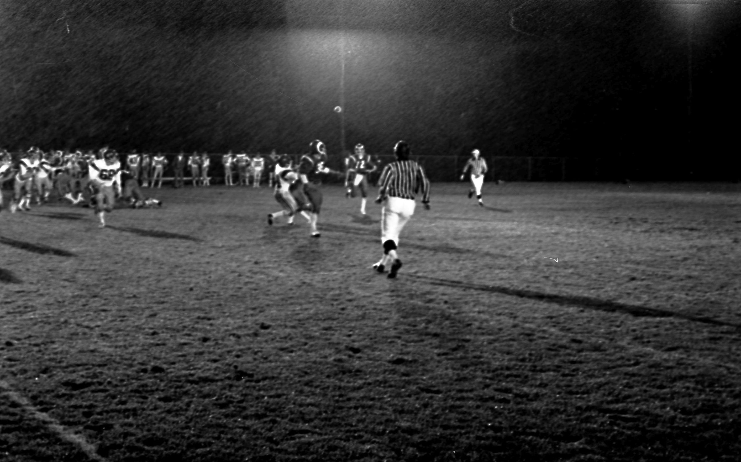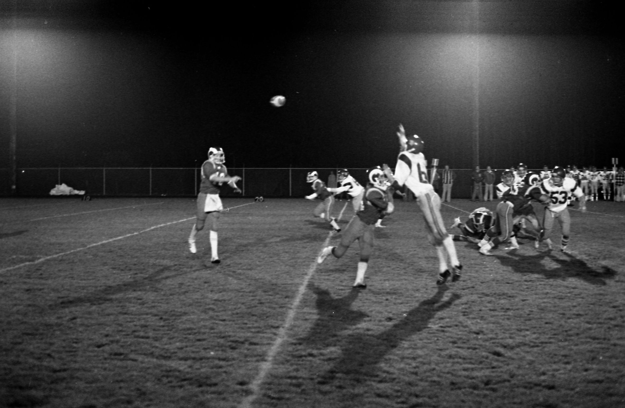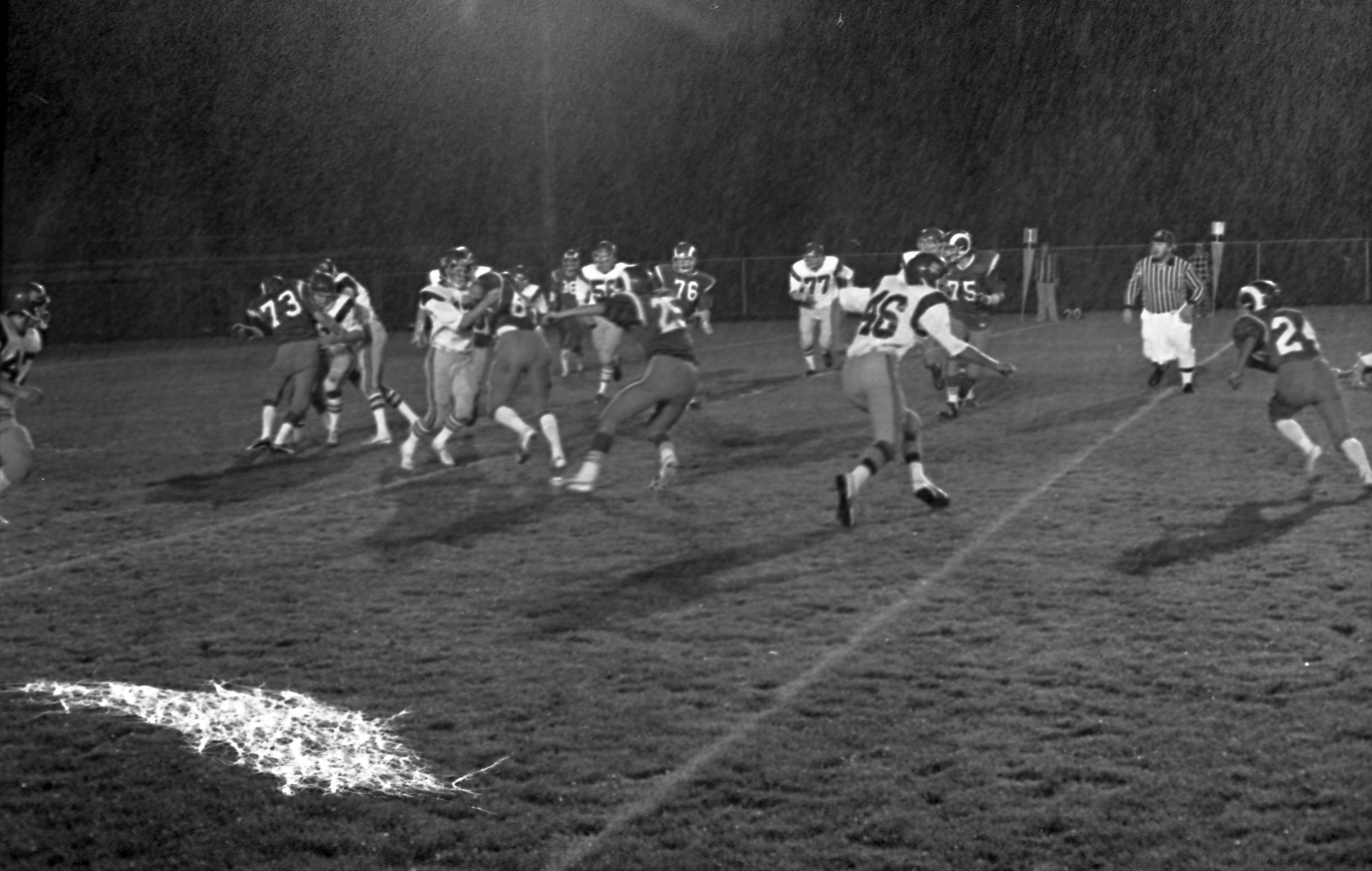 H. S. Football, 09-07-1979. These five black and white negative film strips were created for the Lacey Leader newspaper. They depict a football game. It is unclear which two teams are playing.Made/Created