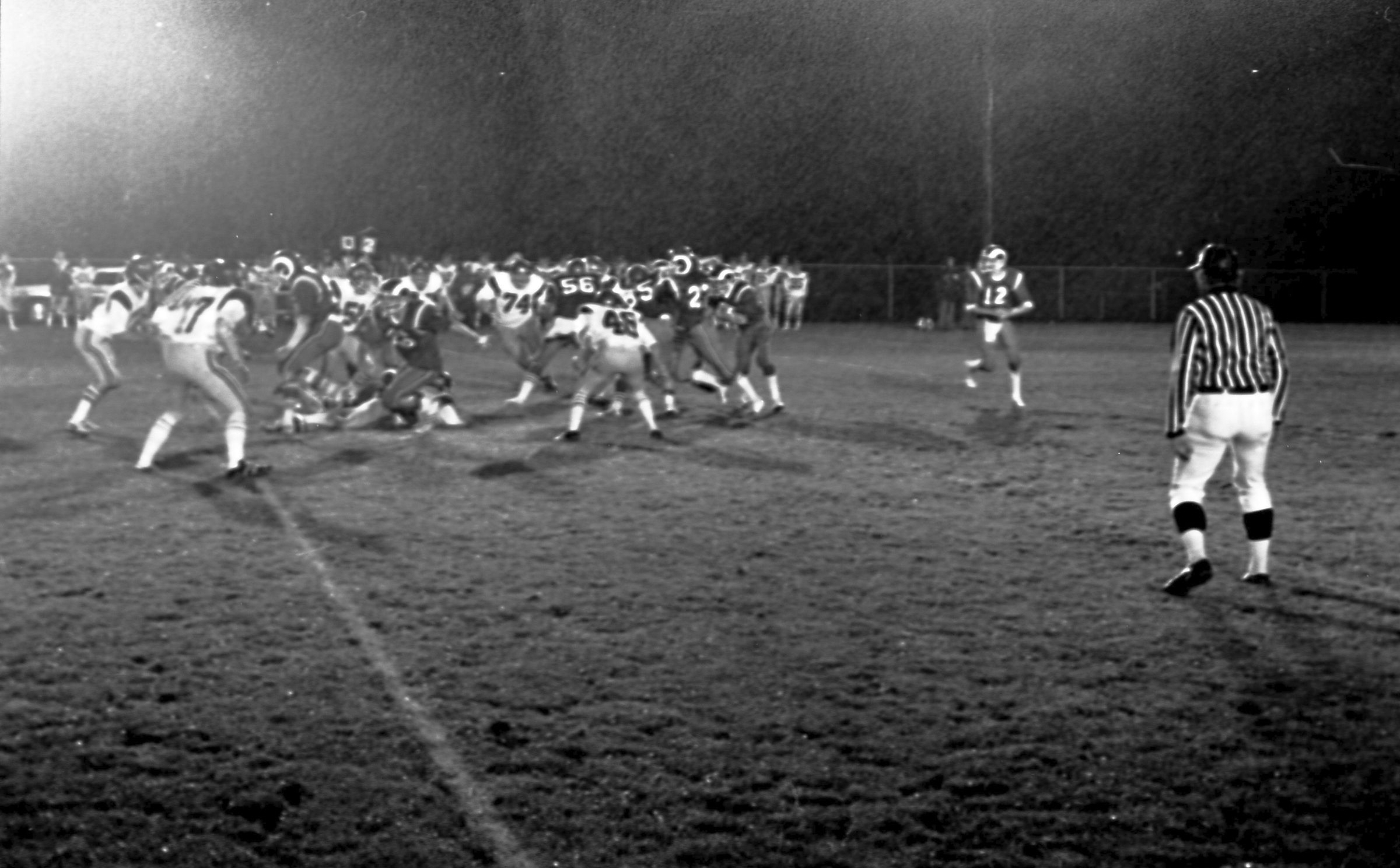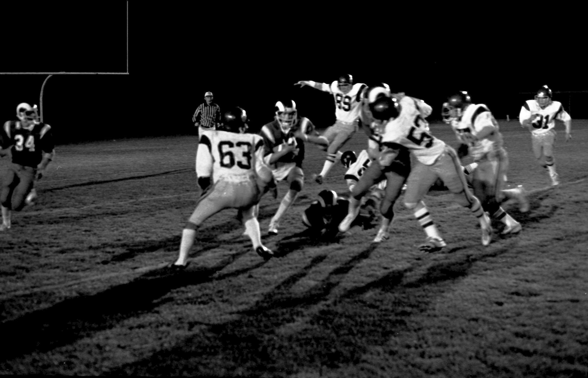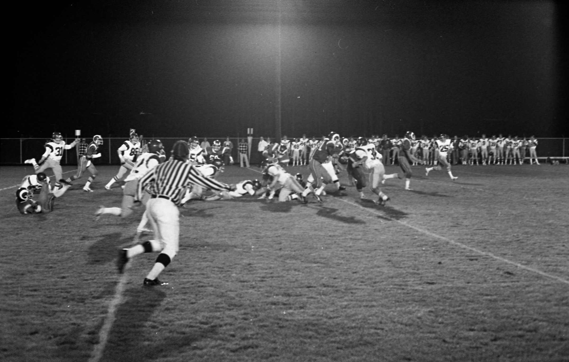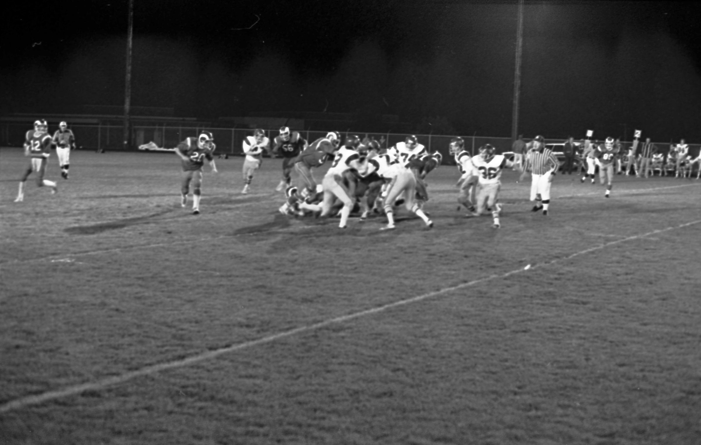 H. S. Football, 09-07-1979. These five black and white negative film strips were created for the Lacey Leader newspaper. They depict a football game. It is unclear which two teams are playing.Made/Created