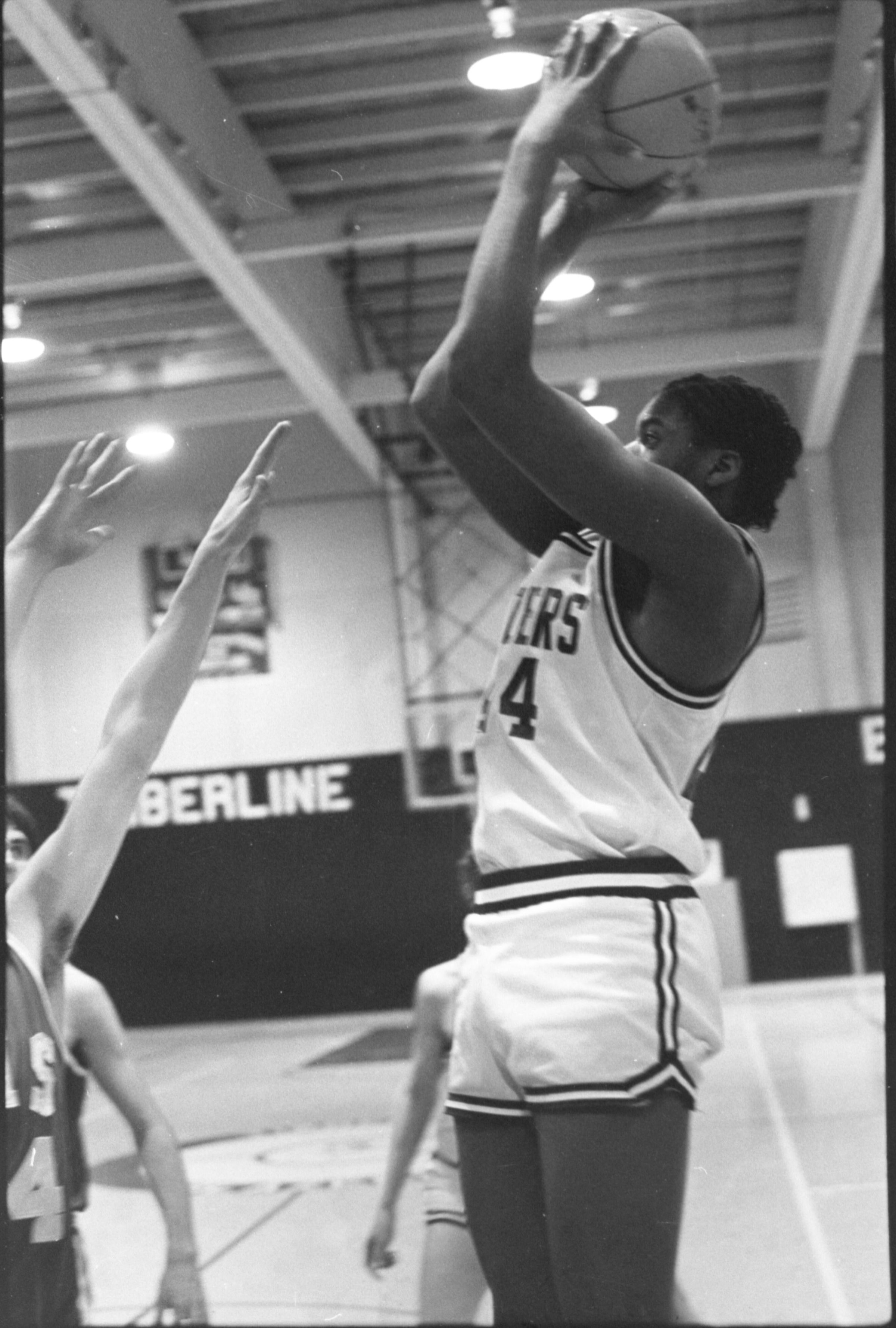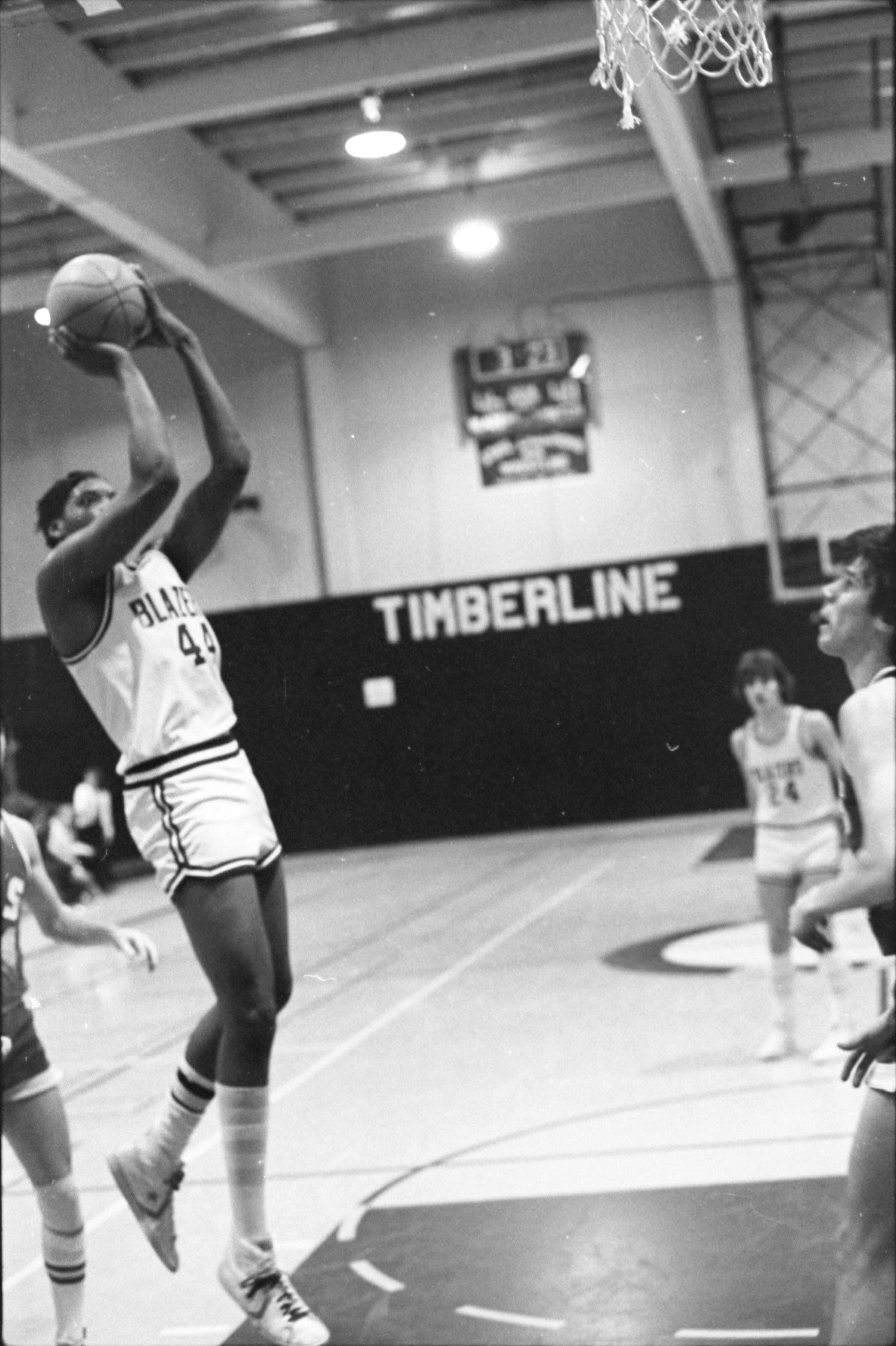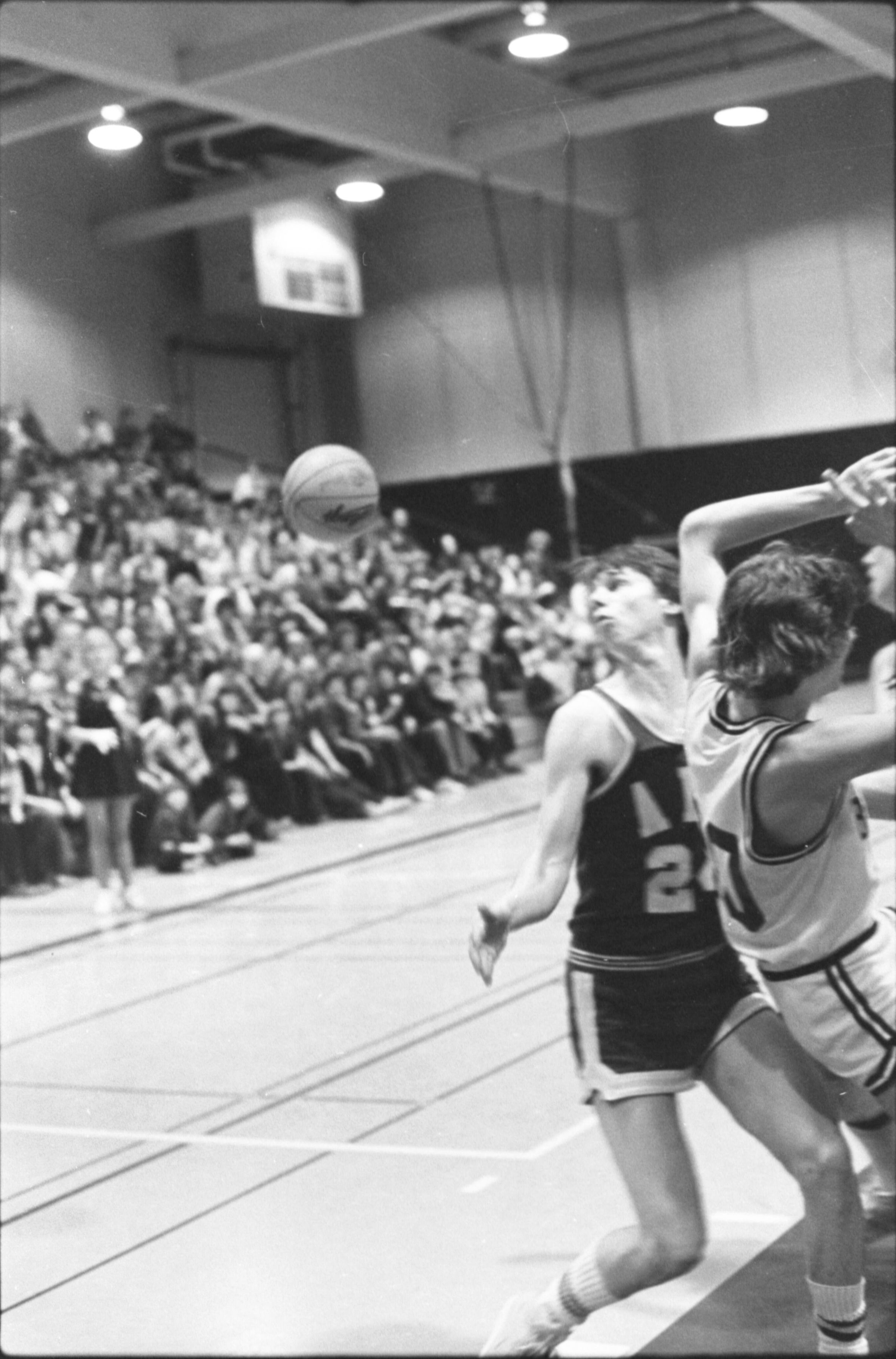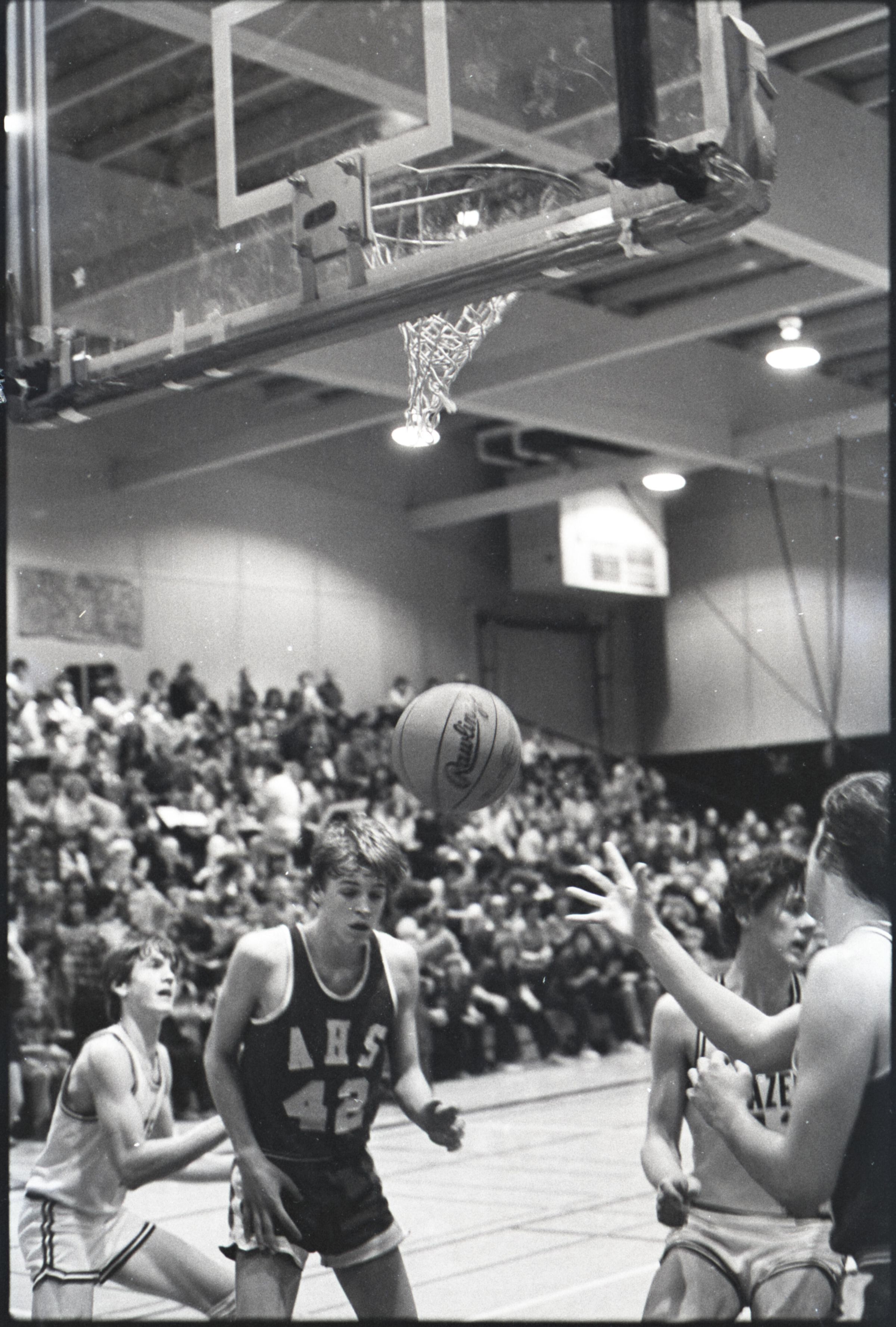Blazers vs. Rams Basketball, 02-01-1980. These six black and white negative film strips were created for the Lacey Leader newspaper. They depict a basketball game between Timberline High School Blazers and Aberdeen High School (AHS). The game took place at Timberline High School.Made/Created