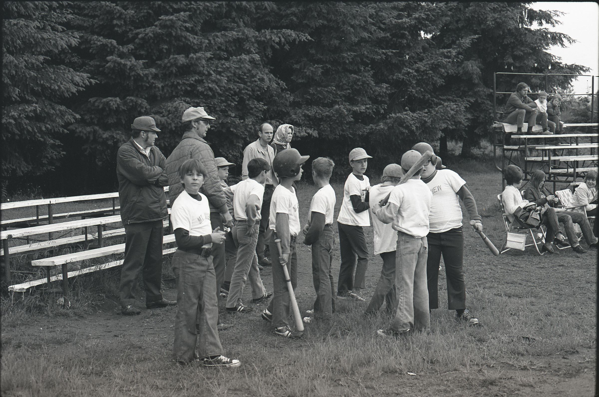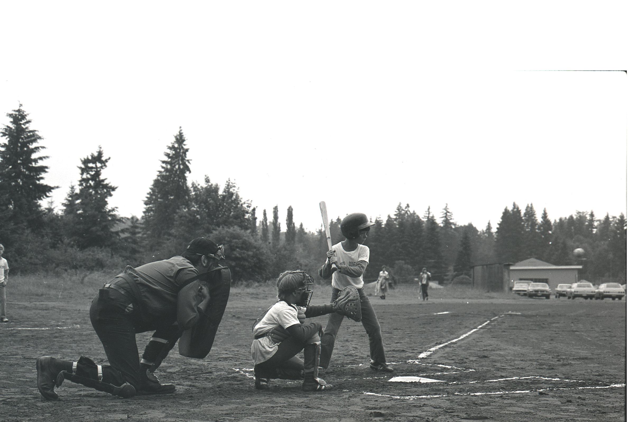 Little League Playoff, Unknown Date. This single black and white film negative strip was created for the Lacey Leader newspaper. These images show scenes from a little league game.Made/Created