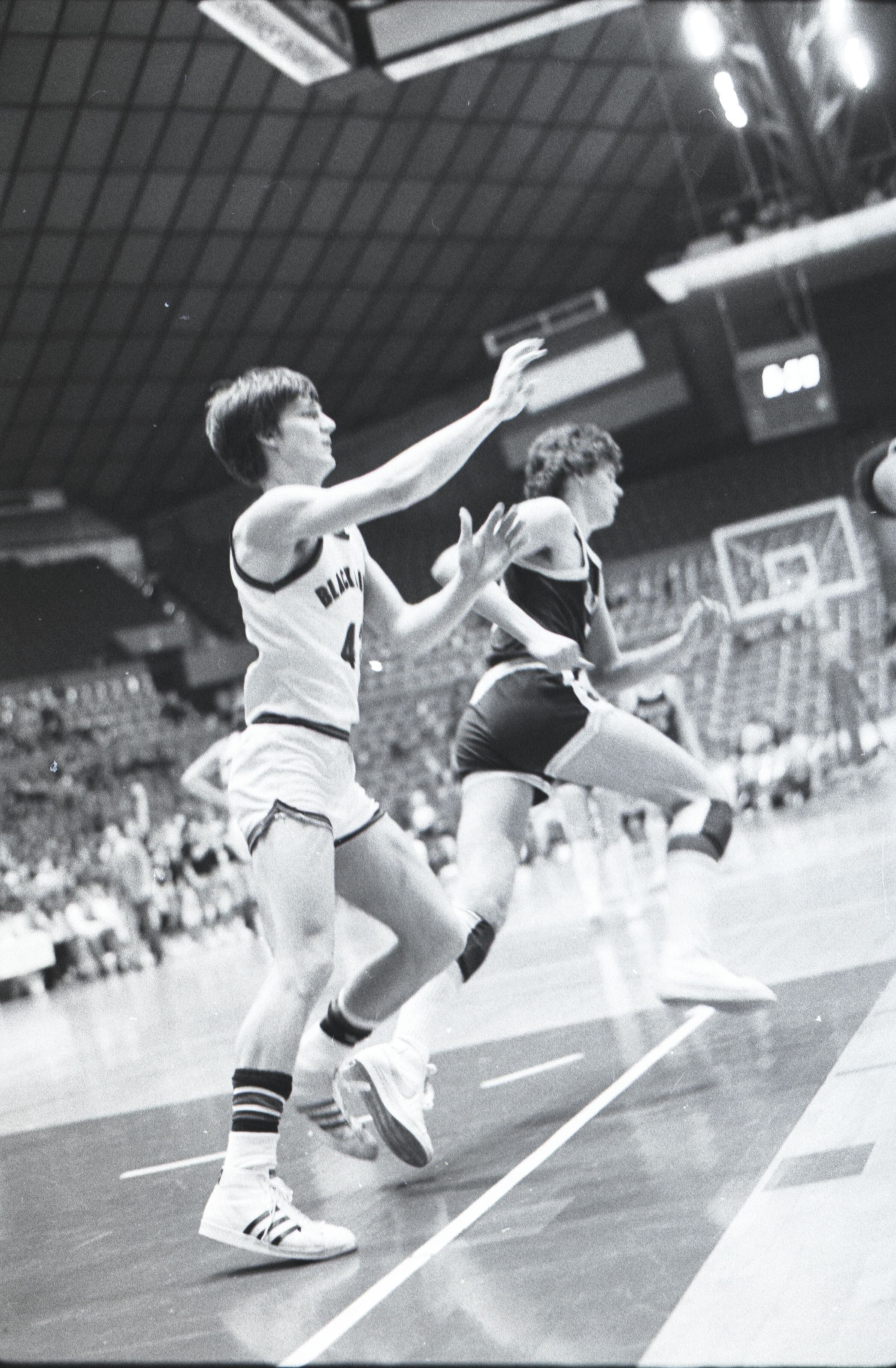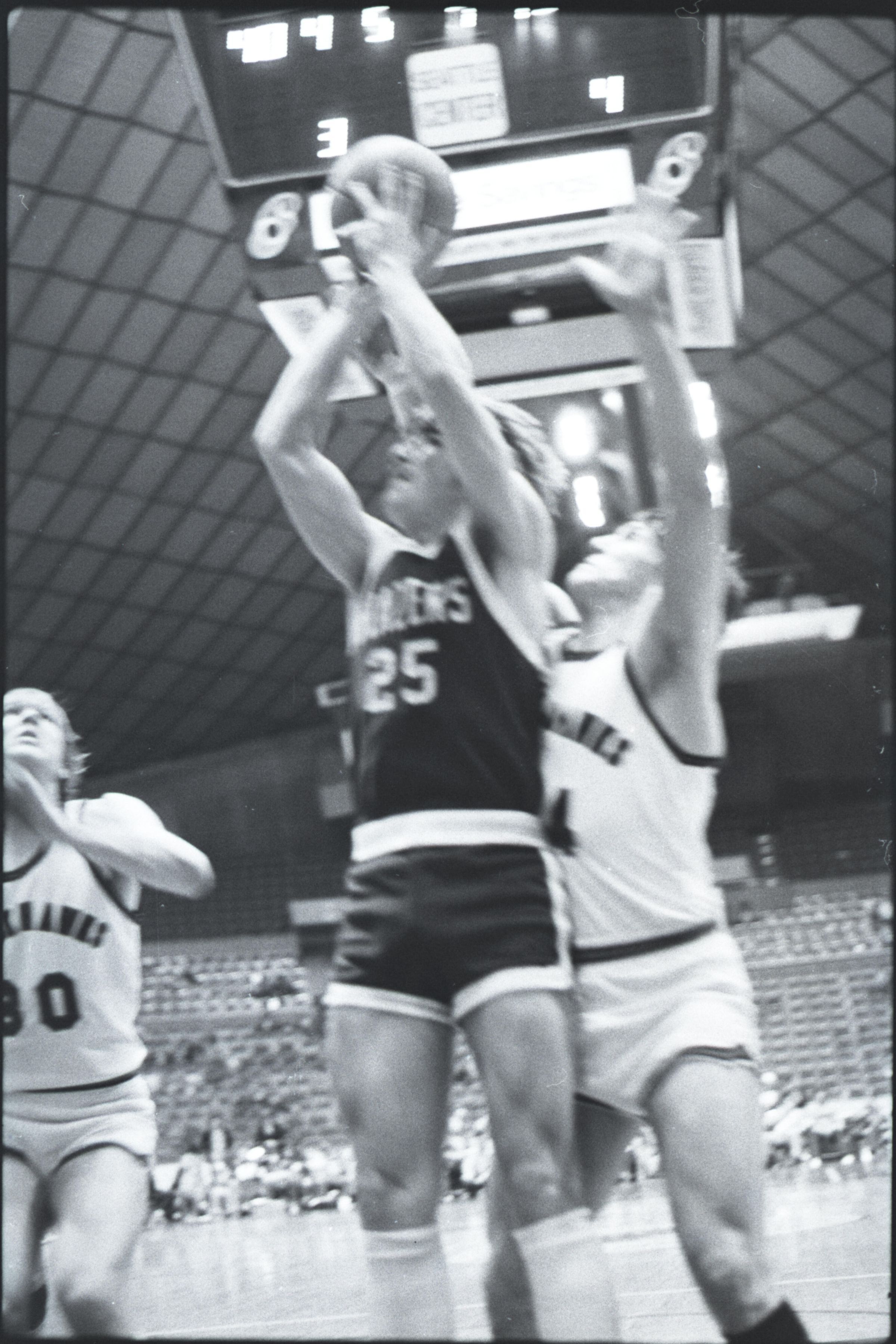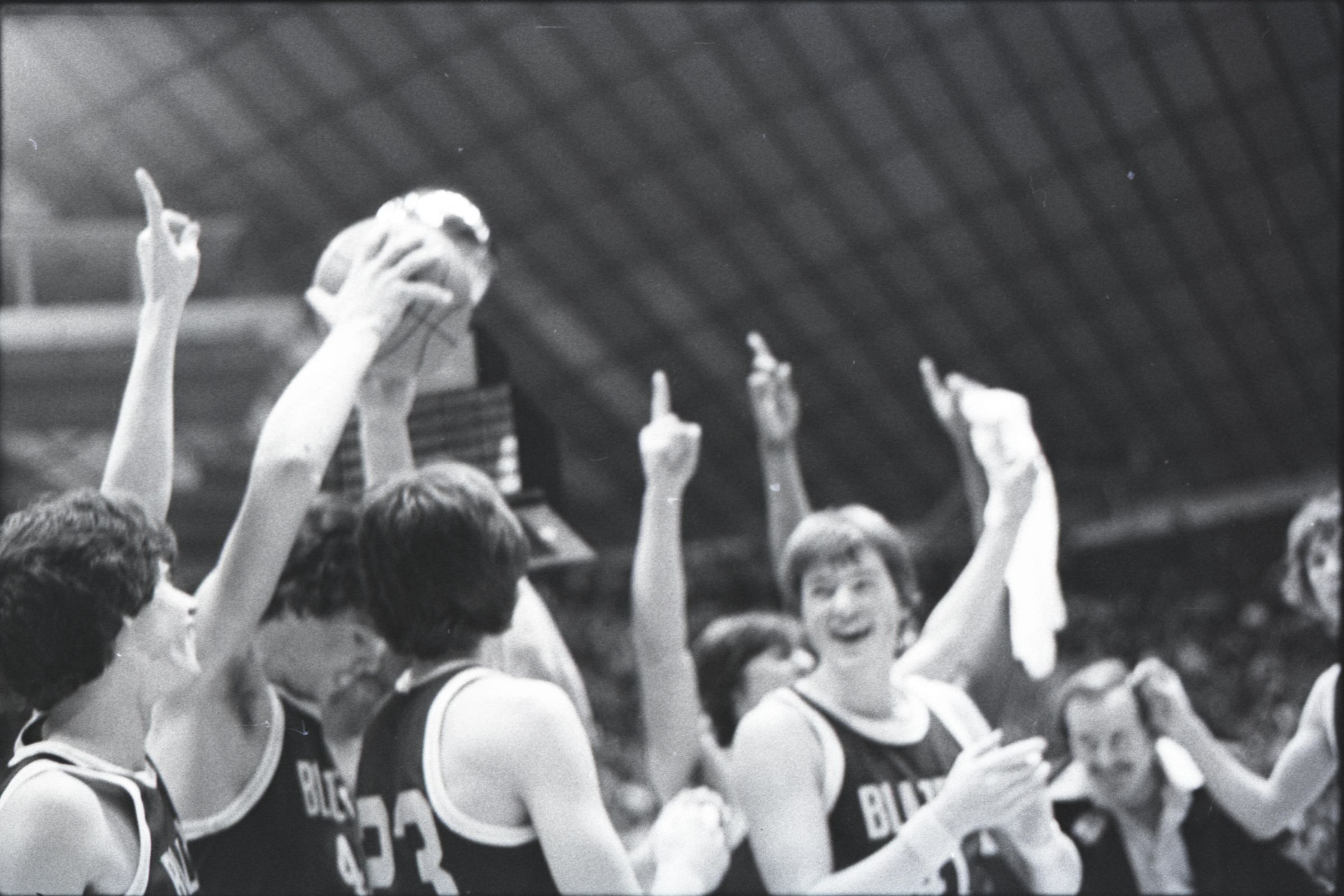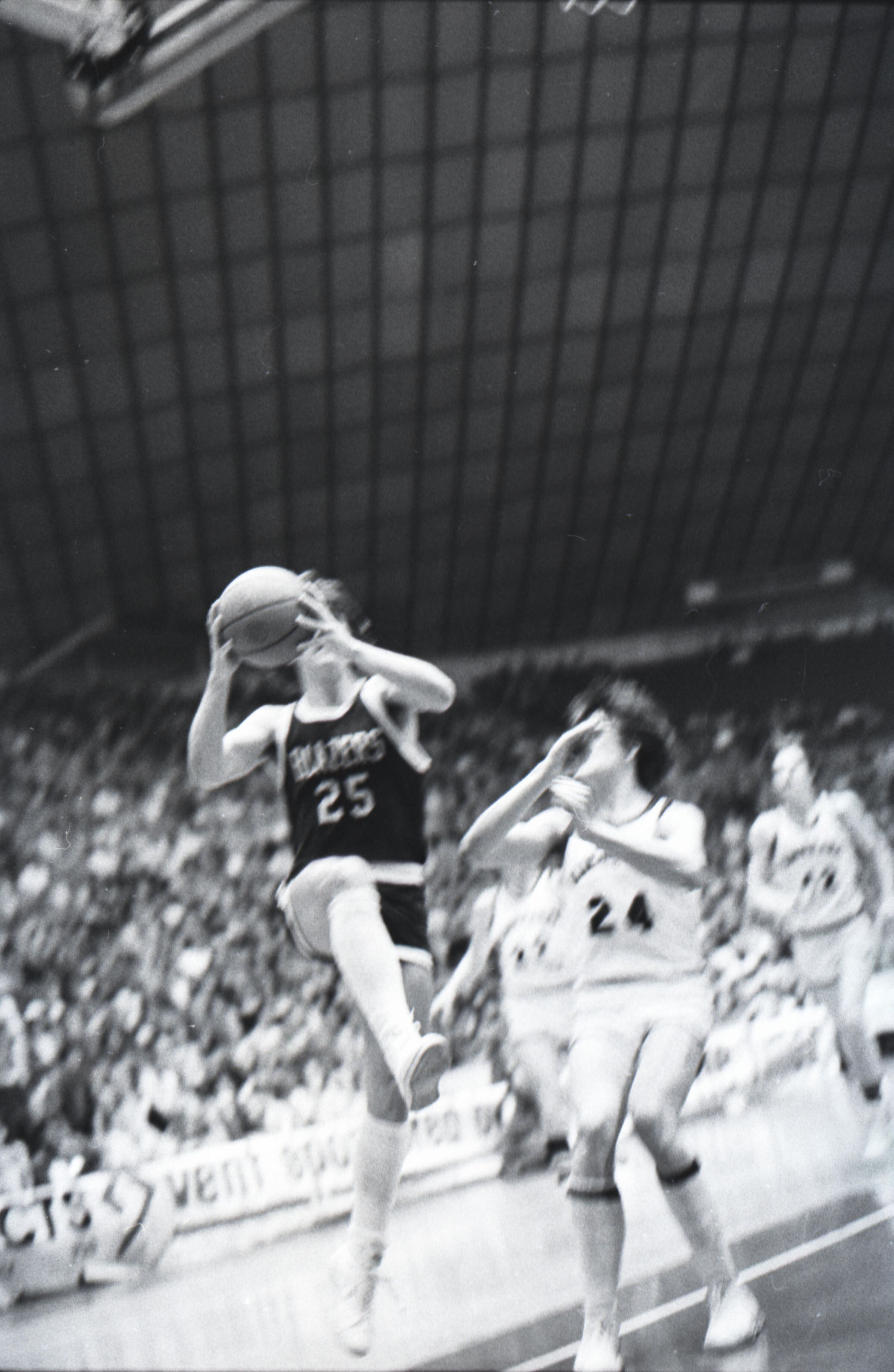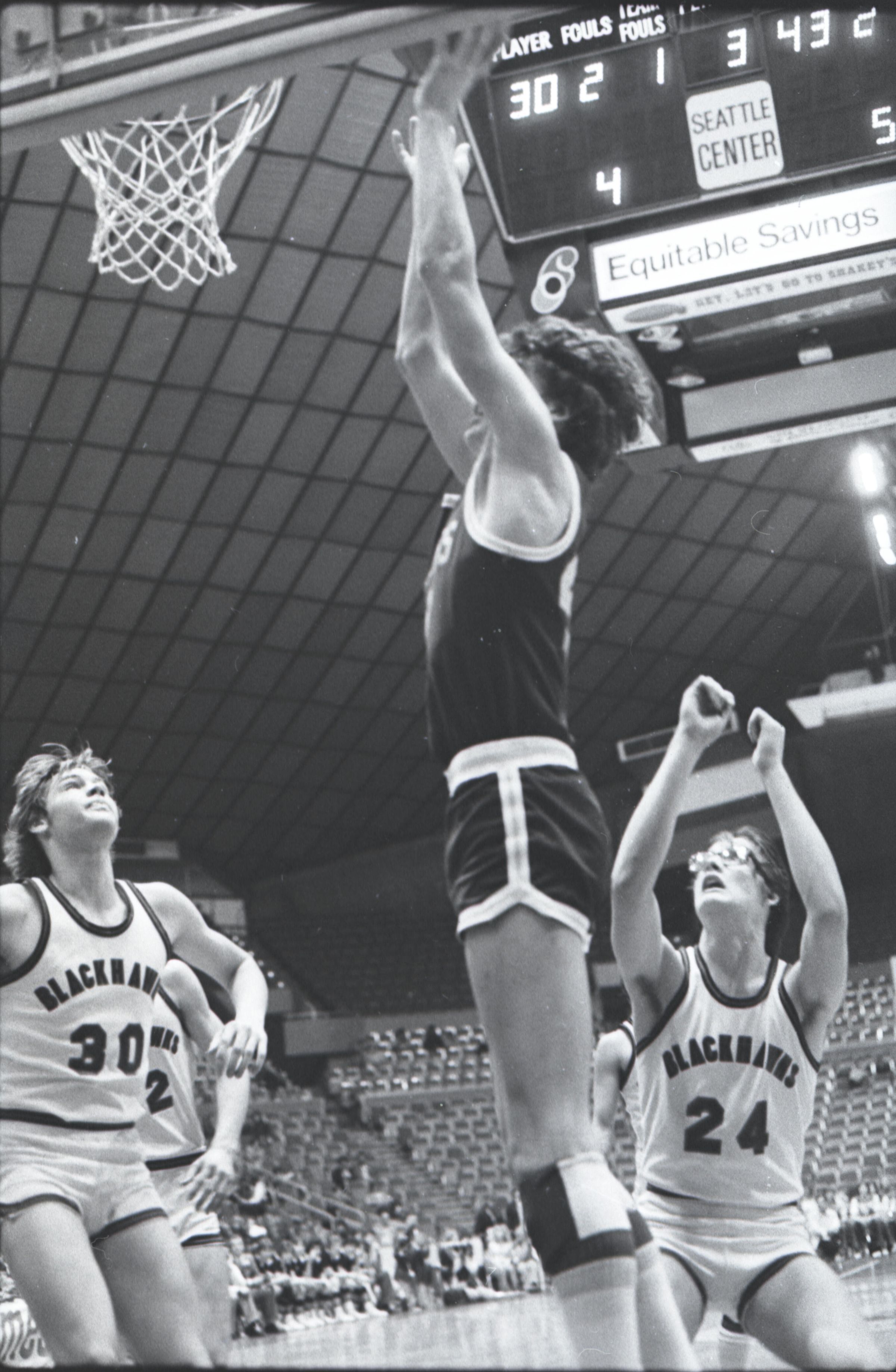 Timberline, State Basketball Champions, 1980. Championship game between Timberline and Cheney High Schools. These seventeen black and white film negative strips were created for the Lacey Leader newspaper. These images were created using five separate film rolls, so some of the physical numbers on the strips are repeated.Made/Created