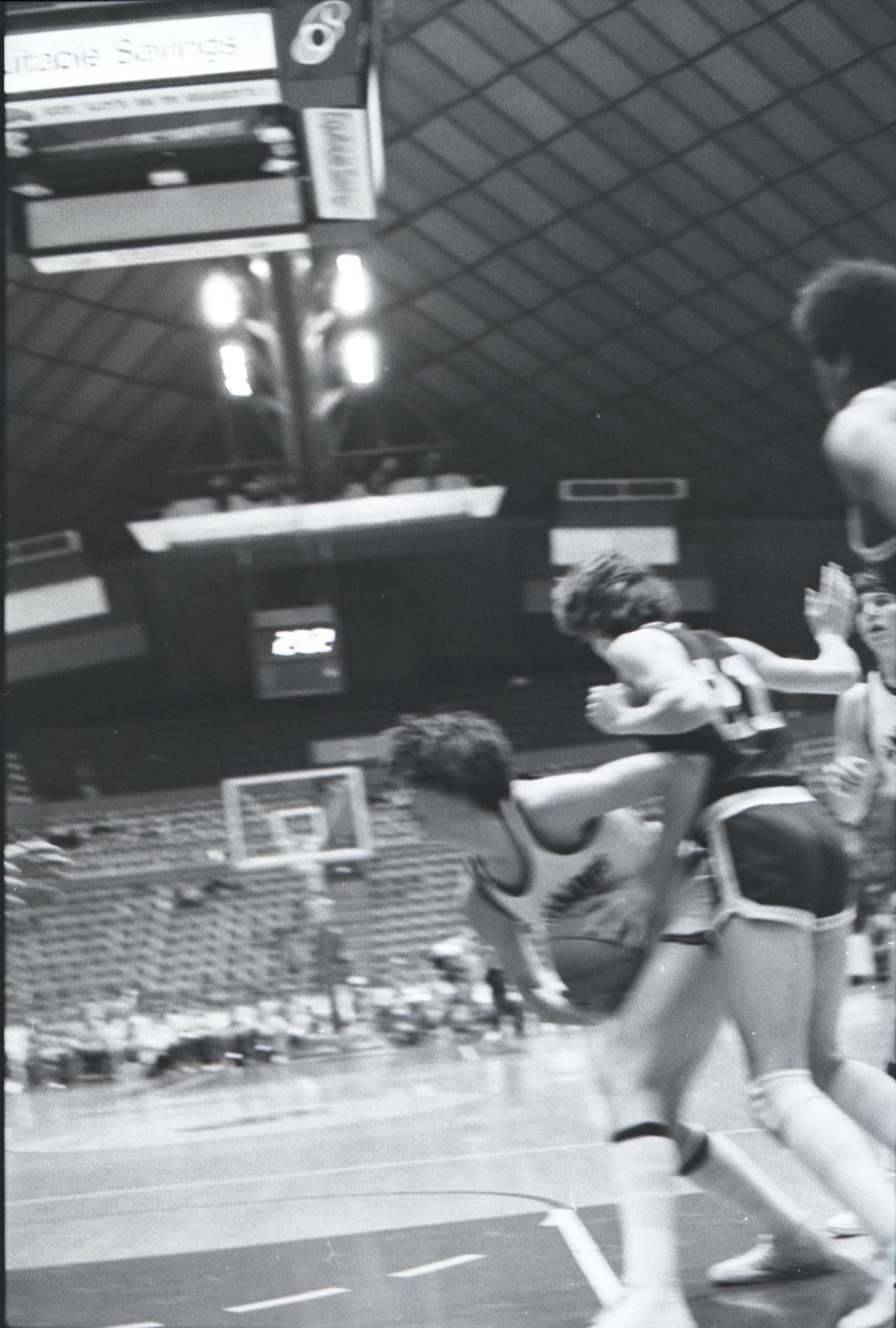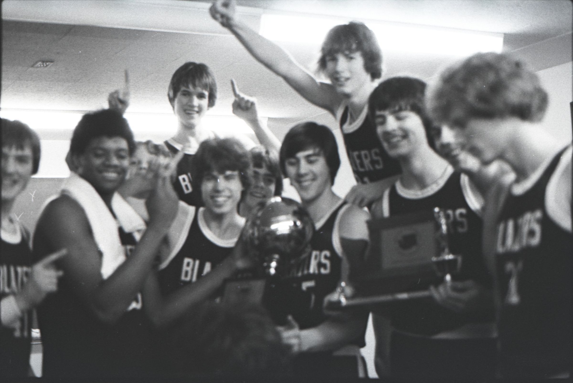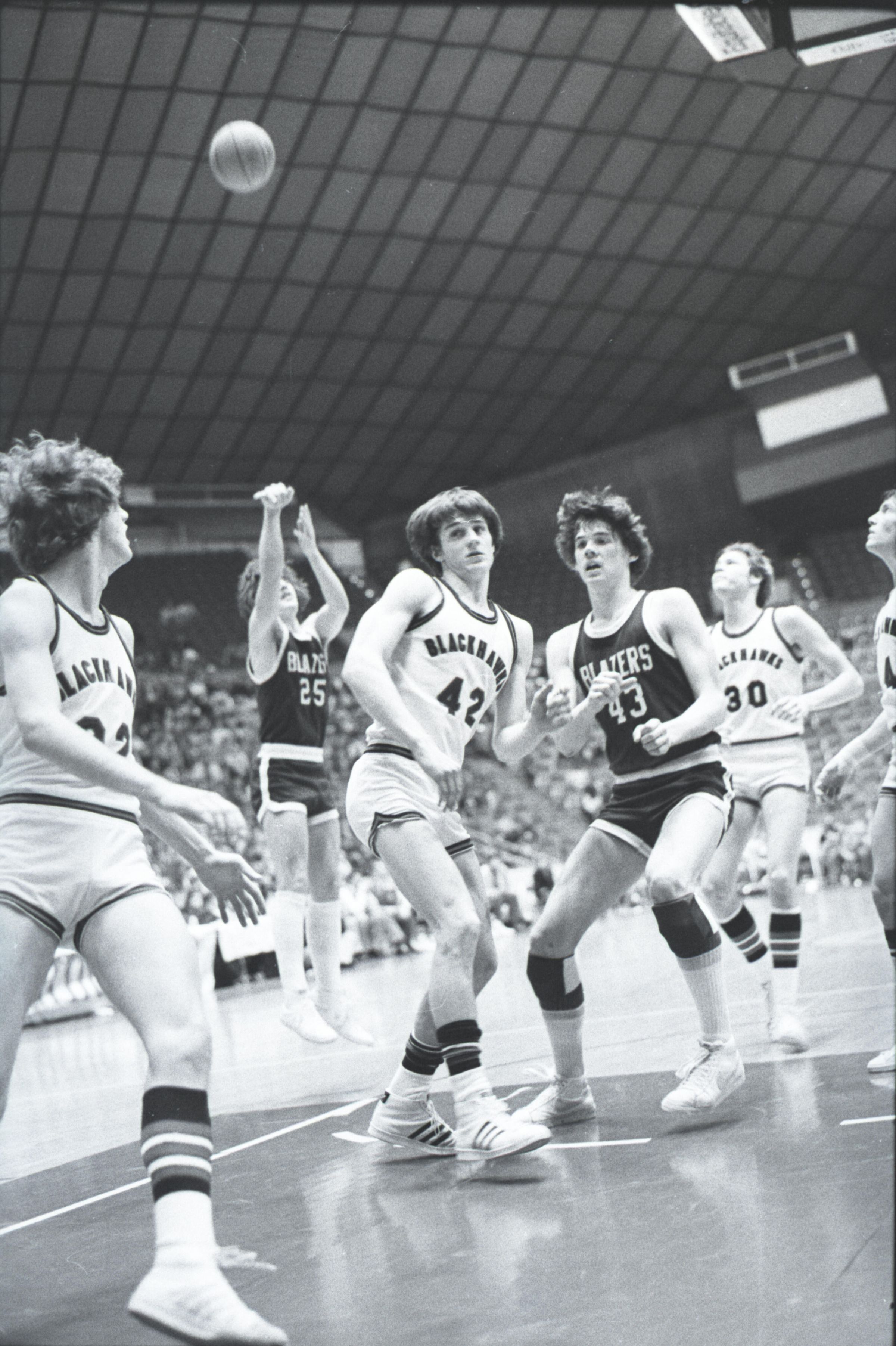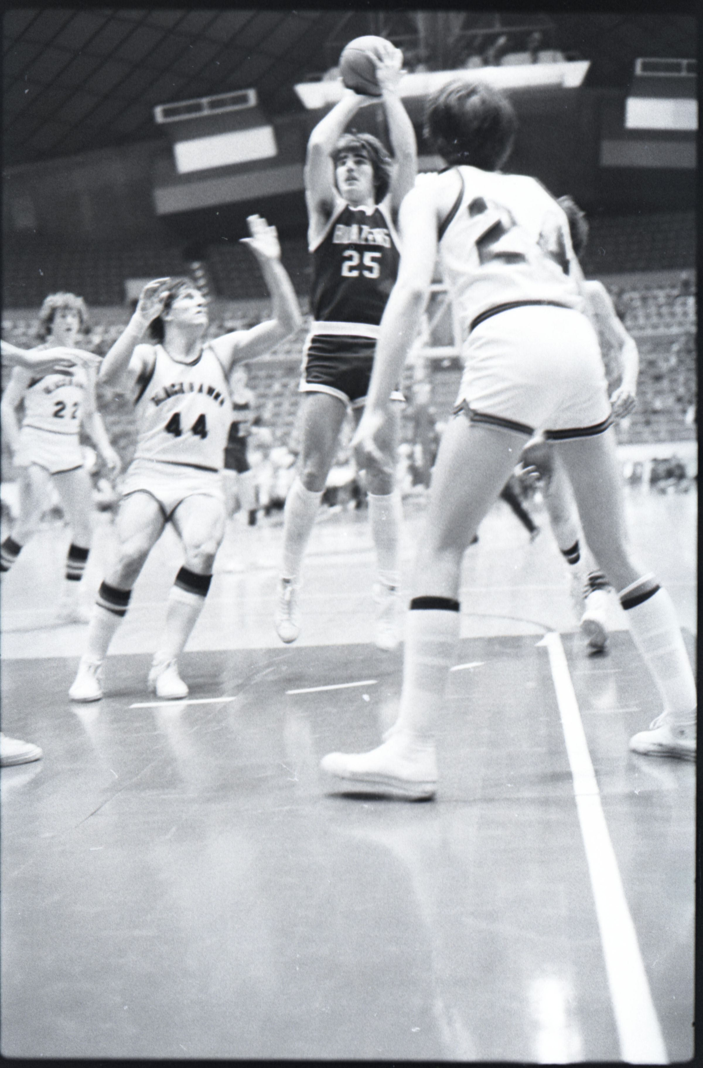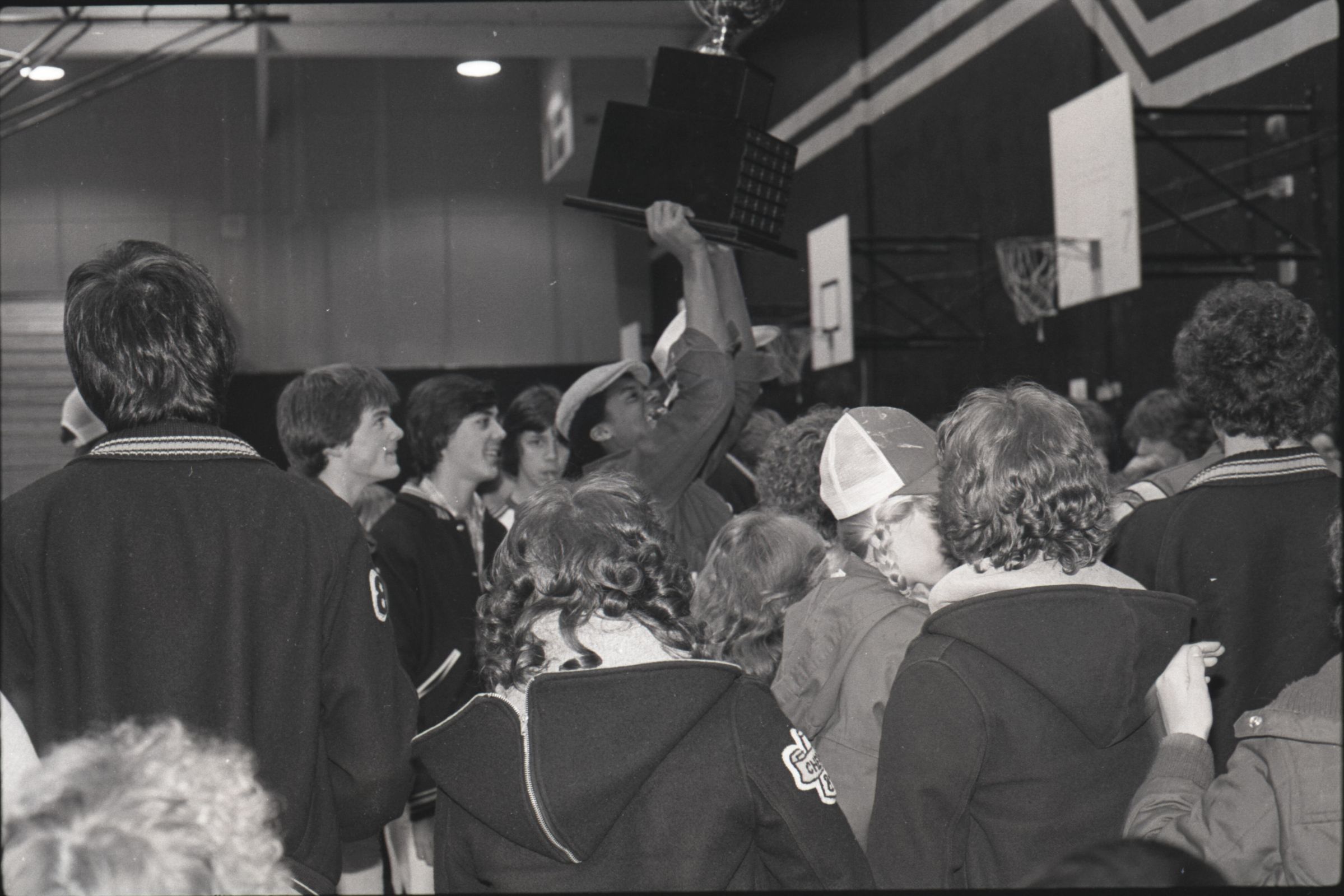 Timberline, State Basketball Champions, 1980. Championship game between Timberline and Cheney High Schools. These seventeen black and white film negative strips were created for the Lacey Leader newspaper. These images were created using five separate film rolls, so some of the physical numbers on the strips are repeated.Made/Created