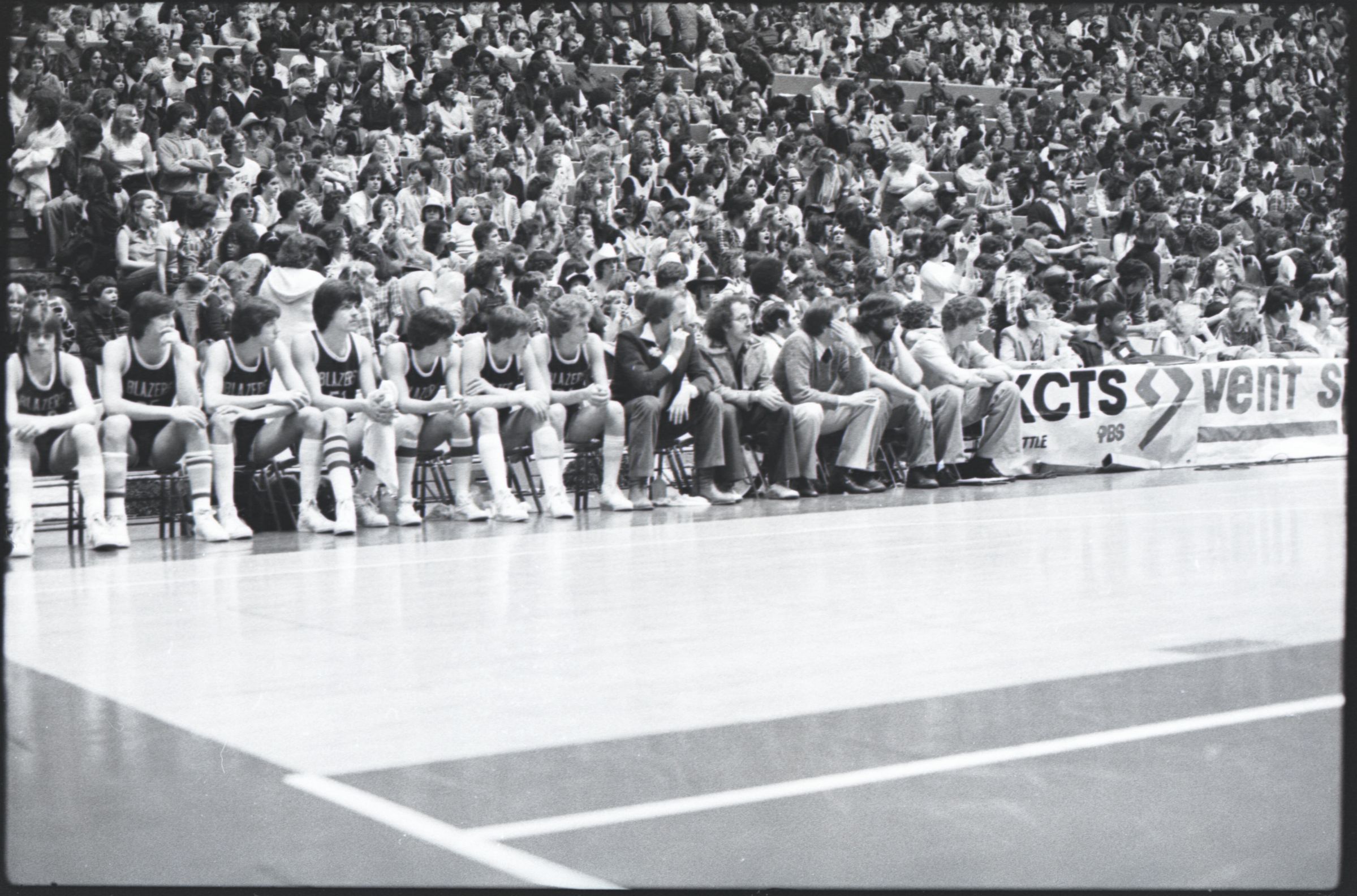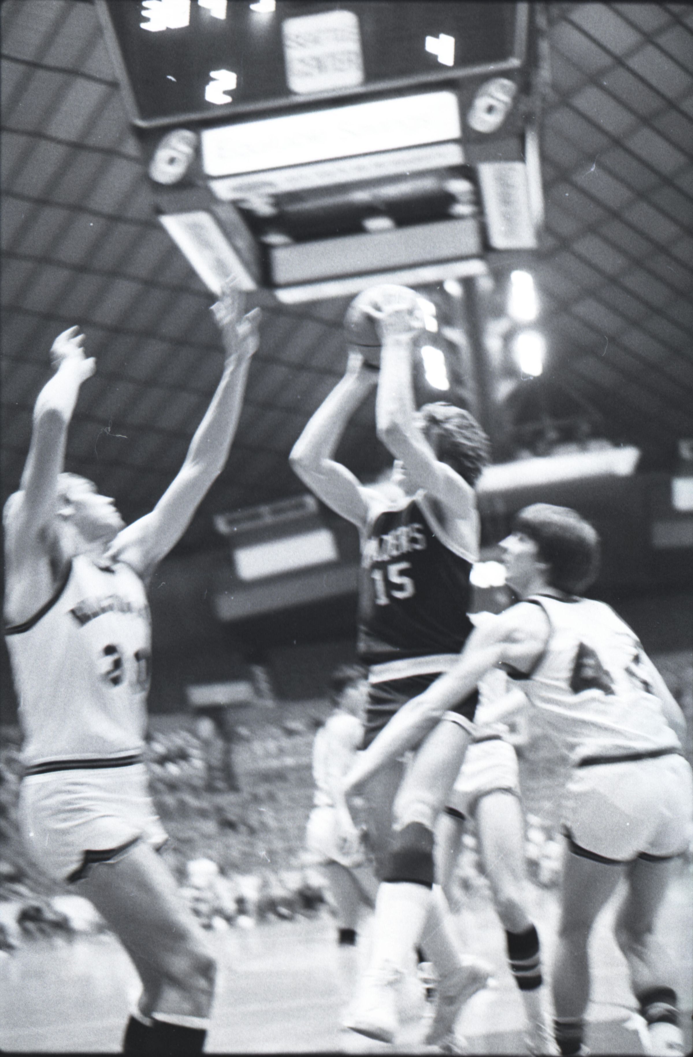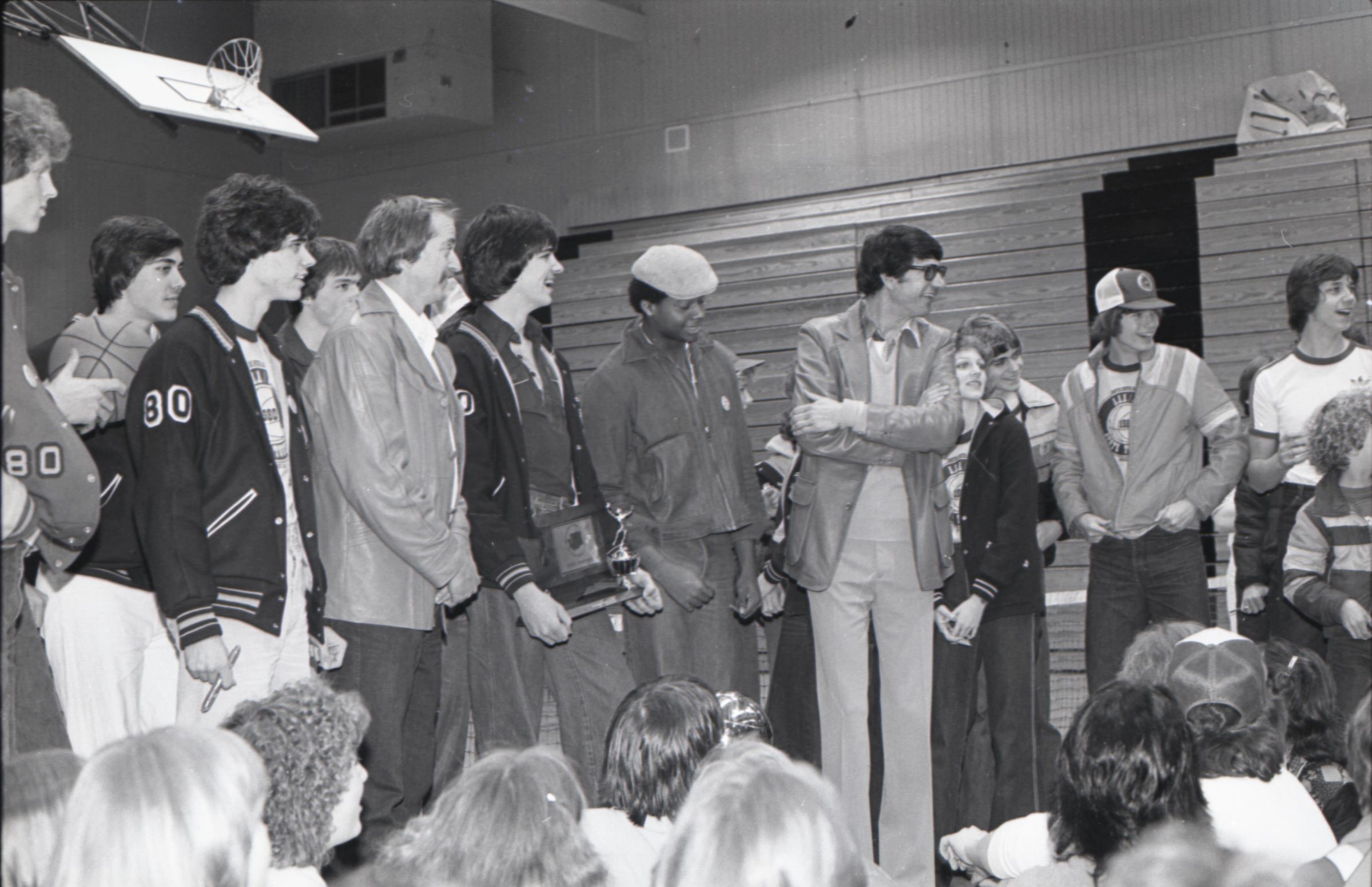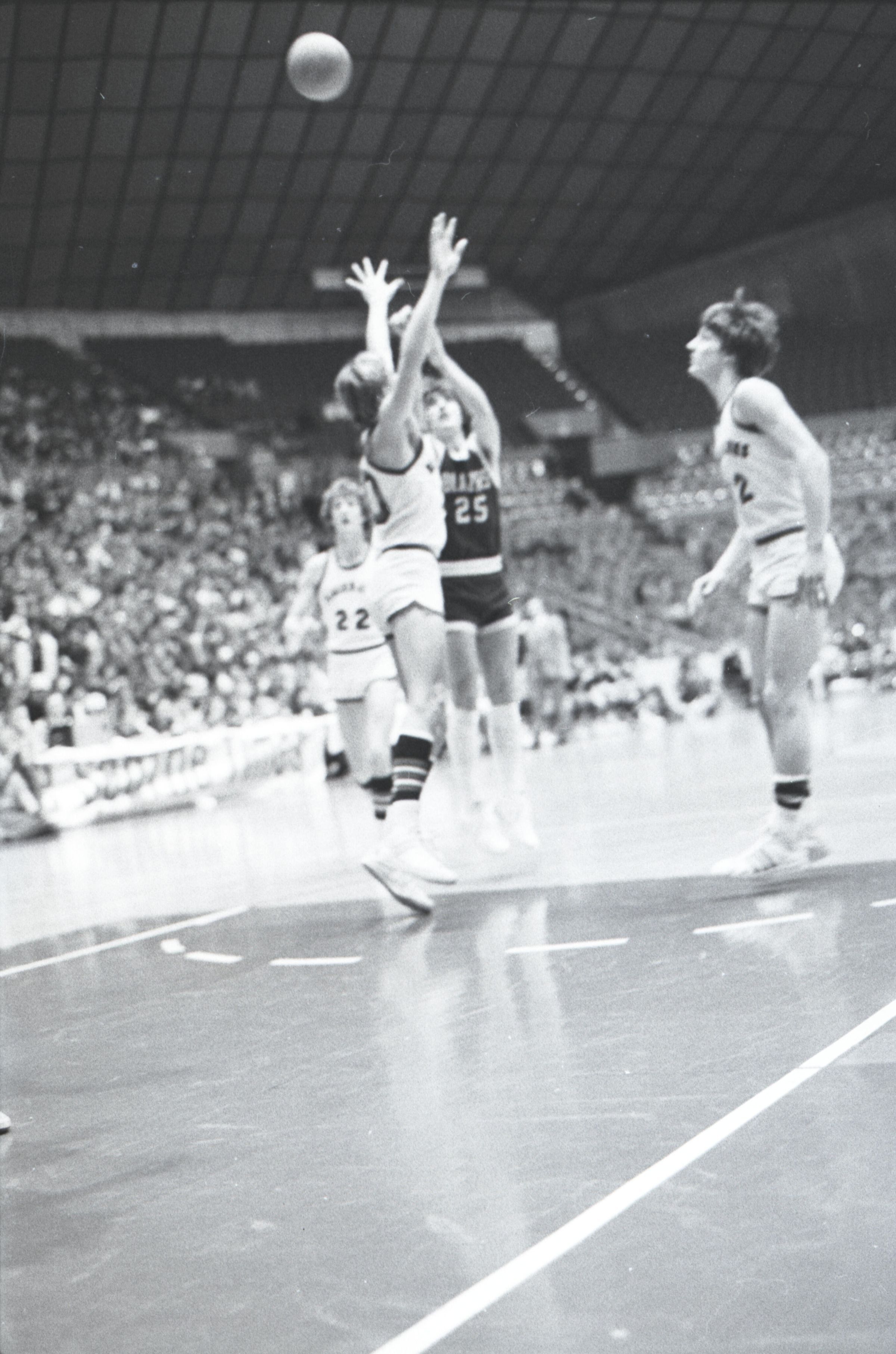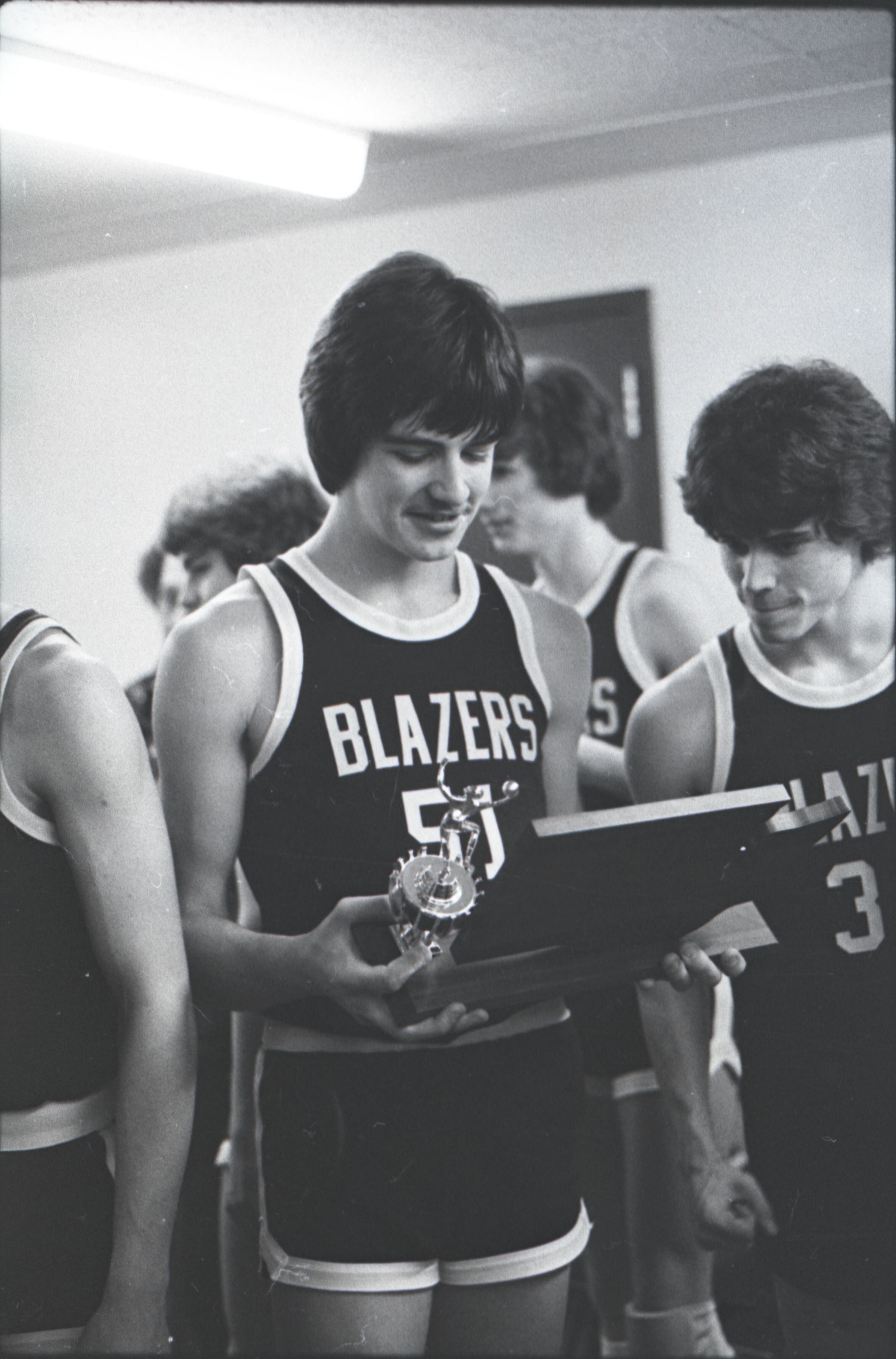 Timberline, State Basketball Champions, 1980. Championship game between Timberline and Cheney High Schools. These seventeen black and white film negative strips were created for the Lacey Leader newspaper. These images were created using five separate film rolls, so some of the physical numbers on the strips are repeated.Made/Created