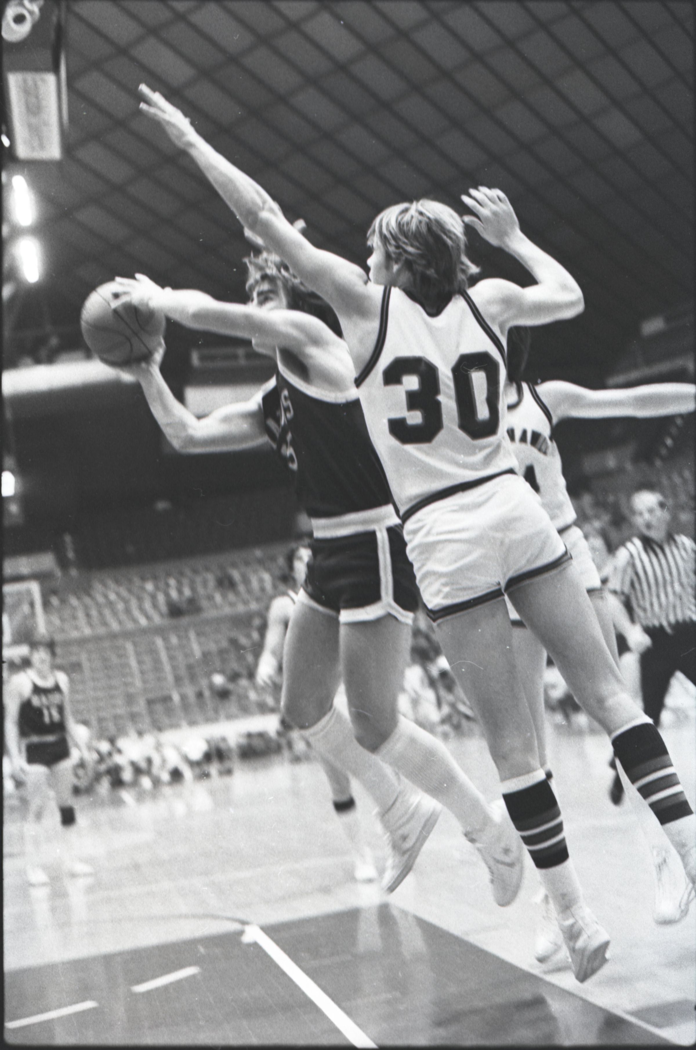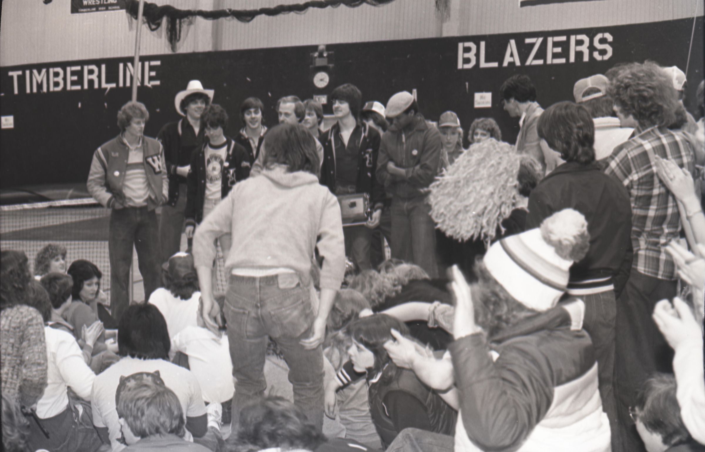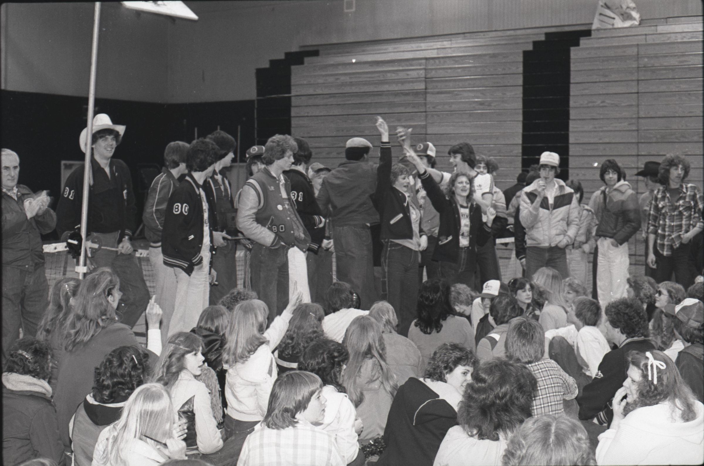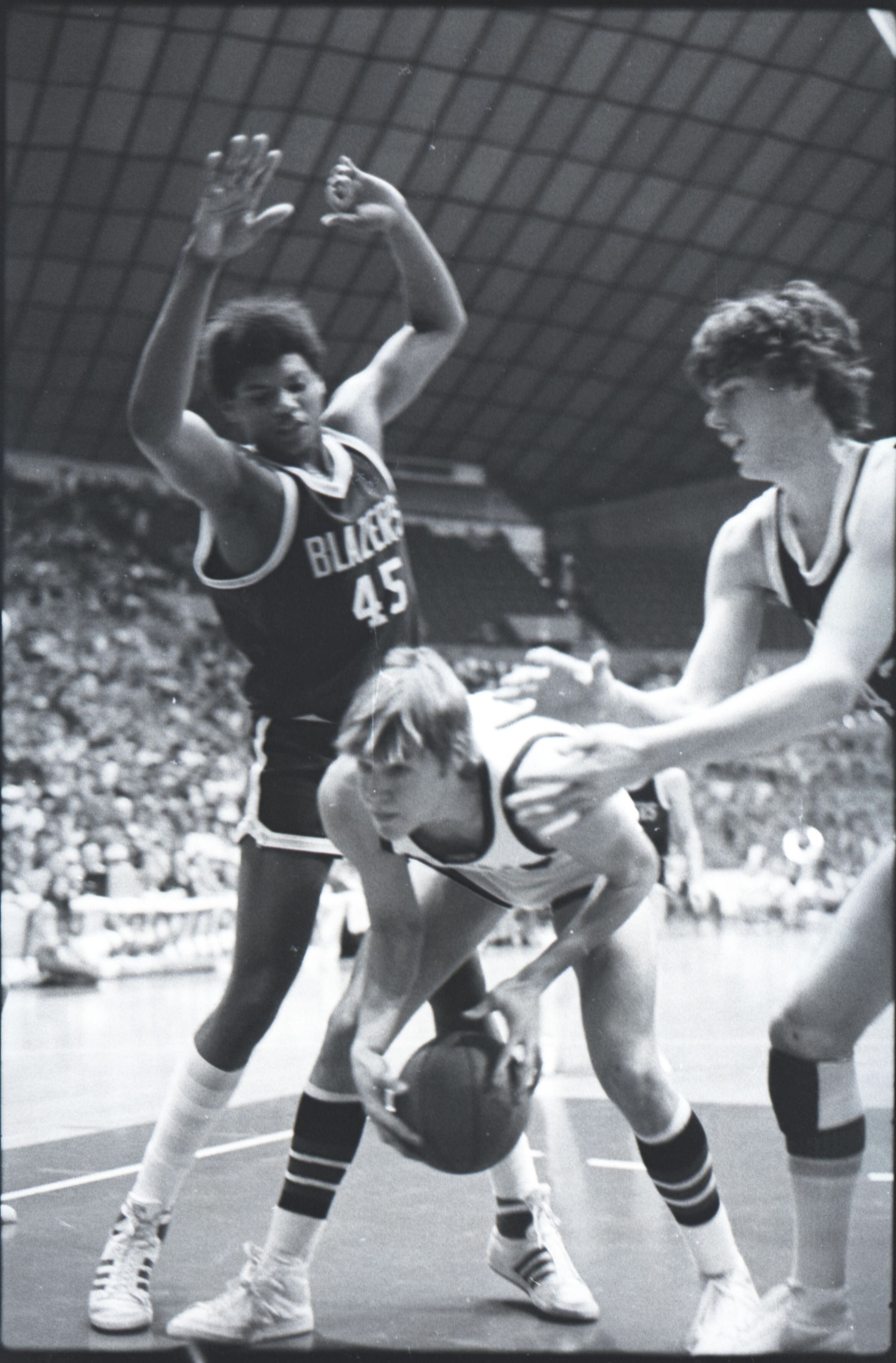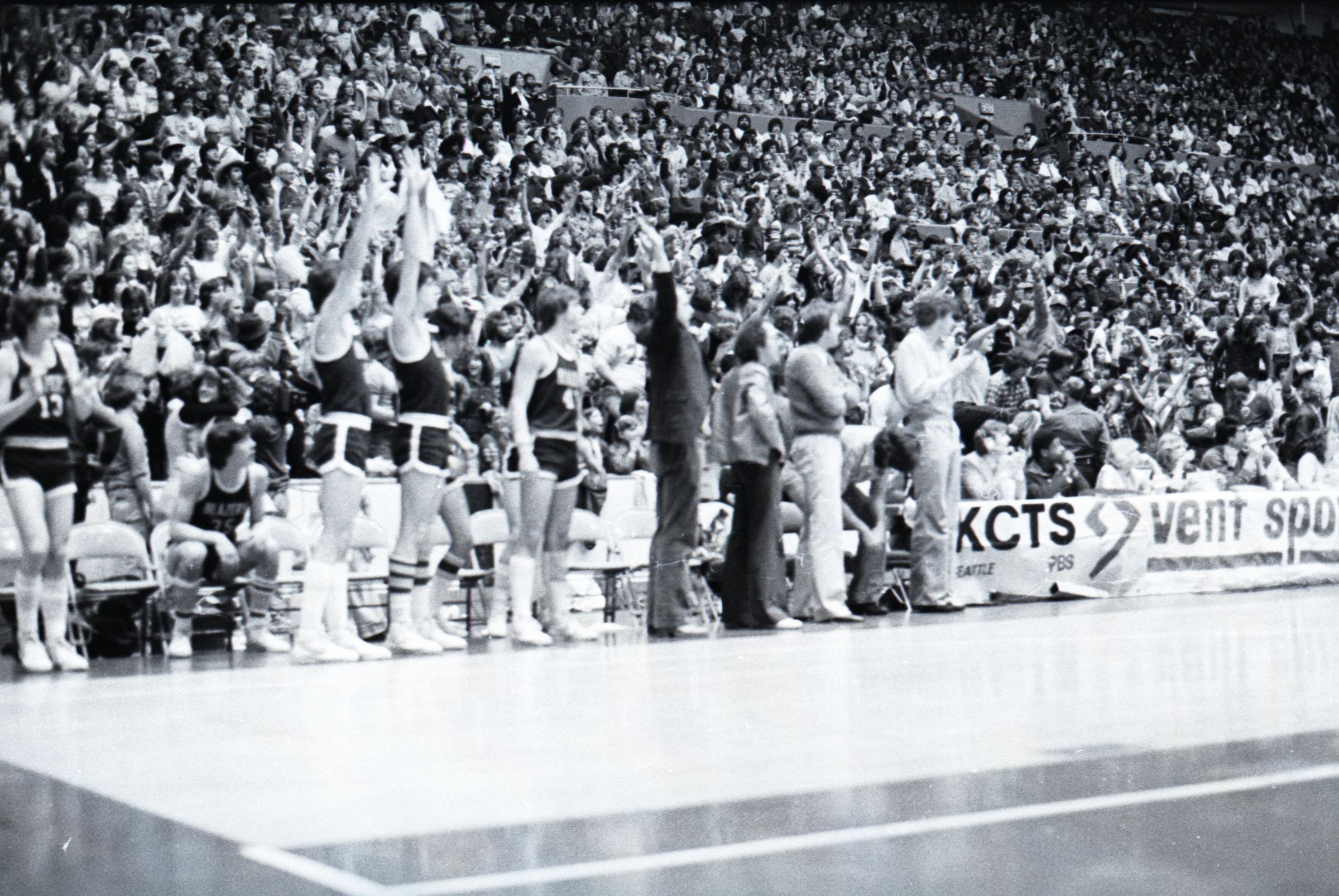 Timberline, State Basketball Champions, 1980. Championship game between Timberline and Cheney High Schools. These seventeen black and white film negative strips were created for the Lacey Leader newspaper. These images were created using five separate film rolls, so some of the physical numbers on the strips are repeated.Made/Created