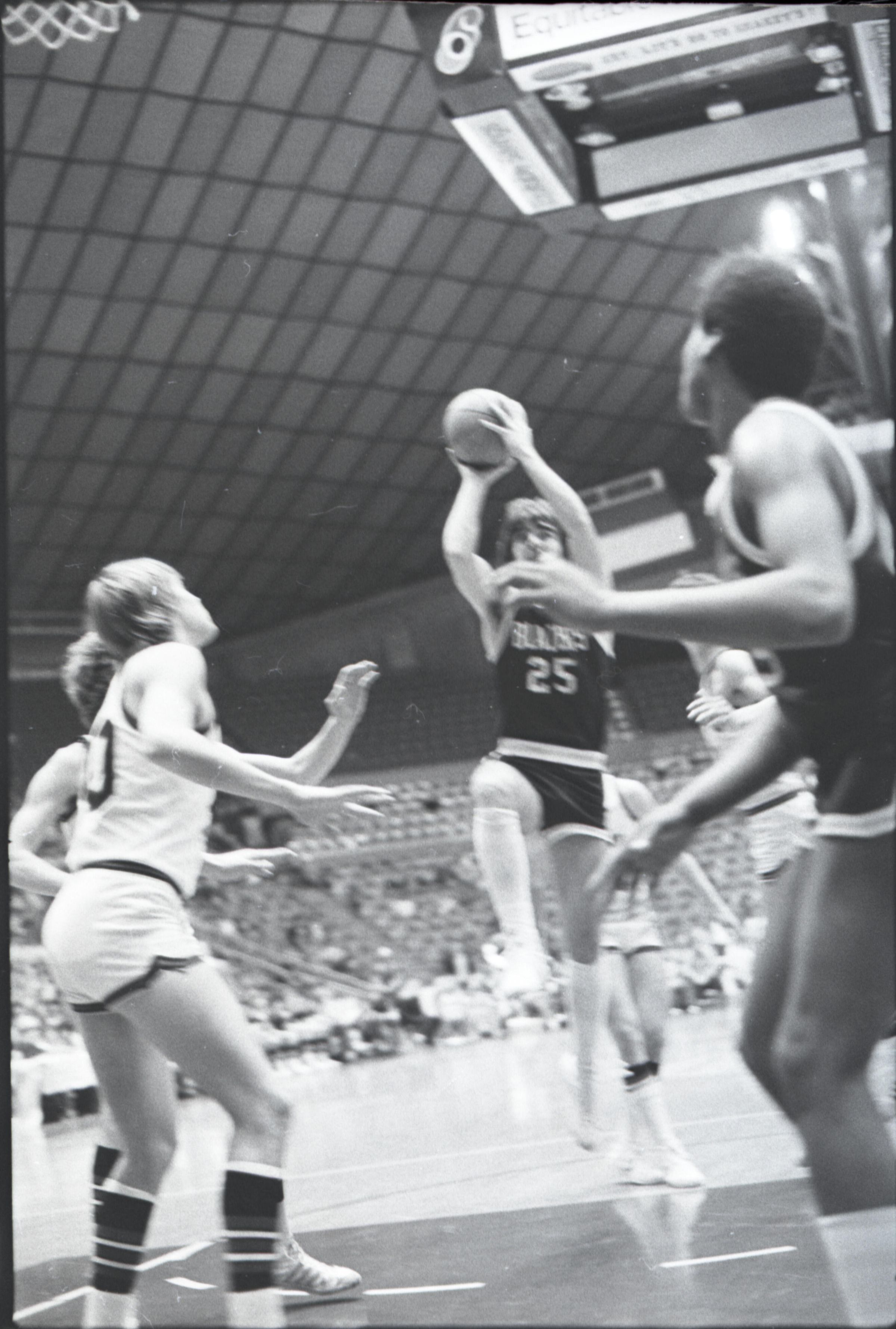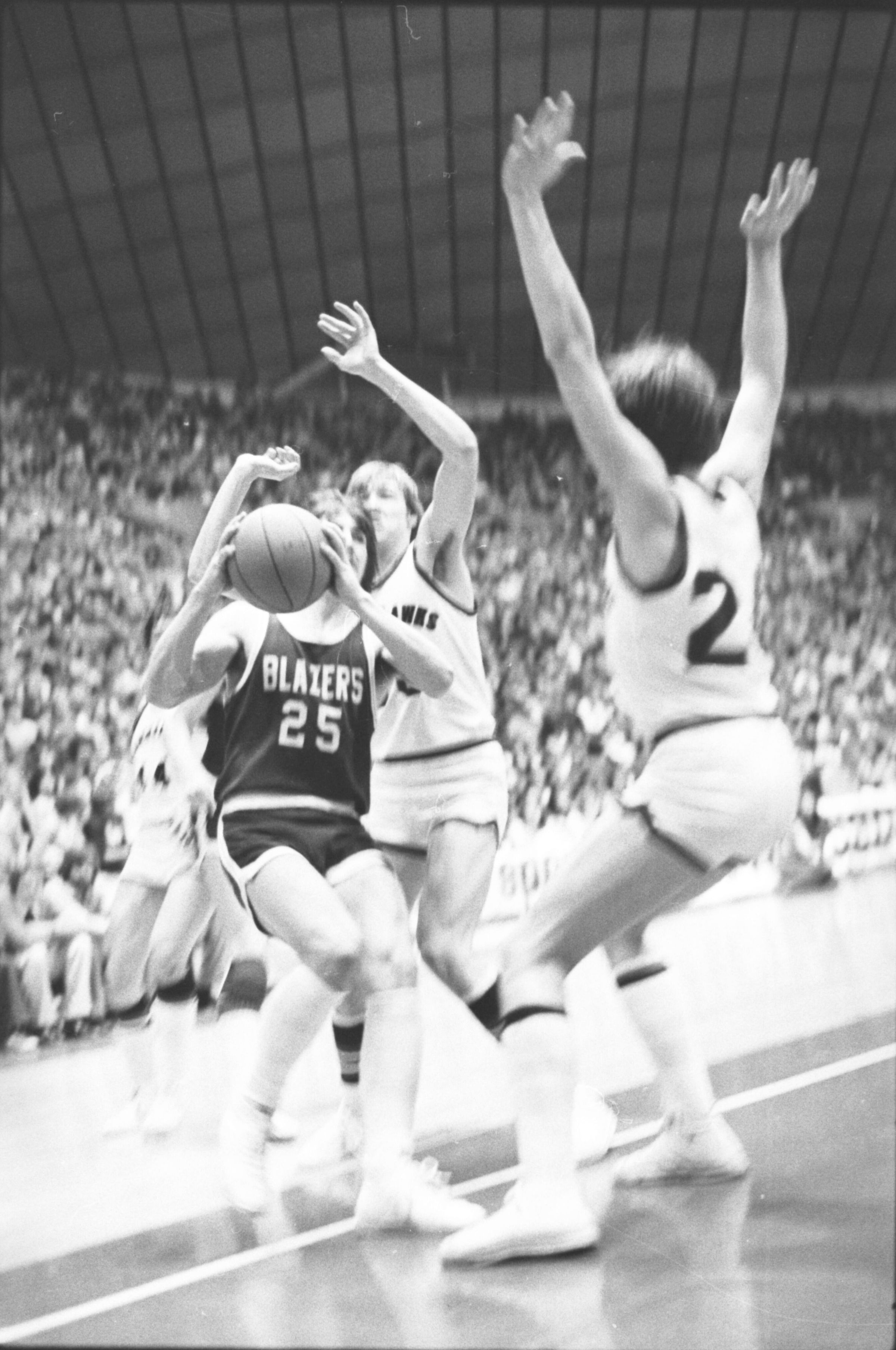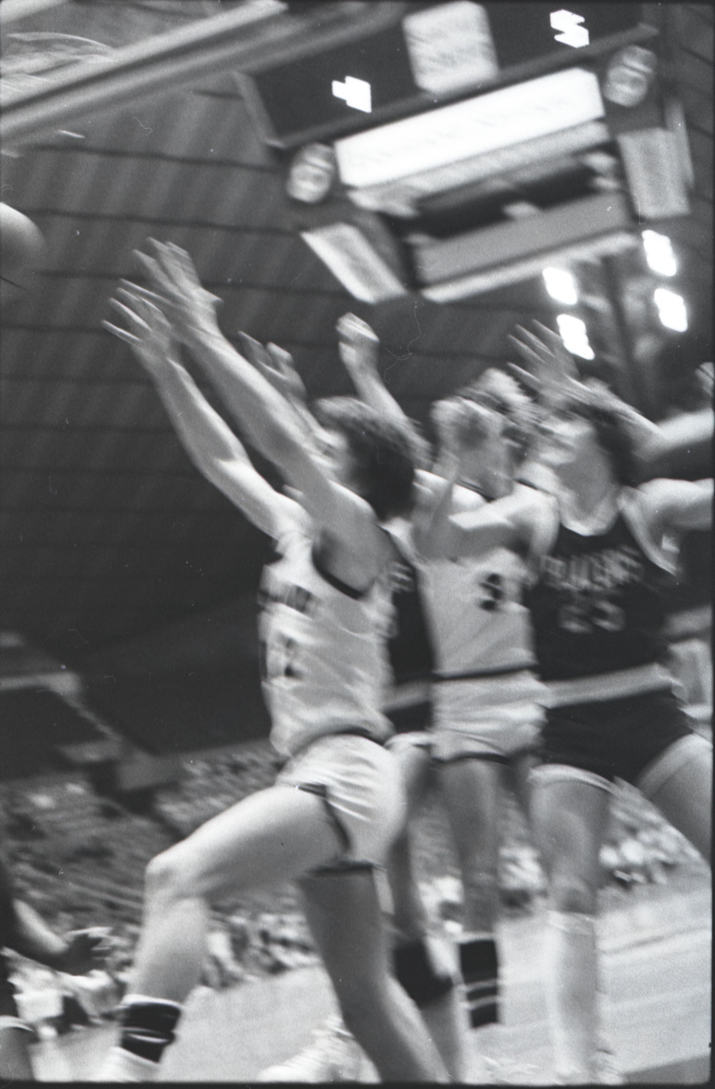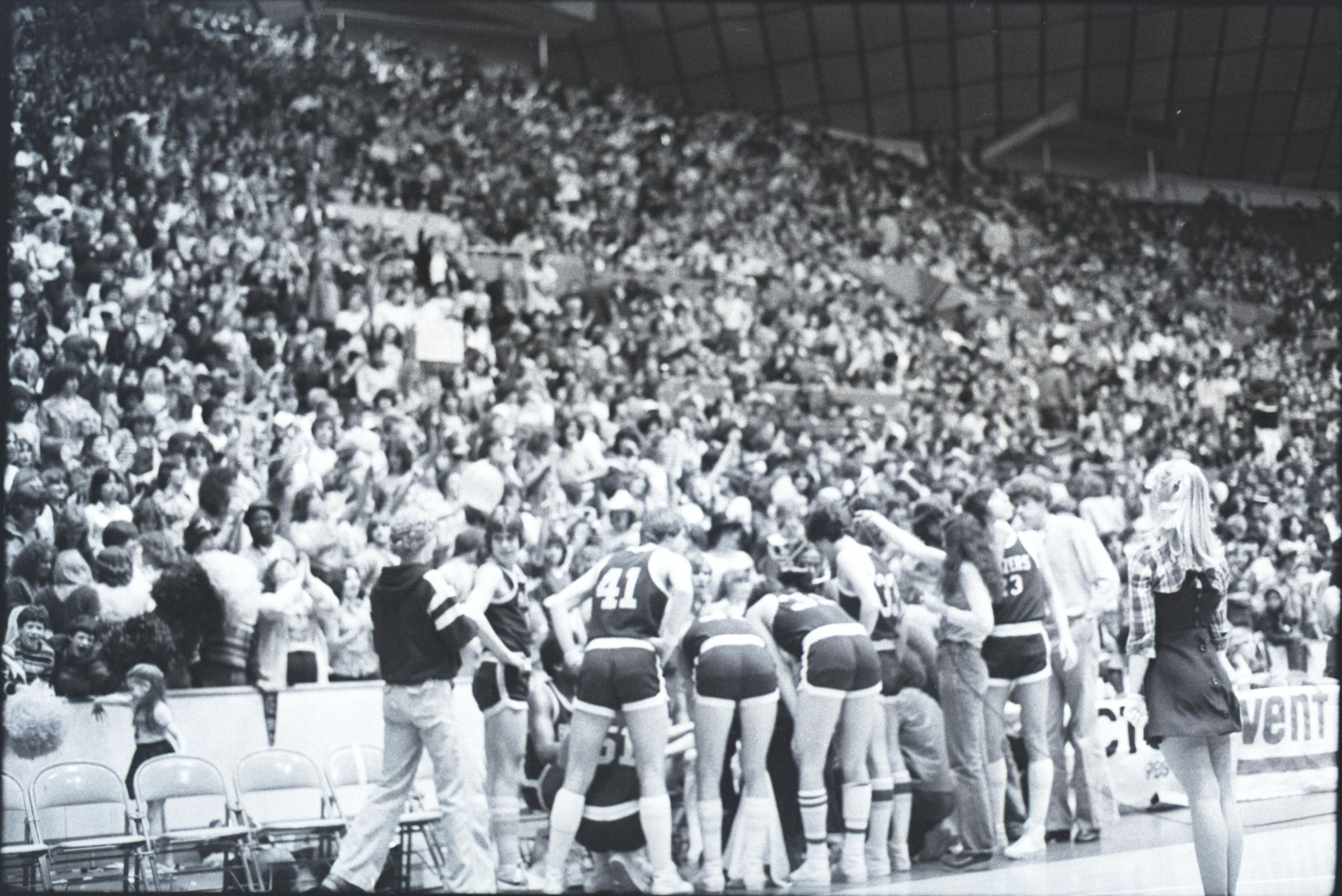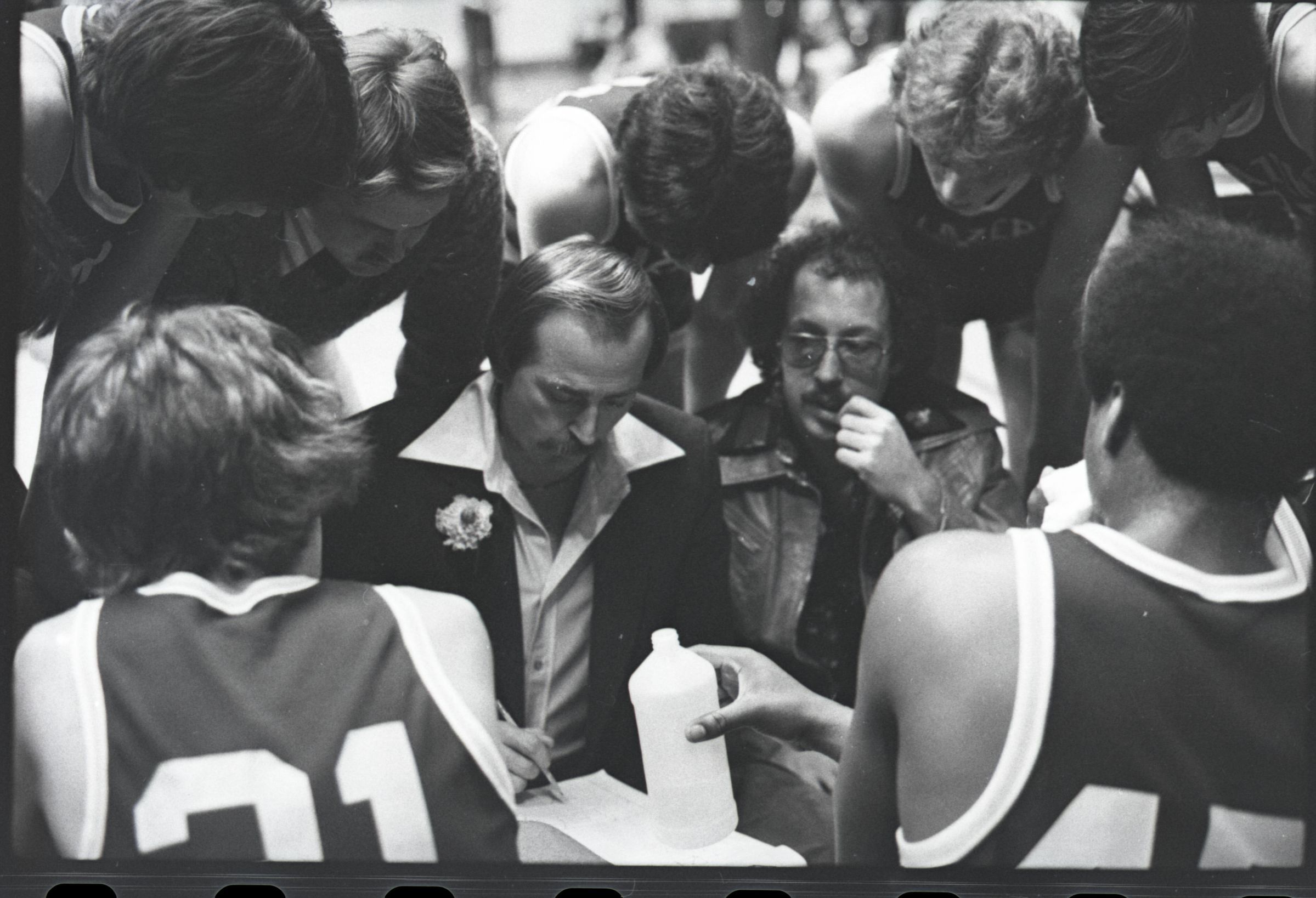 Timberline, State Basketball Champions, 1980. Championship game between Timberline and Cheney High Schools. These seventeen black and white film negative strips were created for the Lacey Leader newspaper. These images were created using five separate film rolls, so some of the physical numbers on the strips are repeated.Made/Created