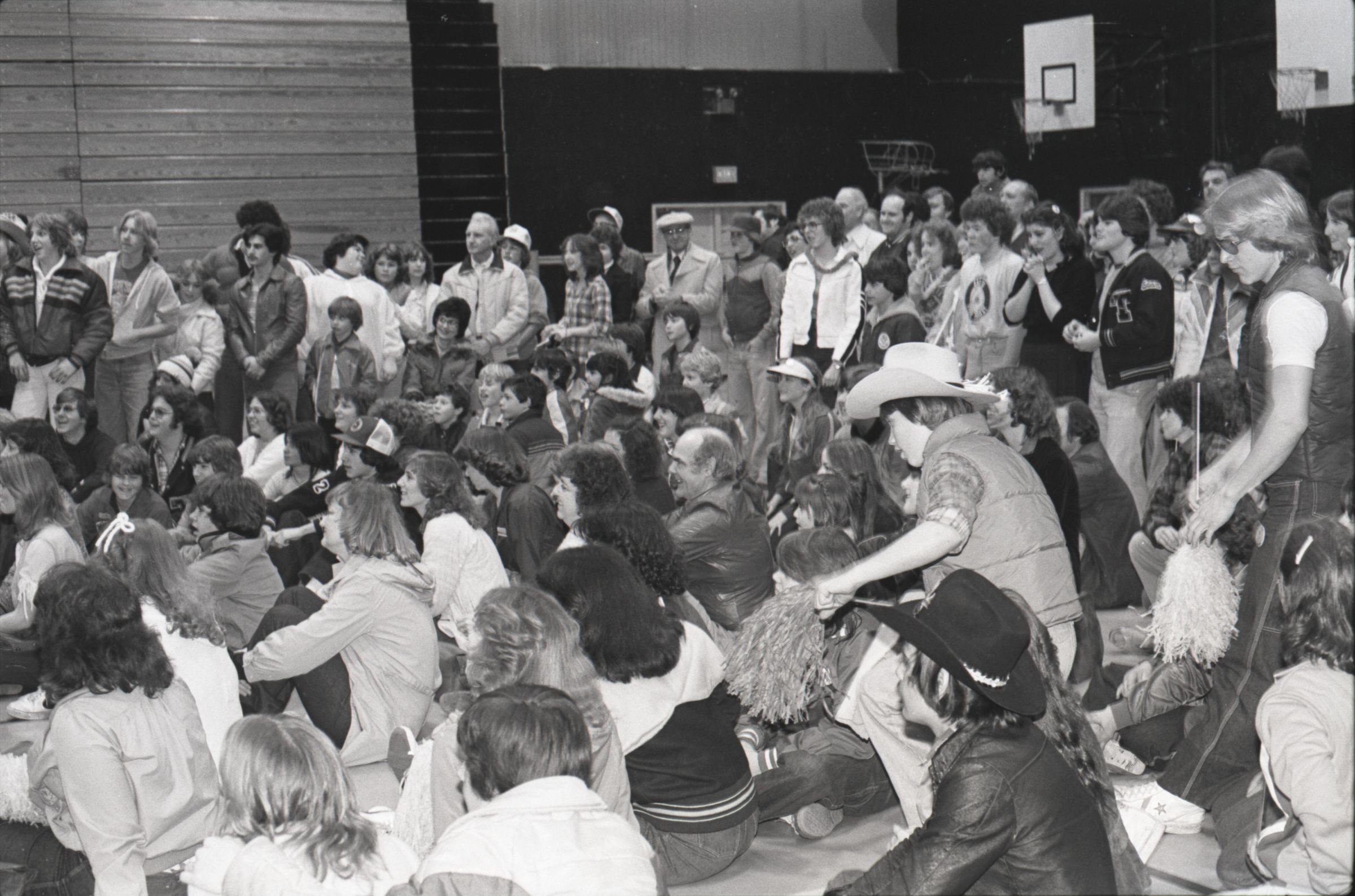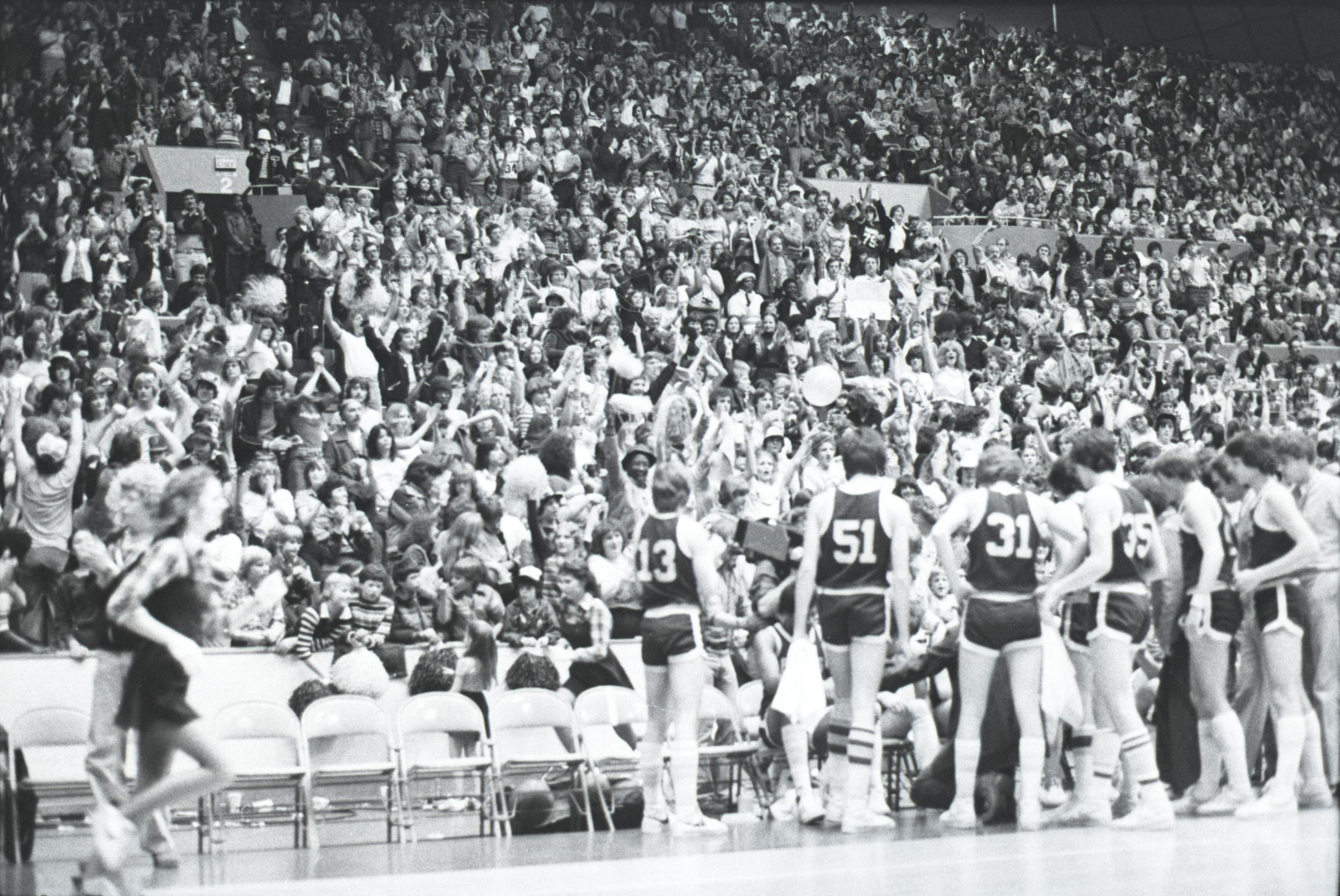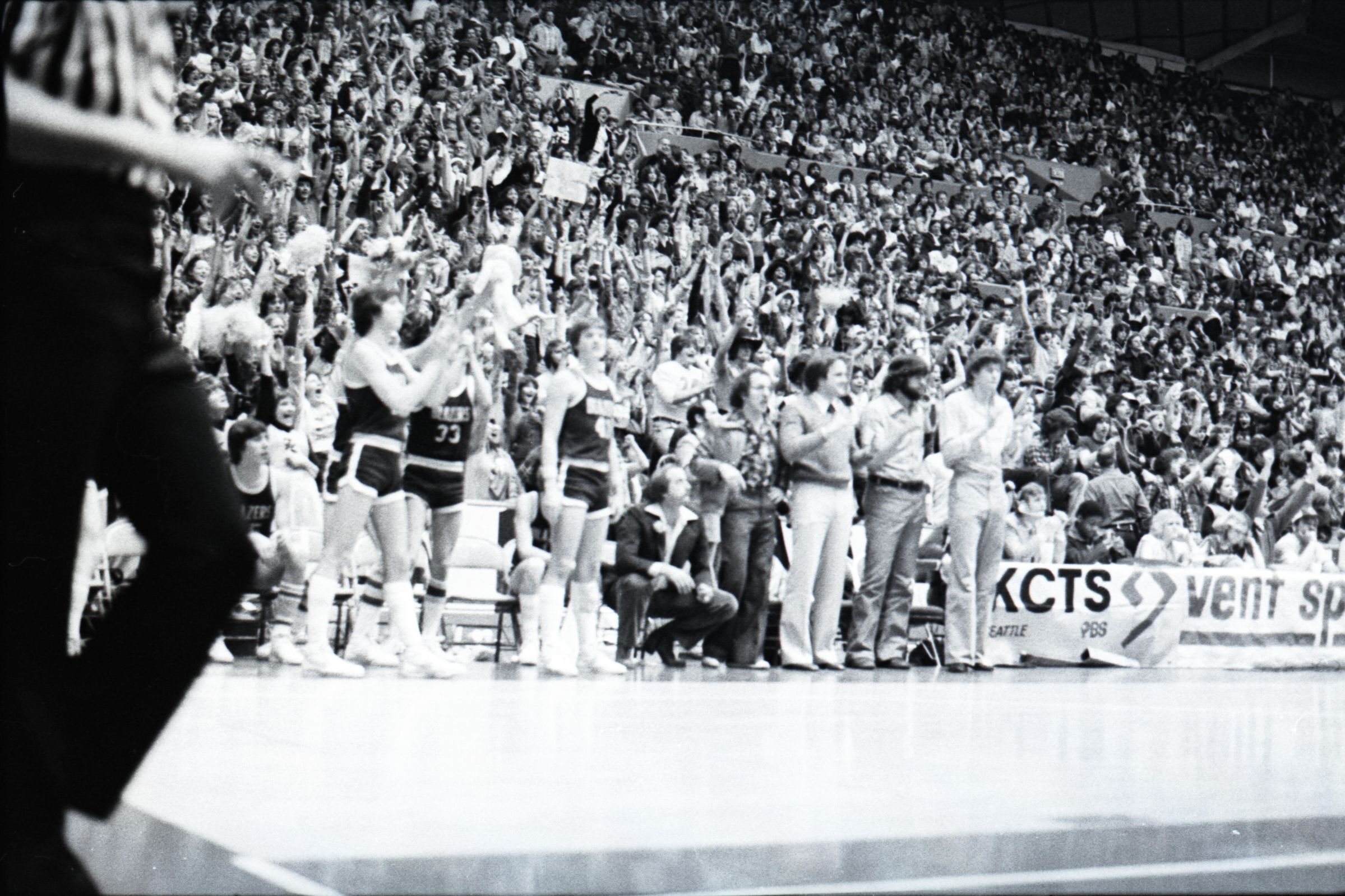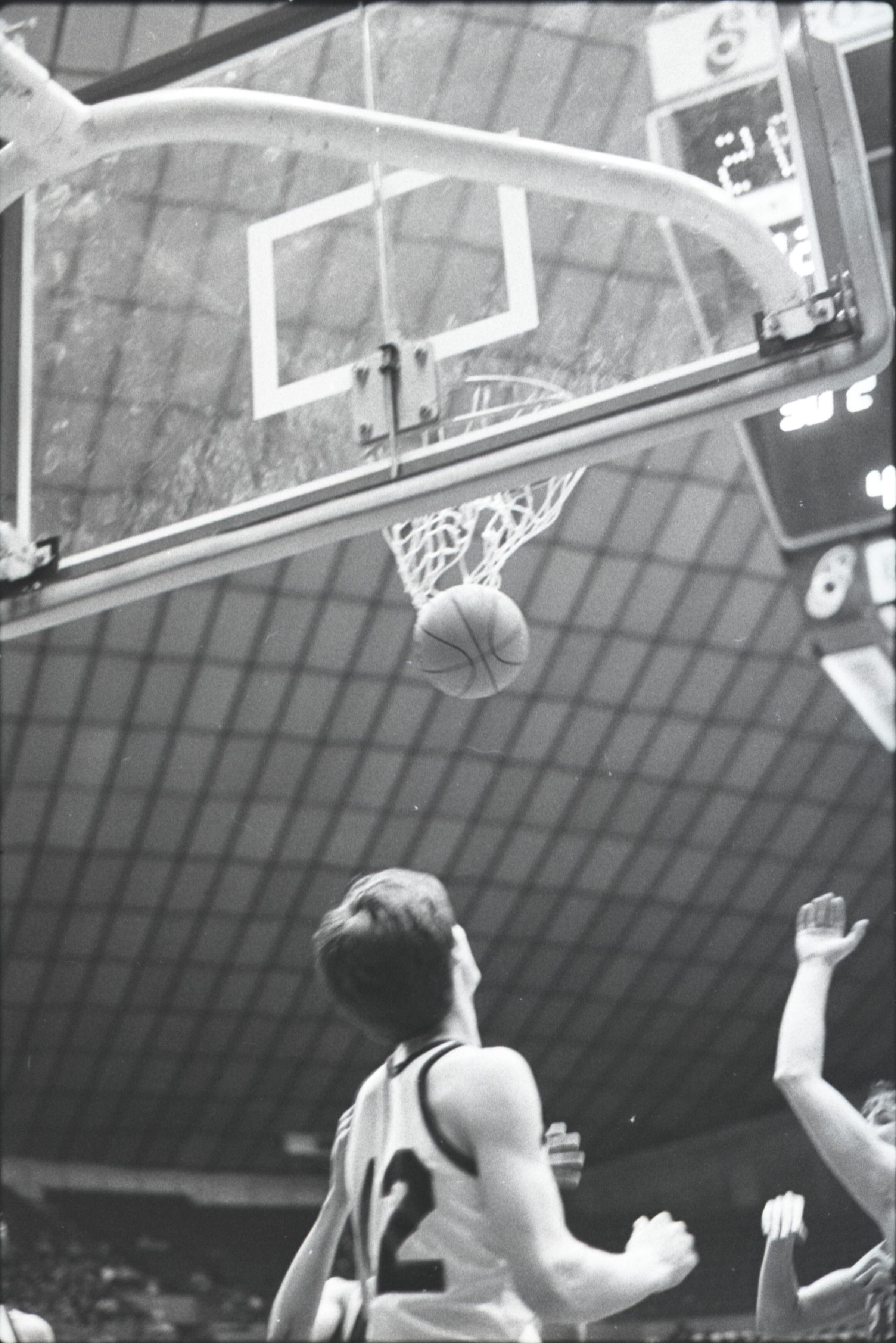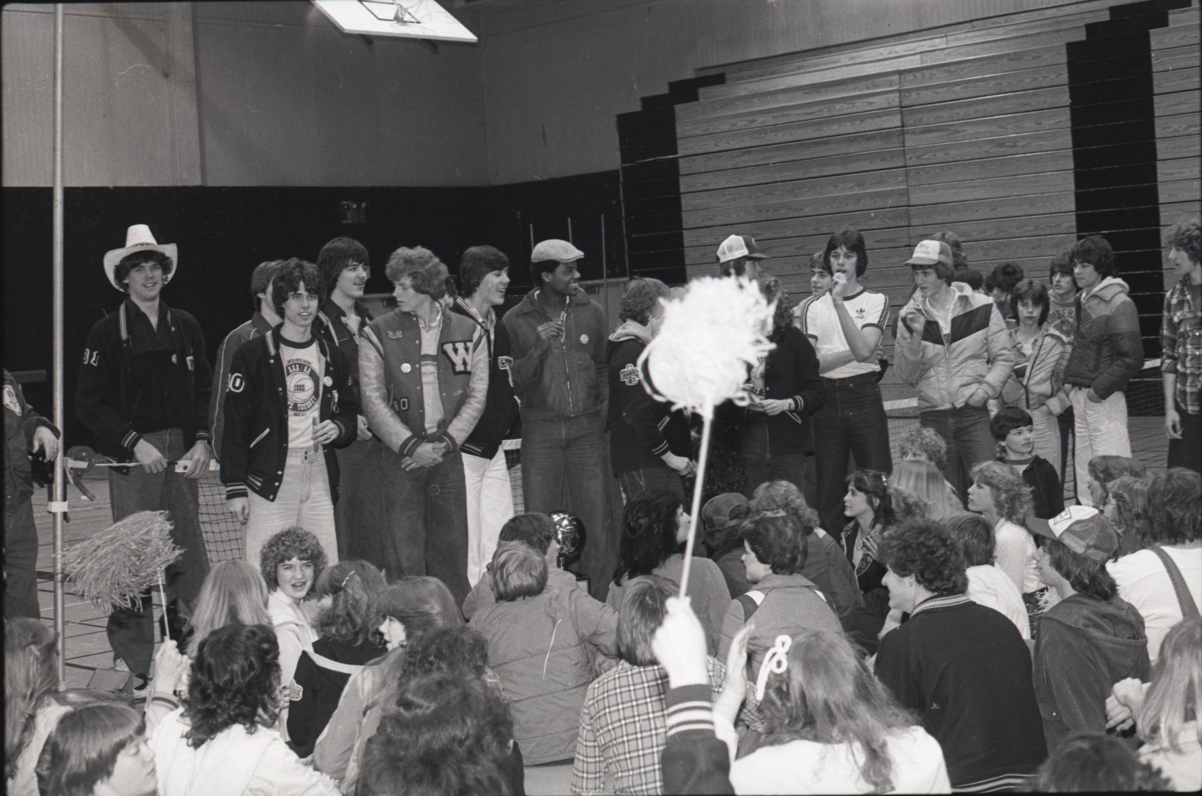 Timberline, State Basketball Champions, 1980. Championship game between Timberline and Cheney High Schools. These seventeen black and white film negative strips were created for the Lacey Leader newspaper. These images were created using five separate film rolls, so some of the physical numbers on the strips are repeated.Made/Created