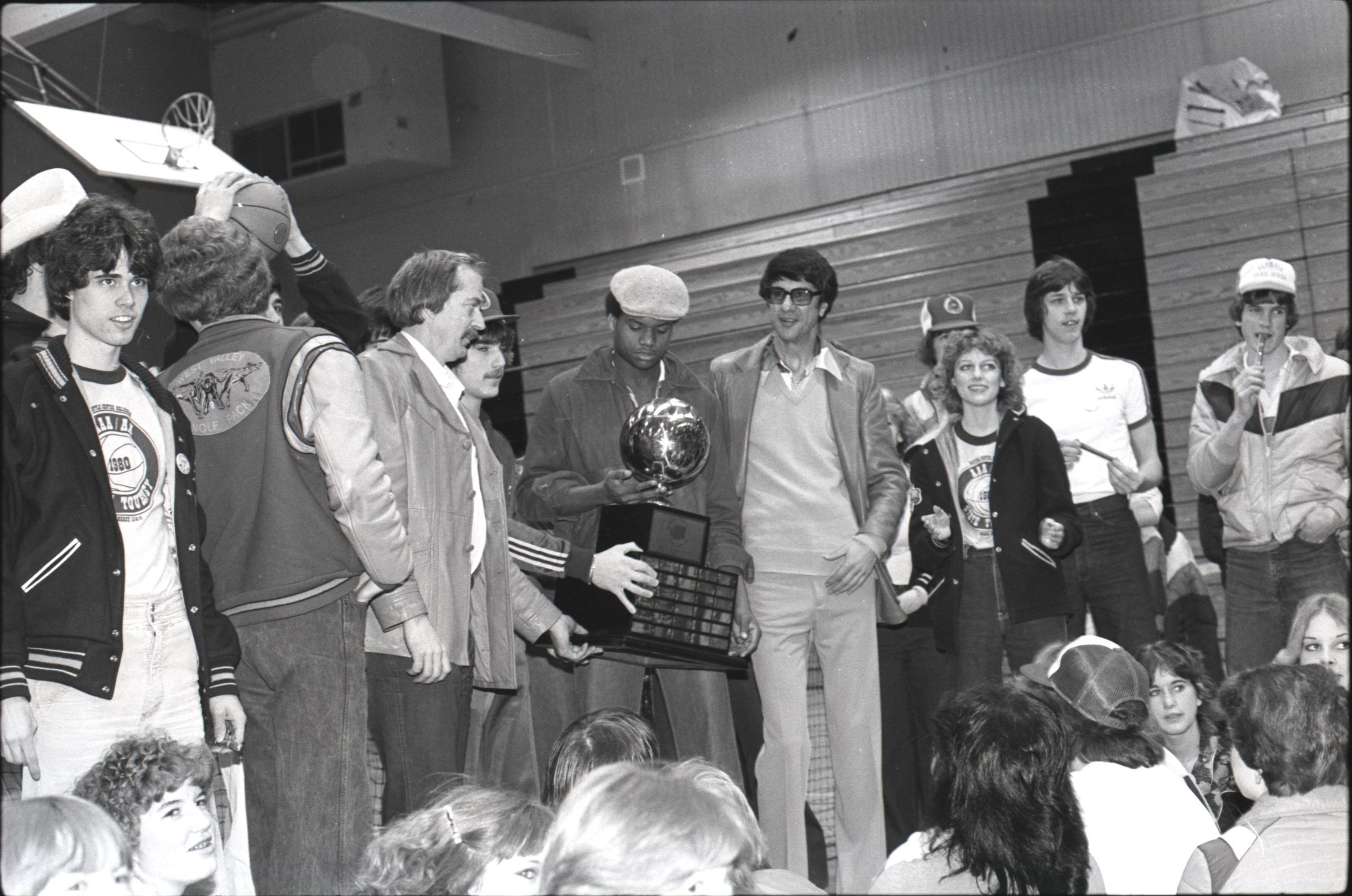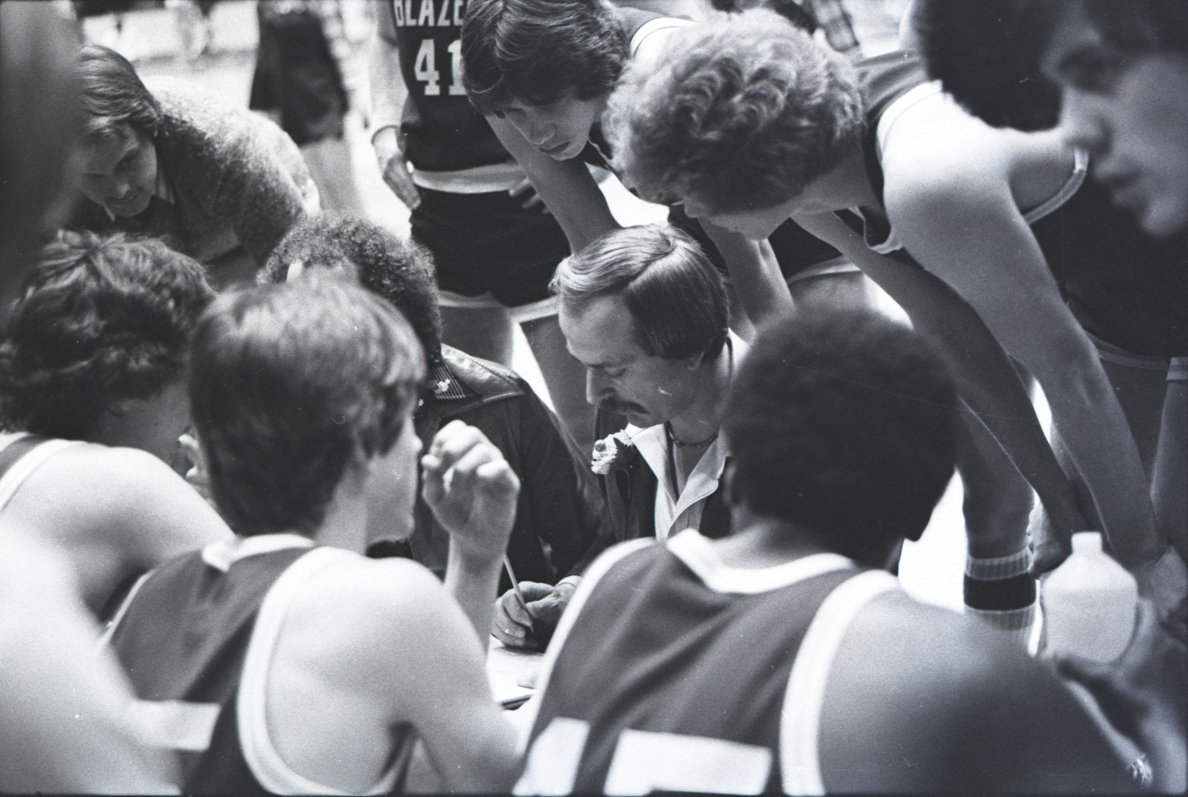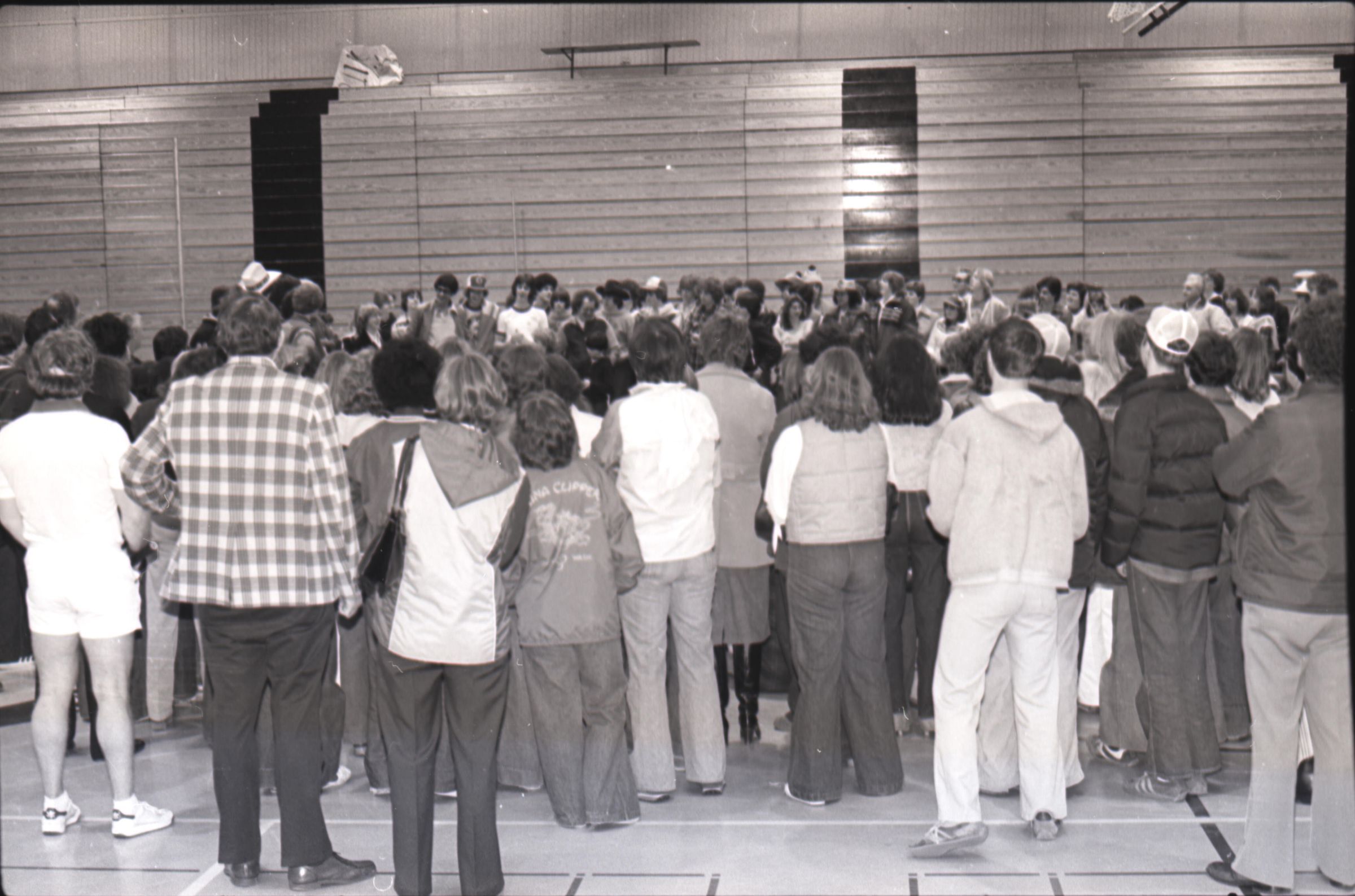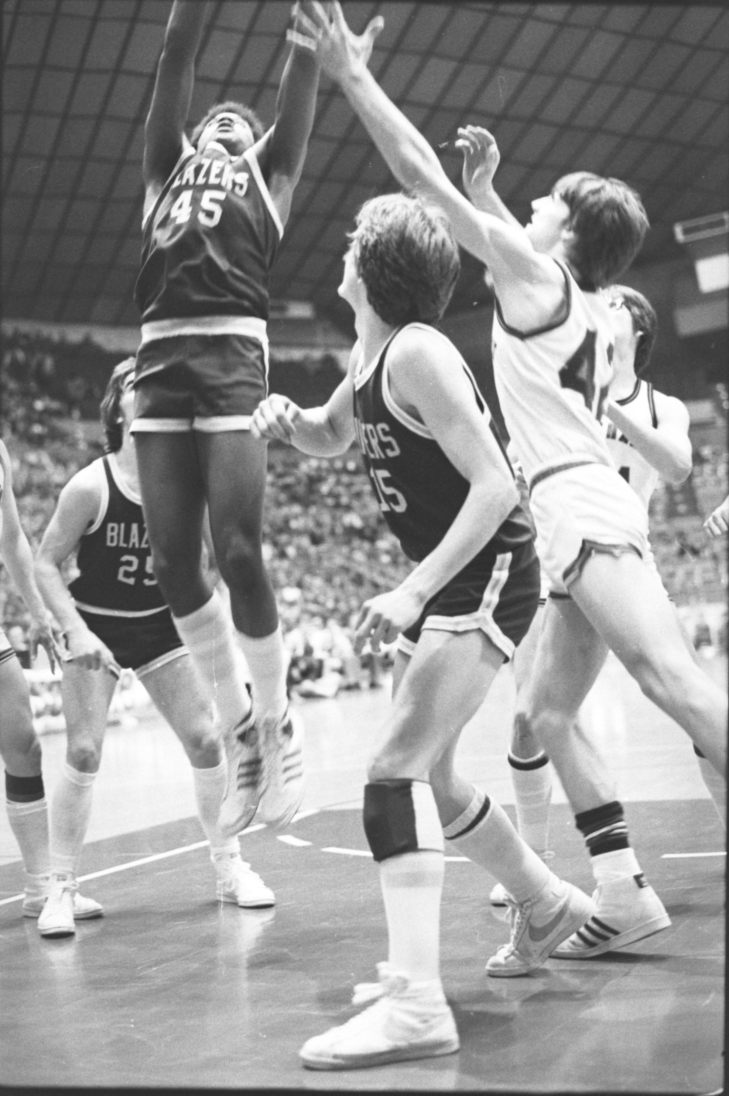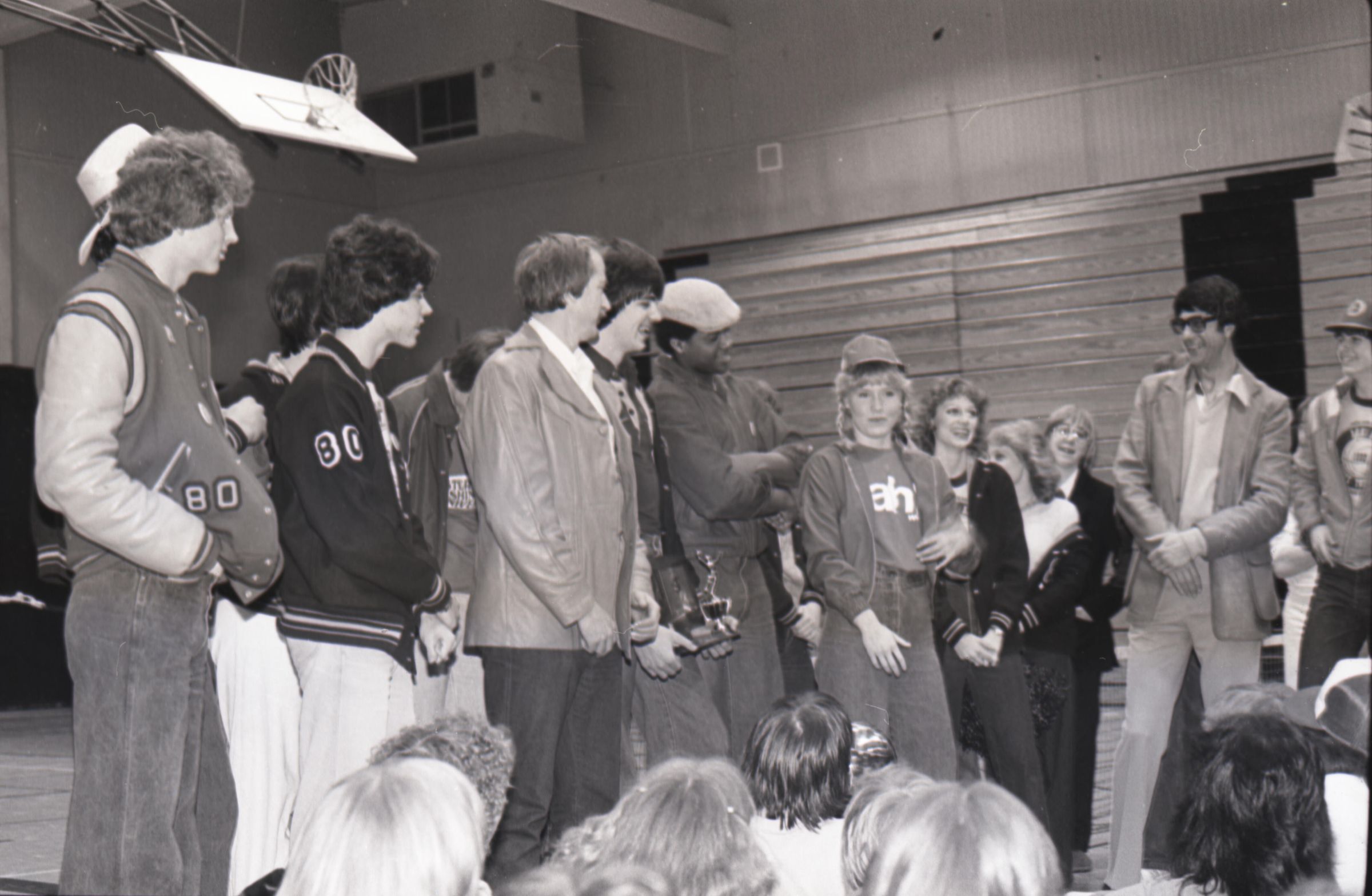 Timberline, State Basketball Champions, 1980. Championship game between Timberline and Cheney High Schools. These seventeen black and white film negative strips were created for the Lacey Leader newspaper. These images were created using five separate film rolls, so some of the physical numbers on the strips are repeated.Made/Created