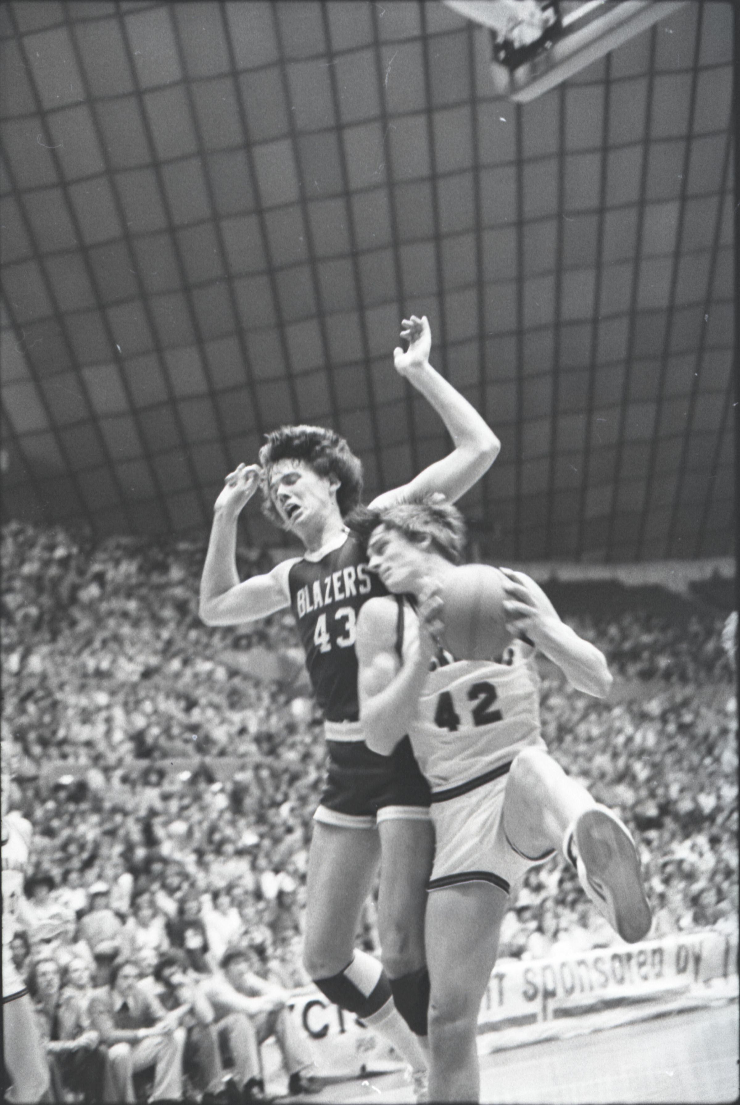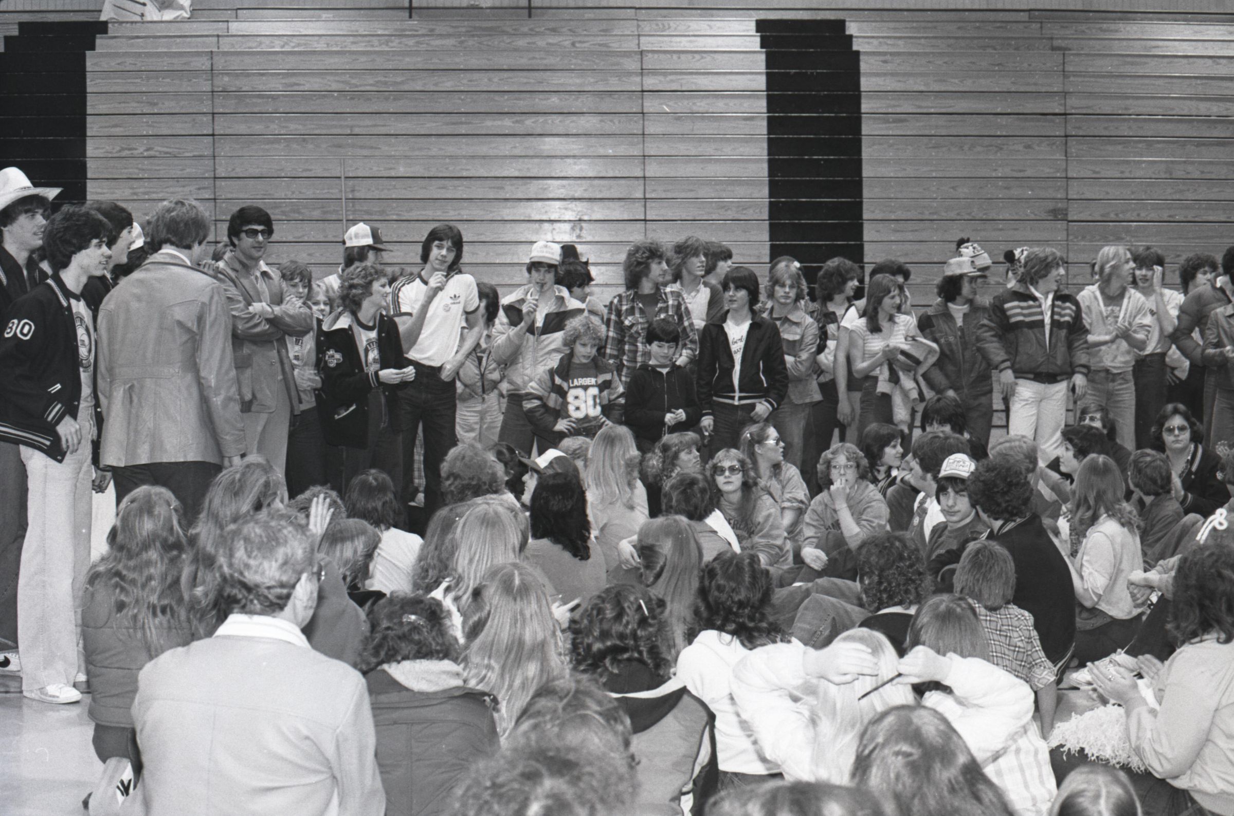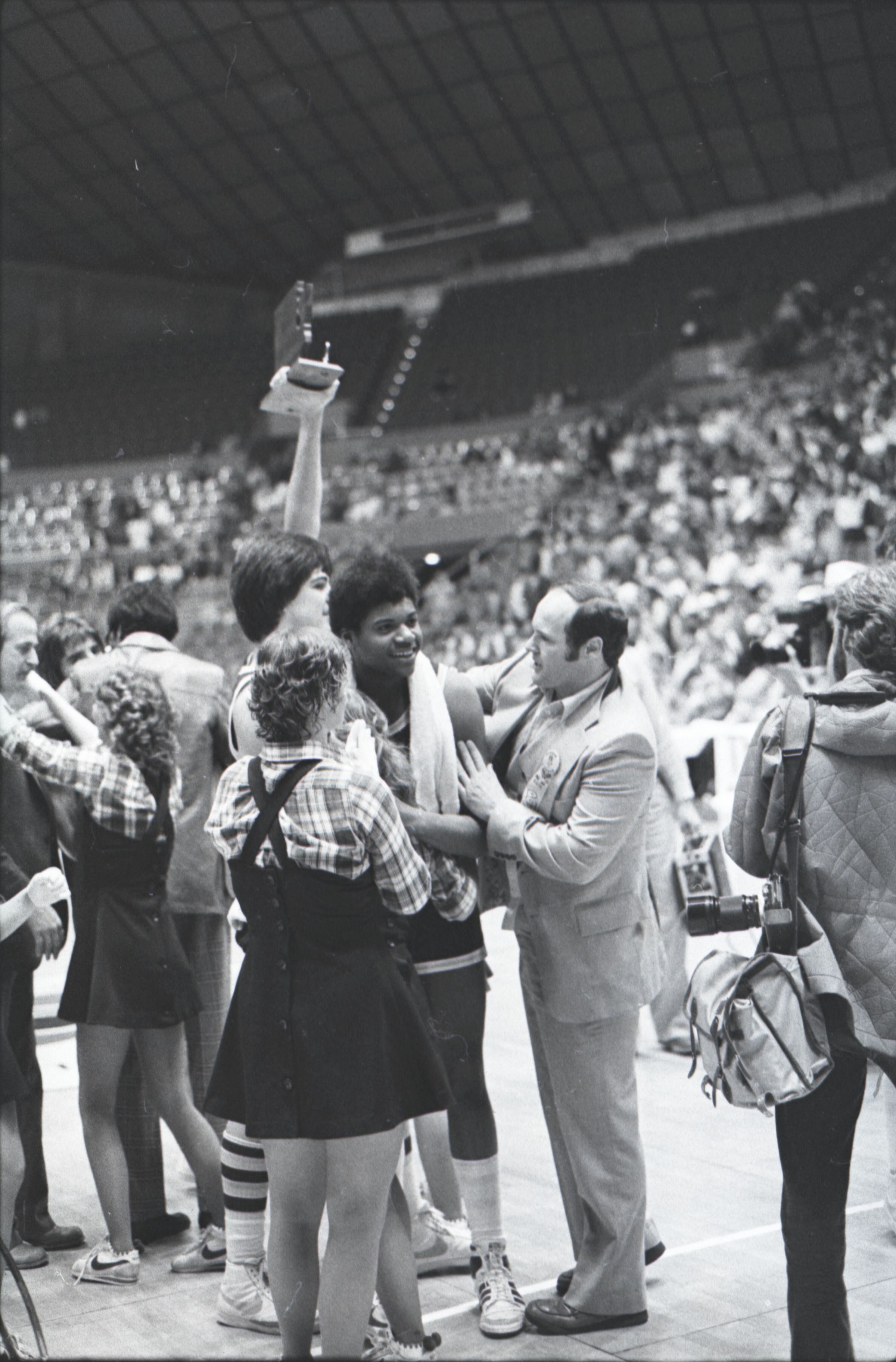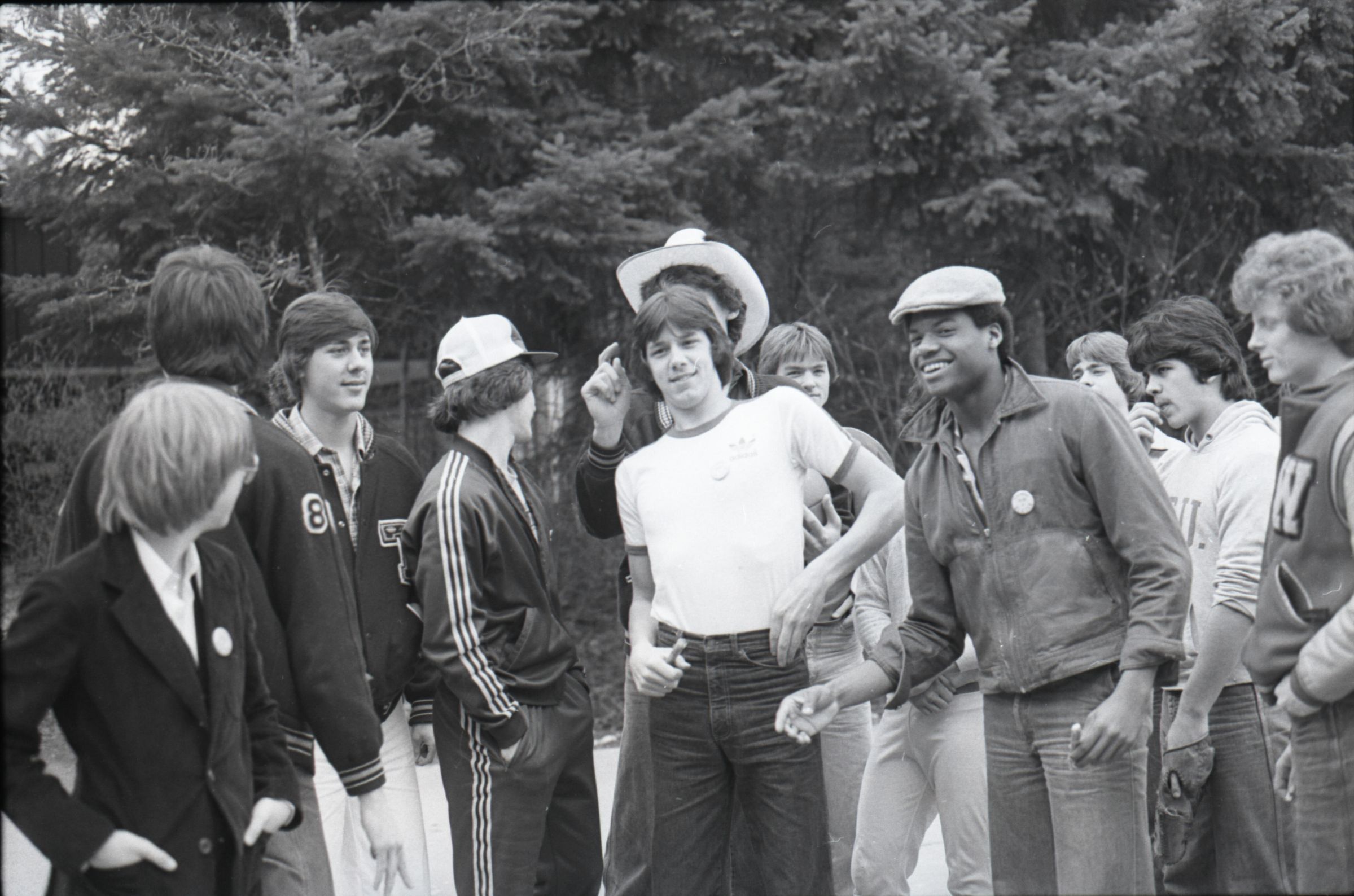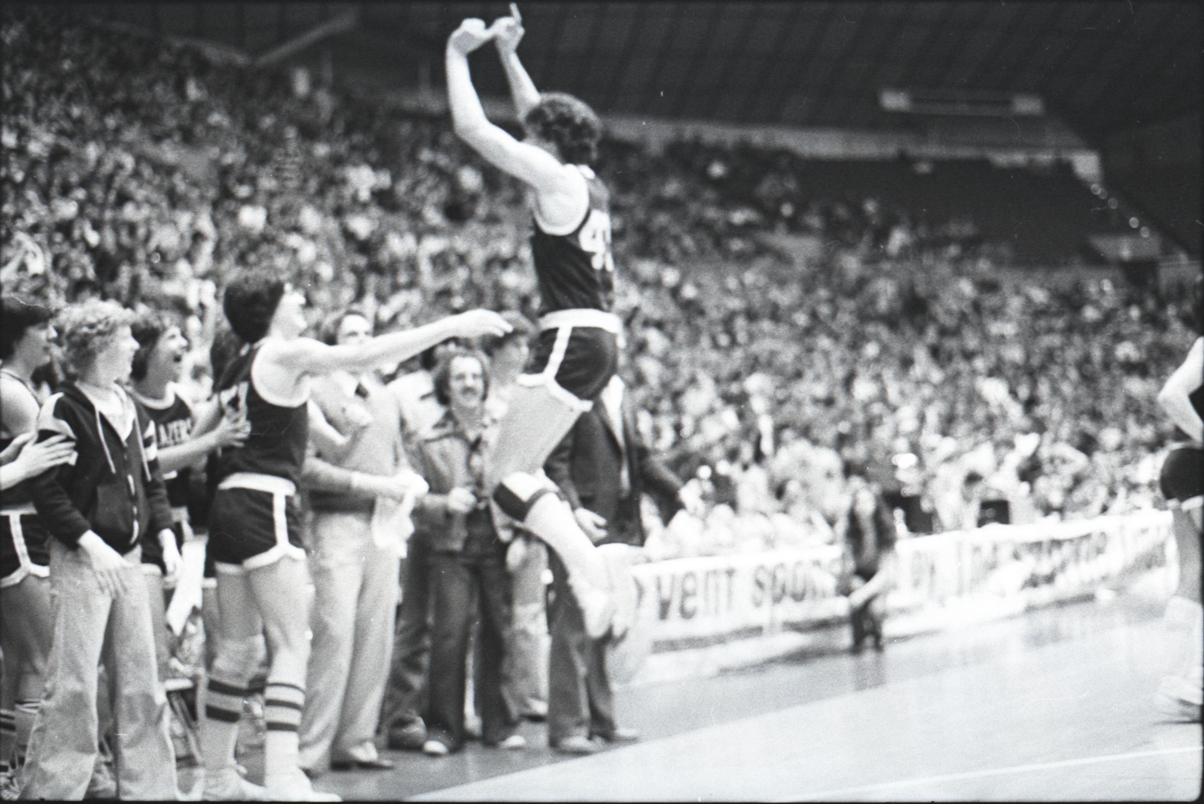 Timberline, State Basketball Champions, 1980. Championship game between Timberline and Cheney High Schools. These seventeen black and white film negative strips were created for the Lacey Leader newspaper. These images were created using five separate film rolls, so some of the physical numbers on the strips are repeated.Made/Created