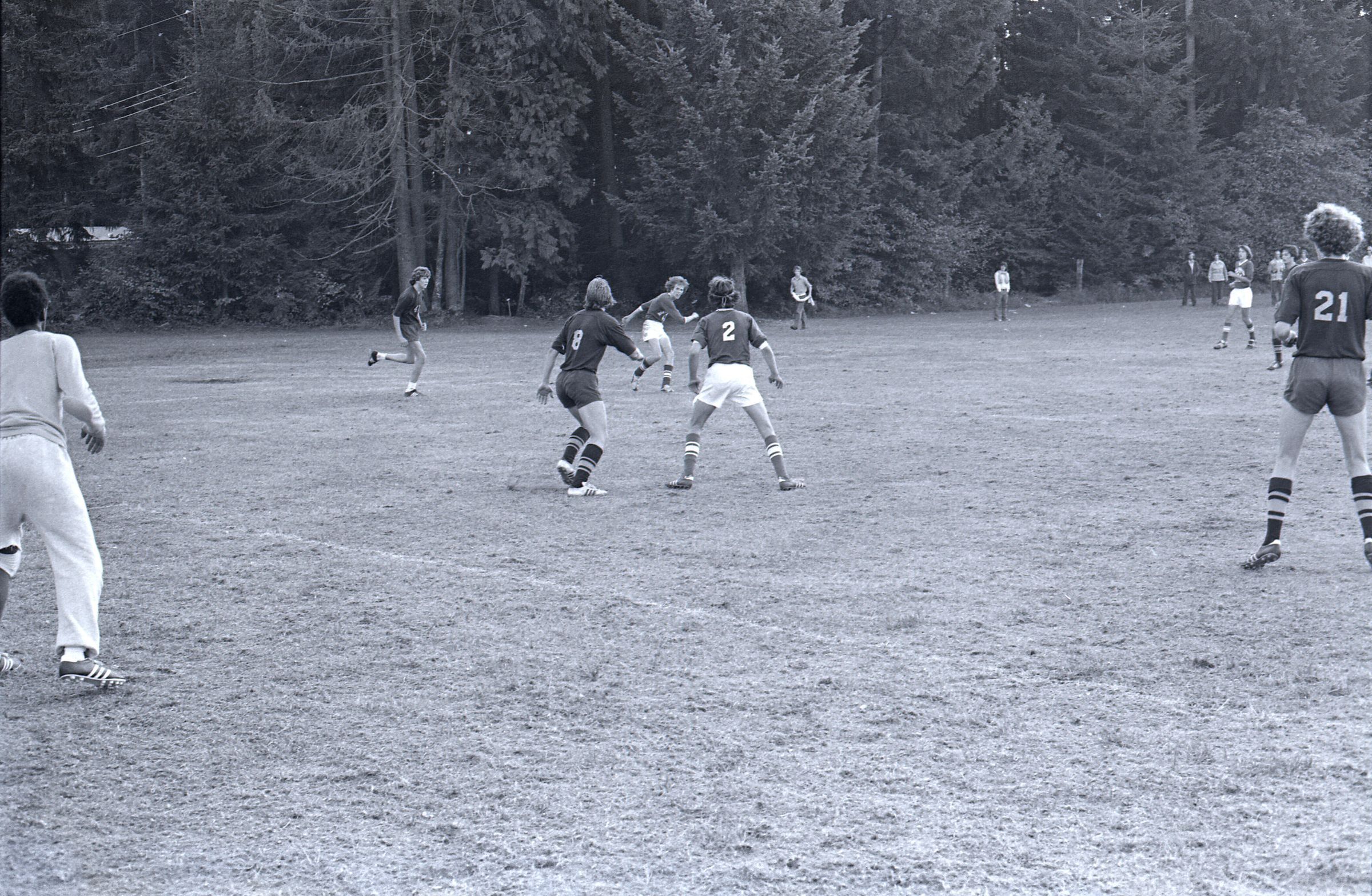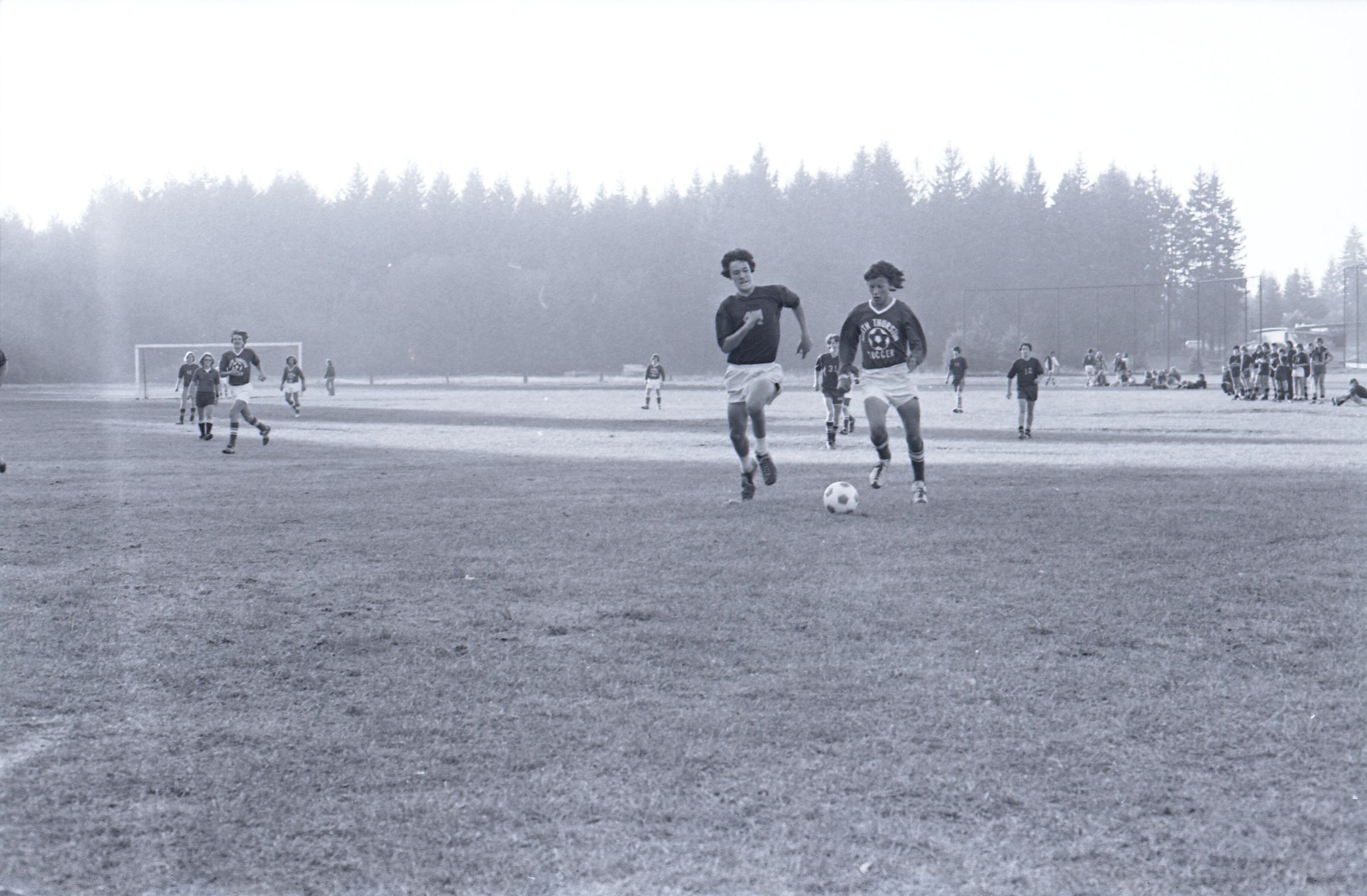 The images 2a-14a are of the match on 10-30-1974. These images are all action shots from different points during the game. One team wears jerseys labeled "North Thurston Soccer". The other team's jerseys are not labeled.Made/Created