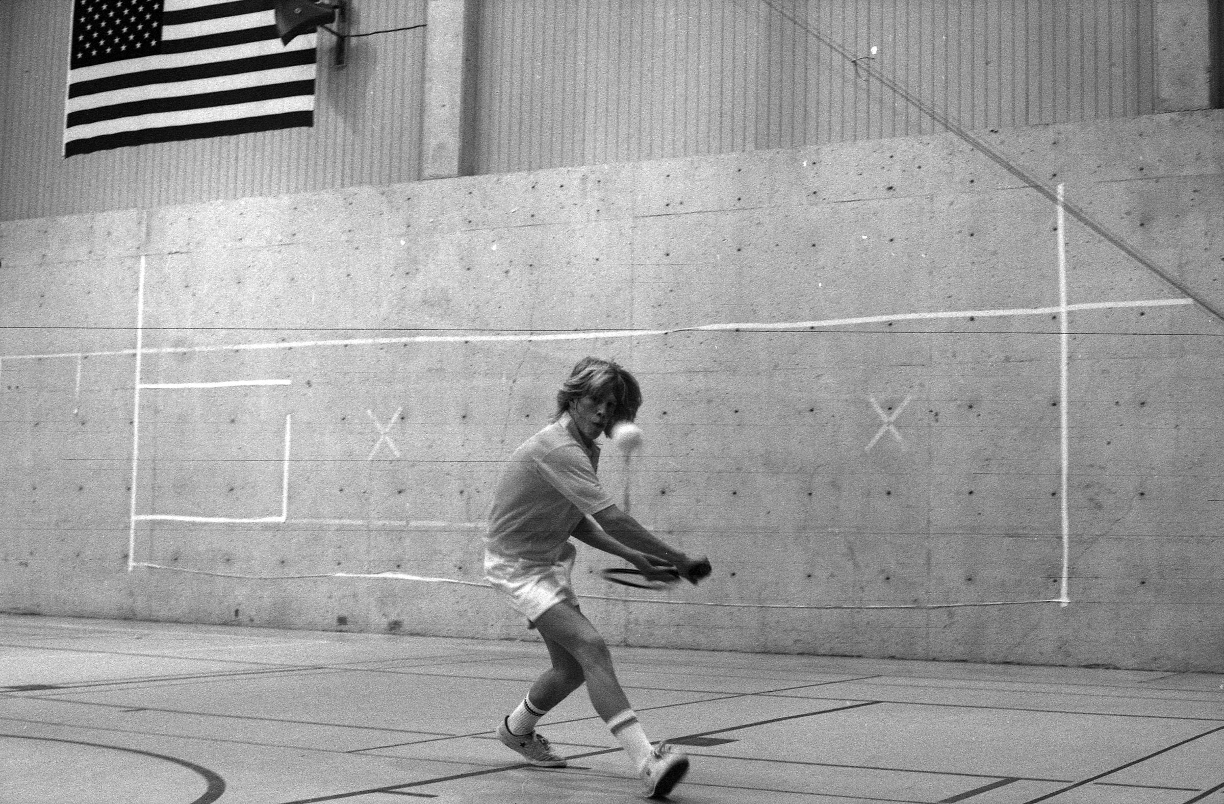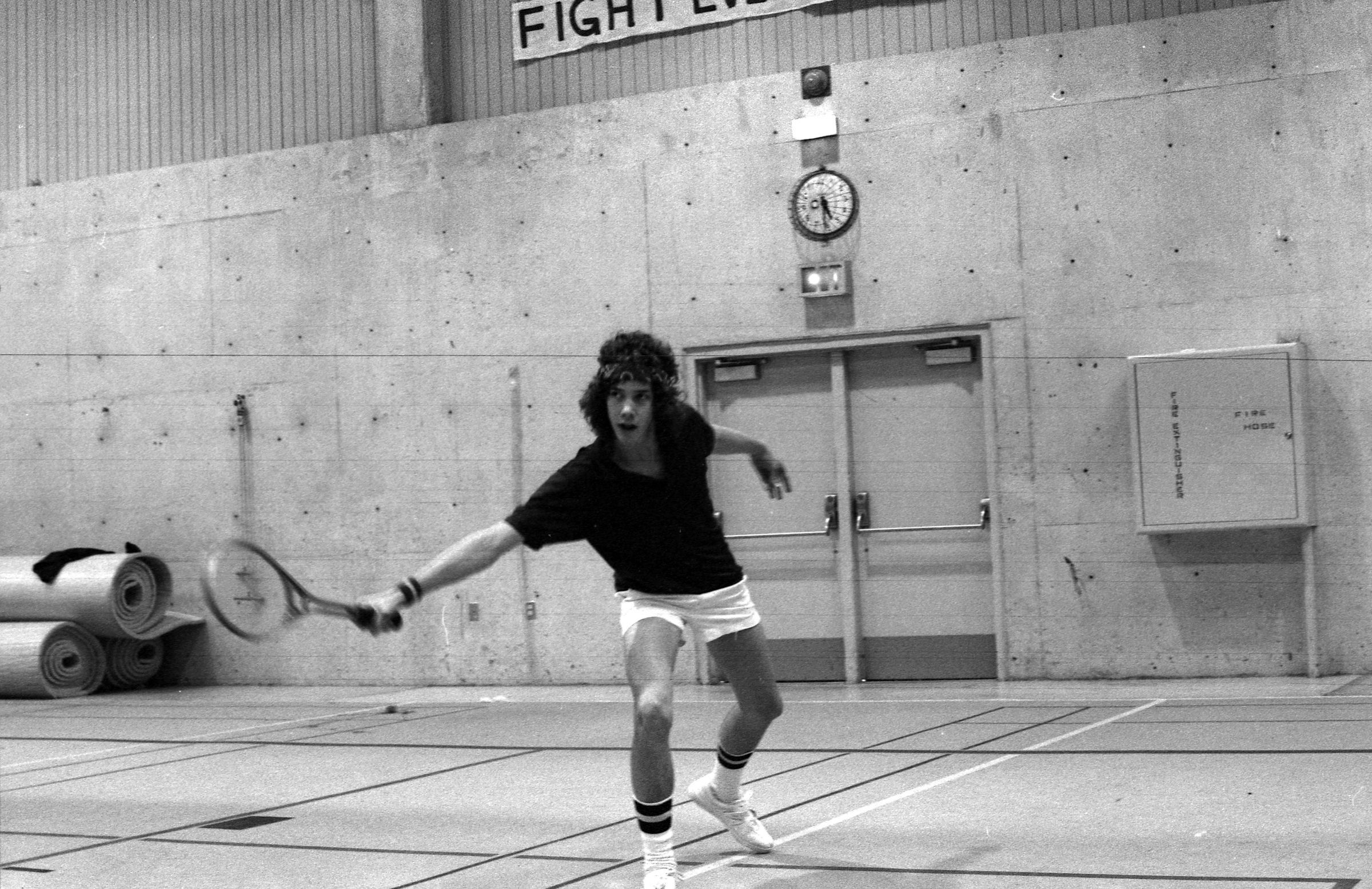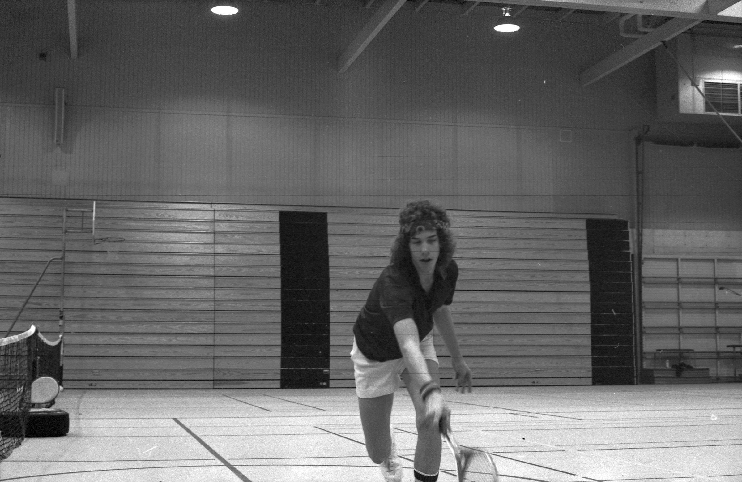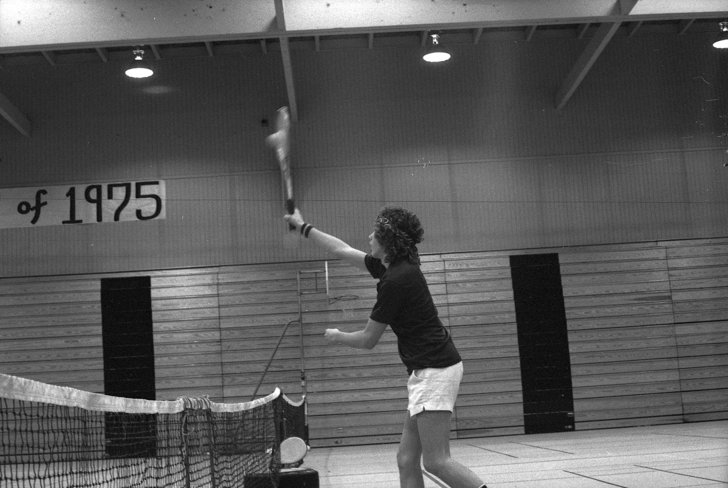 Tennis, 03-26-1975. These three black and white negative film strips were created for the Lacey Leader newspaper. They depict two individuals playing tennis.Made/Created