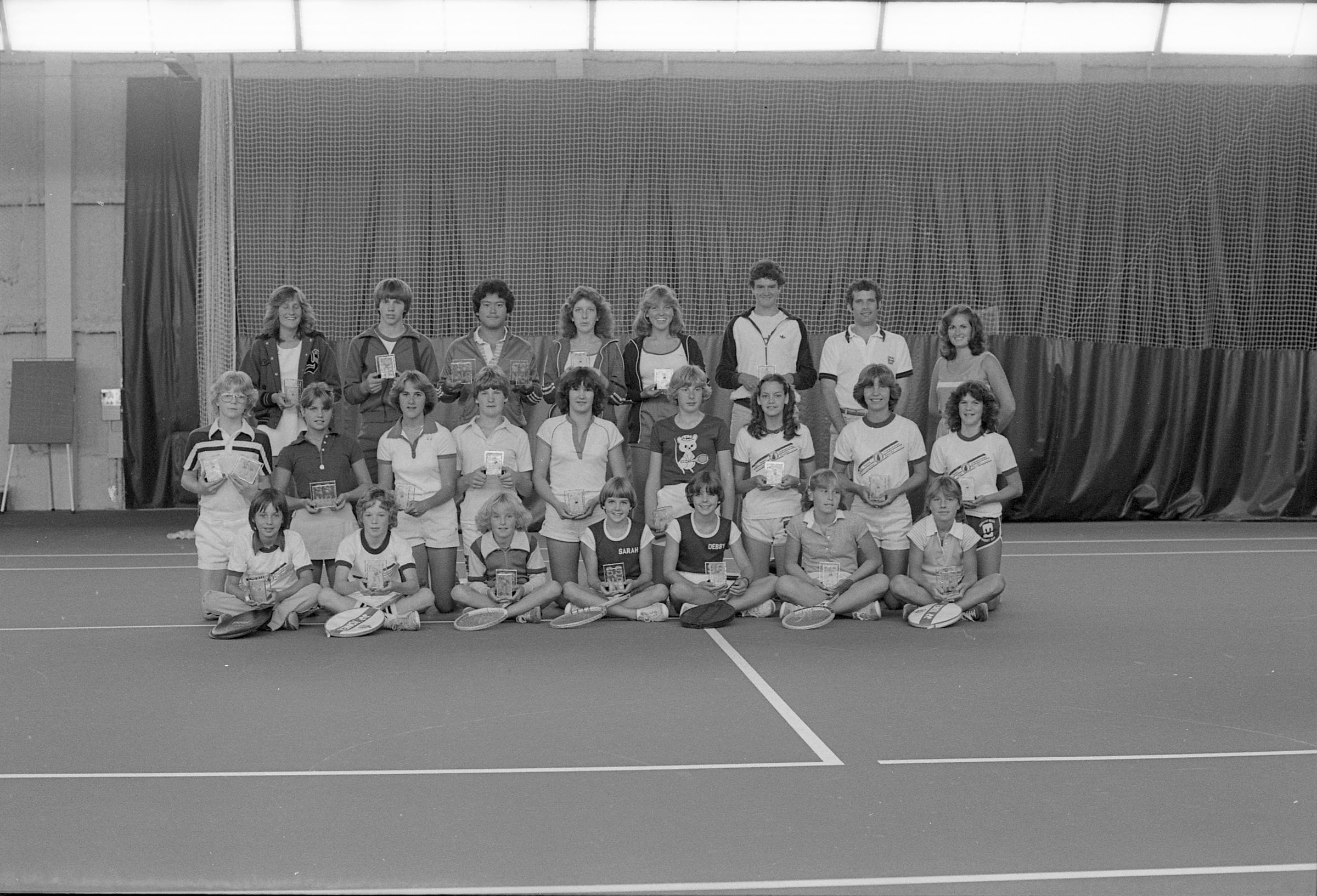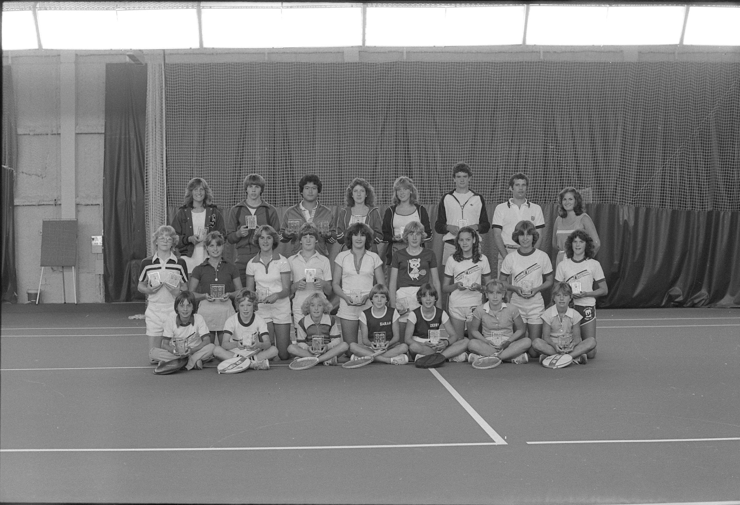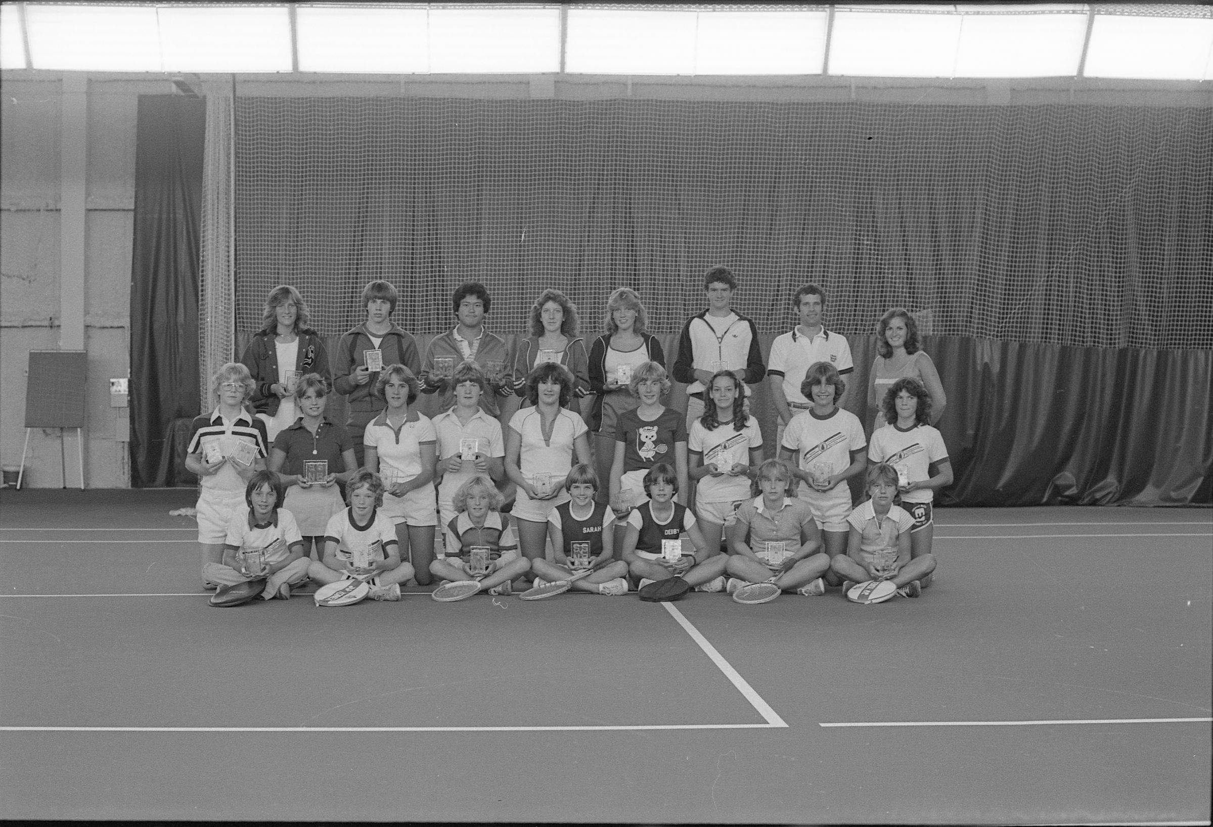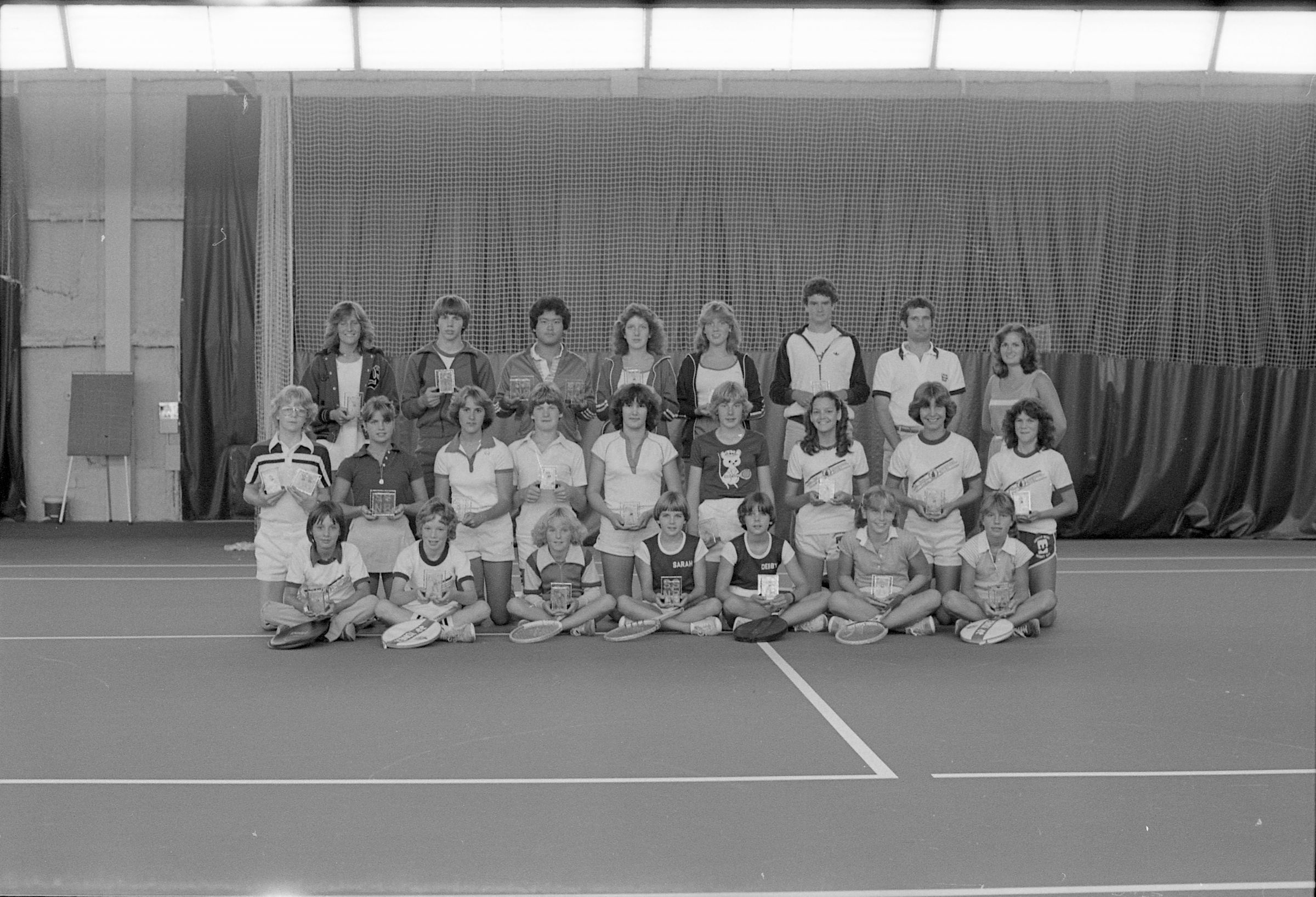 Tumwater Valley Racquet Club Jrs. Tennis Tournament, 07-28-1979. These two black and white negative film strips were created for the Lacey Leader newspaper. They depict tennis players in group and action shots.Made/Created