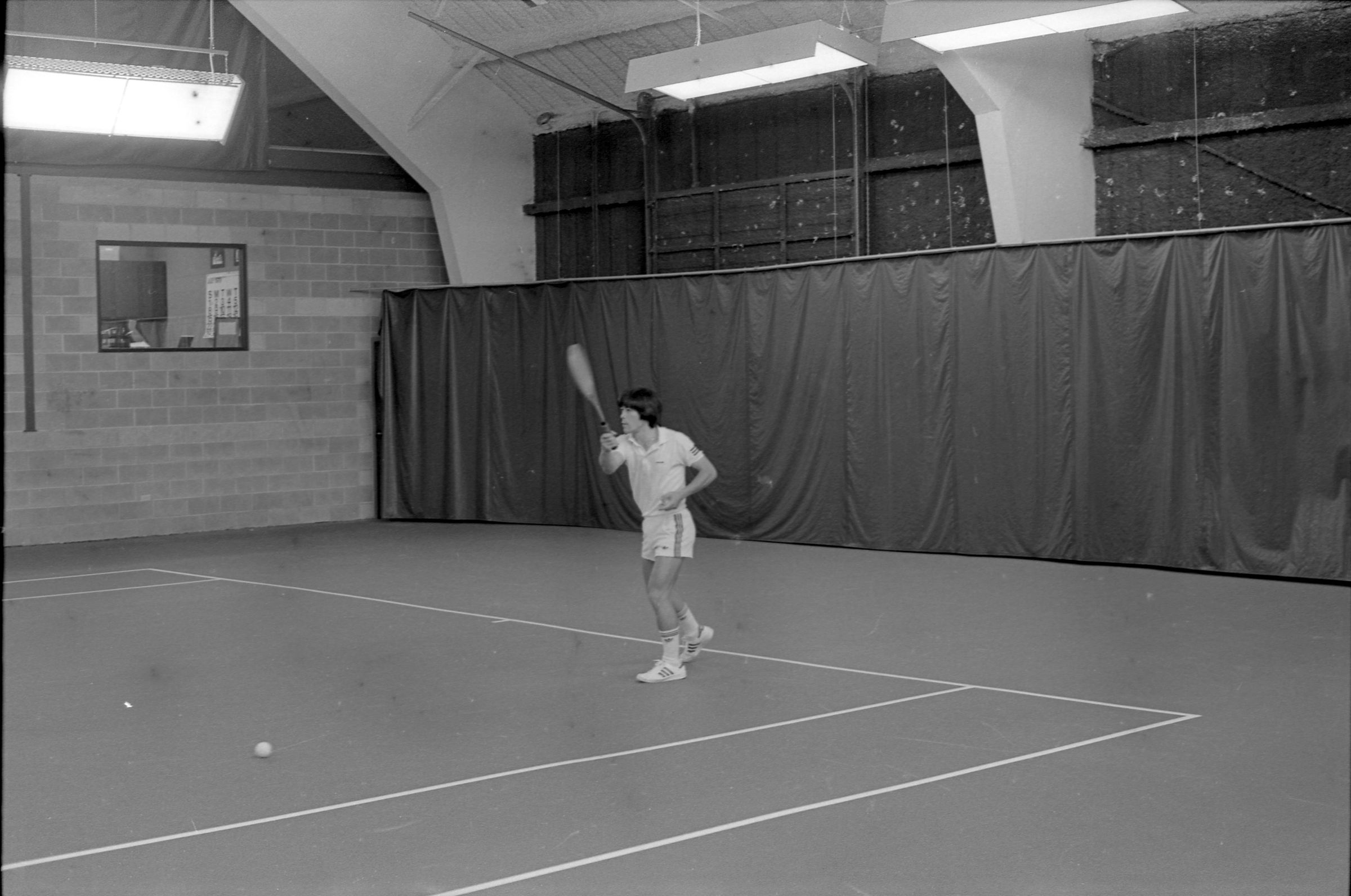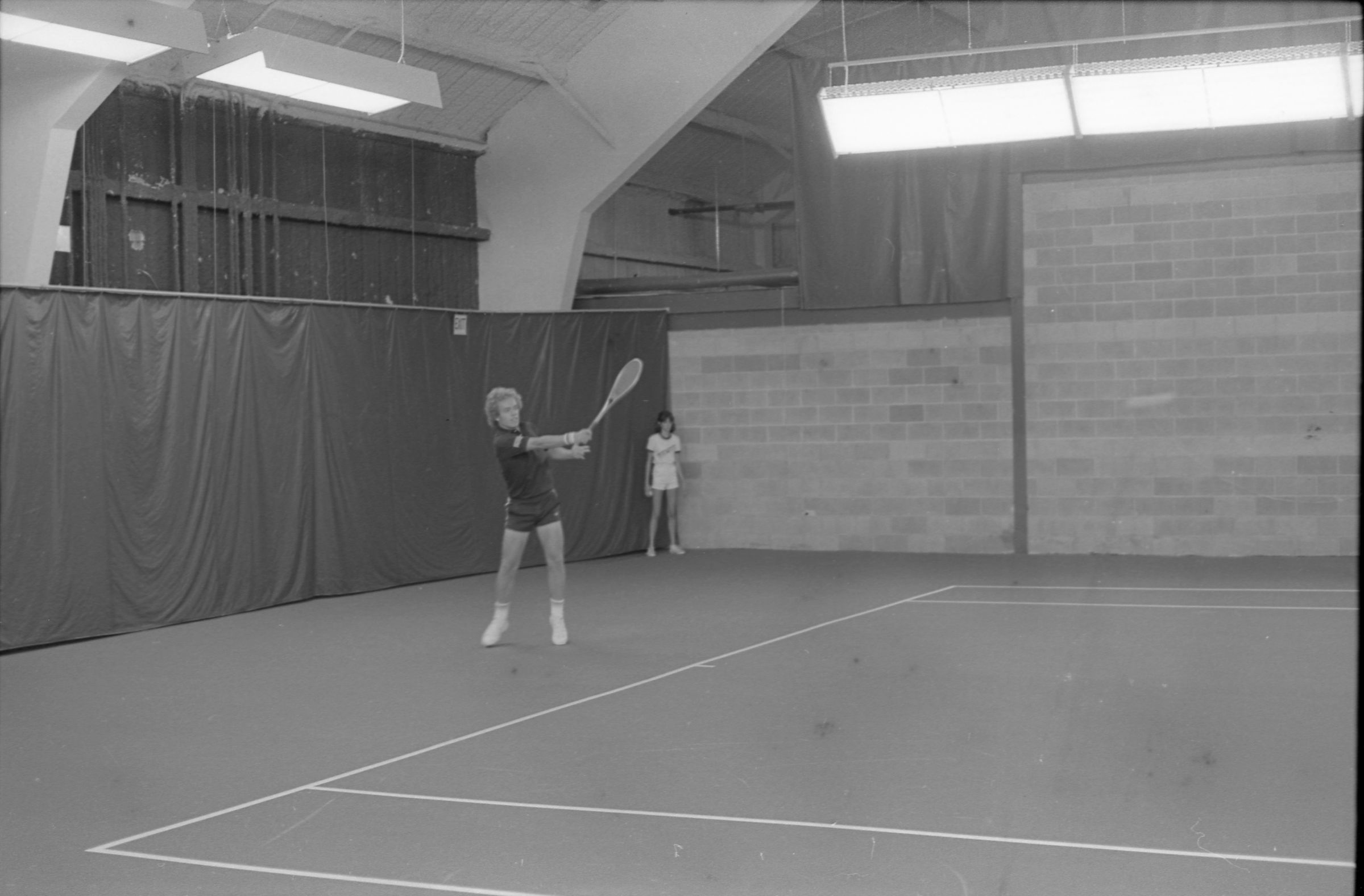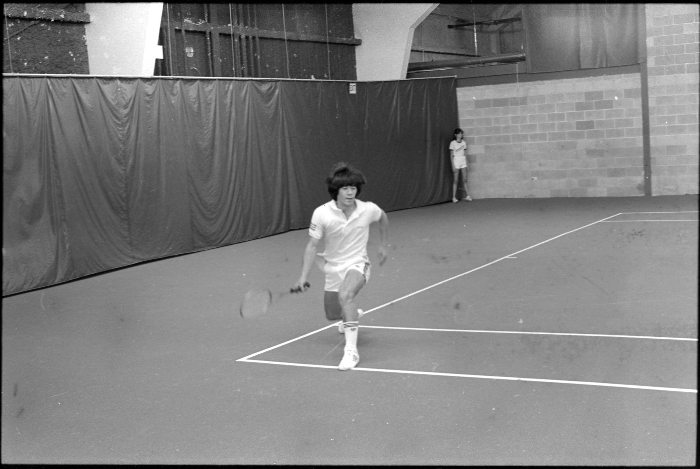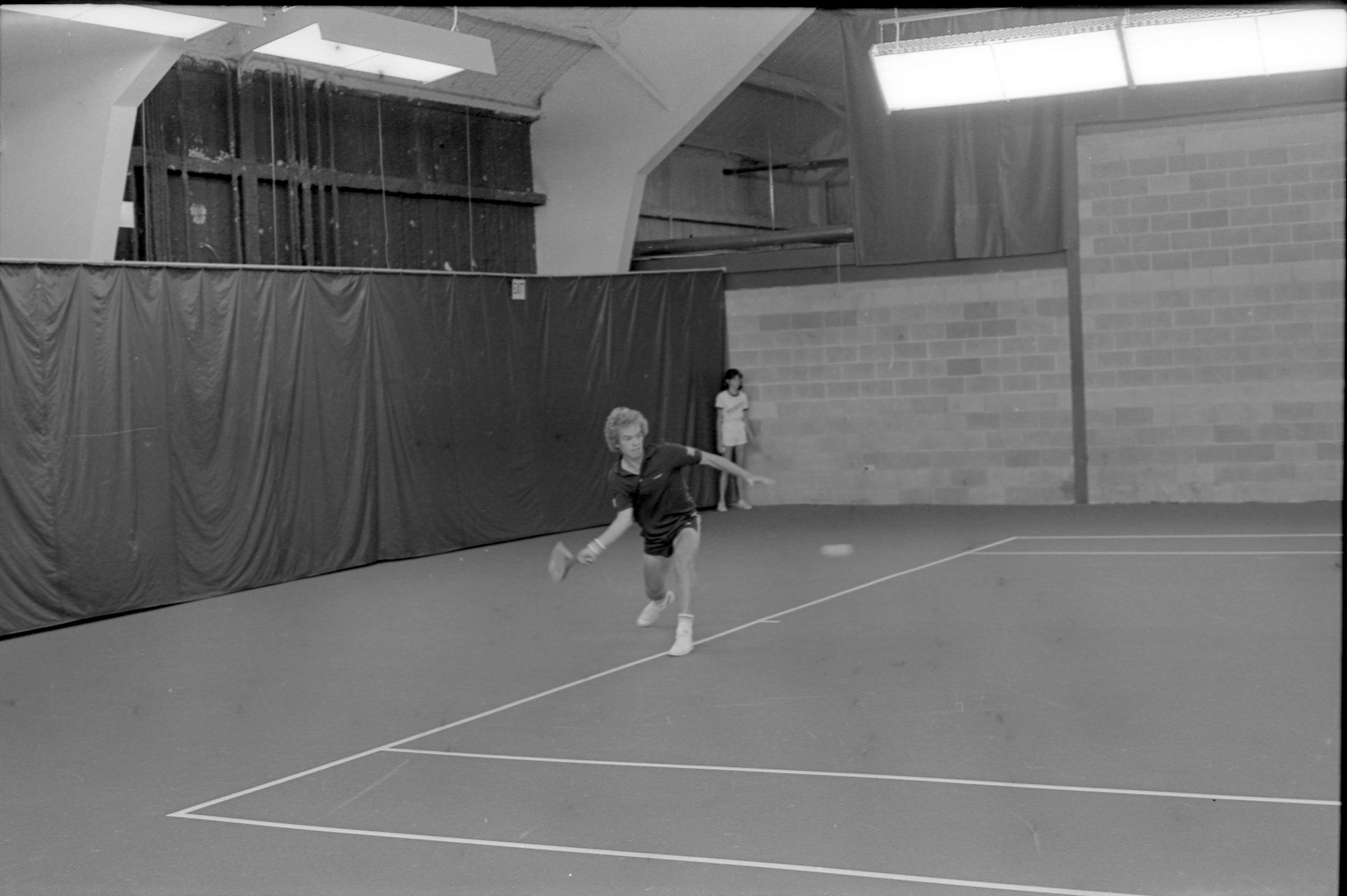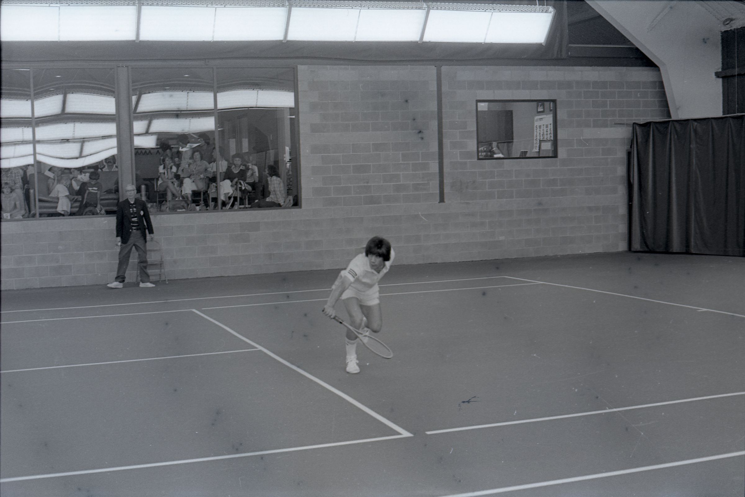 Tumwater Valley Racquet Club Jrs. Tennis Tournament, 07-28-1979. These two black and white negative film strips were created for the Lacey Leader newspaper. They depict tennis players in group and action shots.Made/Created