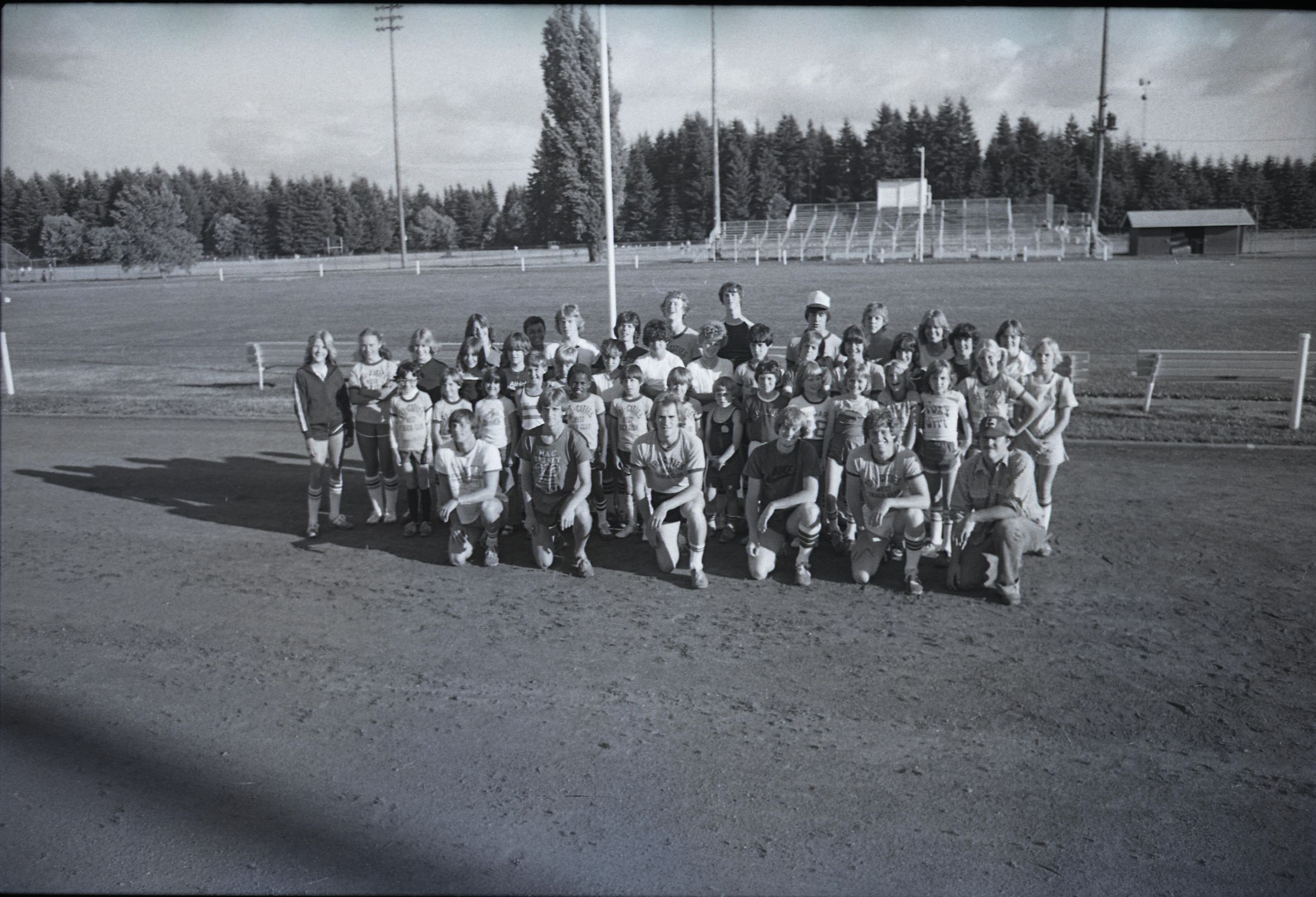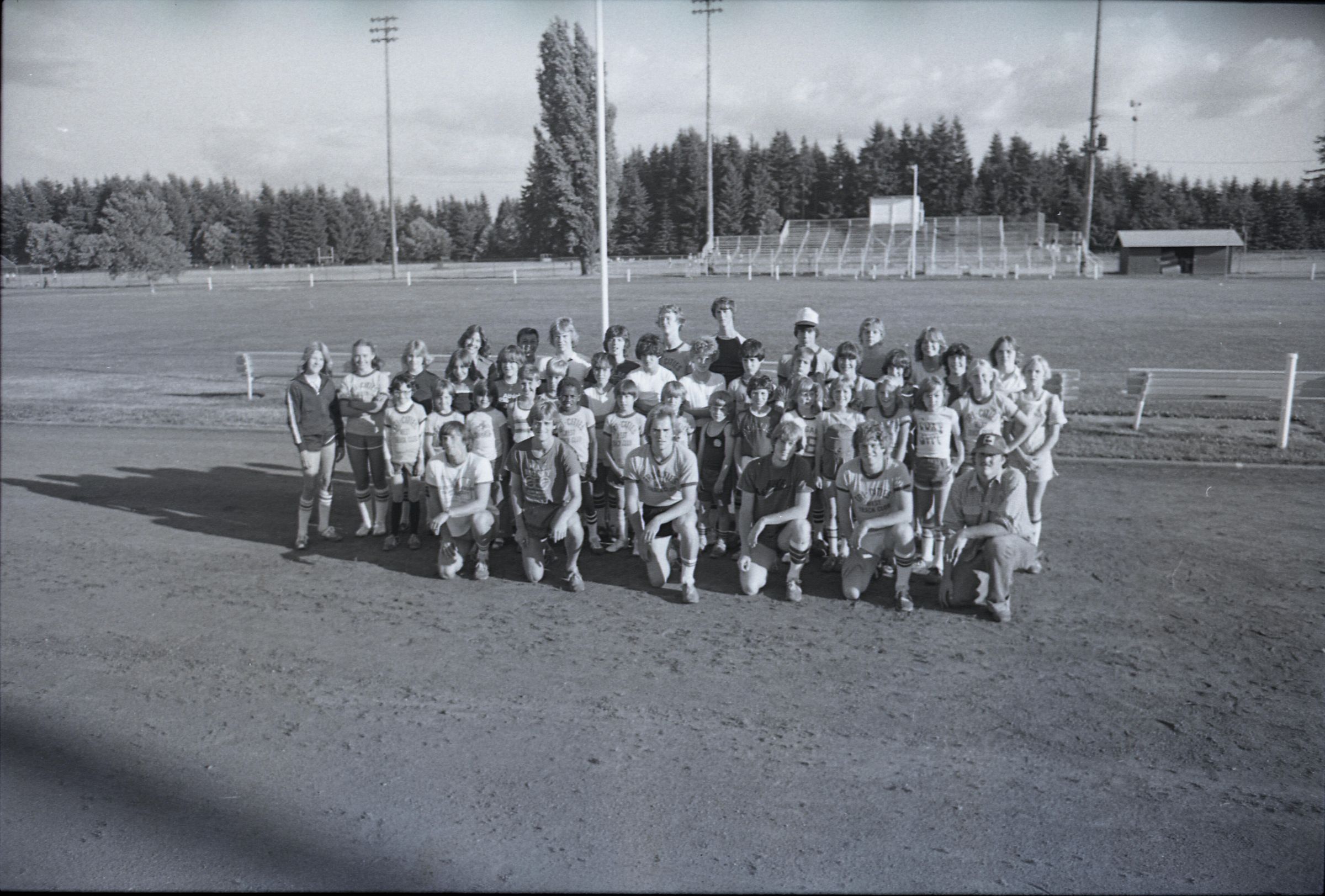 Tri-Cities West Track Team, Unknown Date. This single black and white film negative strip was created for the Lacey Leader newspaper. The Tri-Cities West Track Team appears to have been a team made up of athletes from Olympia, Lacey and Tumwater. ("Tri-Cities West Track Team Starts," Daily Olympian, 6/12/1980)Made/Created