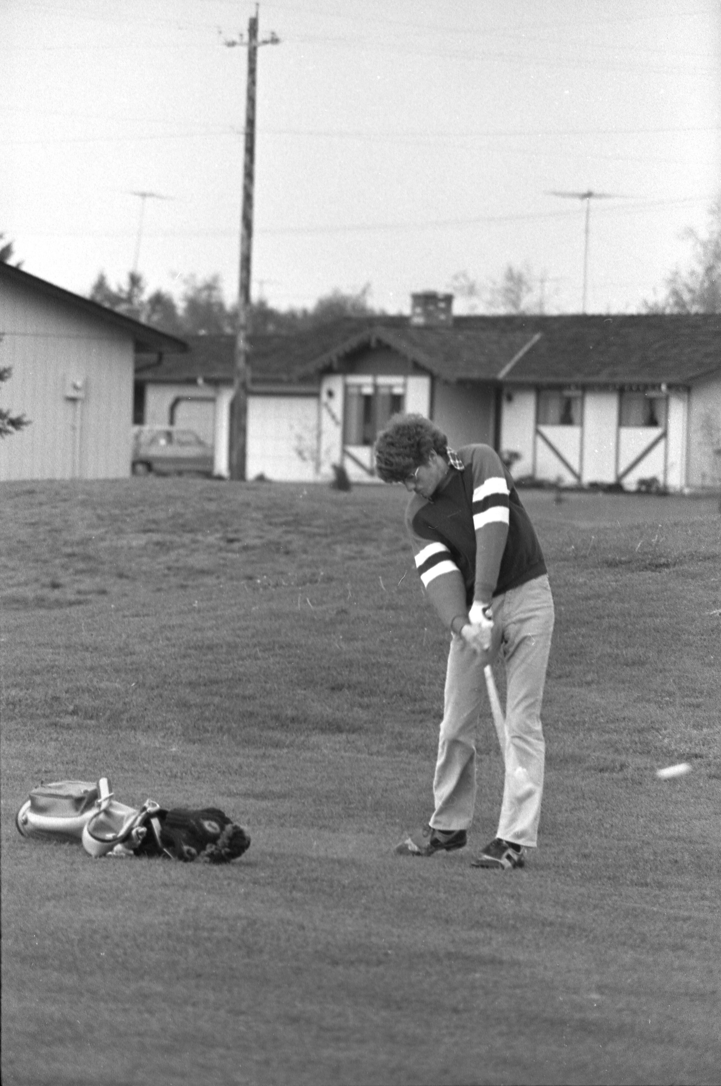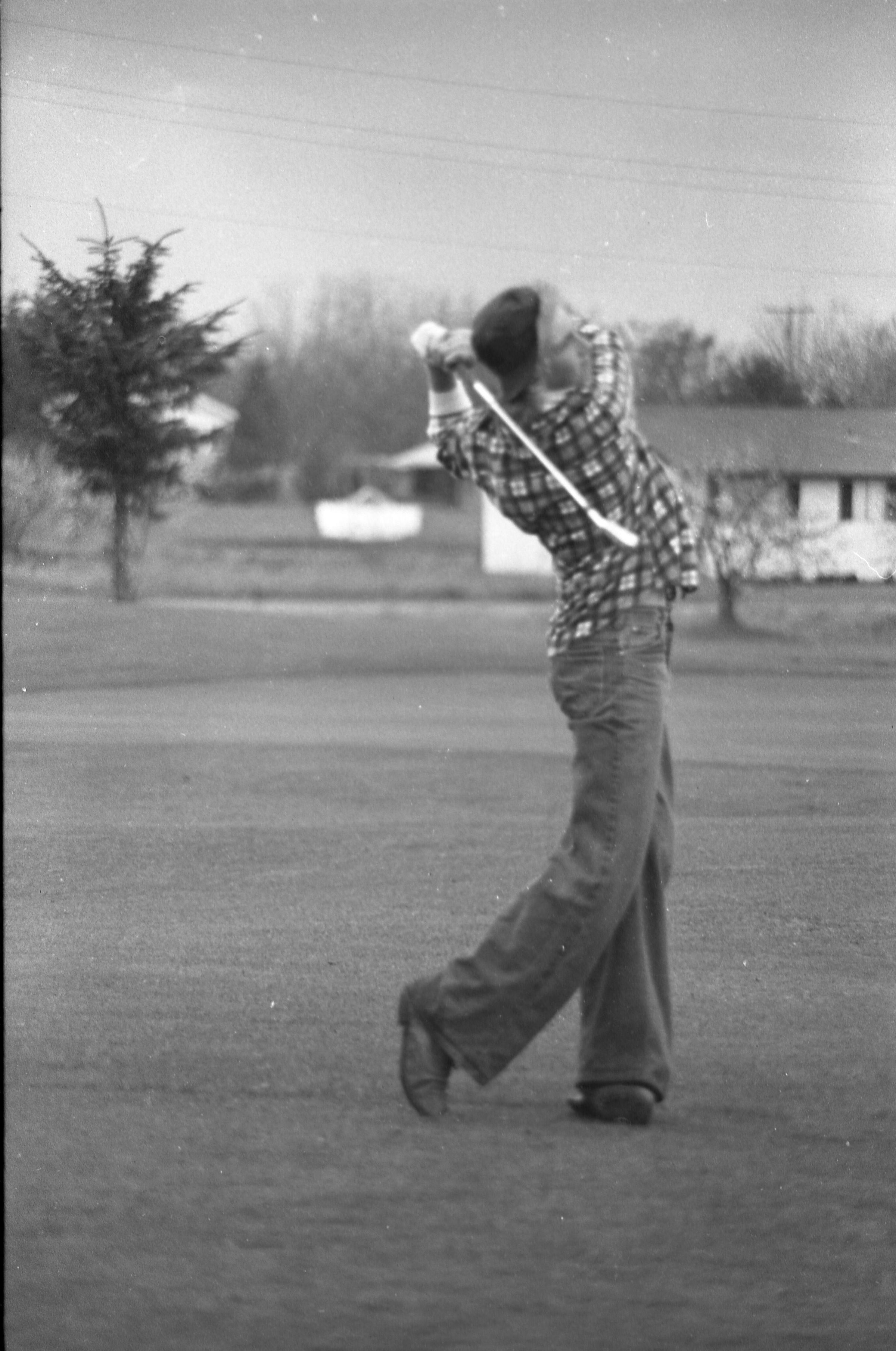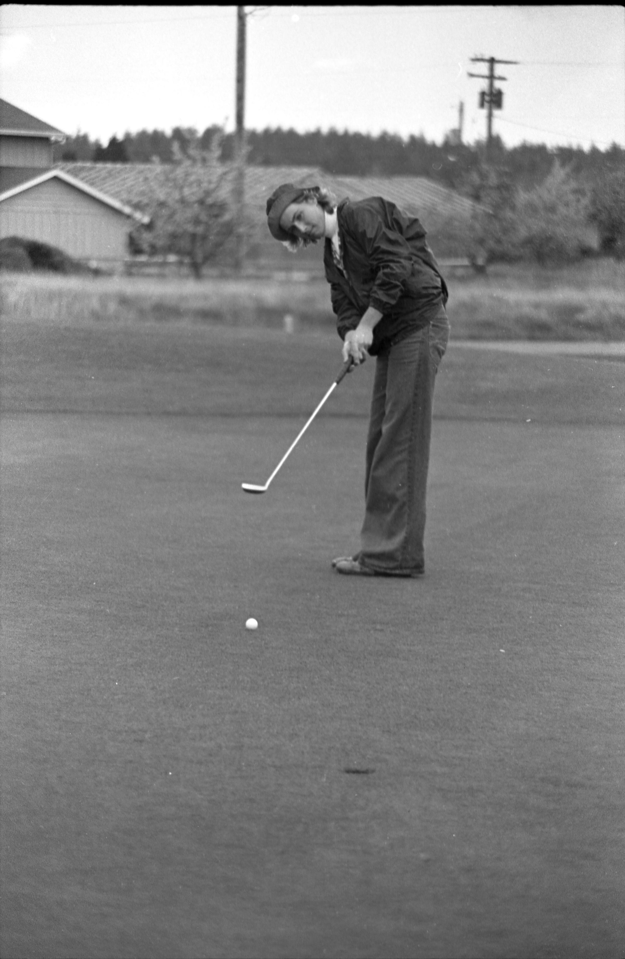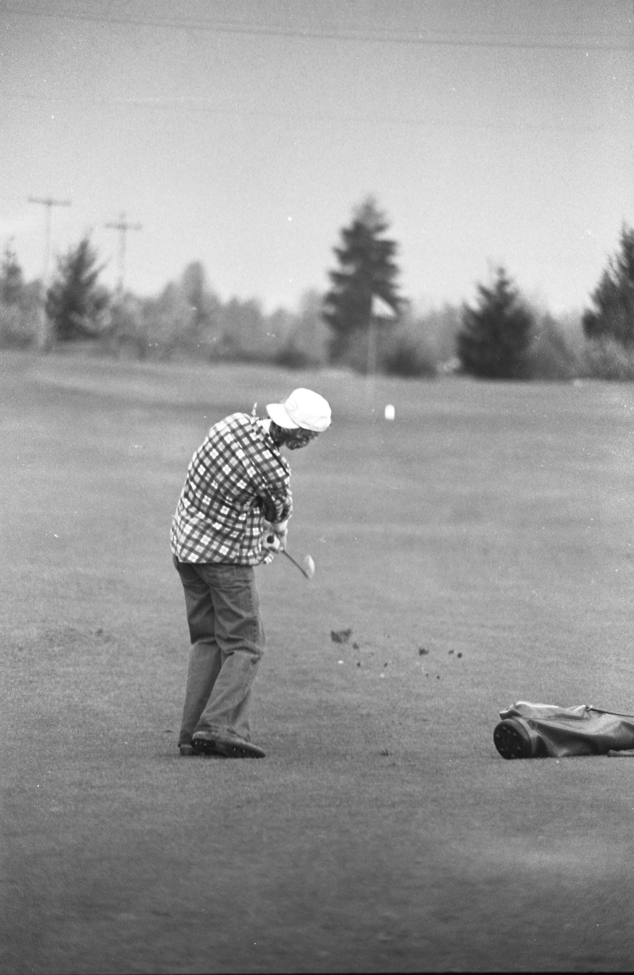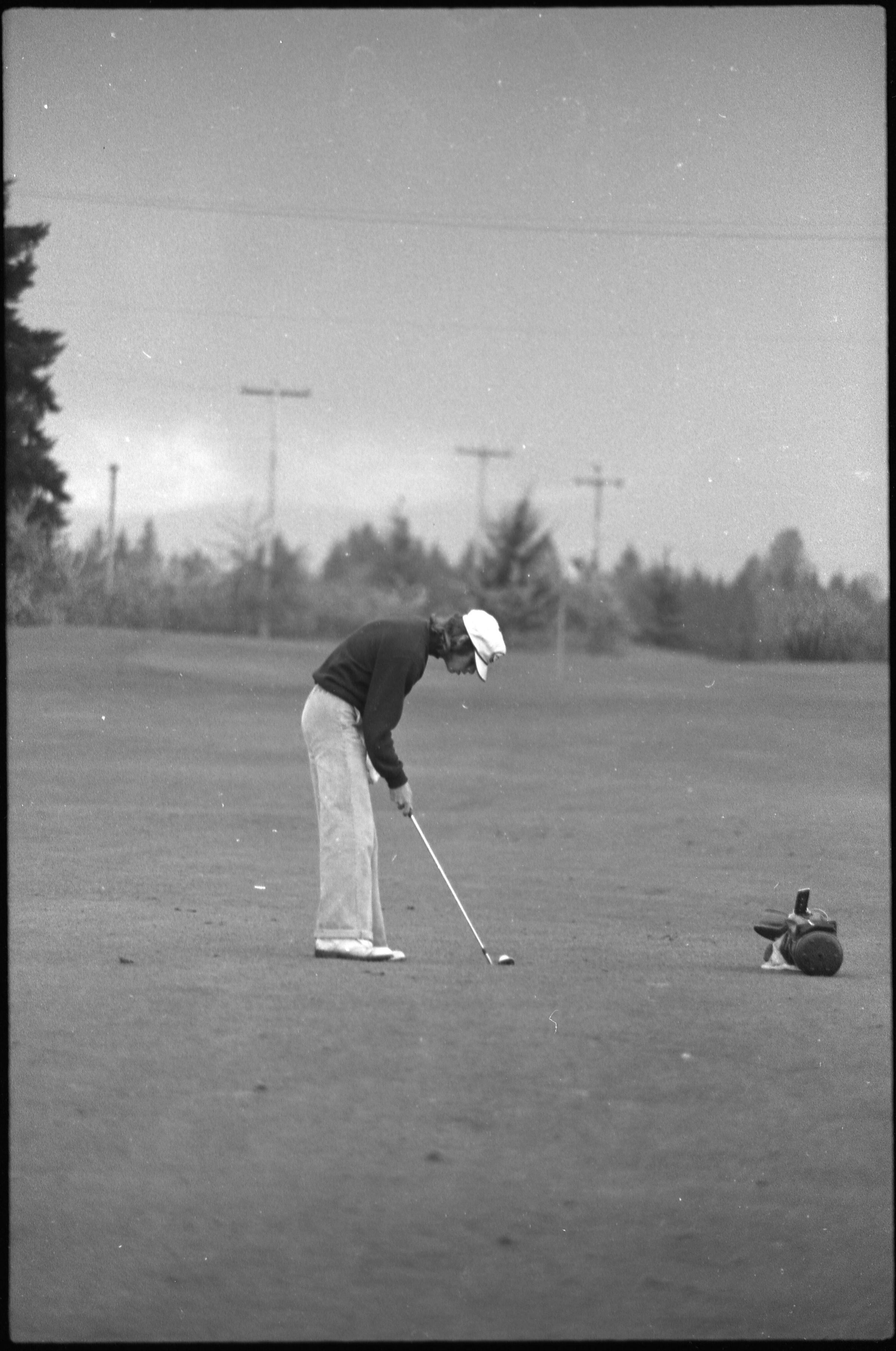 Golf, 1978. These five black and white film negative strips were created for the Lacey Leader newspaper. These images show people playing golf, and also a passing train.Made/Created