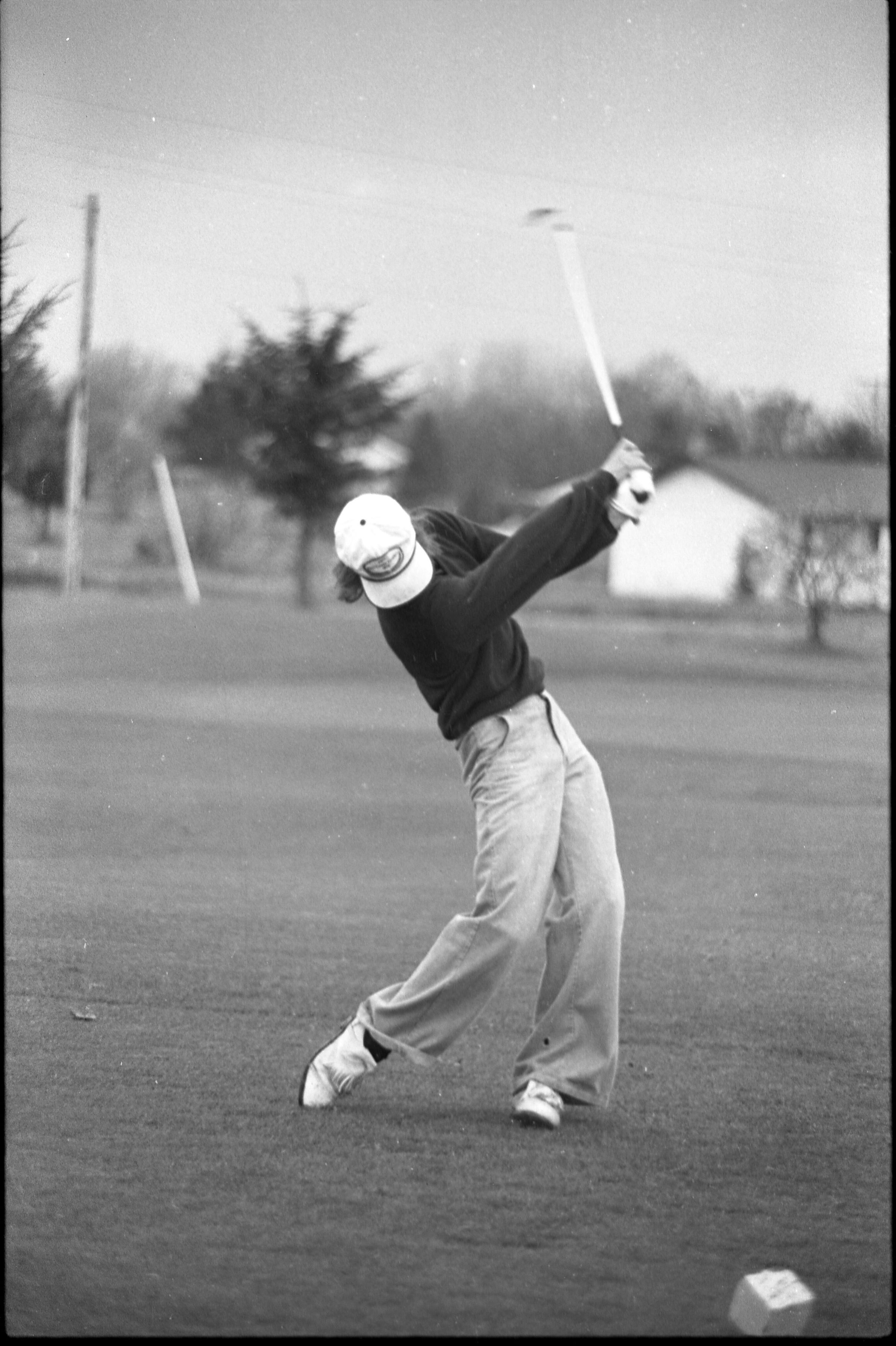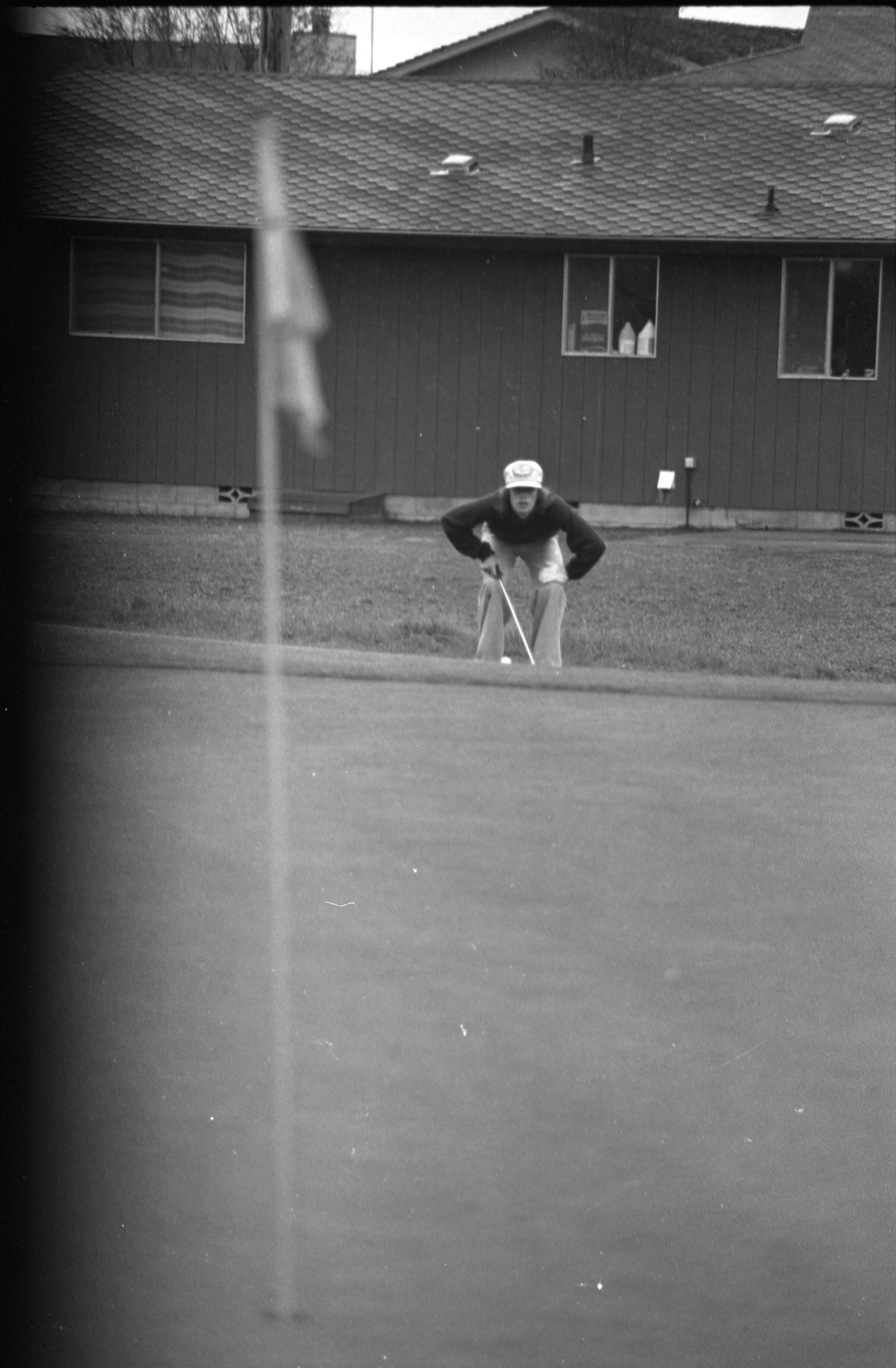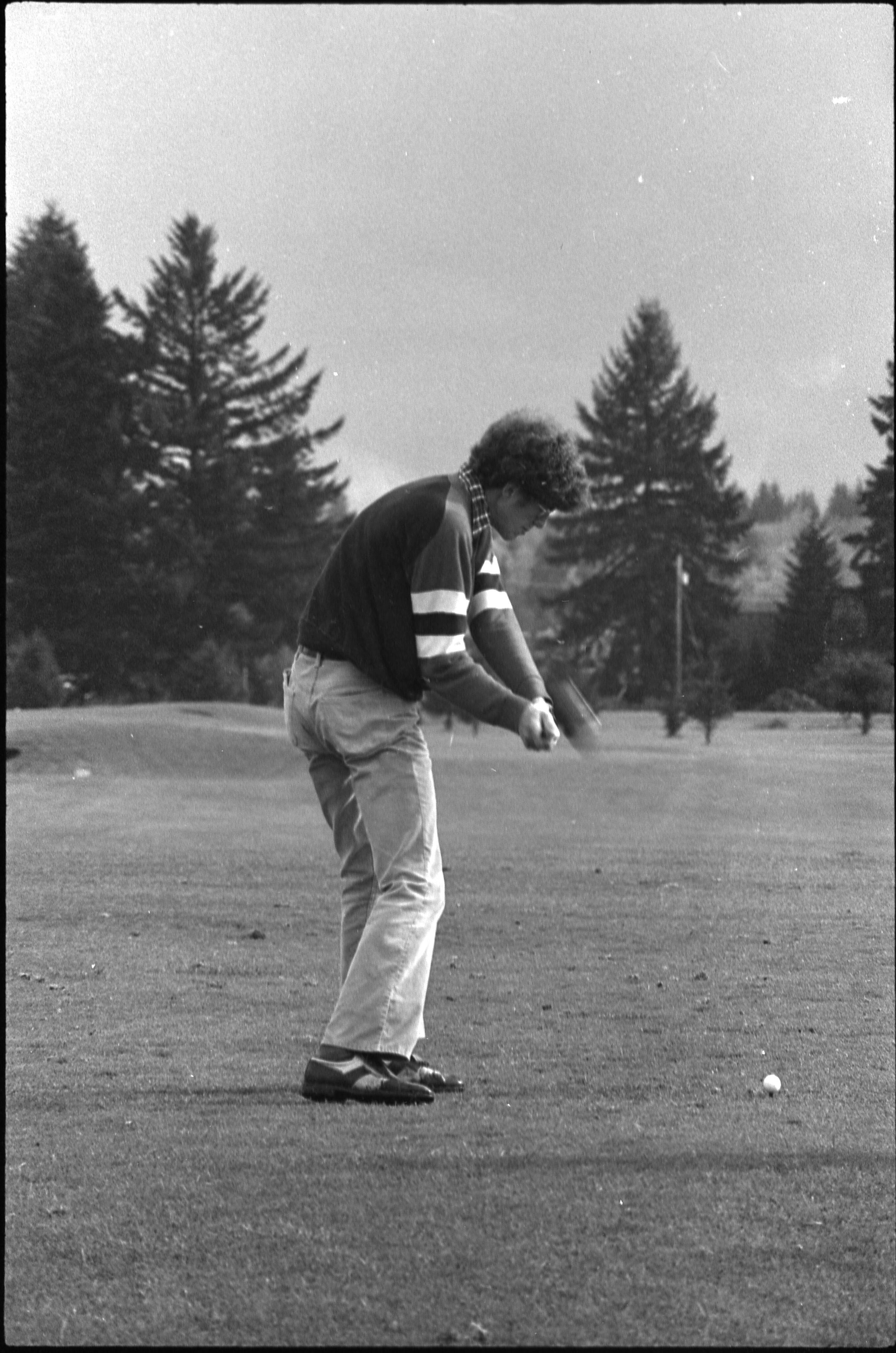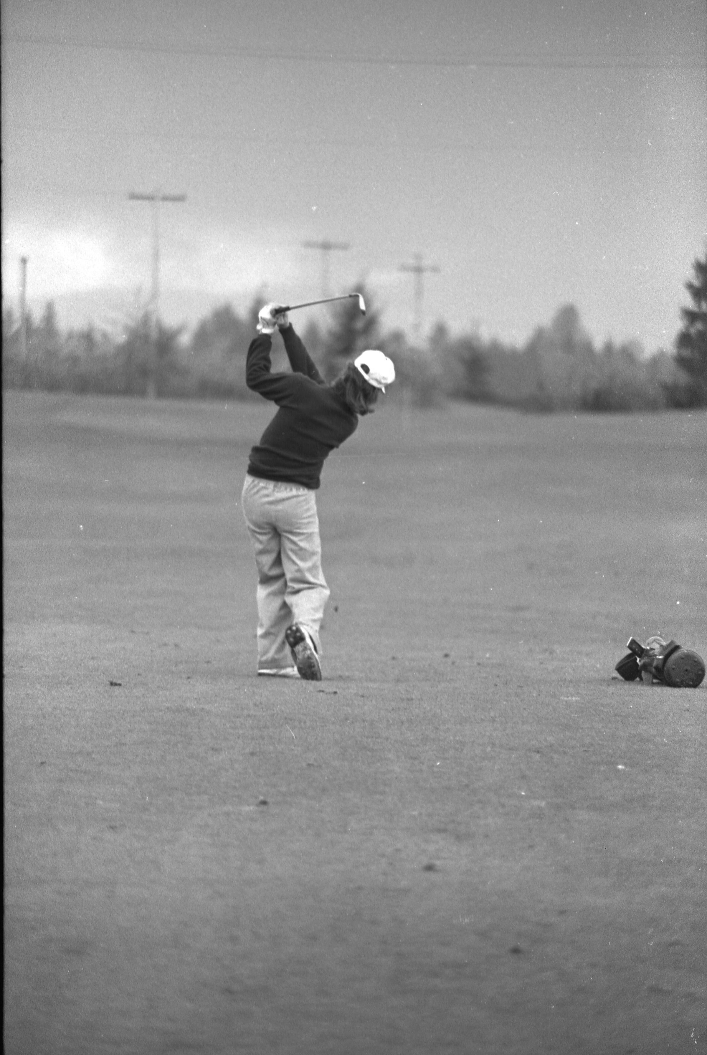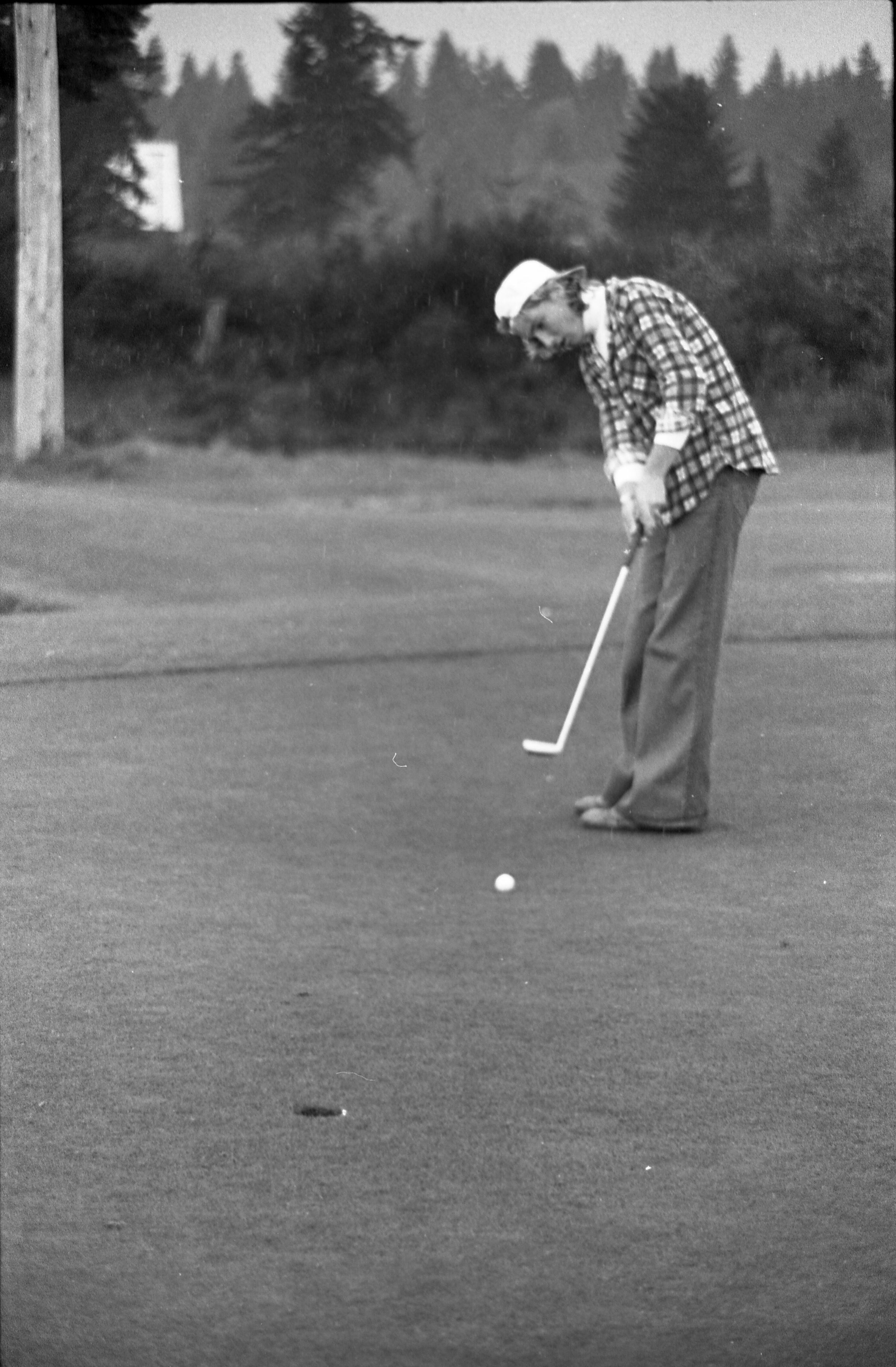 Golf, 1978. These five black and white film negative strips were created for the Lacey Leader newspaper. These images show people playing golf, and also a passing train.Made/Created