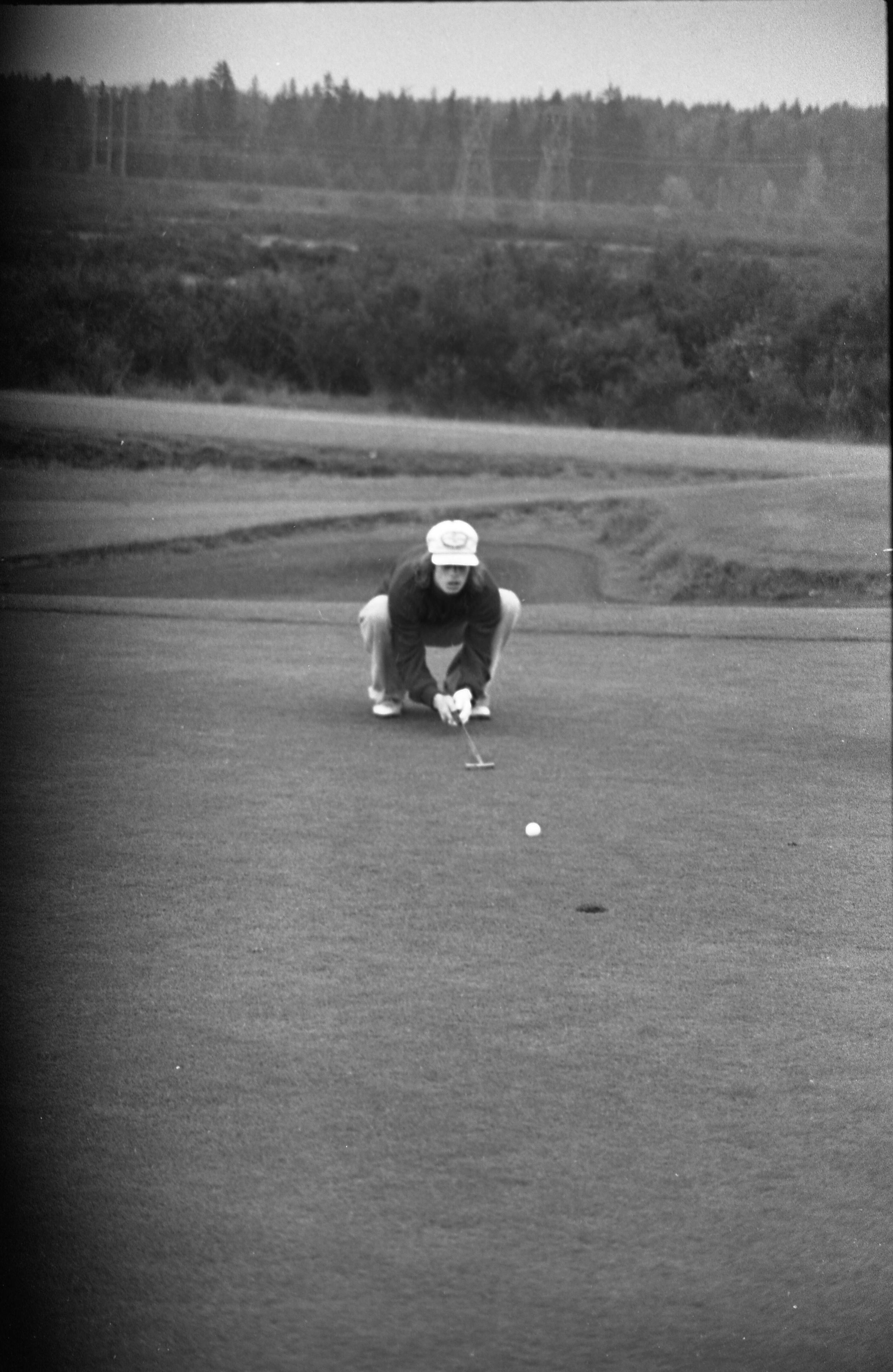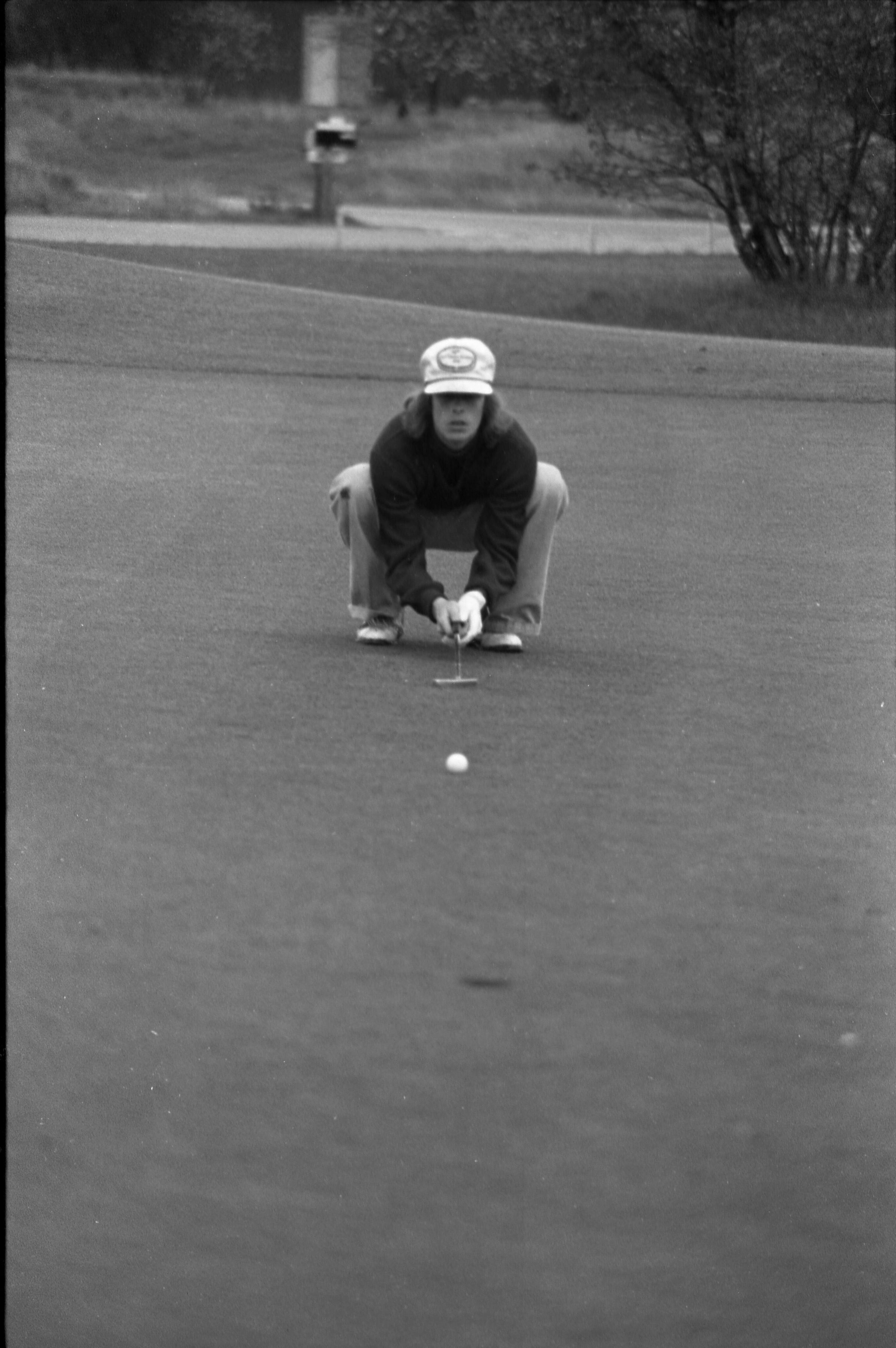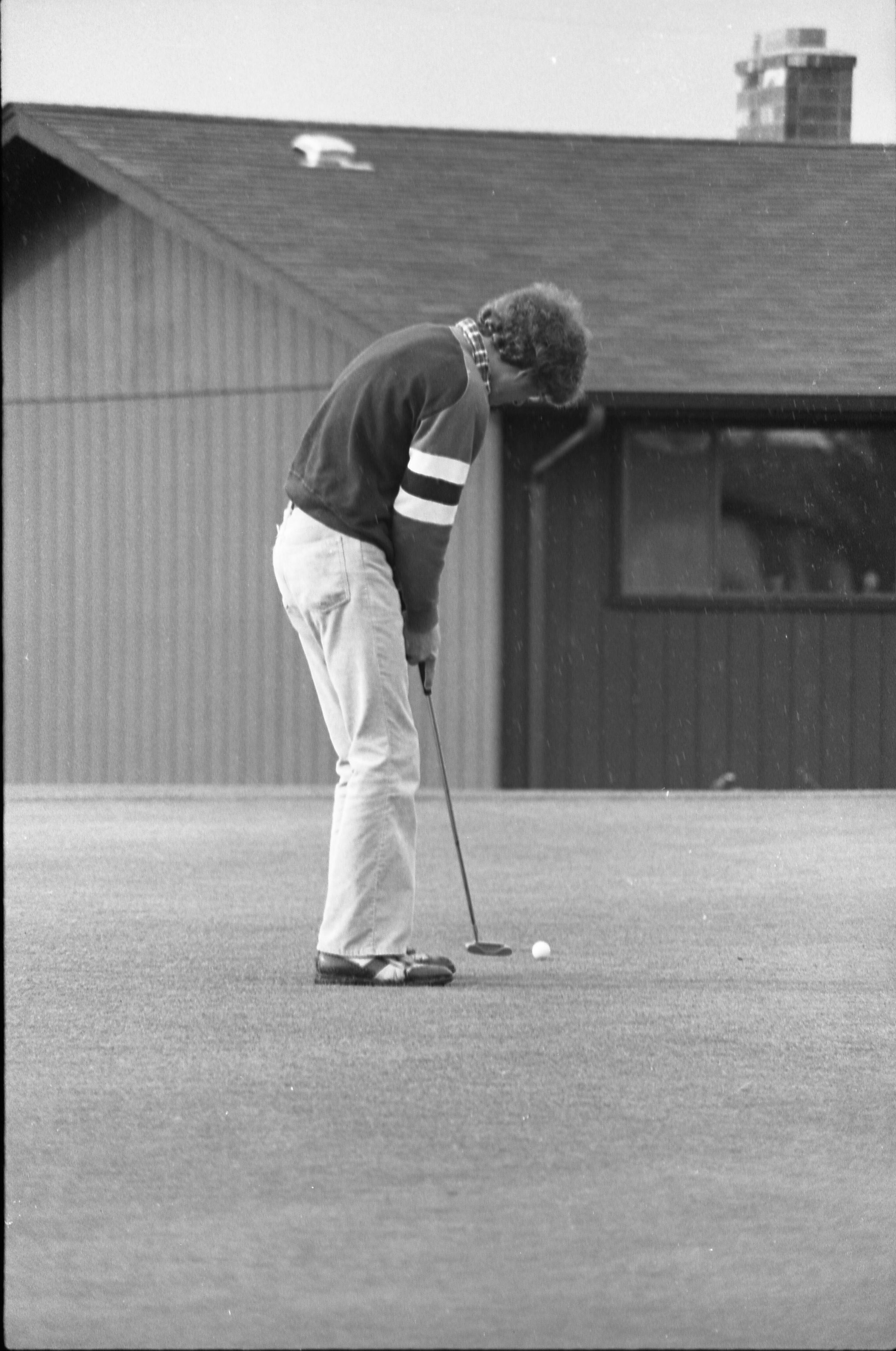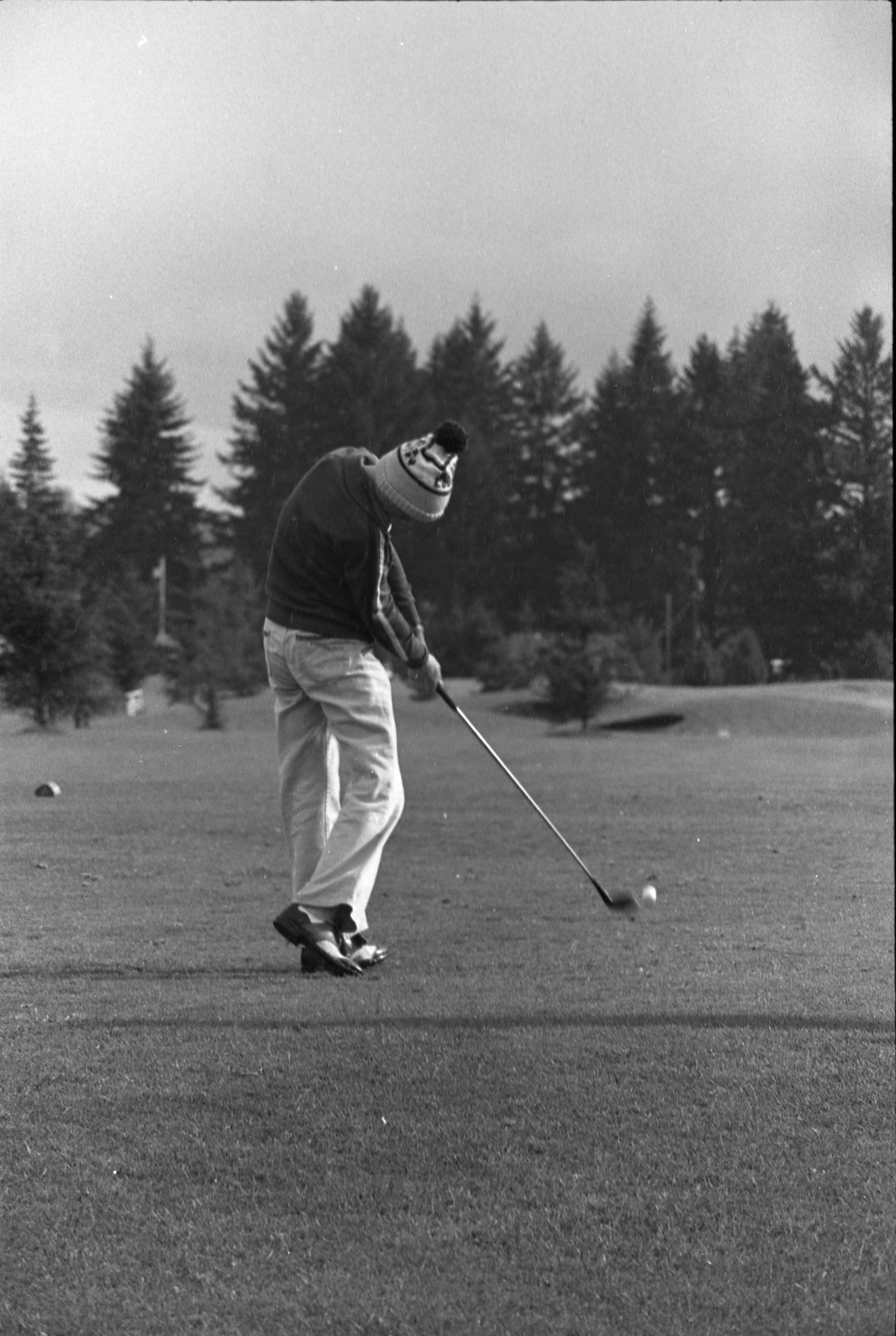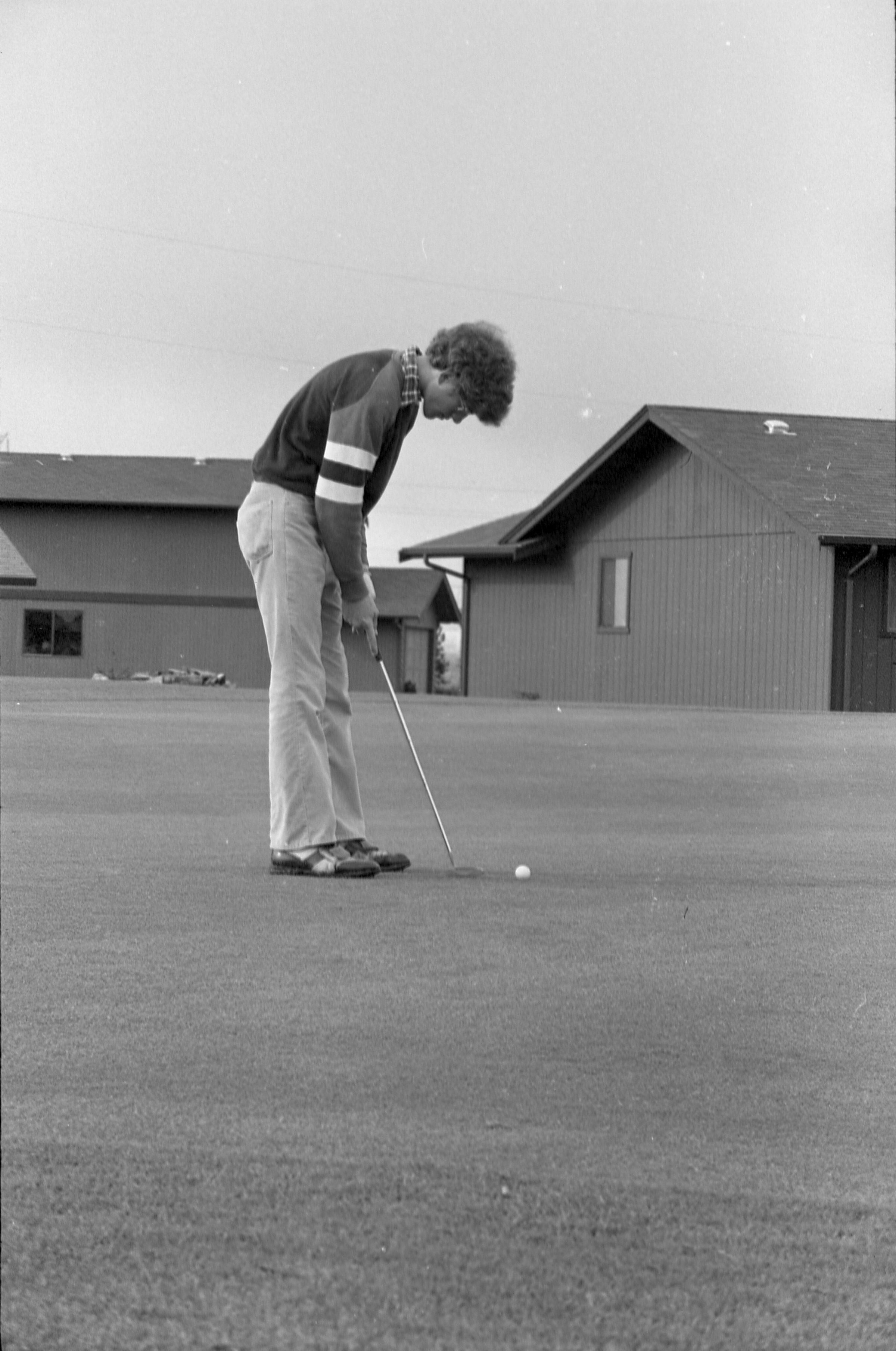 Golf, 1978. These five black and white film negative strips were created for the Lacey Leader newspaper. These images show people playing golf, and also a passing train.Made/Created
