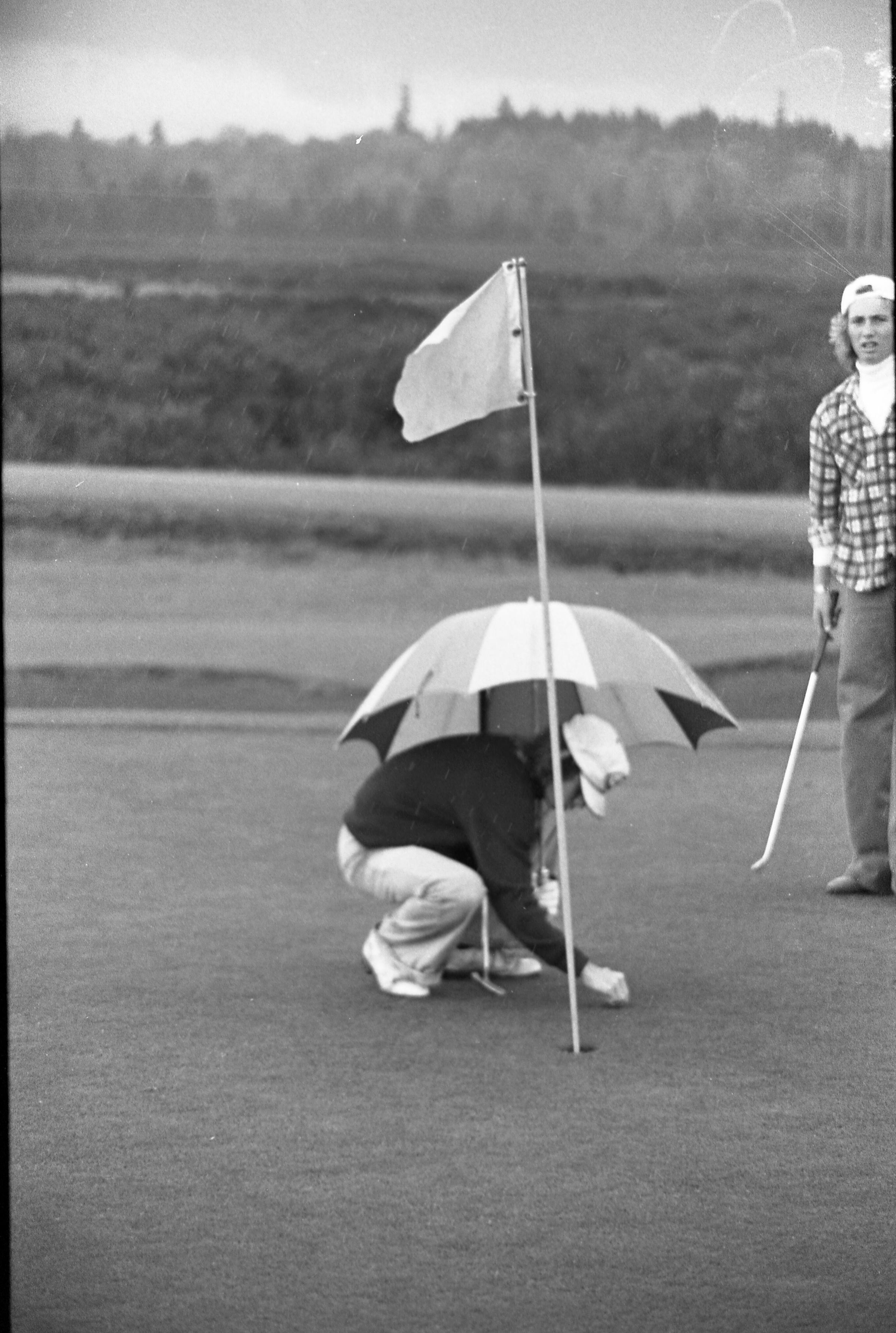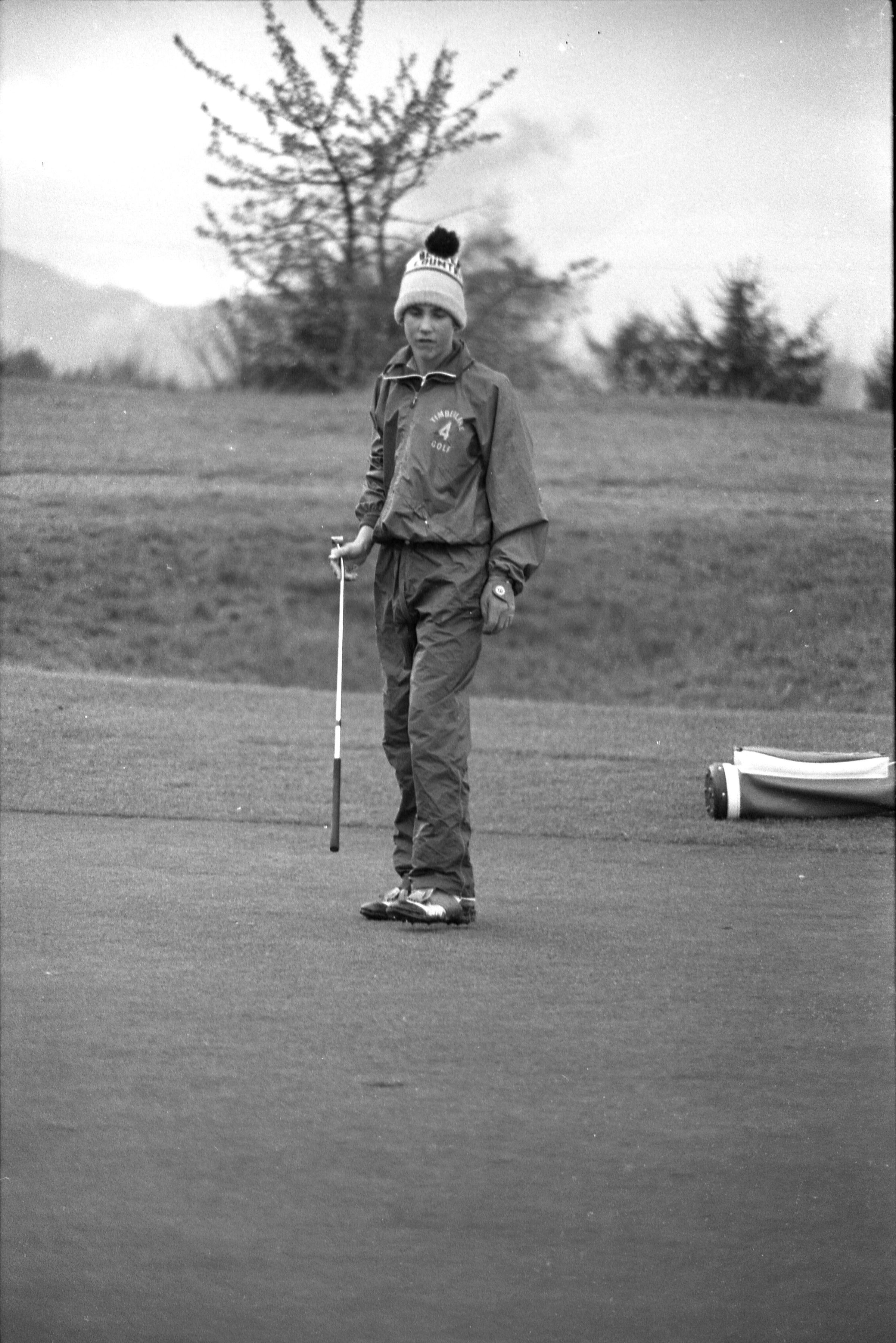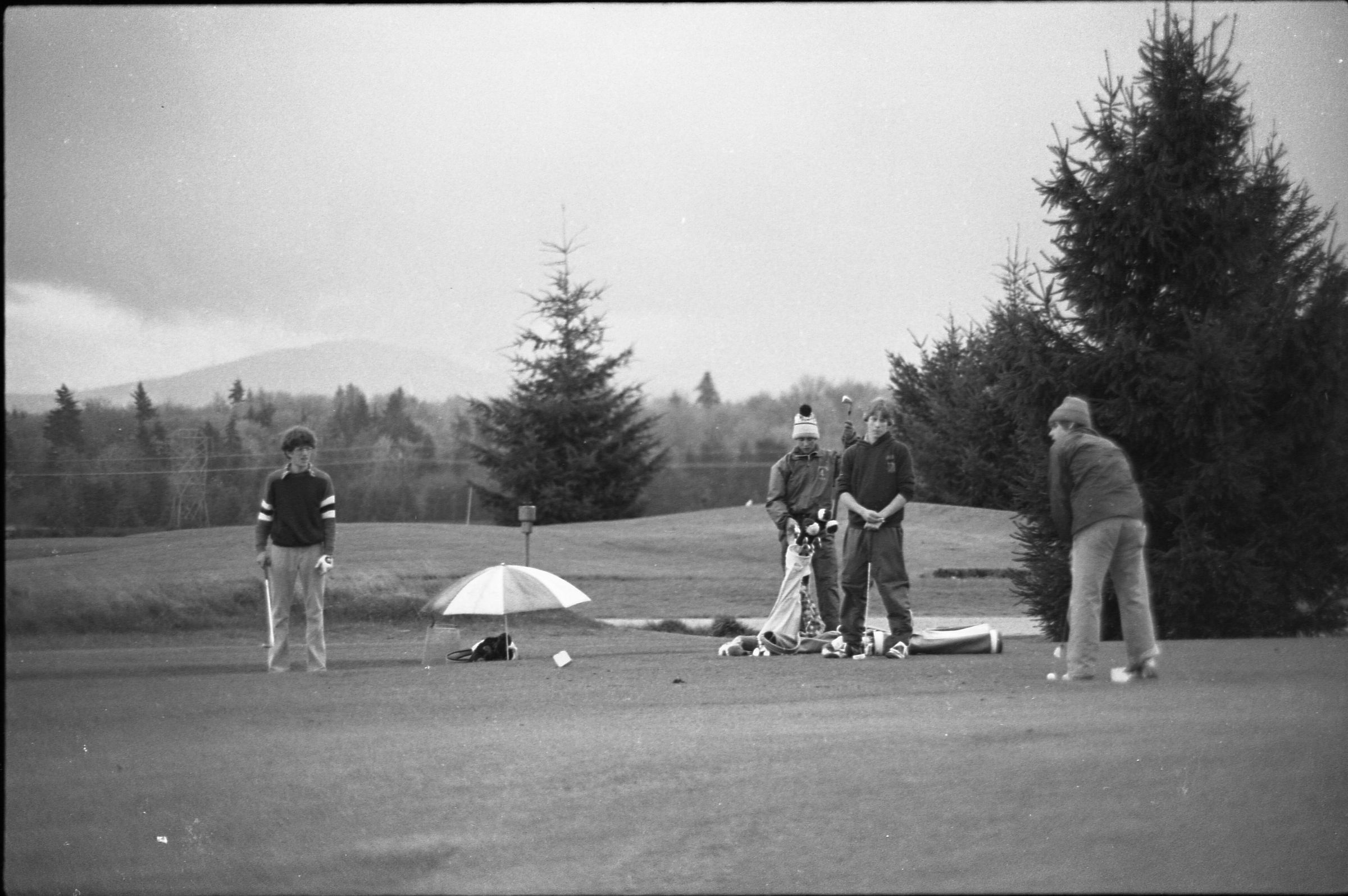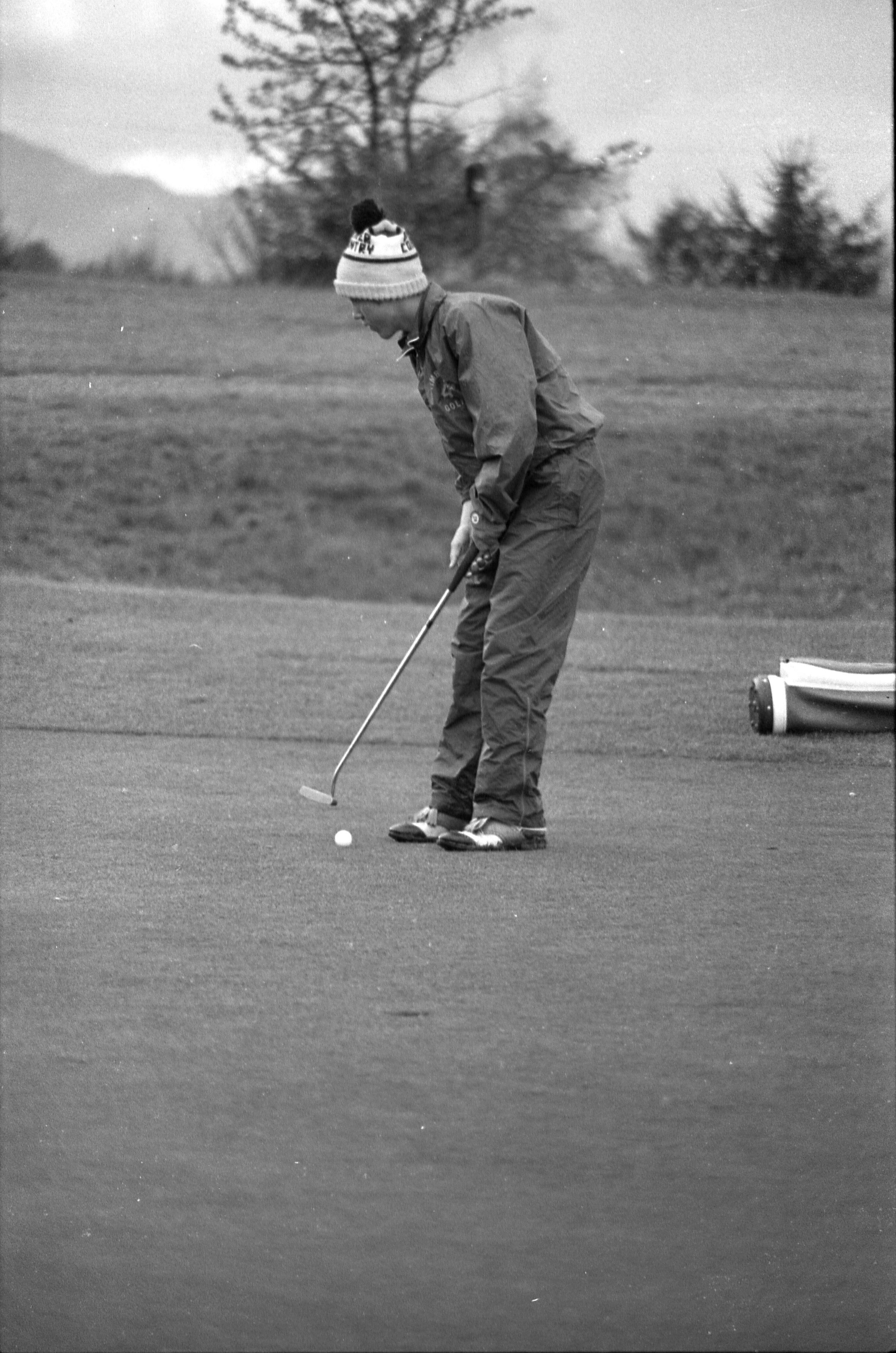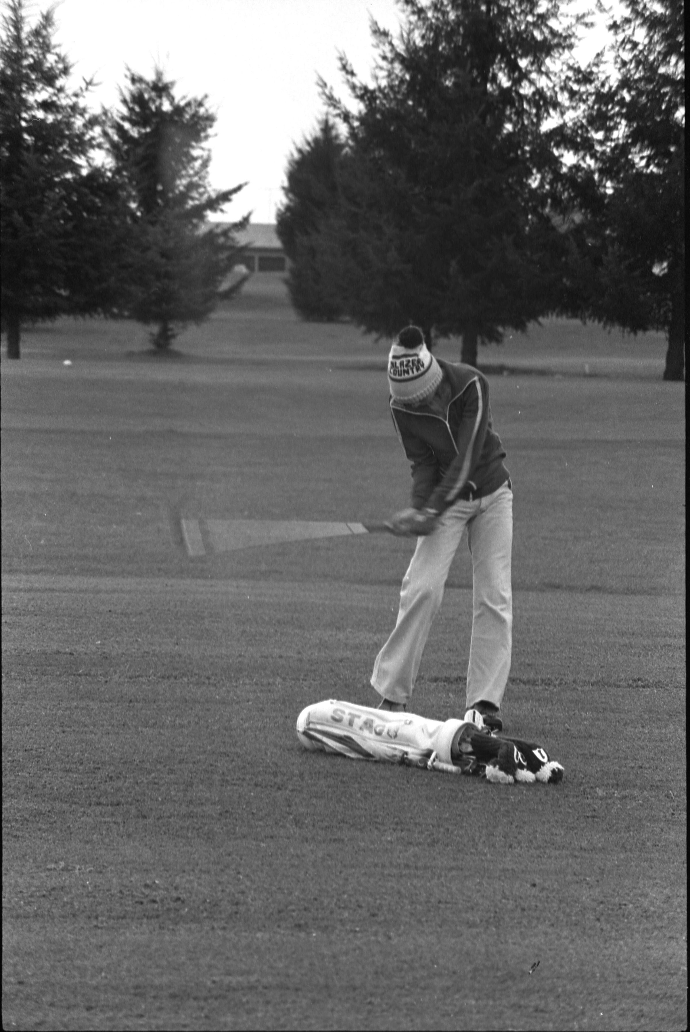 Golf, 1978. These five black and white film negative strips were created for the Lacey Leader newspaper. These images show people playing golf, and also a passing train.Made/Created