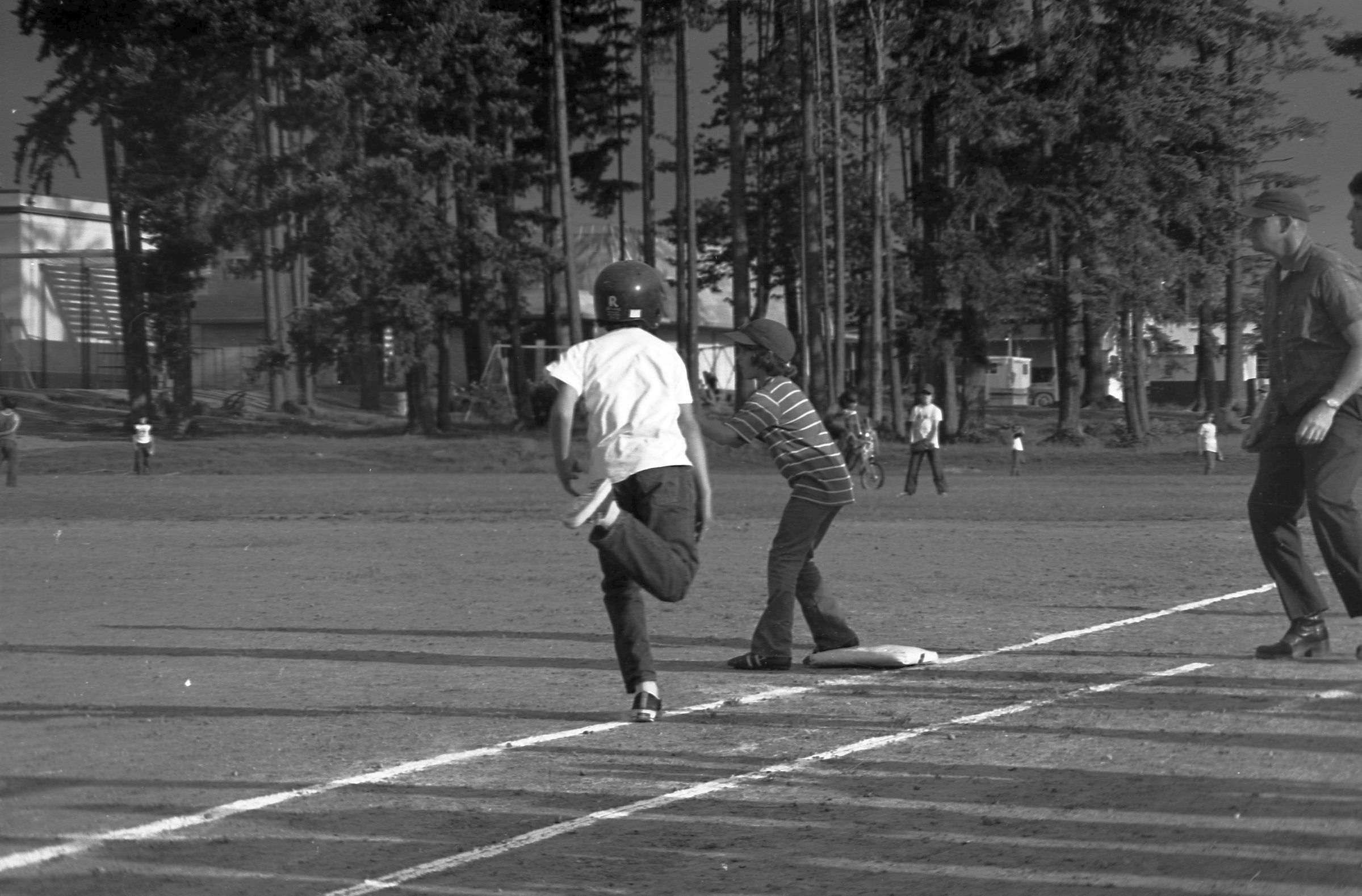 The images in group "f" show a baseball game between the teams from Nisqually and Jefferson middle schools. This game was played in May of 1973.Made/Created