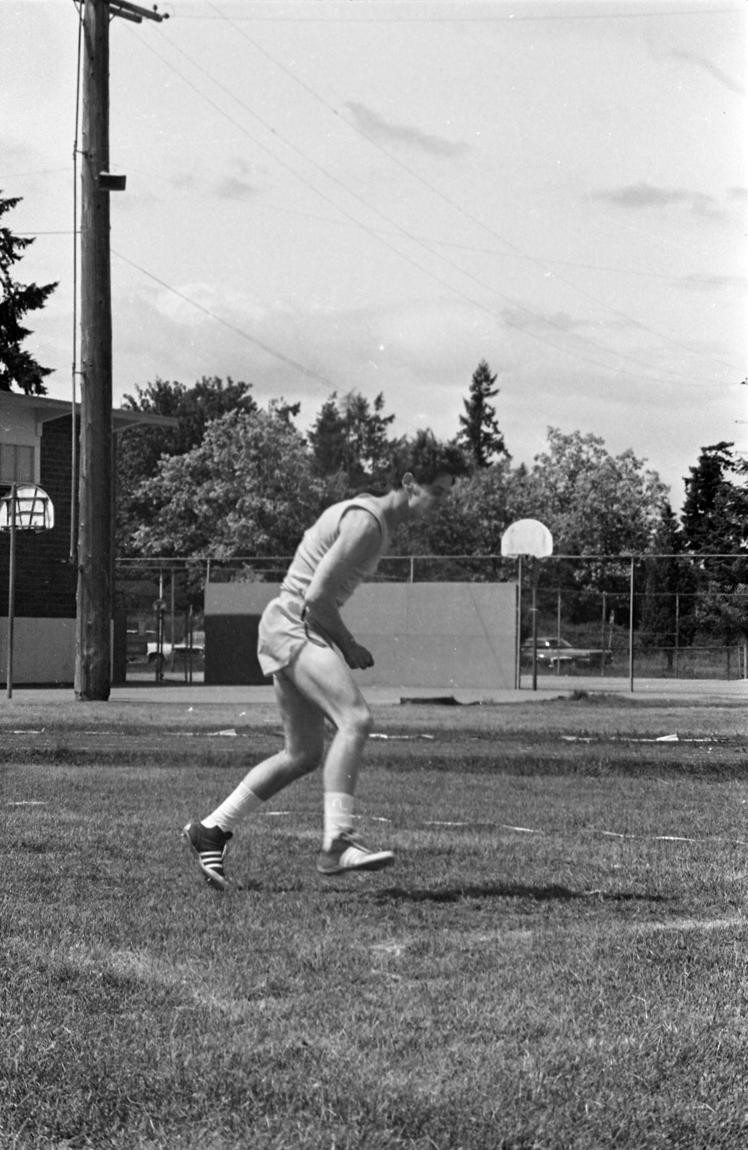 First Annual North Thurston Decathlon-Pentathlon, 1973. These seven black and white film negative strips were created for the Lacey Leader newspaper. These images were created using two separate film rolls, so some of the physical numbers on the strips are repeated. For the purposes of this description, these strips will be grouped according to the film roll from which they originally came. Each group will be assigned a lower-case letter to go along with the physical numbers on the strips (ex: 1a, 2a, 3a, 1b, 2b, 3b, etc.) to help differentiate between images.