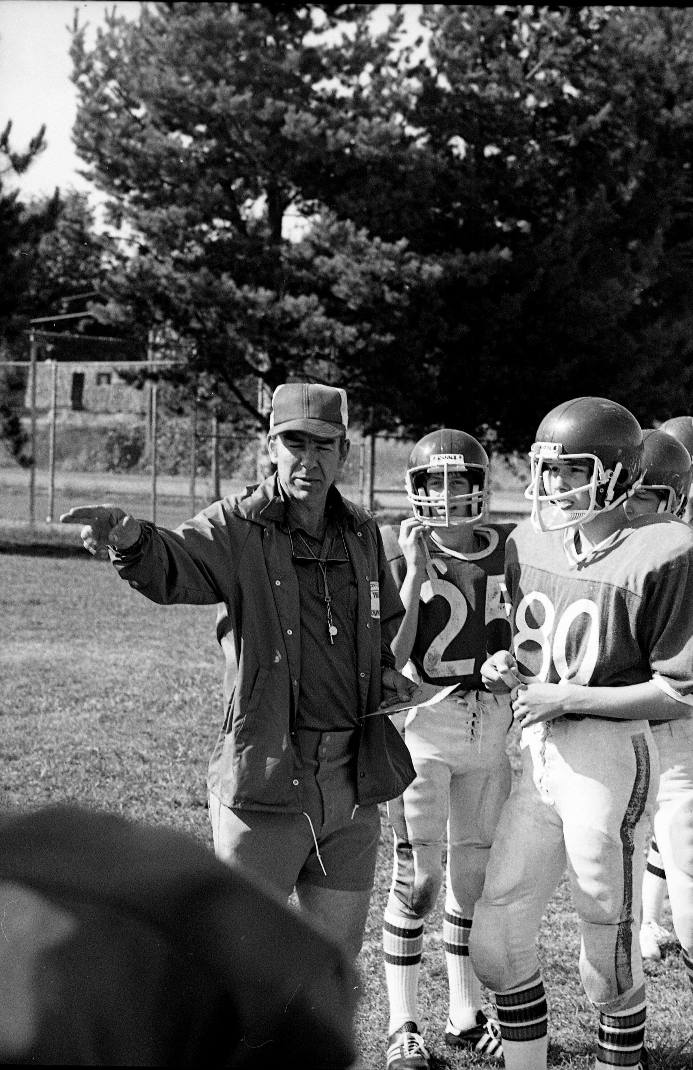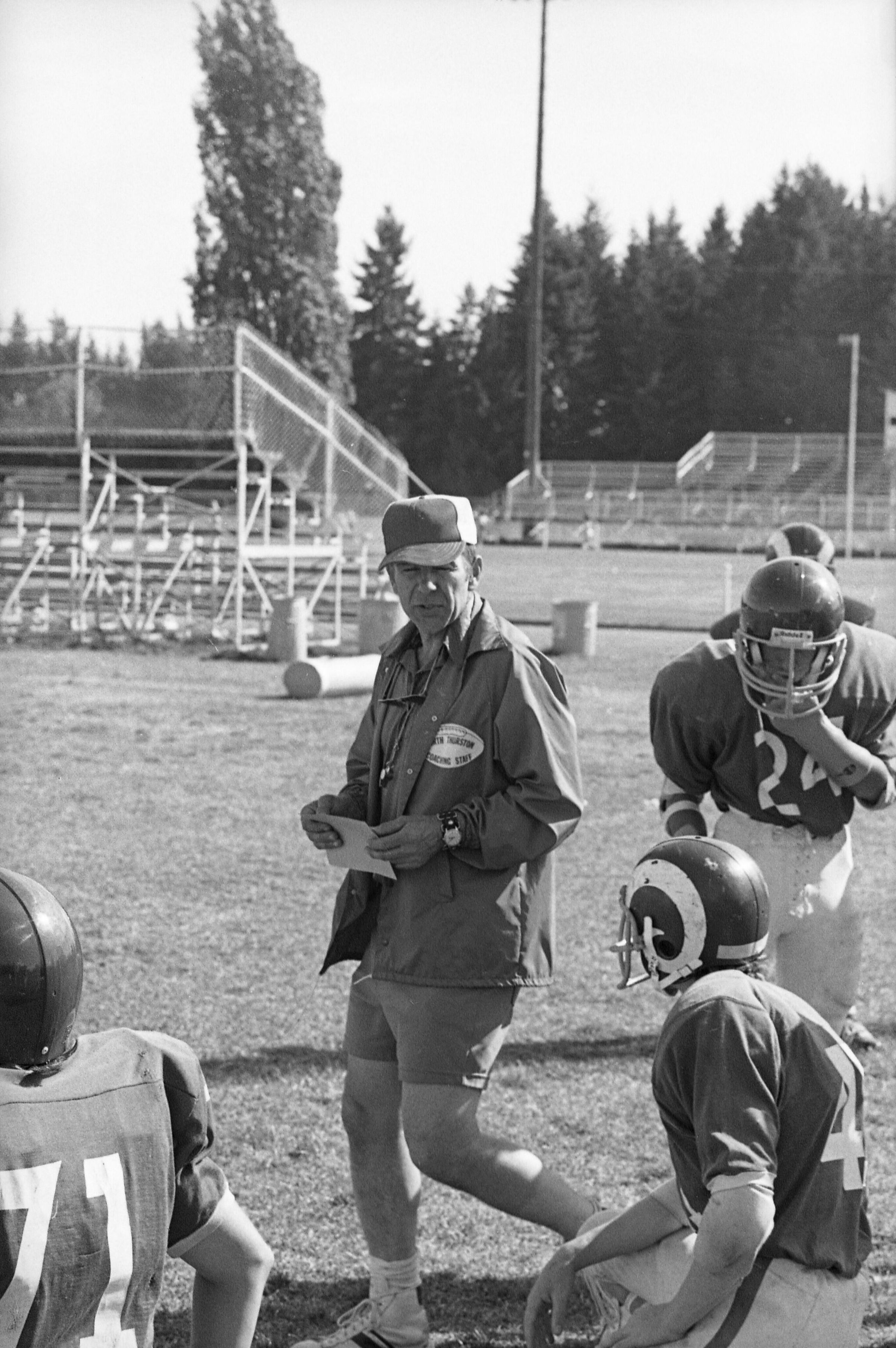Frank "Sandy" Sinclair, Unknown Date. These three black and white film negative strips were created for the Lacey Leader newspaper. These images show North Thurston High School assistant football coach Frank "Sandy" Sinclair at a football practice.