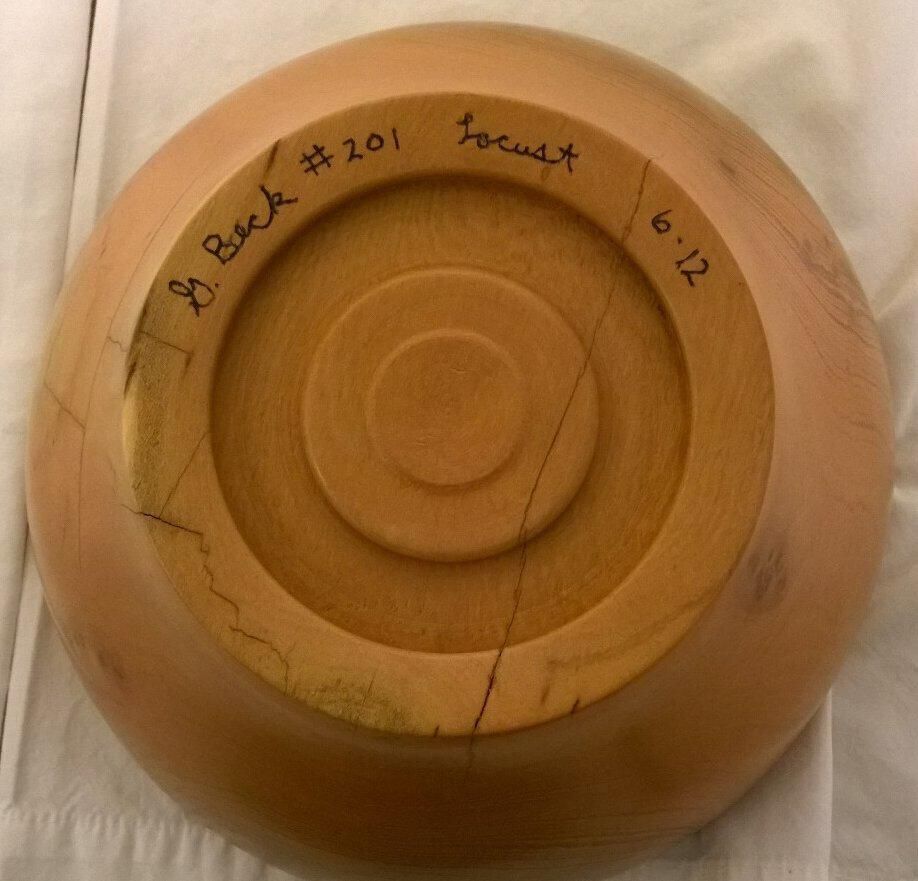 Bowl carved by Greg Beck from Black Locust. Simple, smooth carved circle, showing the rings and knots of the tree. Just over 8 1/2" in diameter and 1/4" thick, bowl tapers at the bottom to a 4 1/2" diameter base. The base as viewed from the underside is comprised of four concentric circles. It is signed in black pen by the artist: "G. Beck #201 Locust 6-12".