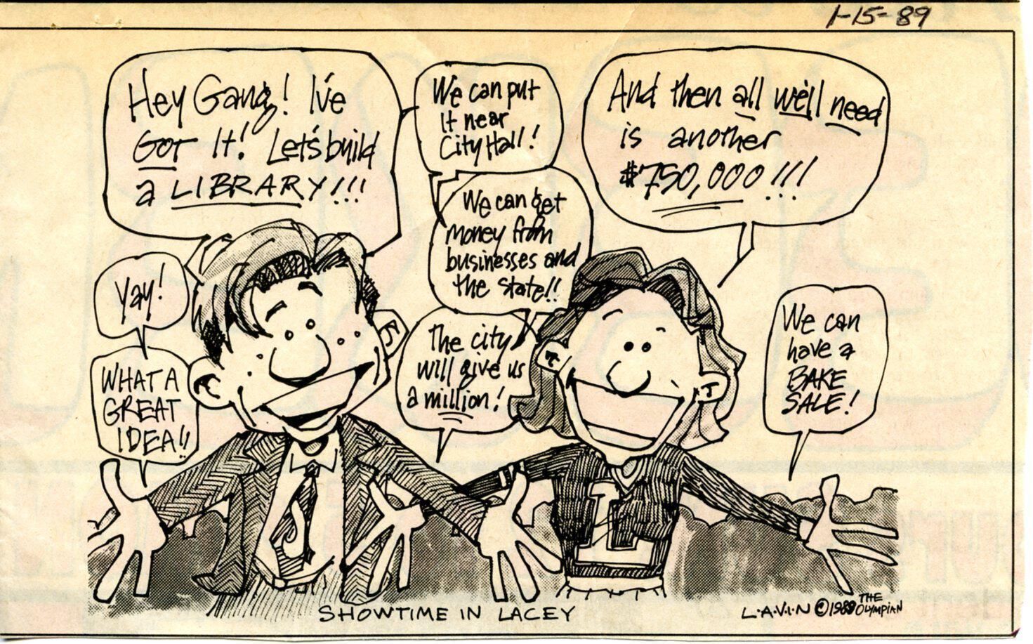 Newspaper clipping of a political cartoon titled "Showtime in Lacey" published in The Olympian newspaper on January 15, 1989. The pen sketch features a very excited and happy man and woman. The man, left, is weating a suit and tie; the woman, right, is wearing a letter "L" sweater, presumably for "Lacey." The many talking bubbles around them say: "What a great idea!!" "Yay!" "Hey Gang! I've Got It! Let's build a Library!" "We can put it near City Hall!" "We can get money from businesses and the state!!" "The city will give us a million!" "And then all we'll need is another $750,000!!!" "We can have a bake sale!" This editorial cartoon is signed in the lower right "L.A.V.I.N (C) 1989 The Olympian." The satirical message of this cartoon is that the library is asking for a lot of money and raising it through small donations as through a bake sale.Made/Created