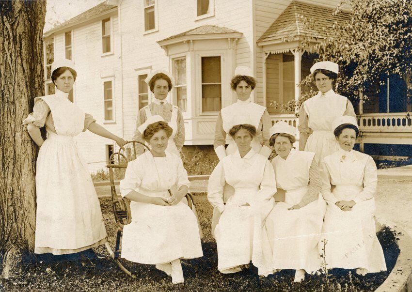 Unidentified nurses, probably a class at St. Peter's School of Nursing, c. 1920s. 5.5" x 8" black and white silver gelatin warm-toned print features eight women. All are wearing white nursing uniforms consisting of ankle-length skirts, long sleeved shirts (some are pinstriped), aprons and white nurse's caps. In the front row from left to right is a woman in a rocking chair, and three women seated on what is probably a bench. In the second row, the woman at the far left is leaning against a tree and has her hand on the back of a rocking chair. Three women stand behind and a large wood-framed building is behind them. Embossed into the lower right corner is "Pautzke, Ellensburg, Wash."