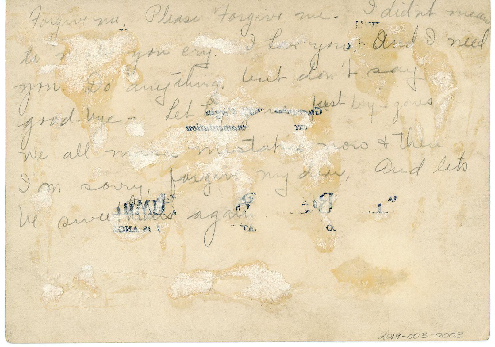 The back of the photo has a handwritten inscription in pencil: "Forgive me. Please Forgive me. I didn't mean to make you cry. I Love you And I need you. Do anything, but don't say good-bye - Let by-gones just [be] by-gones. We all make mistakes now & then. I'm sorry, forgive [me] my dearl And lets be sweehearts again. There is also adhesive residue and the remnants of paper with text which is unreadable.