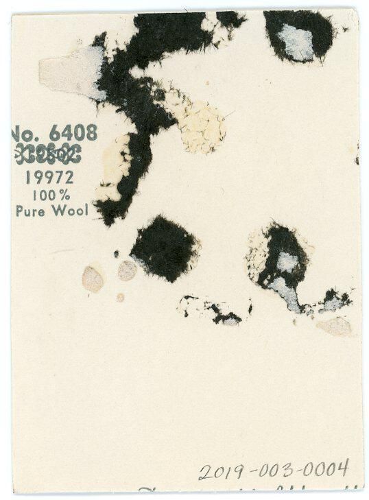 On the back is printed "No. 6408 19972 100% Pure Wool." There is adhesive residue and black paper remnants.