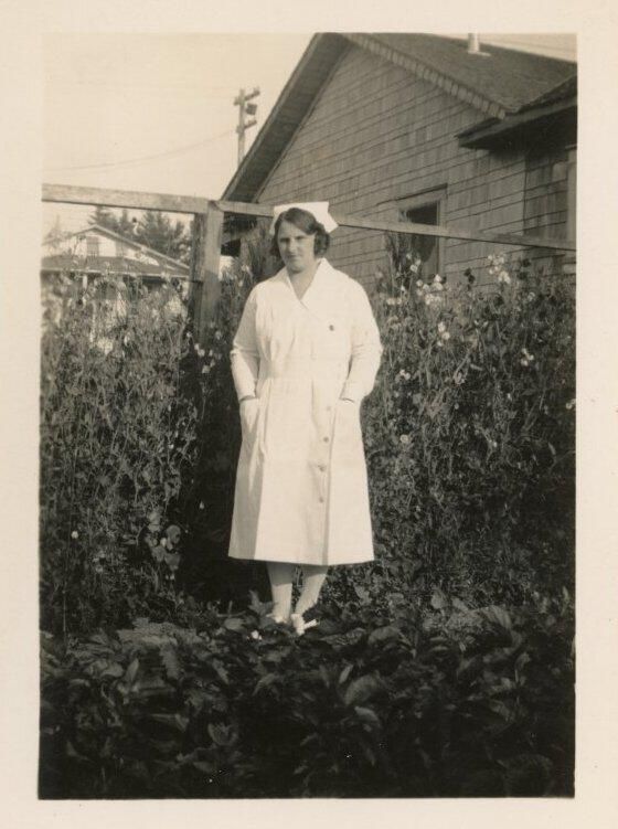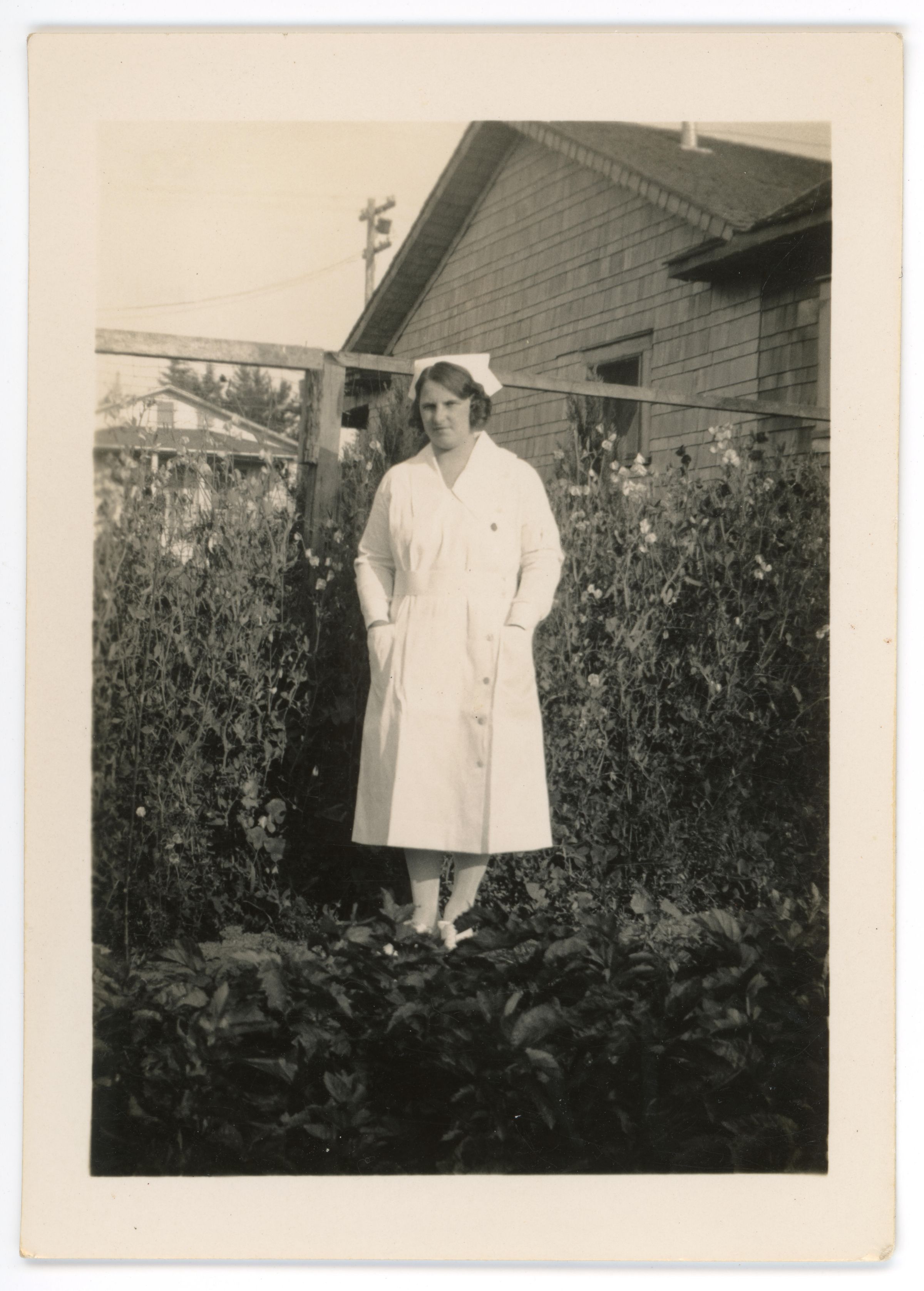 Nurse Marguerite Bittmann, c. 1940s. 2.5" x 4.5" black and white photographic print is of a middle-aged woman in a nurse's uniform standing outside of her home at 1224 Thomas Street in Olympia. She is wearing a long white dress with long sleeves, a white nurse's cap and white tights. Behind her is a garden and the house.