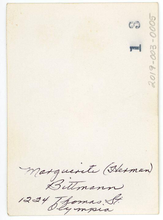 Marguerite Herman was born in Lacey and graduated from St. Peter School of Nursing in 1929. She was a surgical nurse at St. Peter Hospital. She married Clarence Bittmann in 1931. They were living at 1224 Thomas by 1940.Made/Created