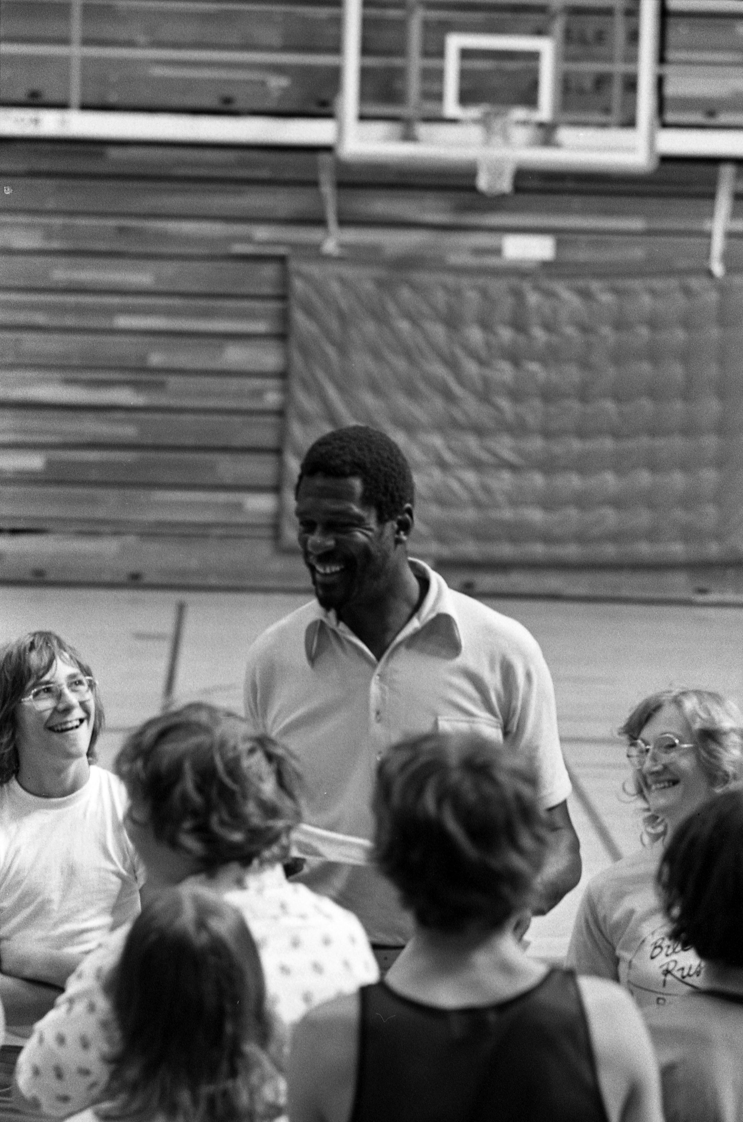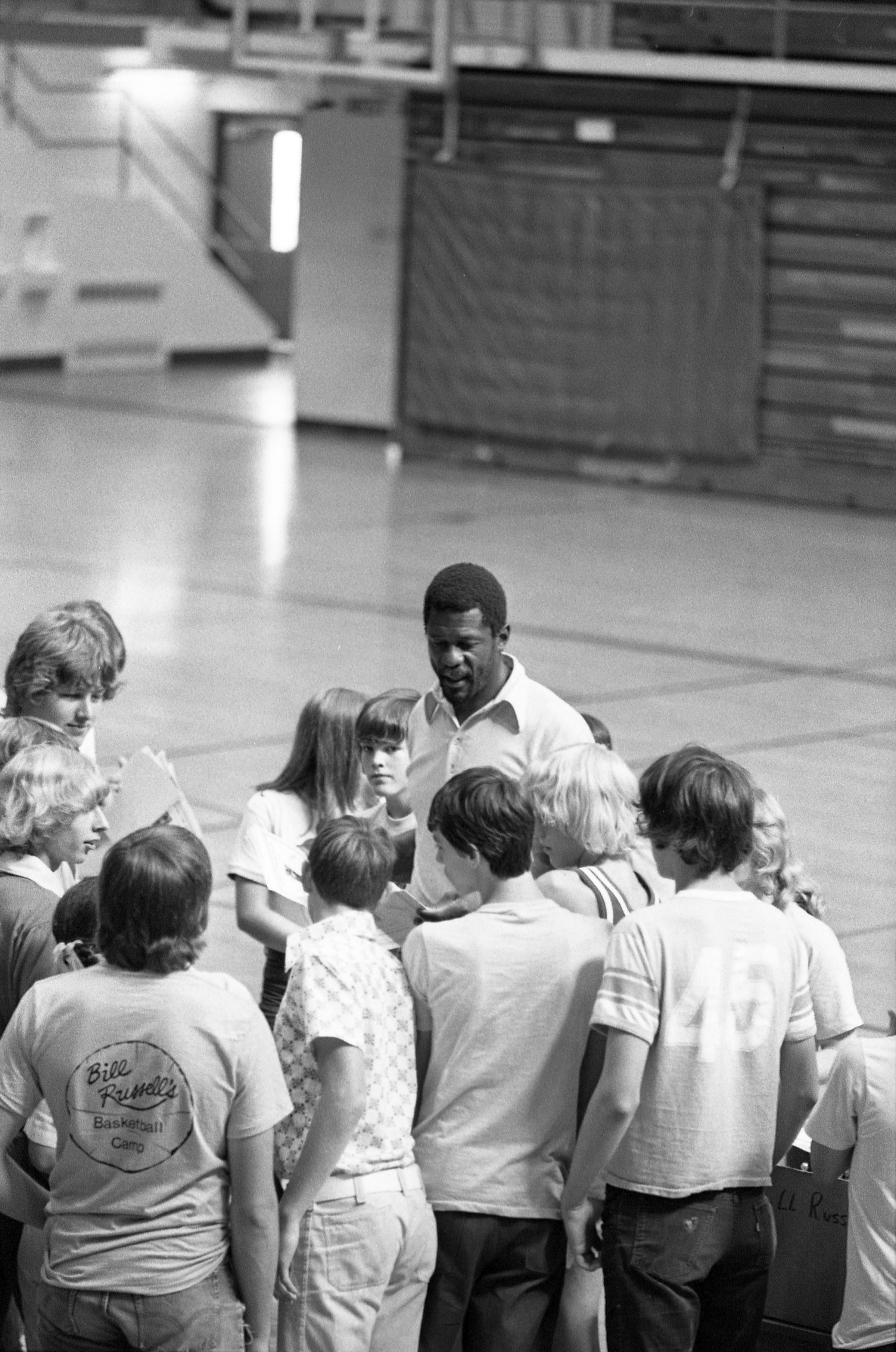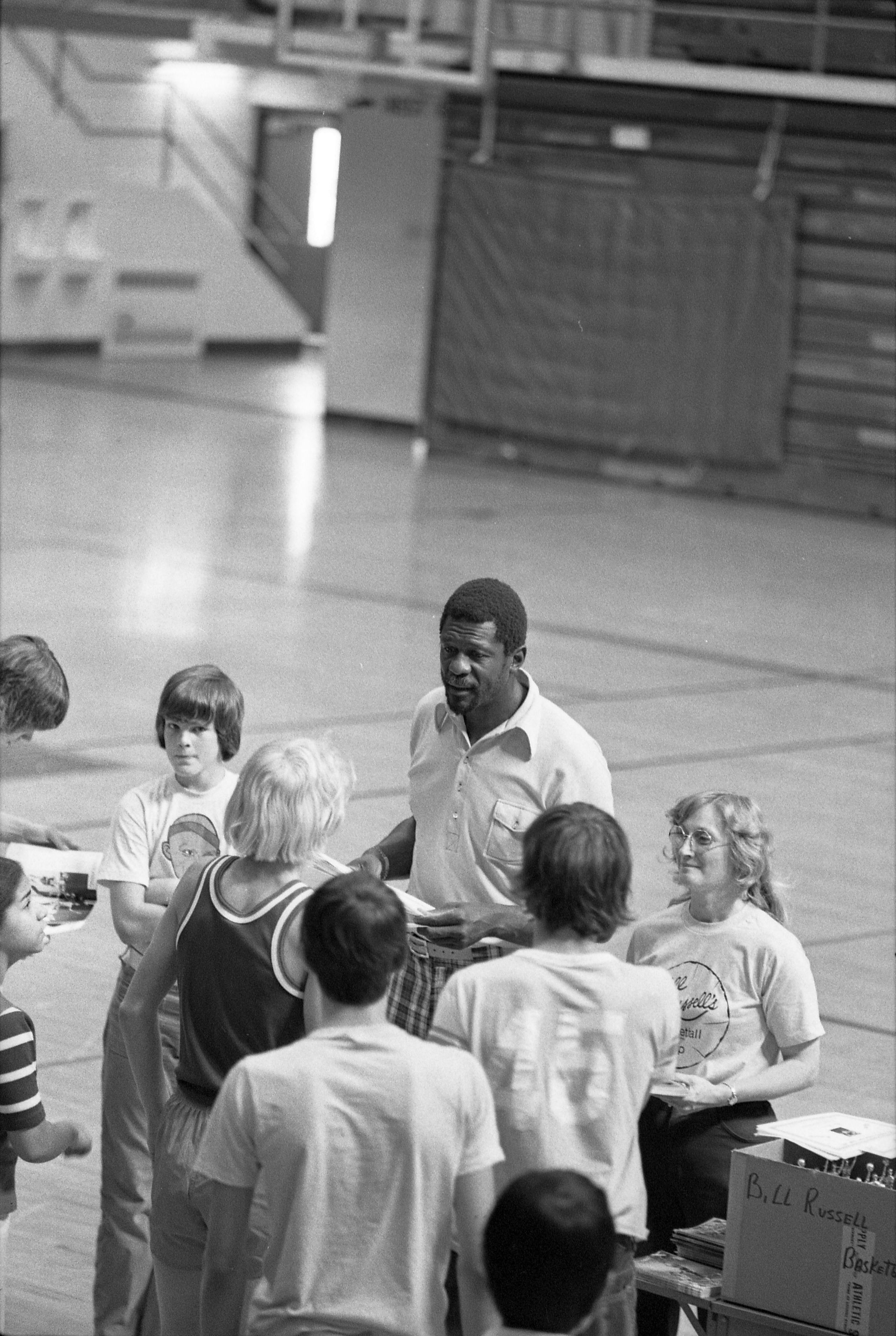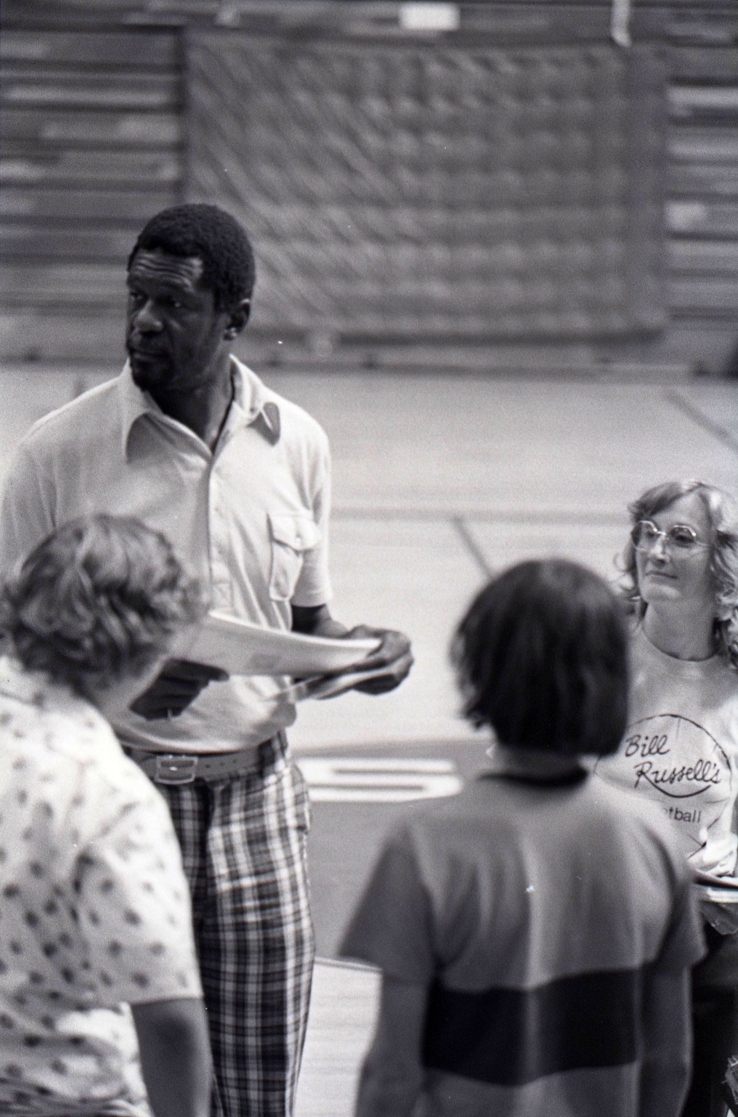 Bill Russel, 07-30-1975. These two black and white negative film strips were created for the Lacey Leader newspaper. They depict Bill Russel speaking to a group of children. He appears to be handing them something.Made/Created