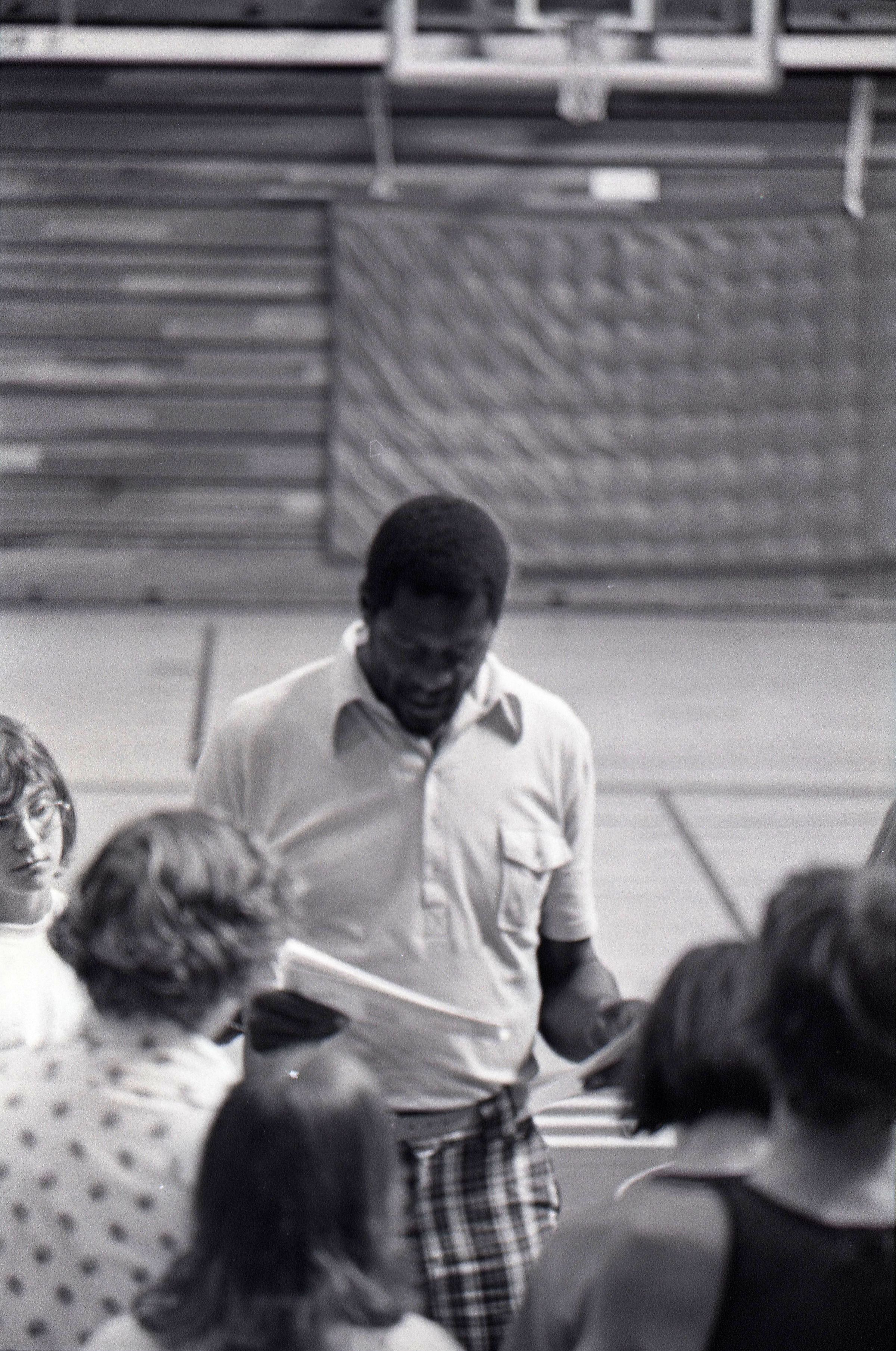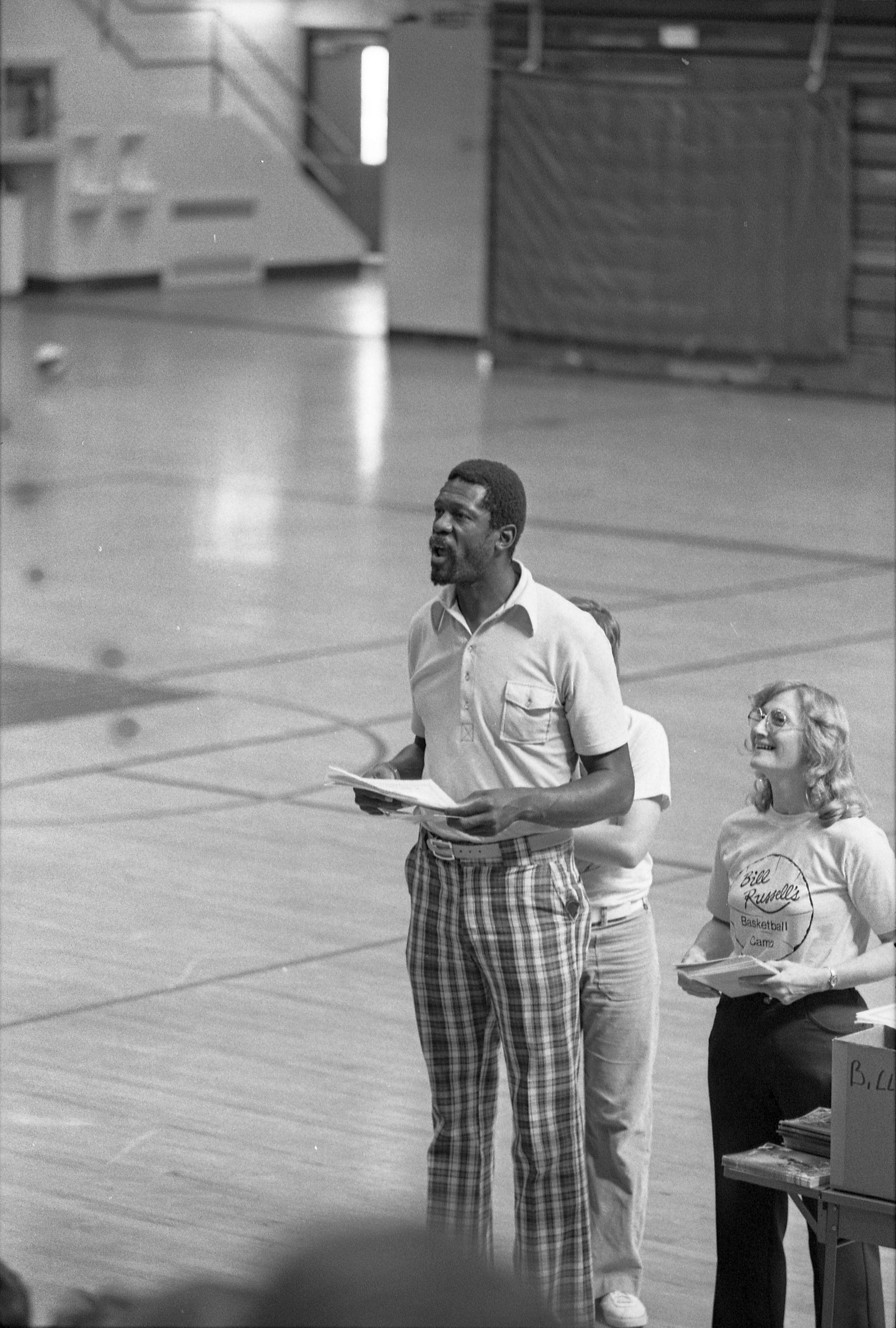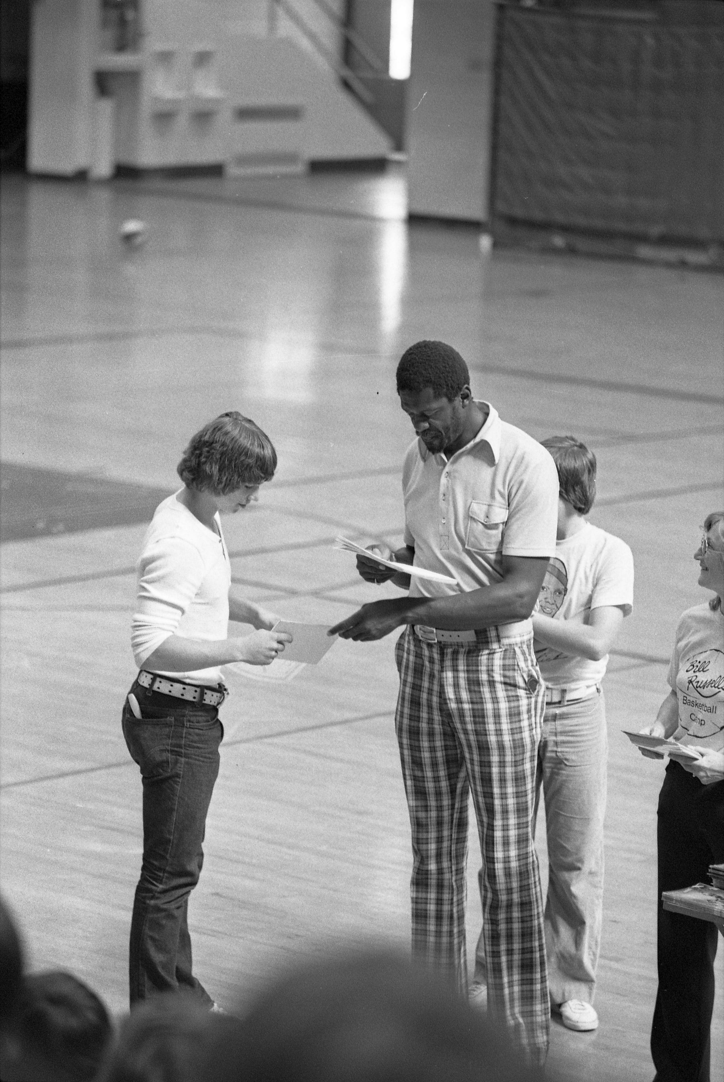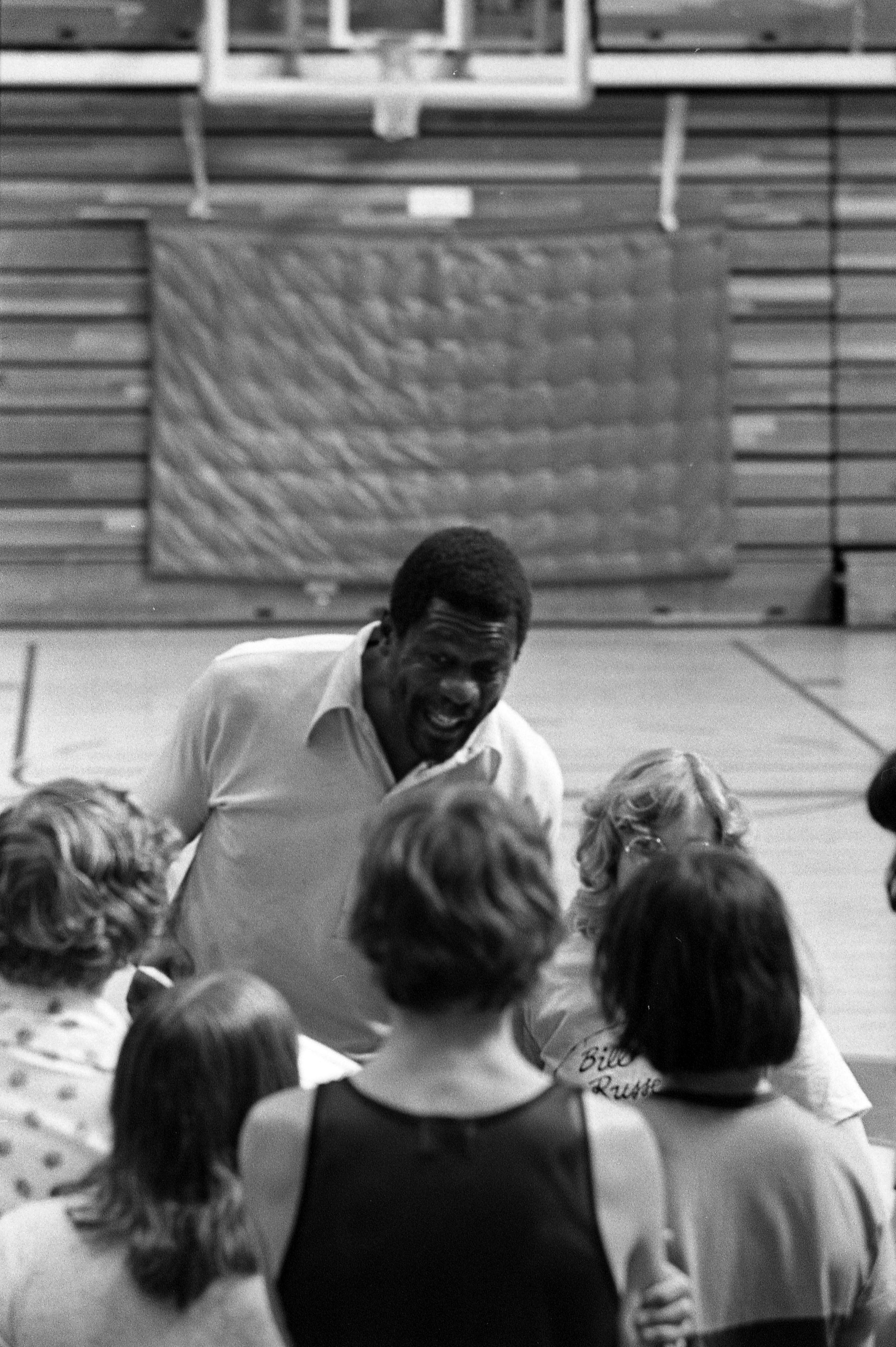 Bill Russel, 07-30-1975. These two black and white negative film strips were created for the Lacey Leader newspaper. They depict Bill Russel speaking to a group of children. He appears to be handing them something.Made/Created