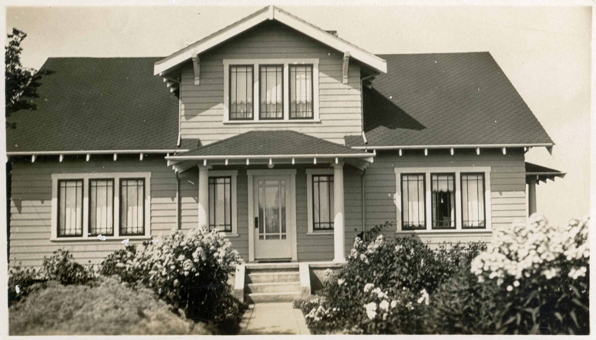 Ben and Diana Herman residence, c. 1930s. 2.75" x 4.25" black and white photograph of a home with a front gable over the shallow porch. Two columns support the porch roof and a staircase of four steps comes down to the walkway. The roof has a relatively steep pitch and the rafter tails are exposed.