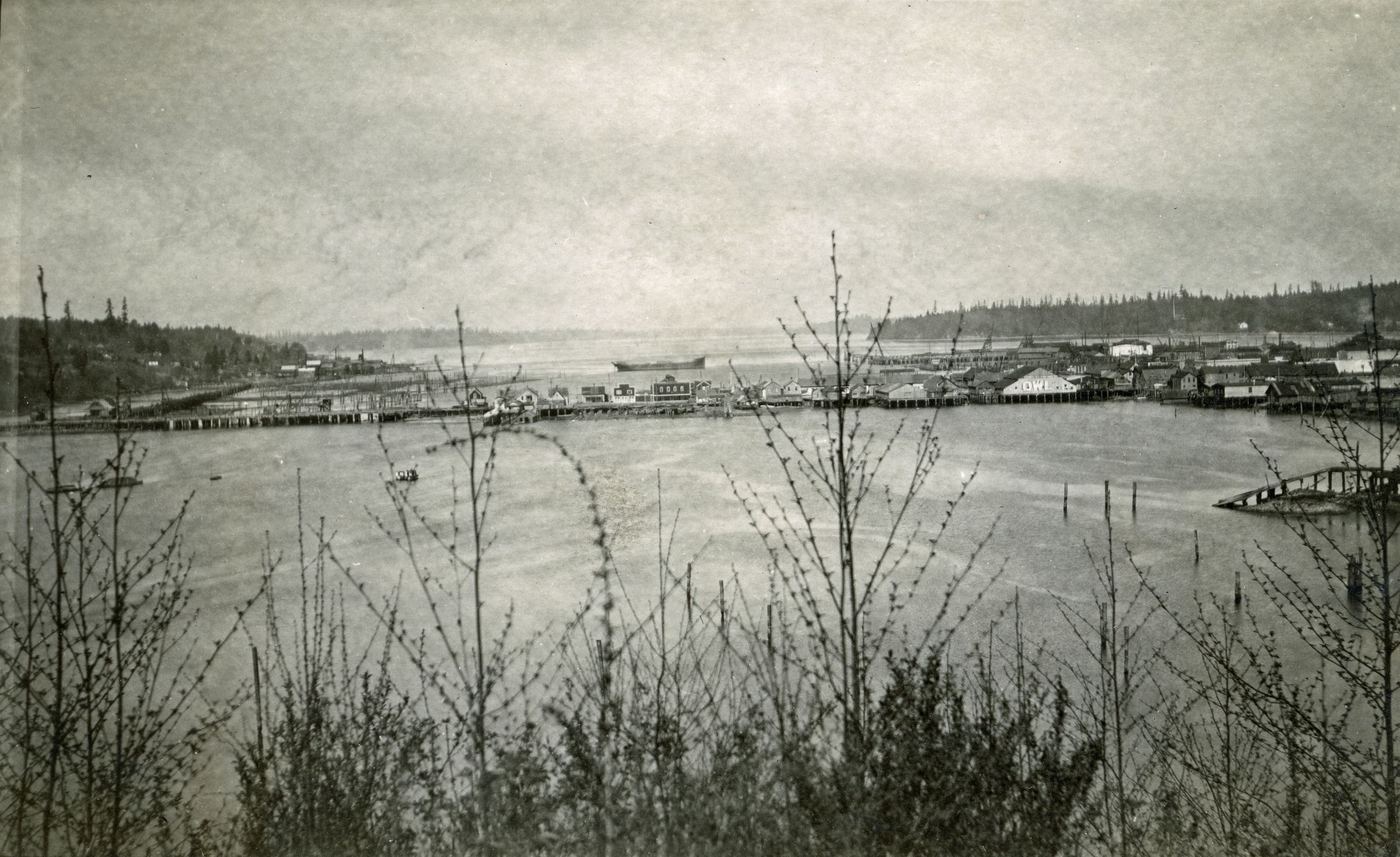 Early image of Olympia, before 1909. 3.25" x 5.25" black and white photographic print is a view of the Olympia waterfront, likely before the dredging project of 1909. Many buildings and businesses along the port can be seen through the denuded tree branches.