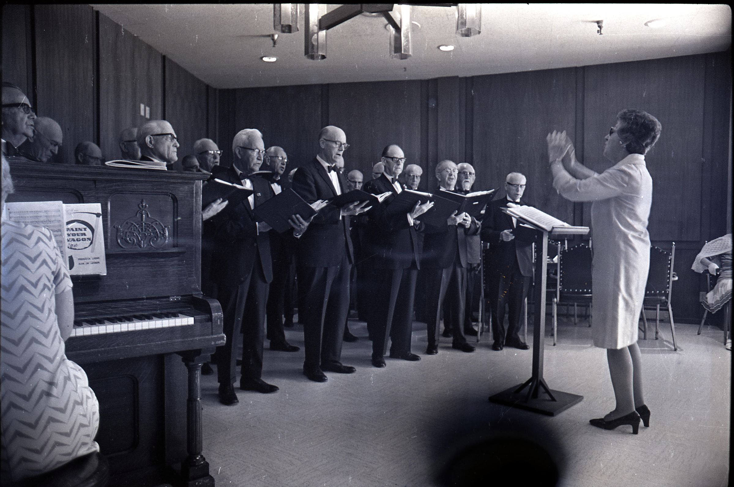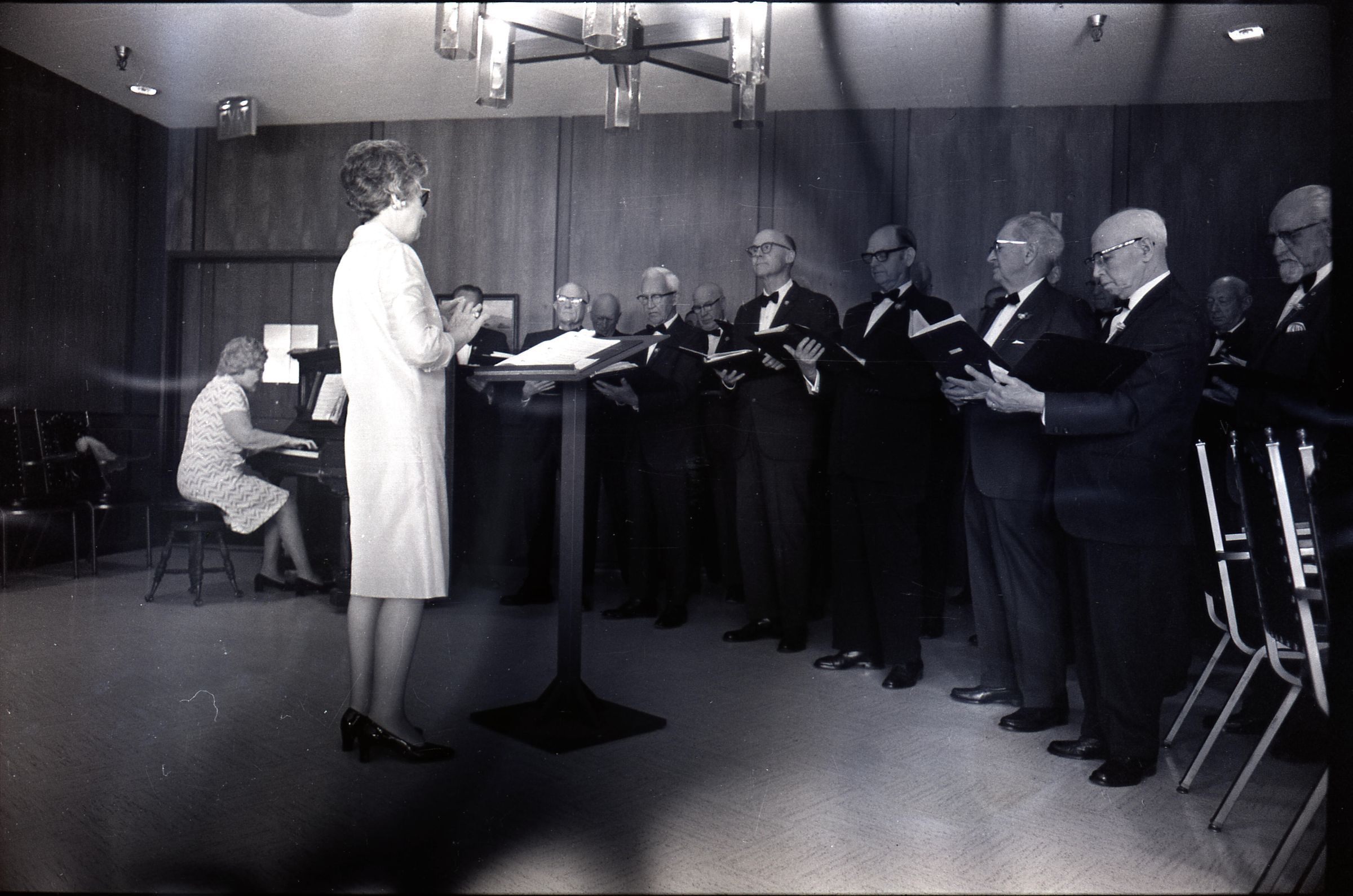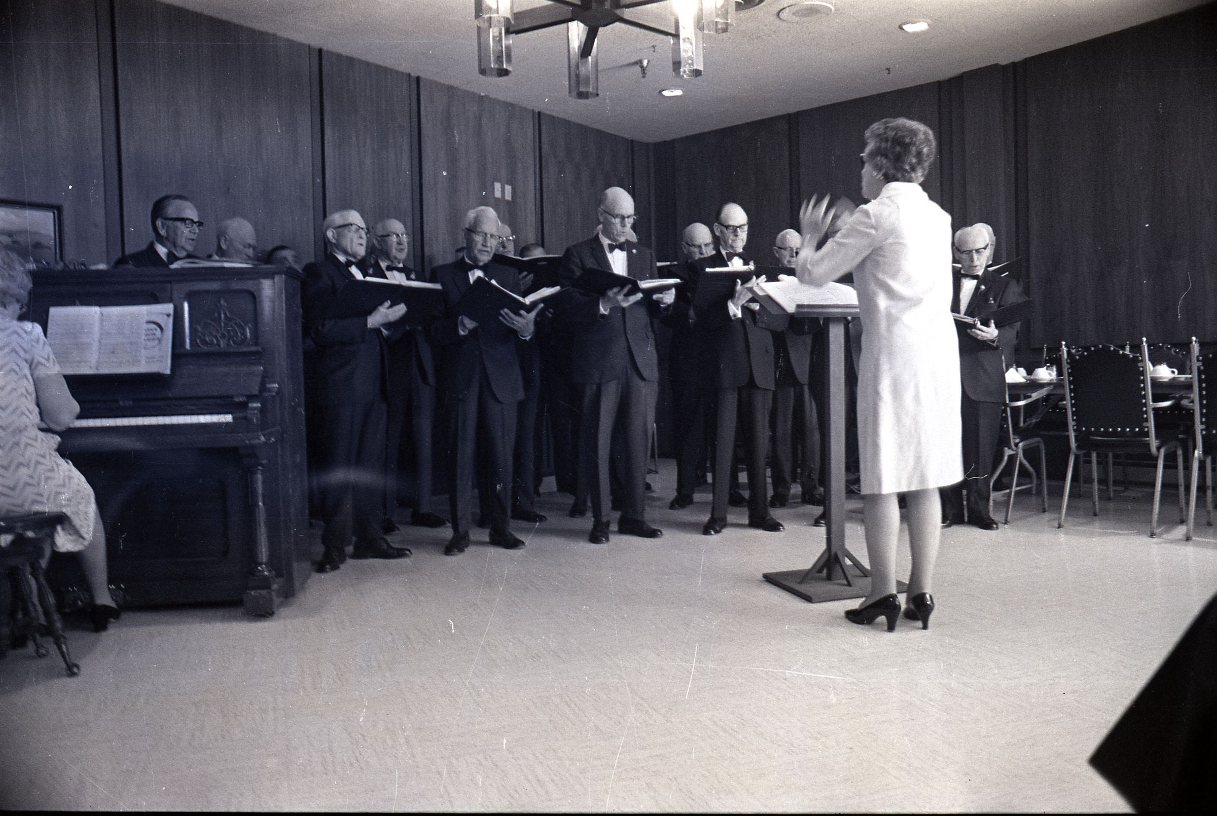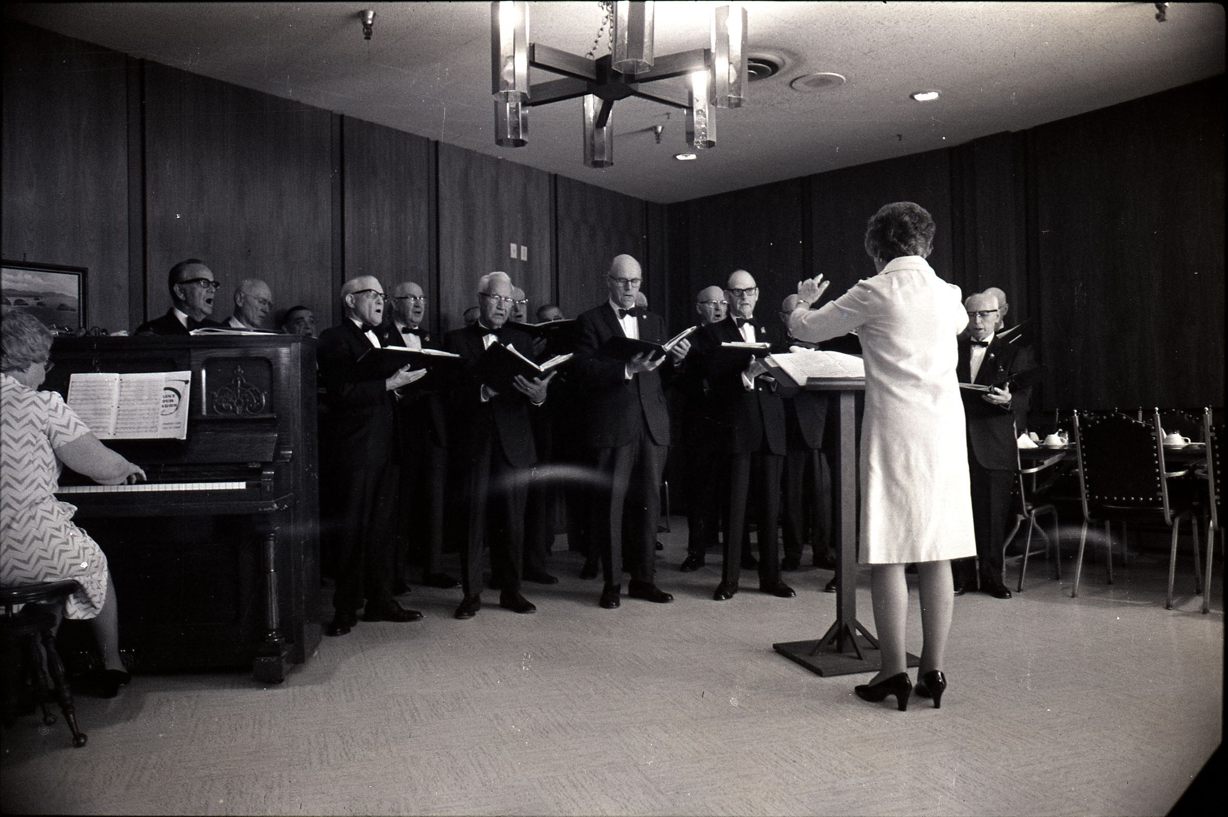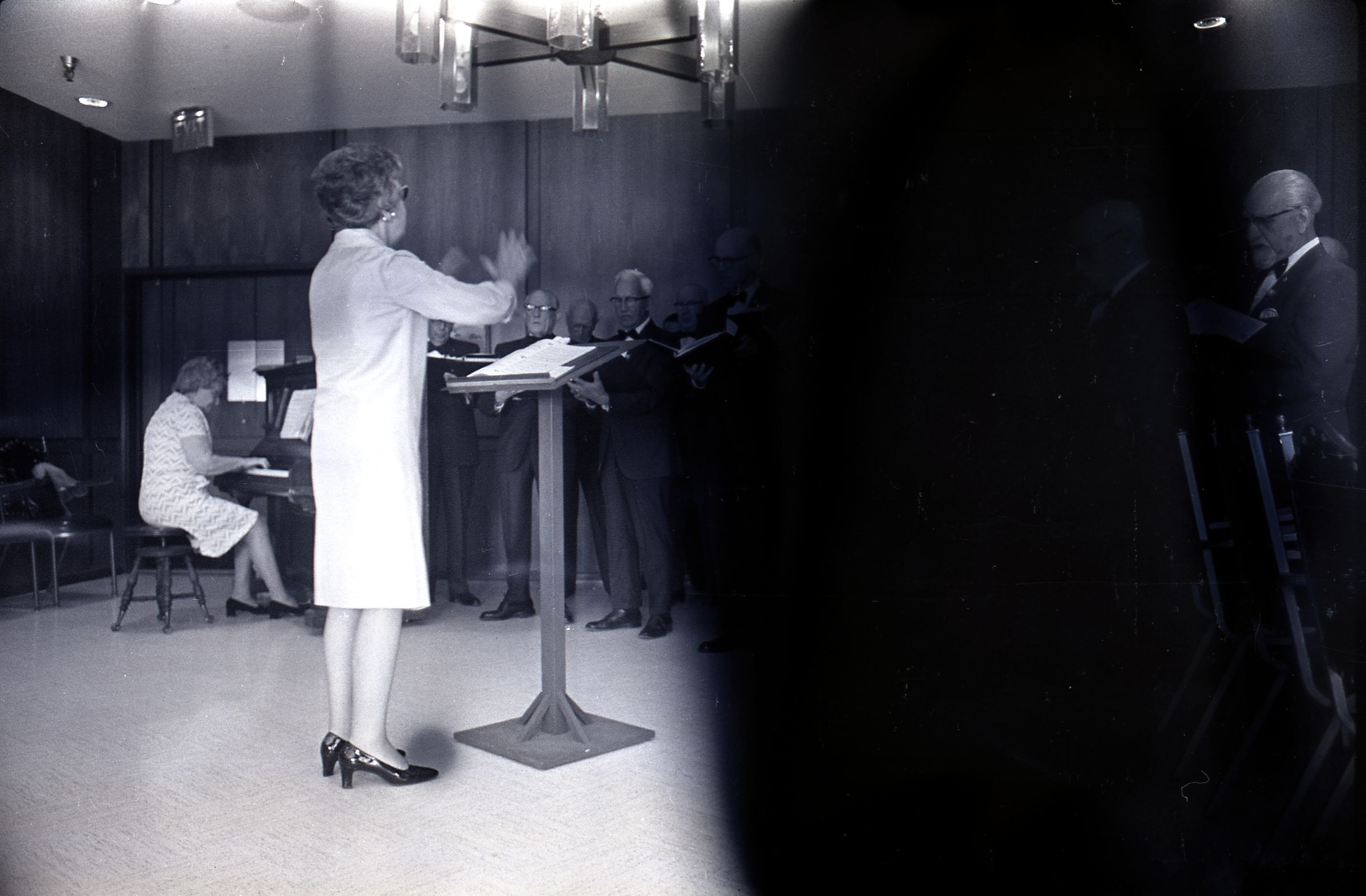 Choir, 06-1973. These three black and white negative film strips were created for the Lacey Leader newspaper. They depict a men's choir and their female conductor.