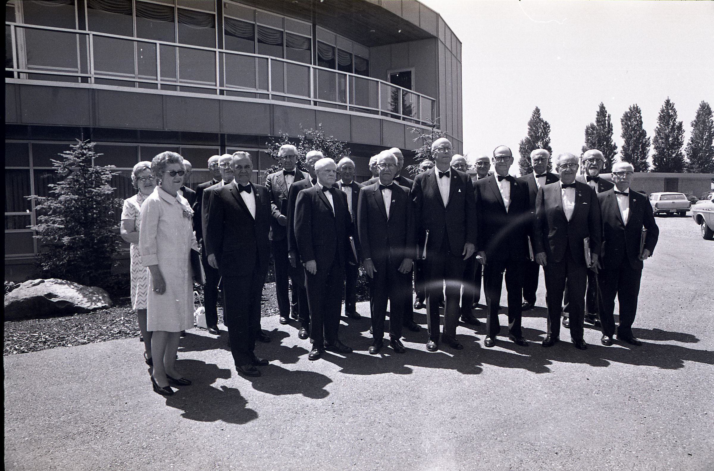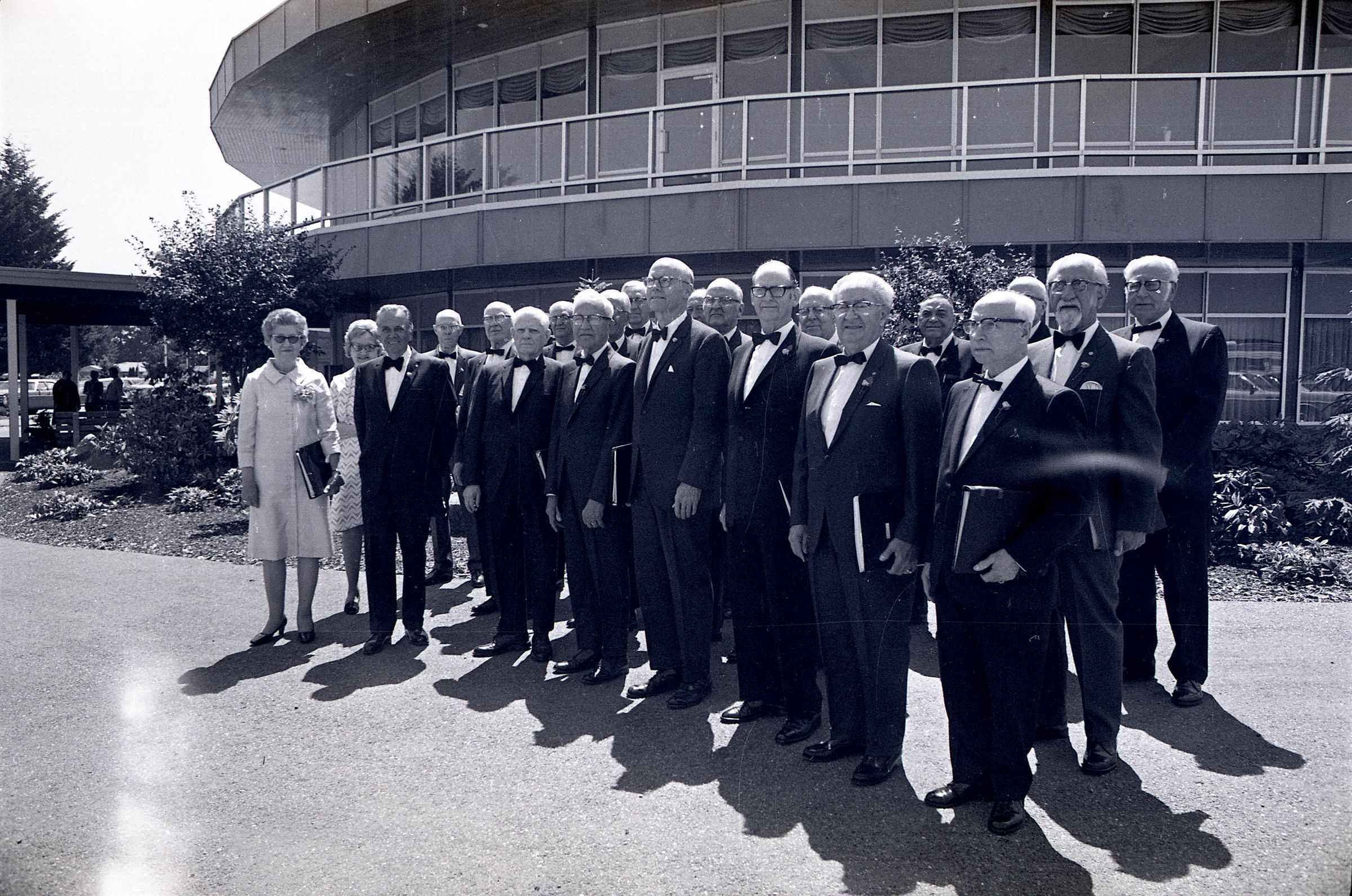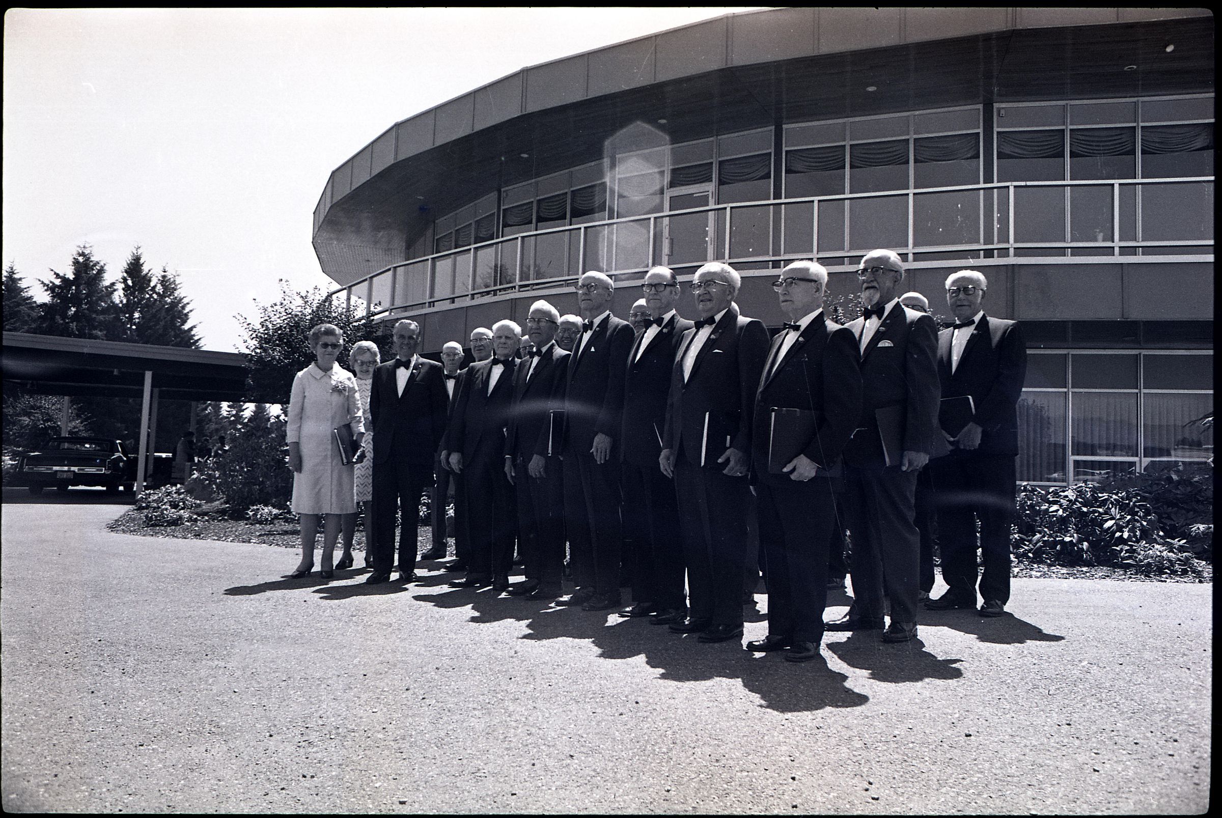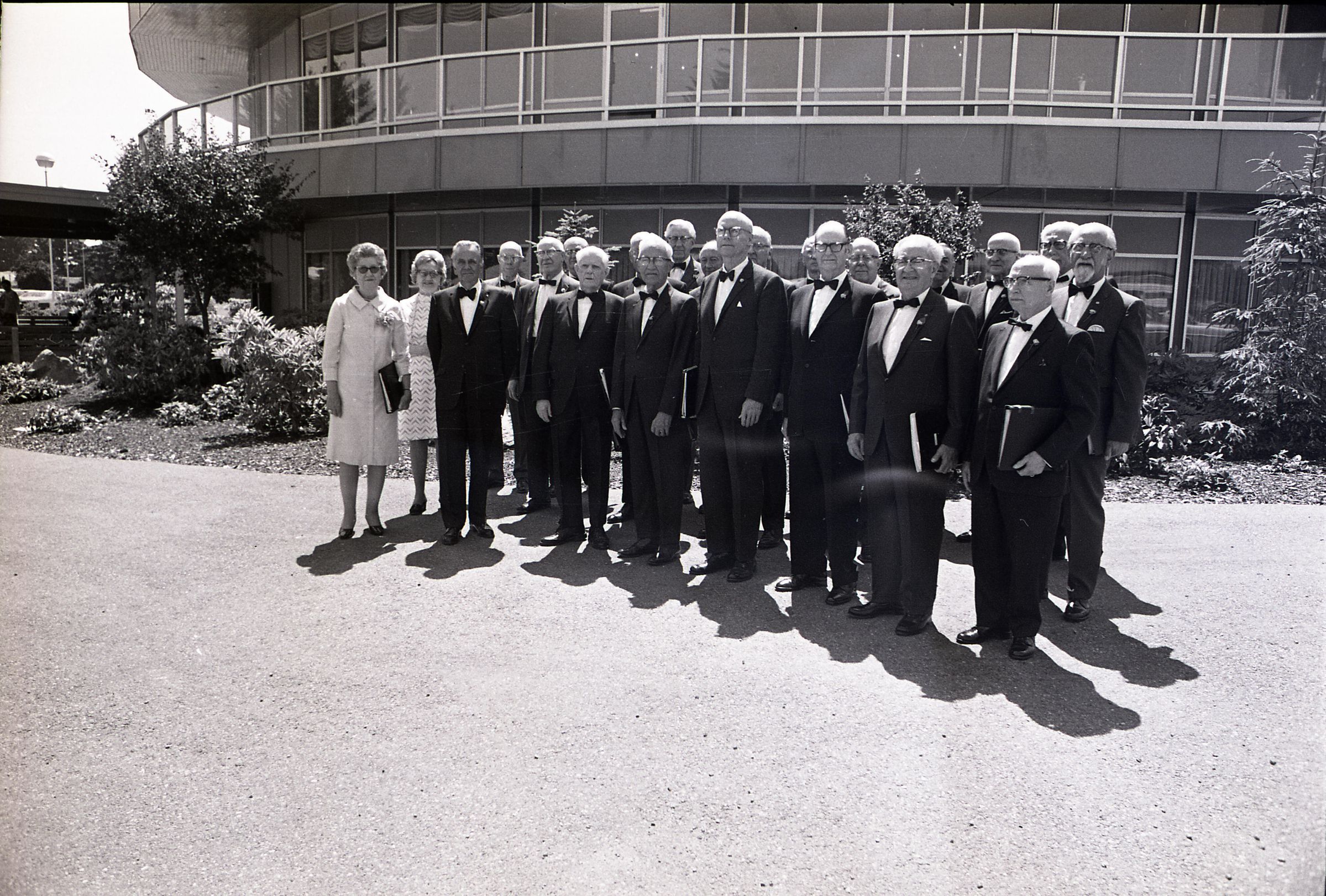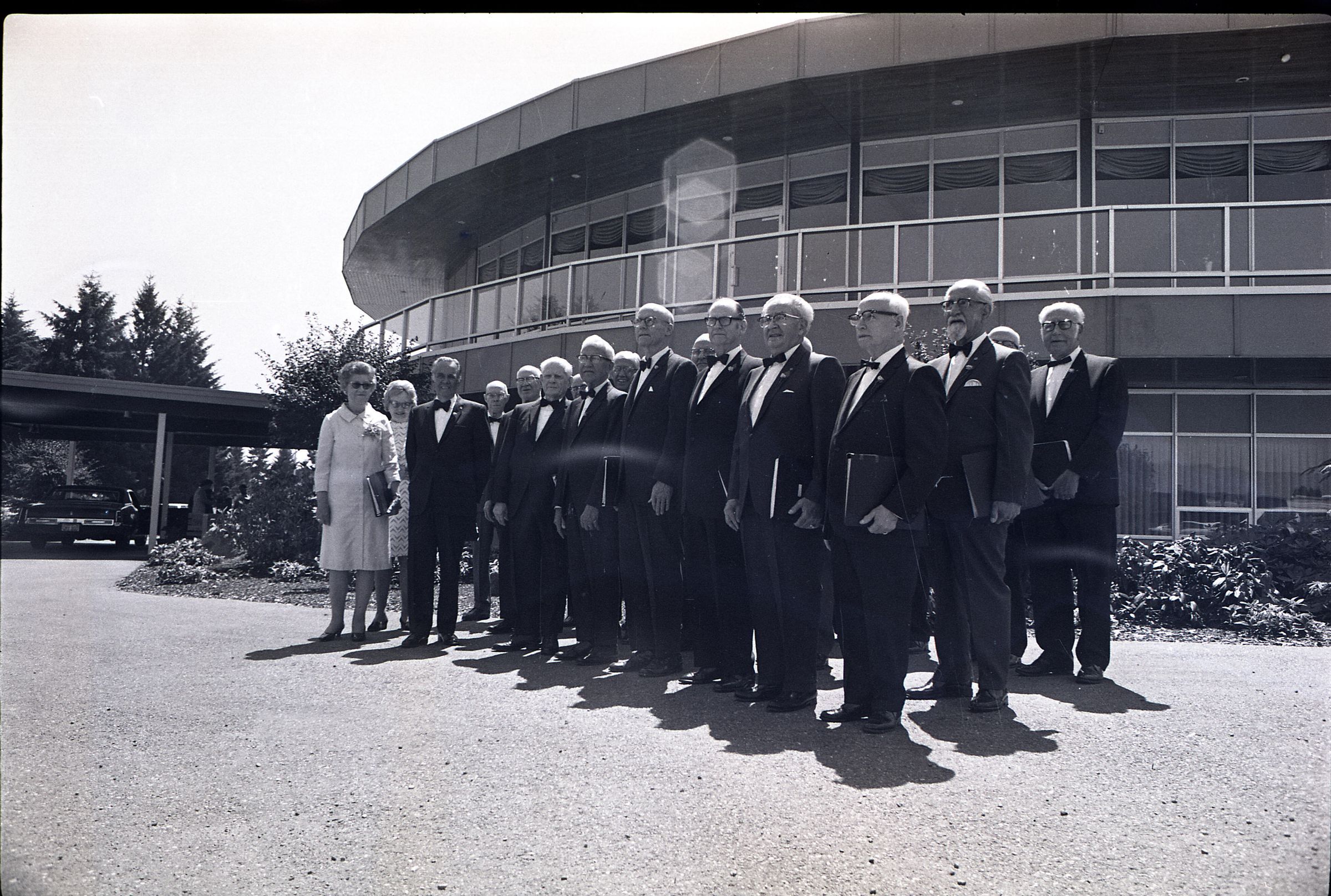 Choir, 06-1973. These three black and white negative film strips were created for the Lacey Leader newspaper. They depict a men's choir and their female conductor.
