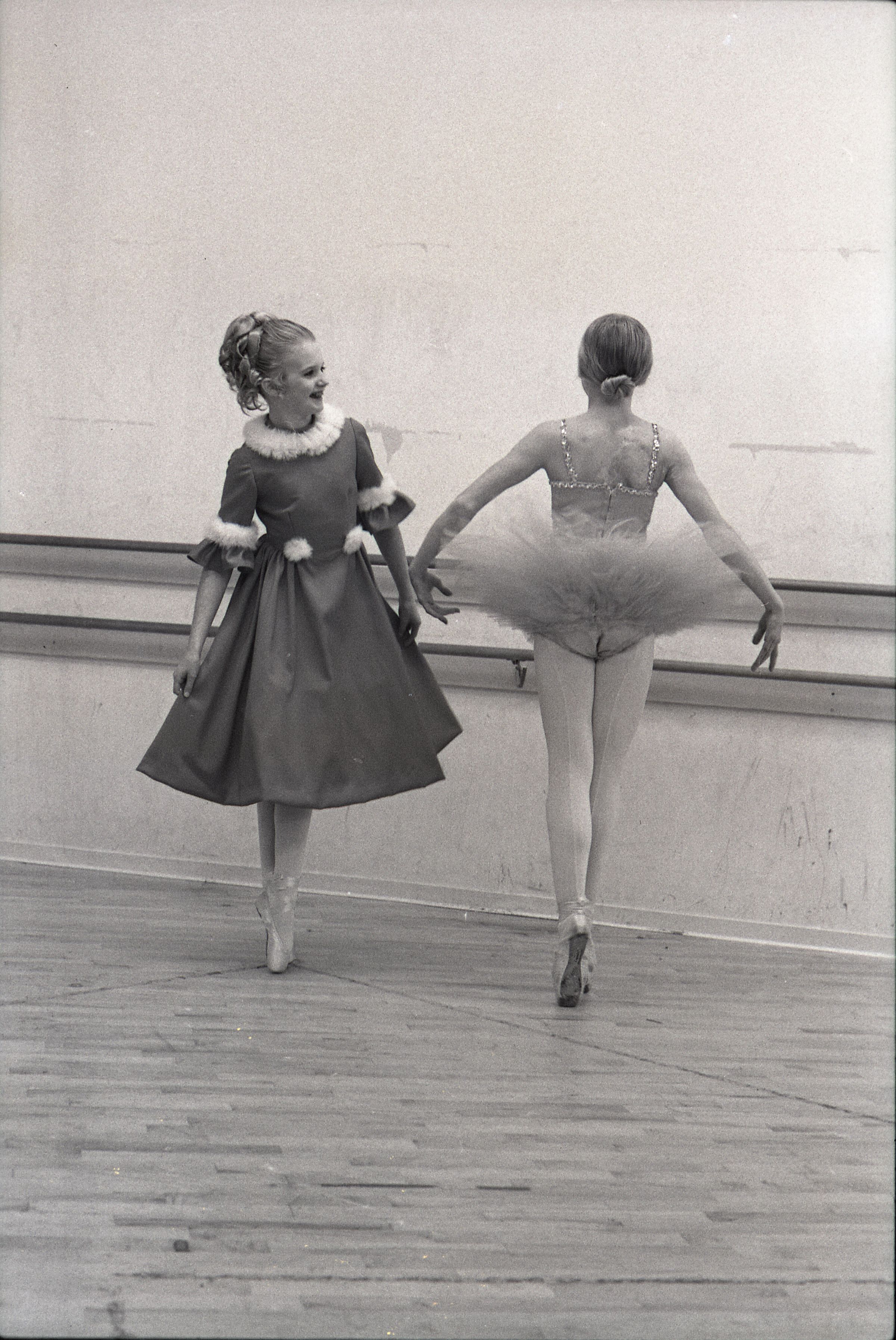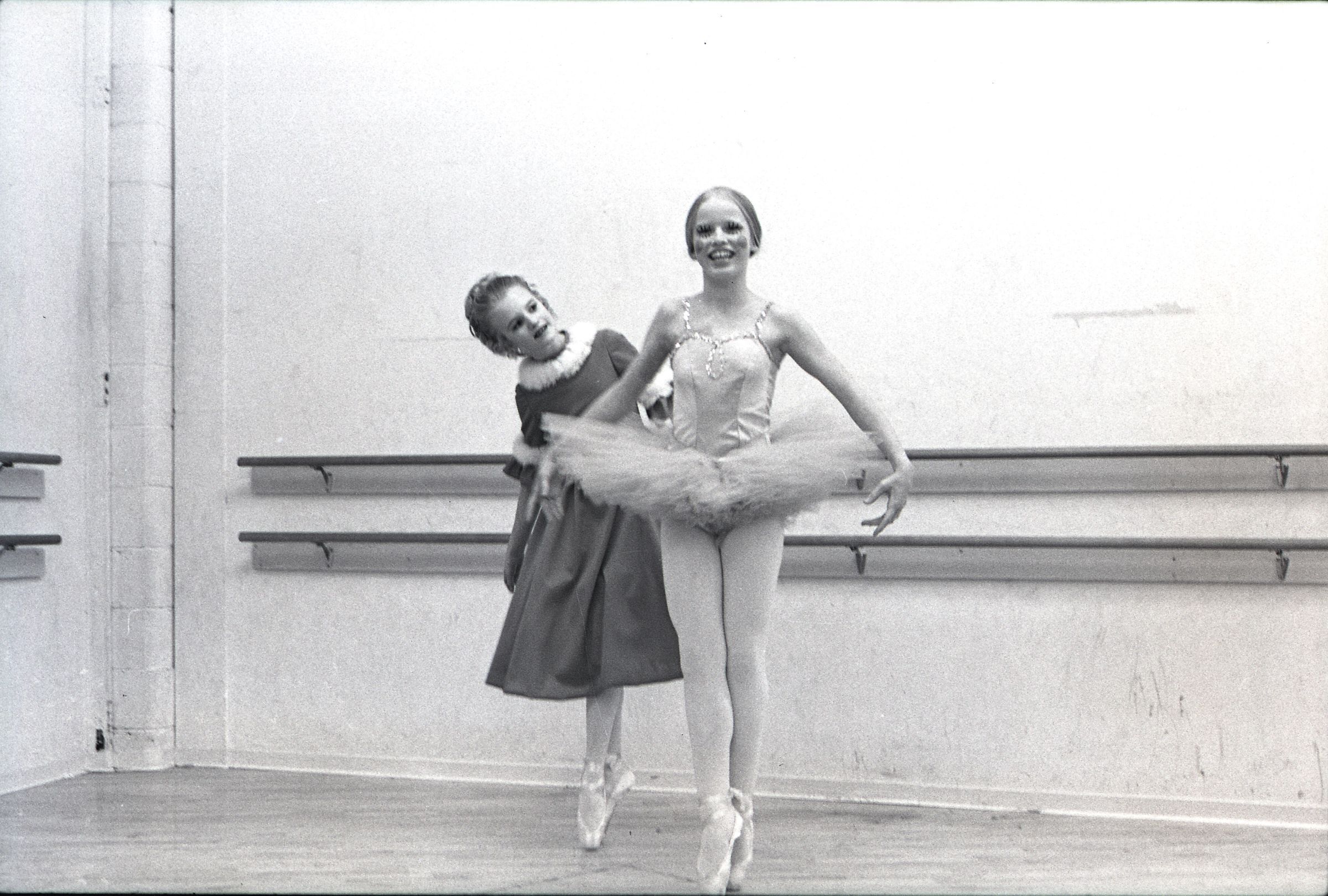 Ballet. These two photos show two women in ballet poses. One is dressed in a classic tutu, the other in a decorated dress; both are wearing ballet shoes. There is no indication where the photos were shot but balance bars for practicing ballet are in the background.Made/Created