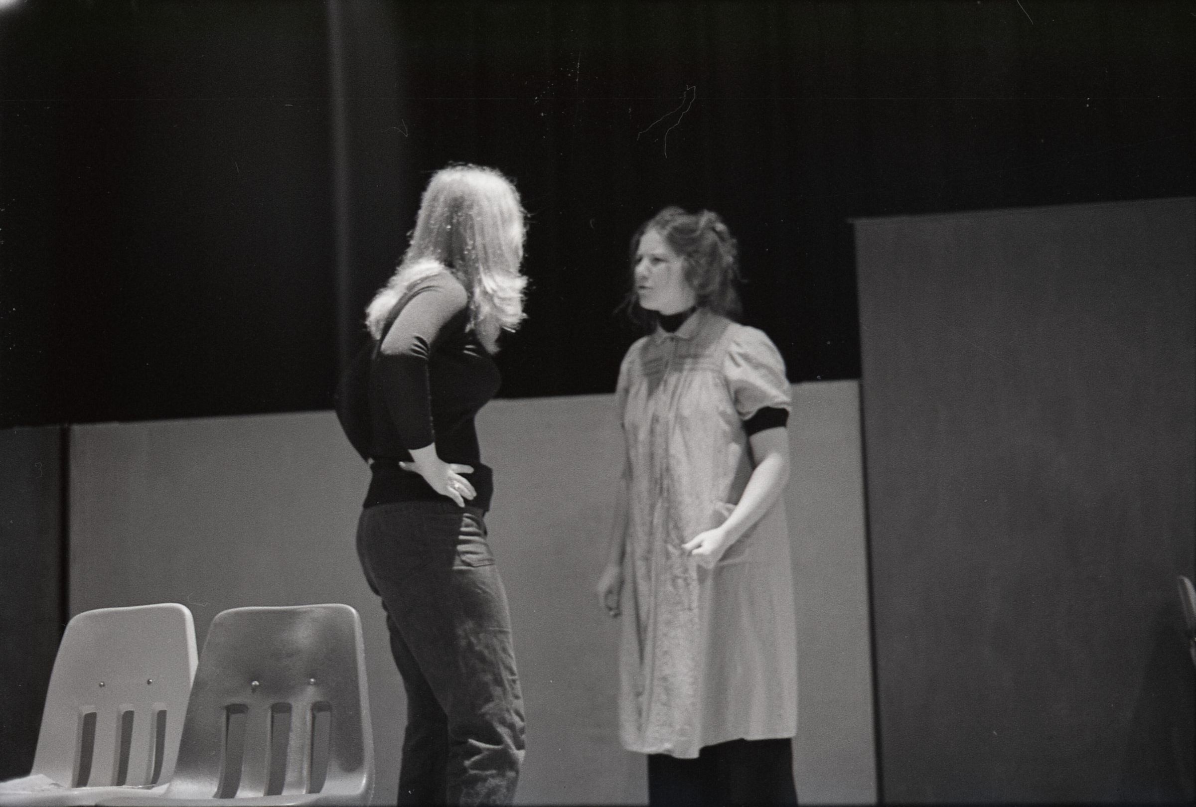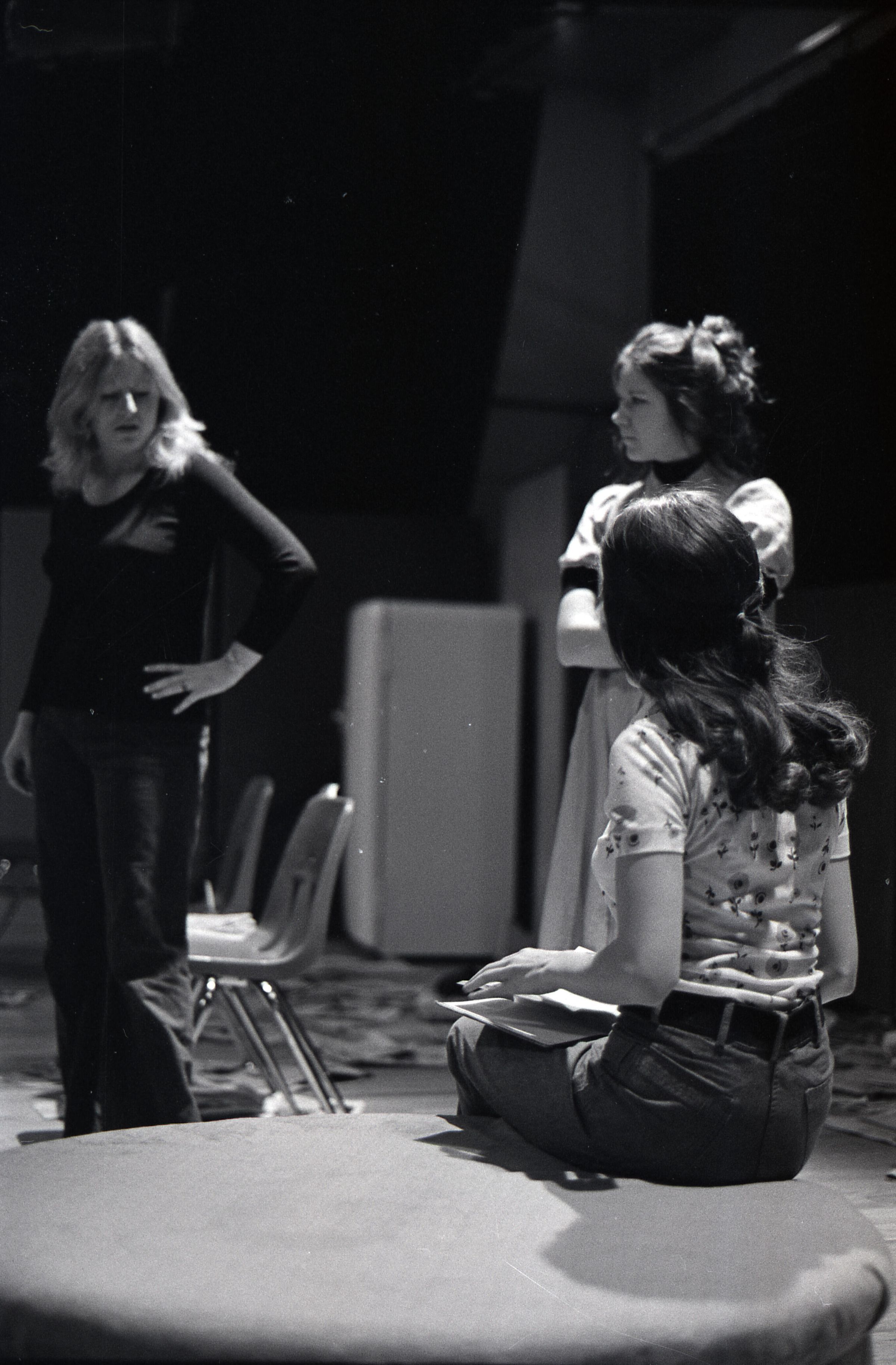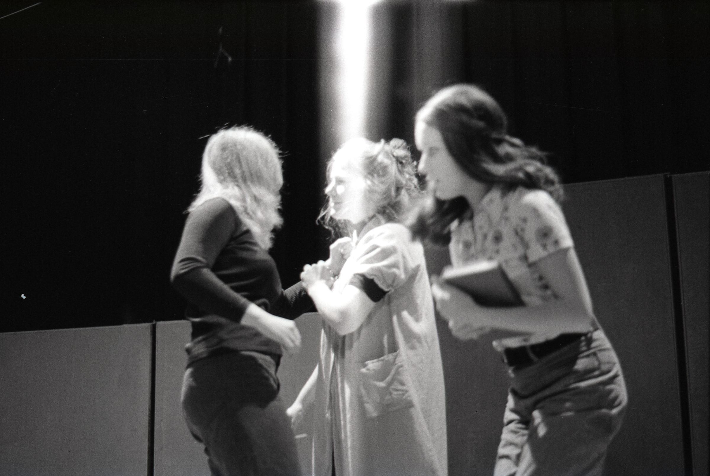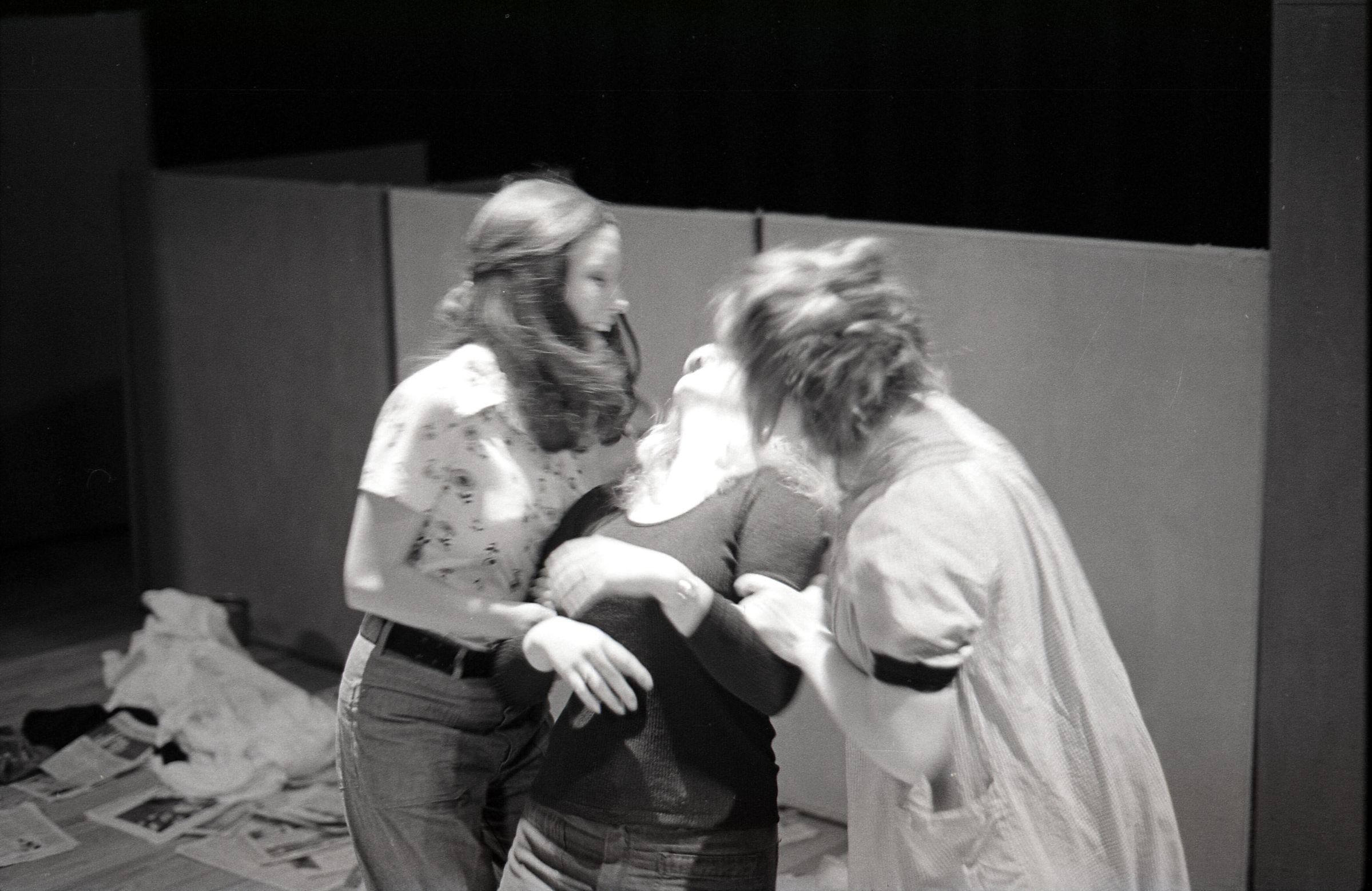 Timberline Play. Three strips, 17 photos. The play shown involves three young women on a relatively spare stage (2-3 plastic chairs, cubicle walls, and some materials strewn on the floor).Made/Created