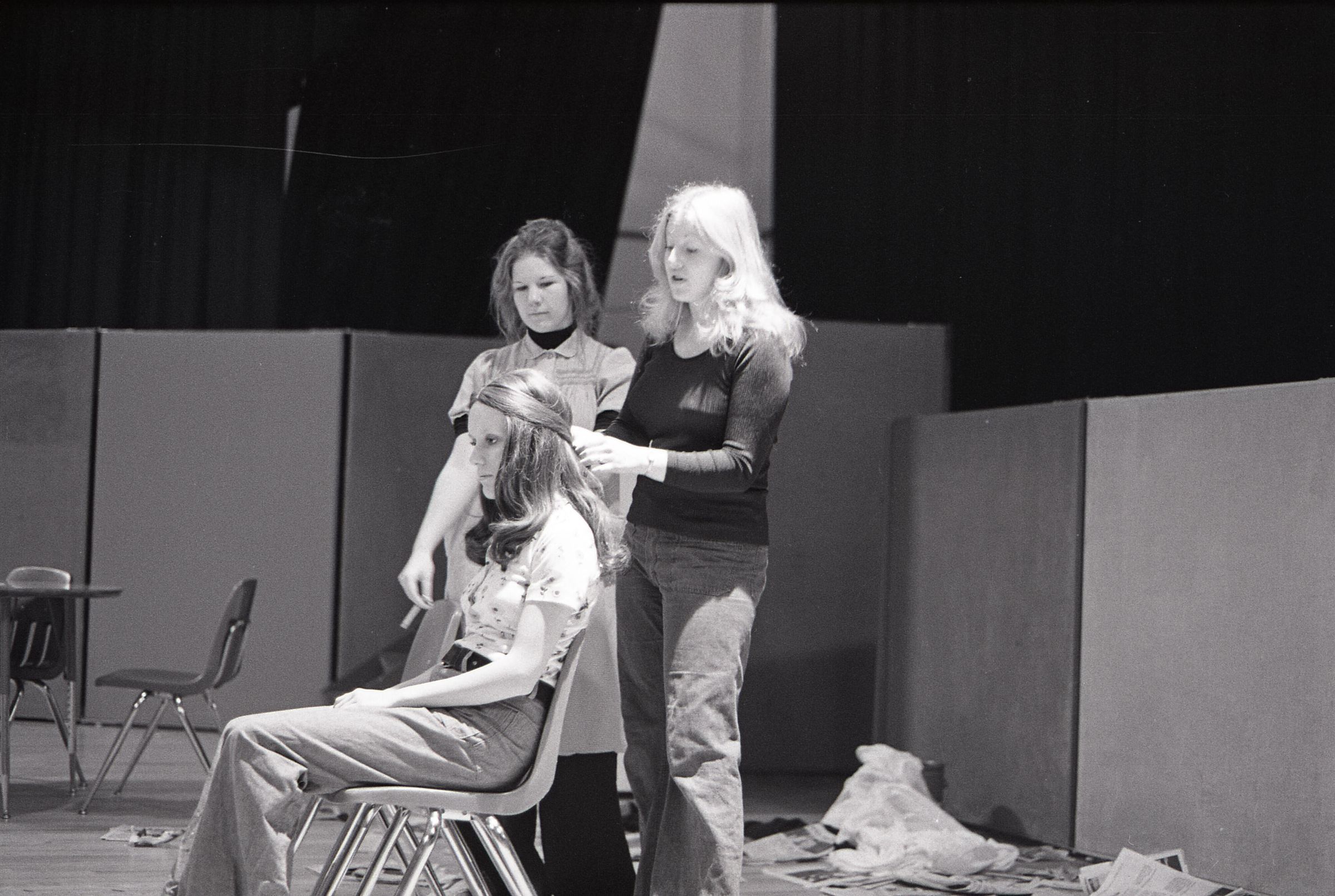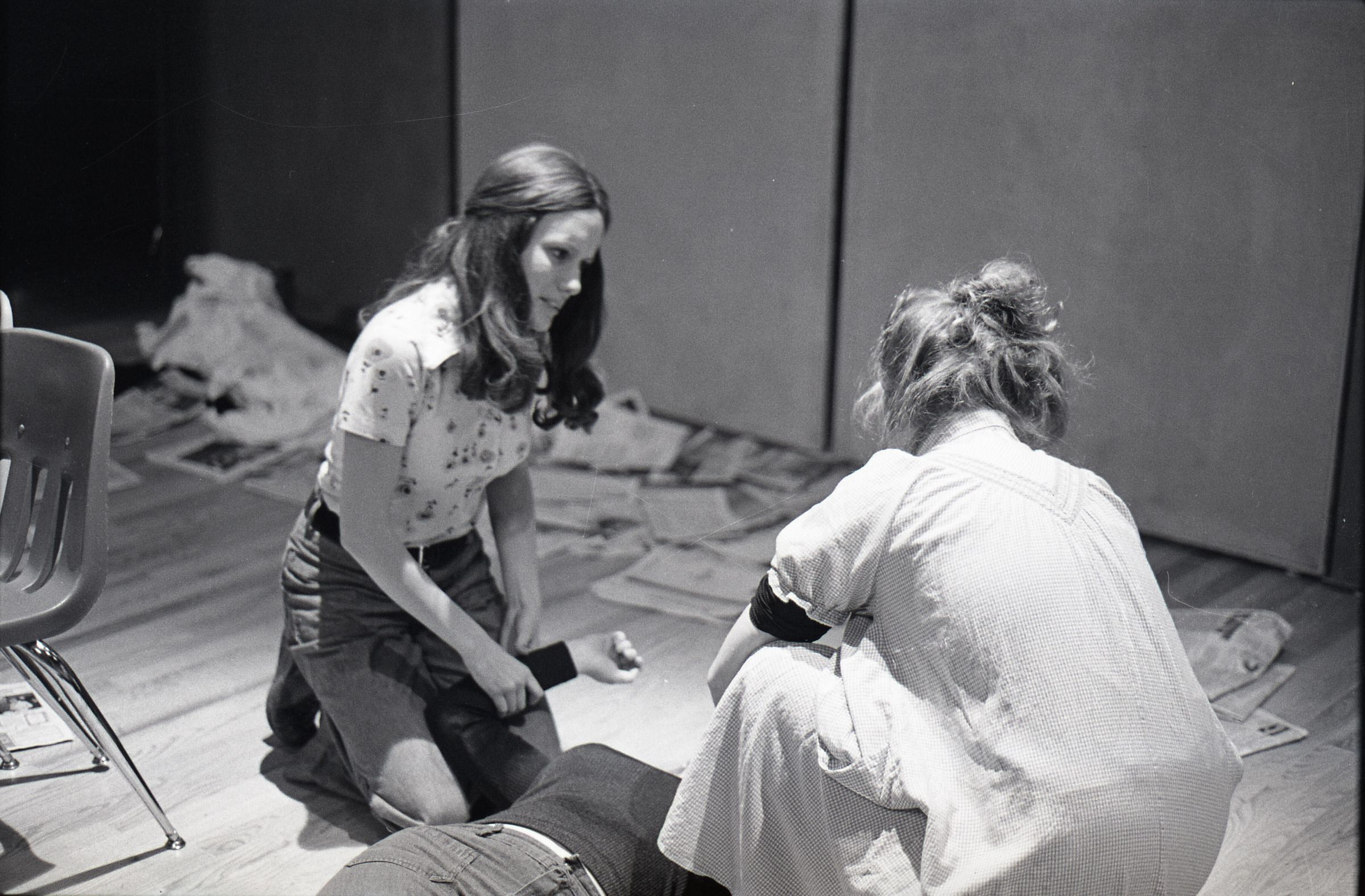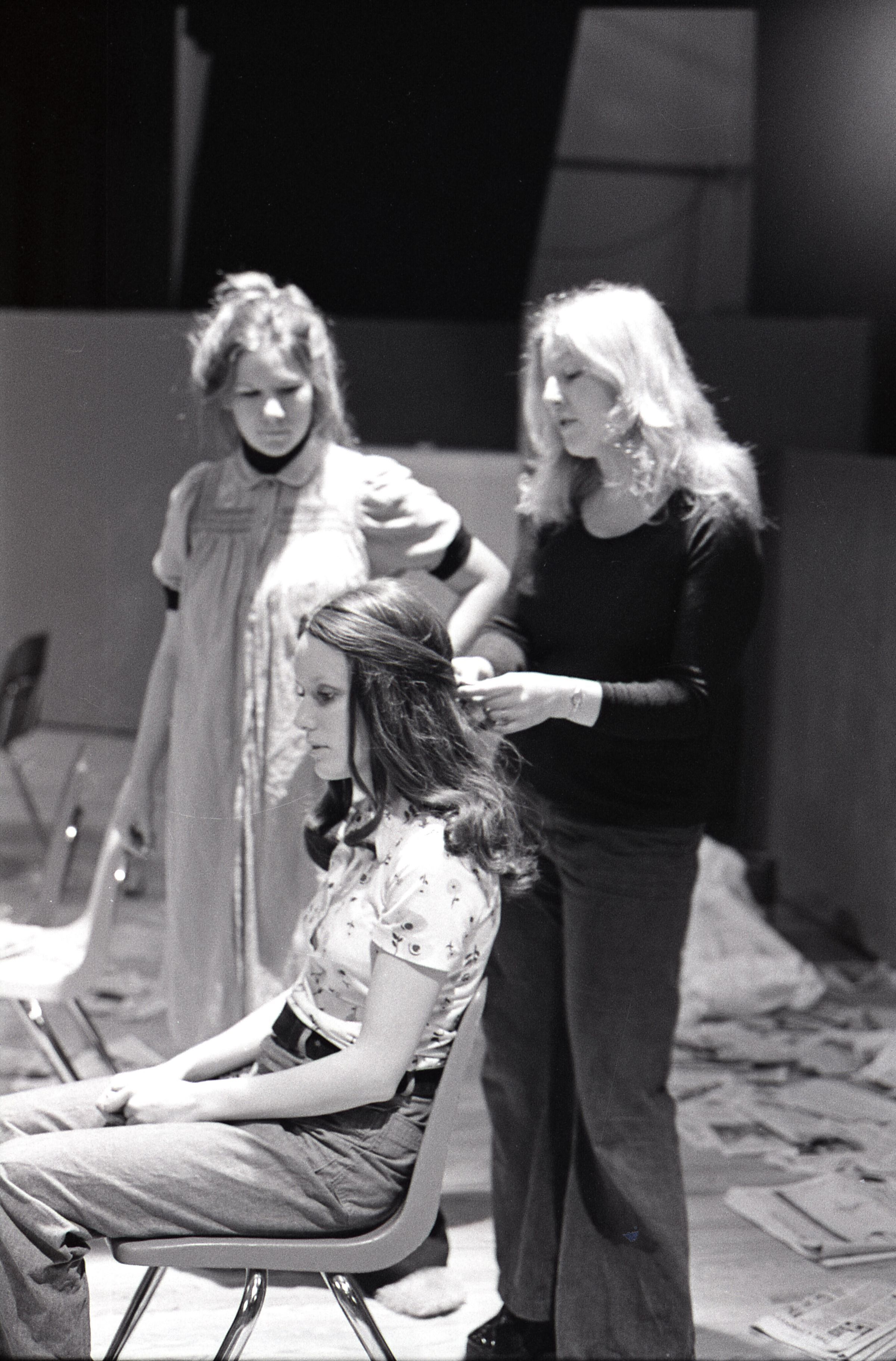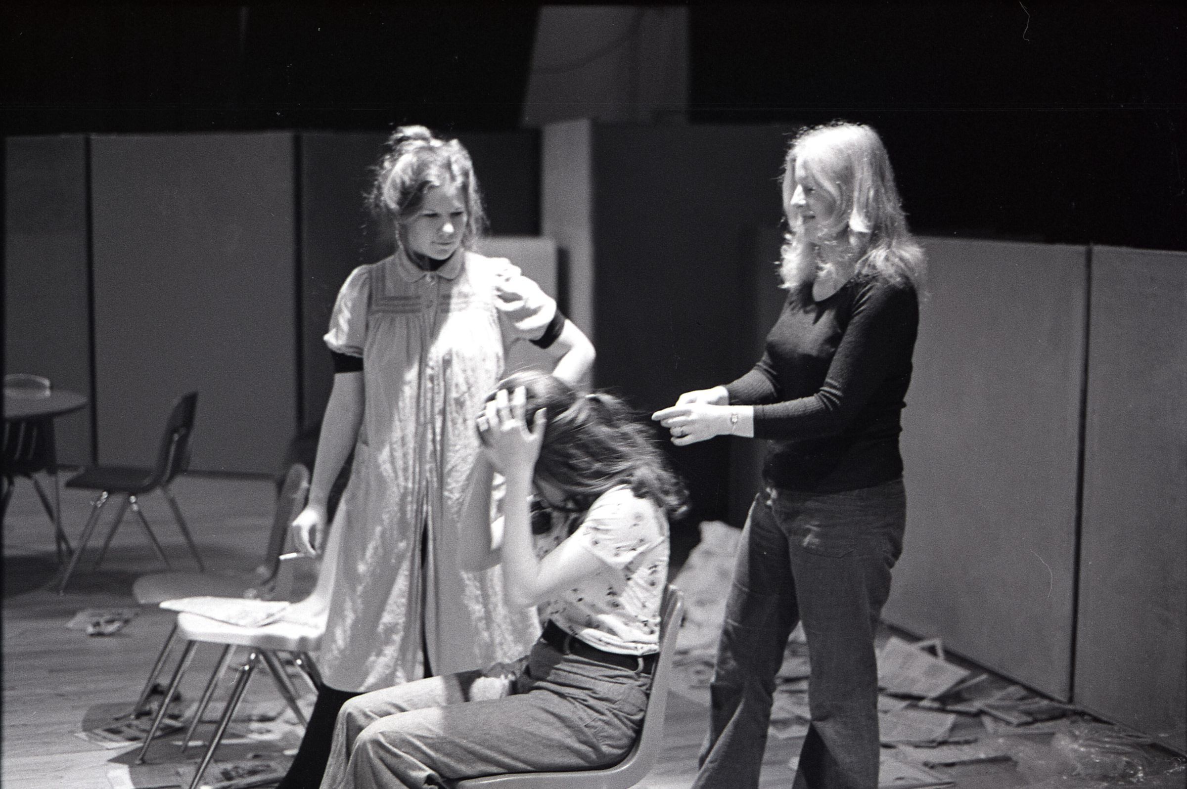 Timberline Play. Three strips, 17 photos. The play shown involves three young women on a relatively spare stage (2-3 plastic chairs, cubicle walls, and some materials strewn on the floor).Made/Created