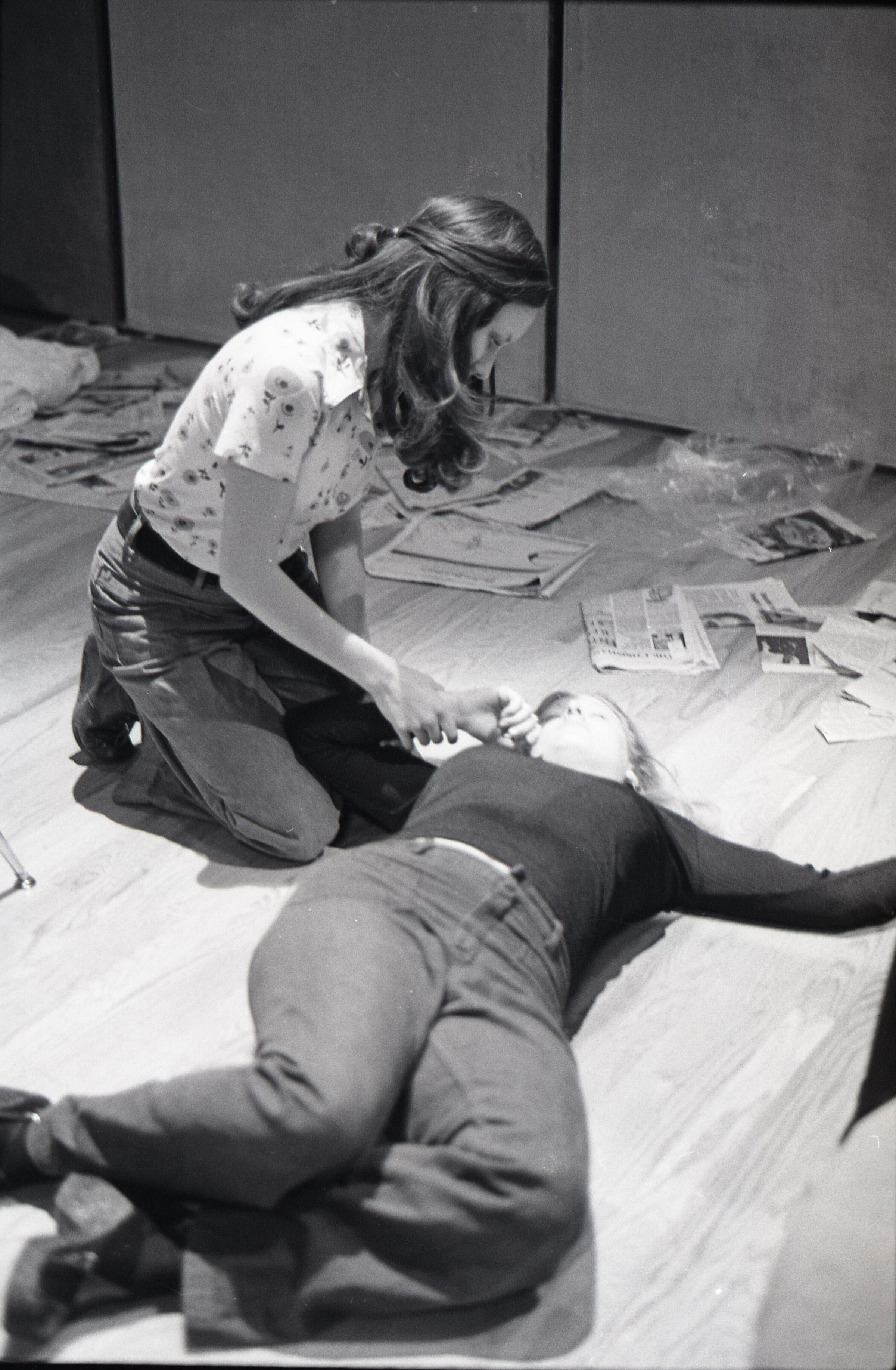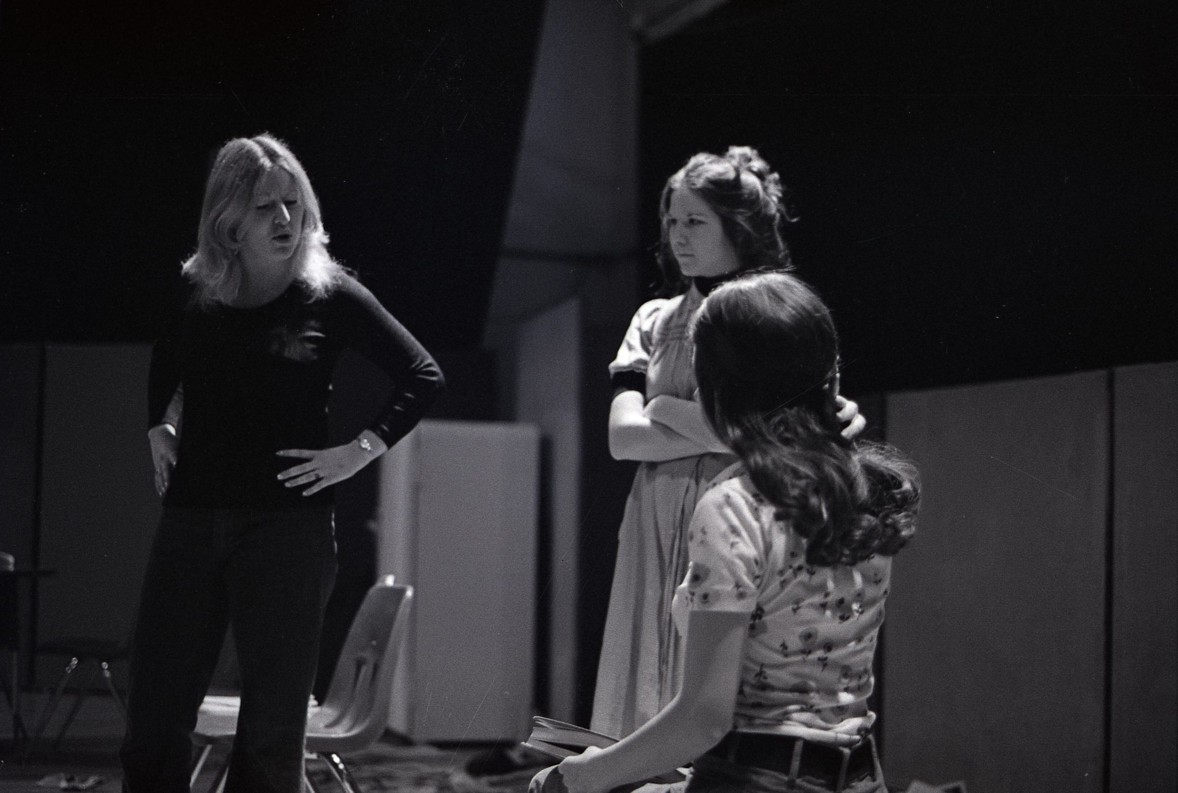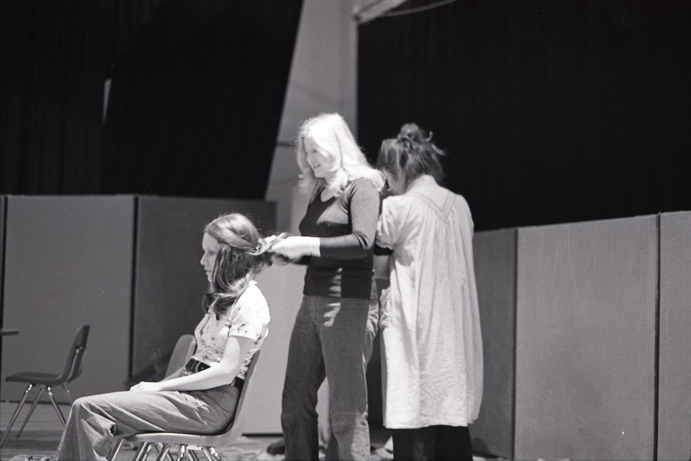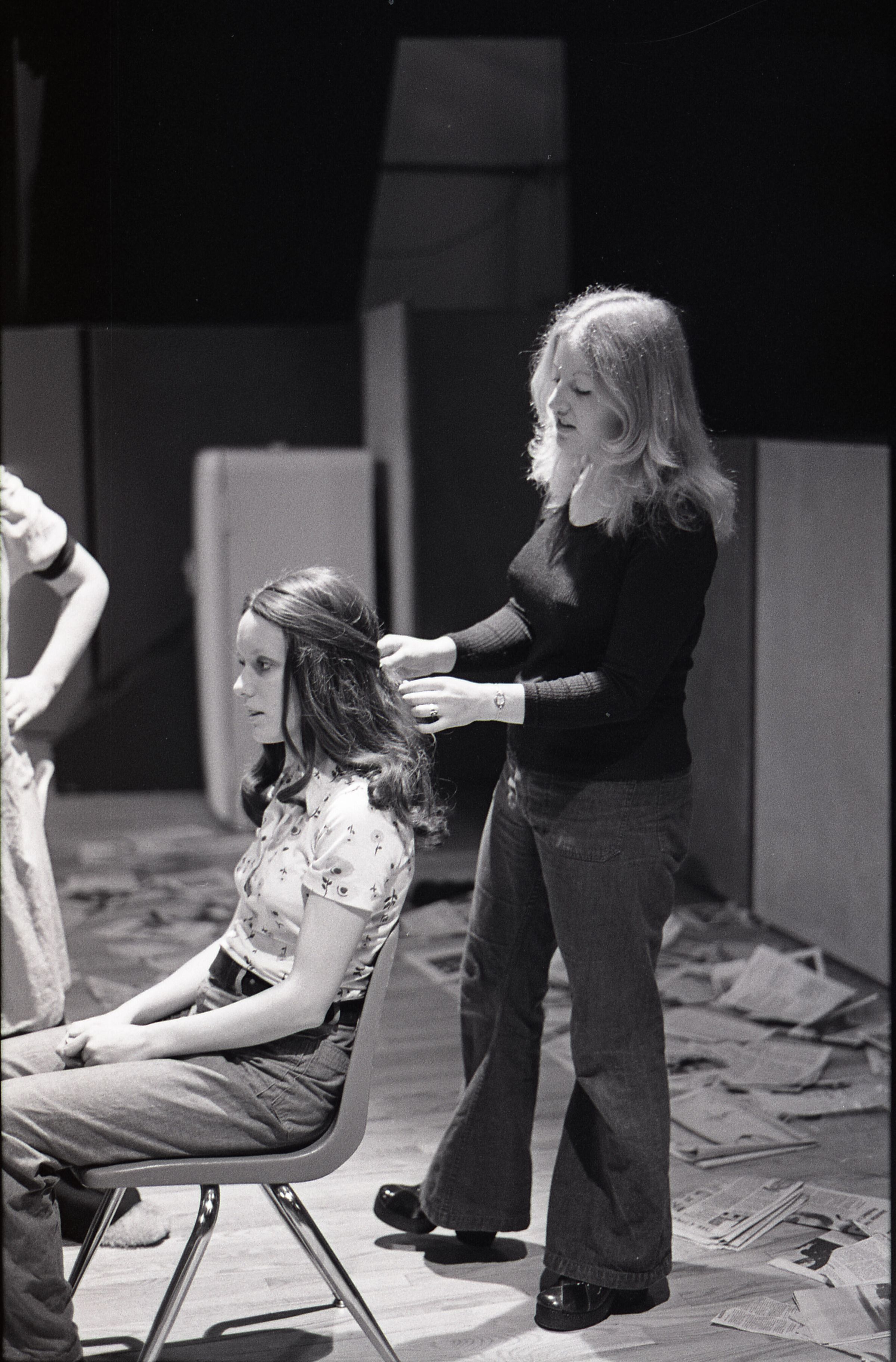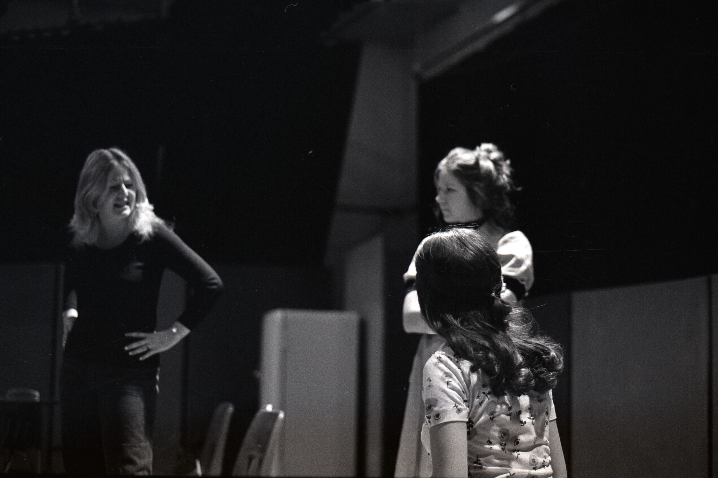 Timberline Play. Three strips, 17 photos. The play shown involves three young women on a relatively spare stage (2-3 plastic chairs, cubicle walls, and some materials strewn on the floor).Made/Created