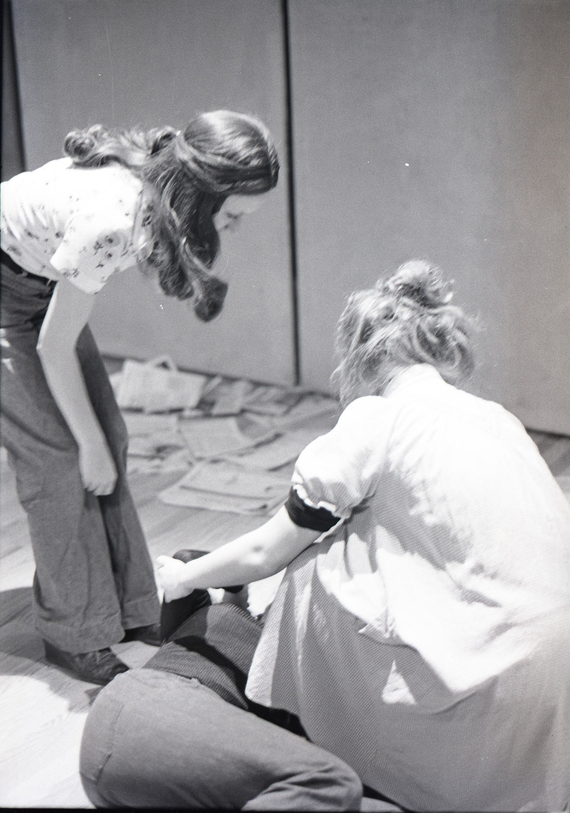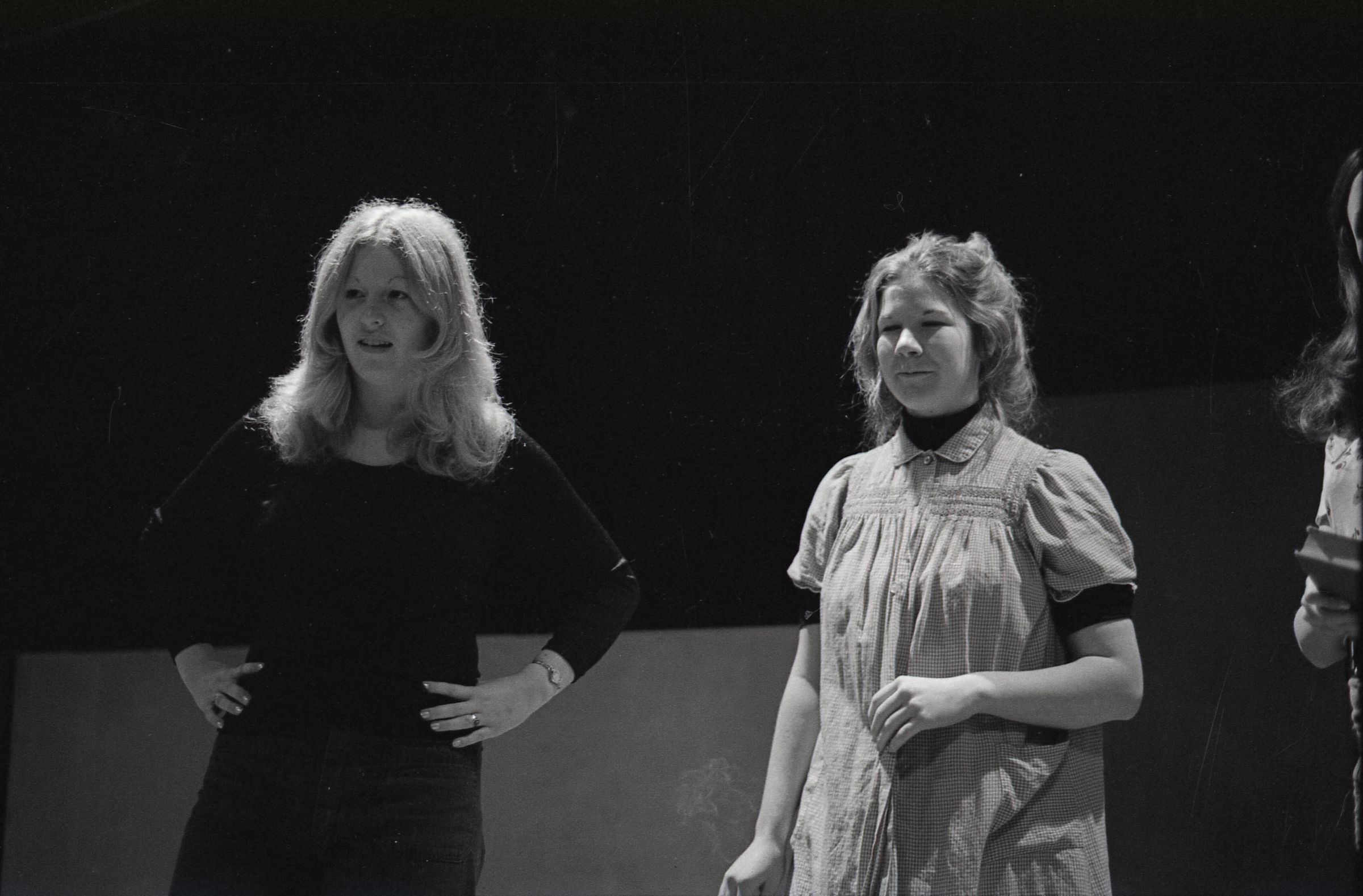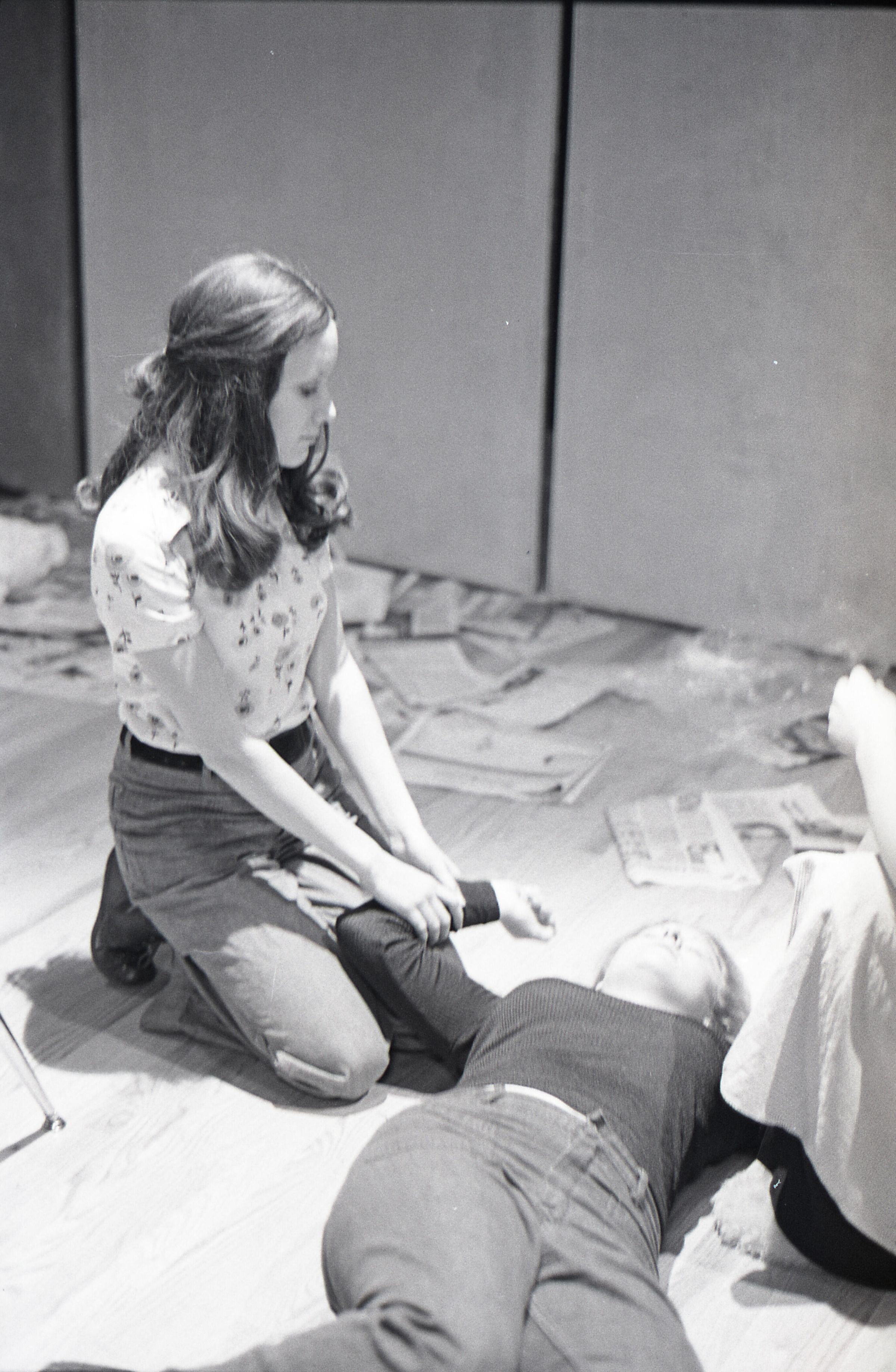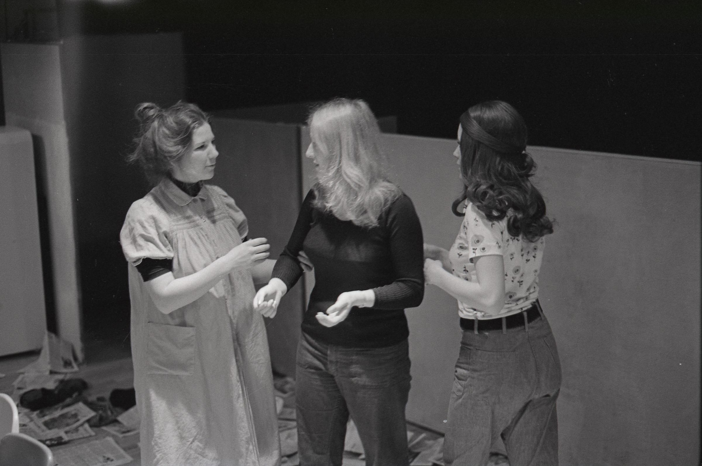 Timberline Play. Three strips, 17 photos. The play shown involves three young women on a relatively spare stage (2-3 plastic chairs, cubicle walls, and some materials strewn on the floor).Made/Created