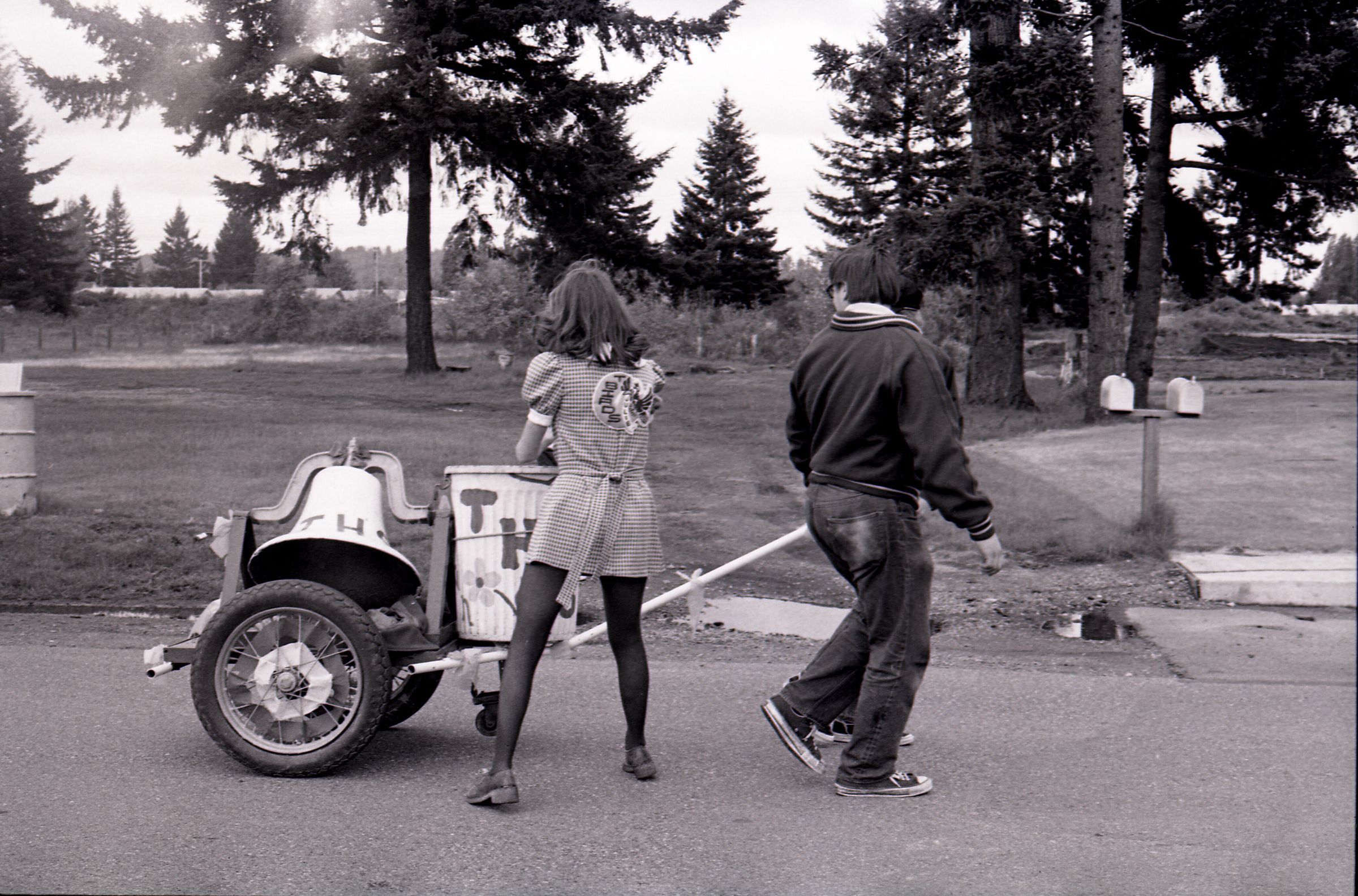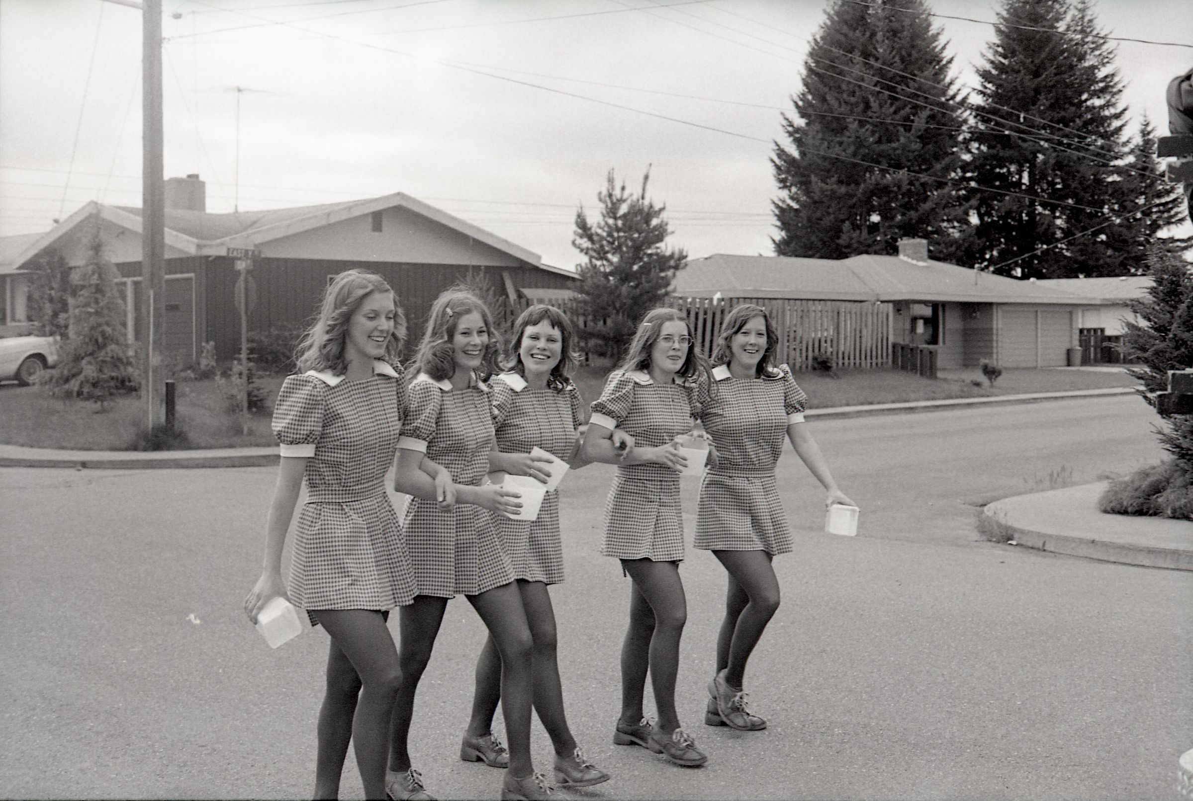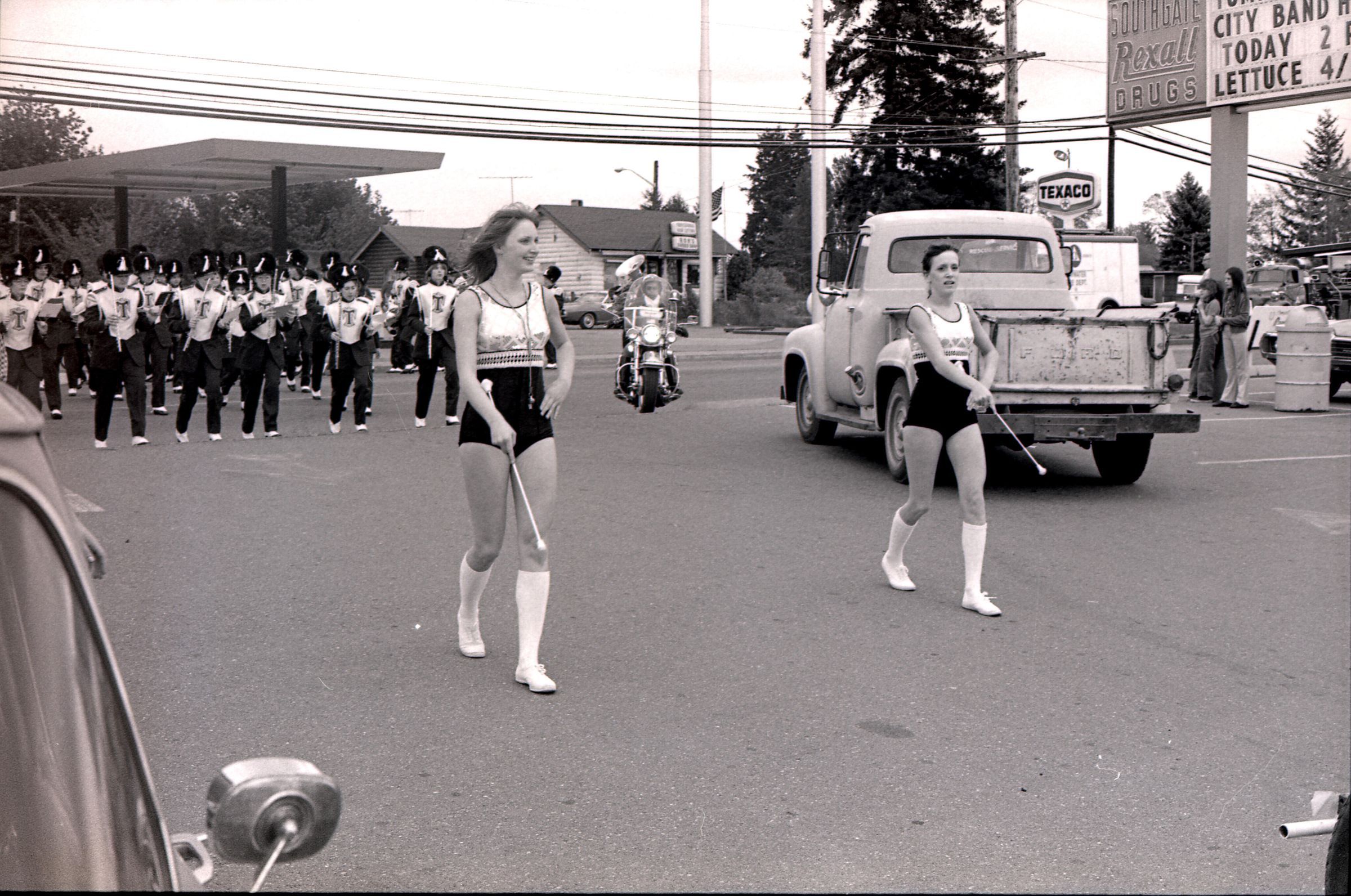 Parade, unknown date. These photos were taken for the Lacey Leader newspaper. There are 3 strips of negatives in this sleeve all depicting different components and people within a parade in Tumwater, Washington, USA.Made/Created