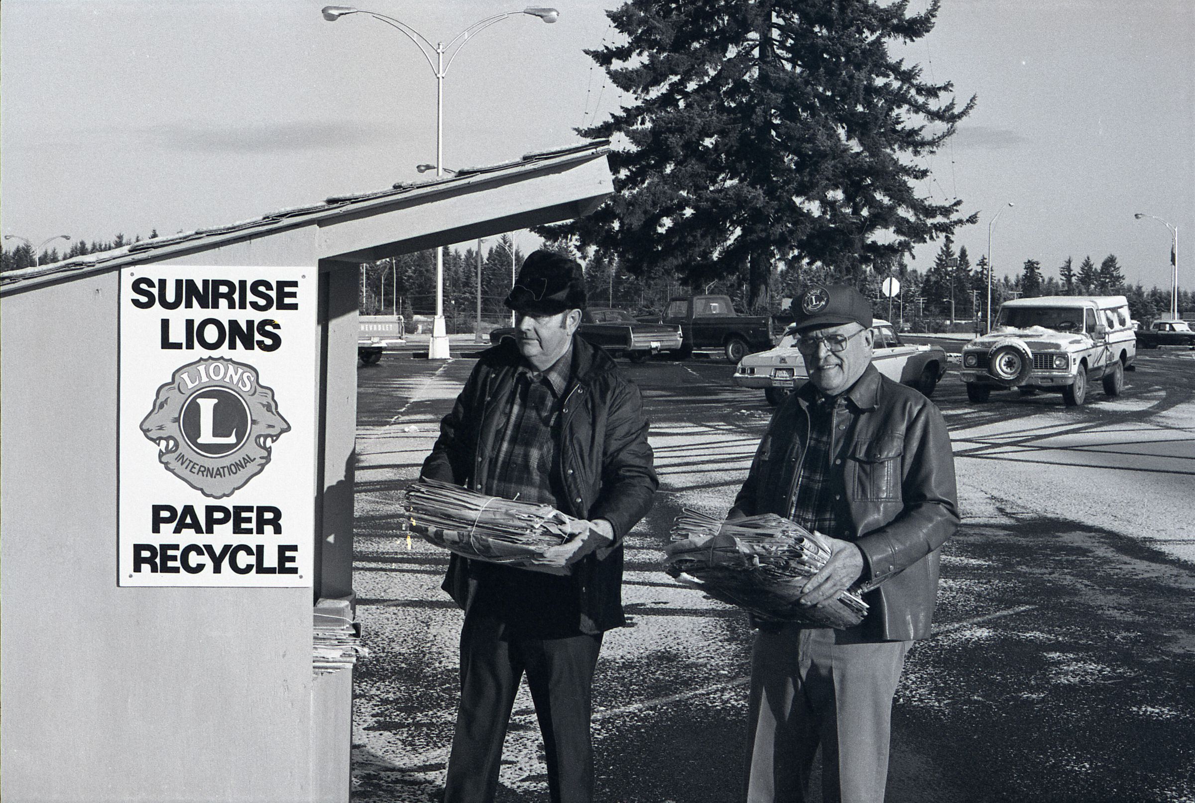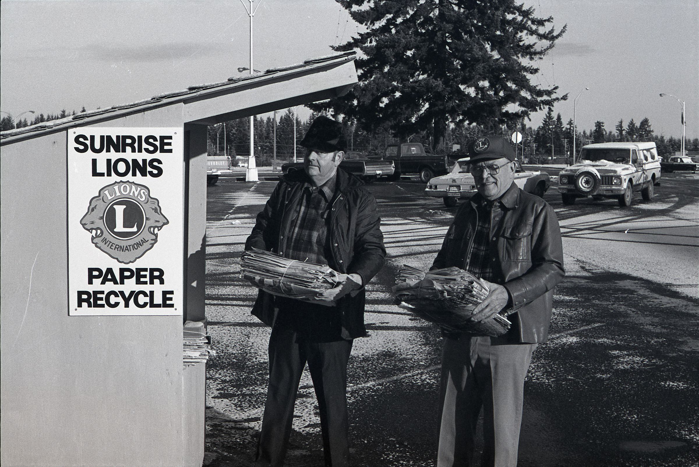 This single negative strip was created for the Lacey Leader newspaper. These four frames all depict two aged men wearing winter coats and carrying bundled stacks of newspapers to a Sunrise Lions paper recycling drop-off booth. Frame 32-33 nearly identical photos of the two men wearing plaid shirts under their unbuttoned winter coats. The man on the left is wearing a dark winter hat and dark slacks. The man on the right is wearing a baseball cap (with a lions patch on it) and light colored pants. There is snow on the ground in the background and tire tracks can be seen in the snow in the parking lot they are standing in. Behind them are parked cars and in the far left of the frame the Sears sign can be seen, placing this photo at 651 Sleater Kinney Rd SE in the old South Sound Shopping Center. Frames 34 & 35 are the same shot as 32&33 but shot at a different angle, making the Sears not visible and bringing the cars in the parking lot into view.