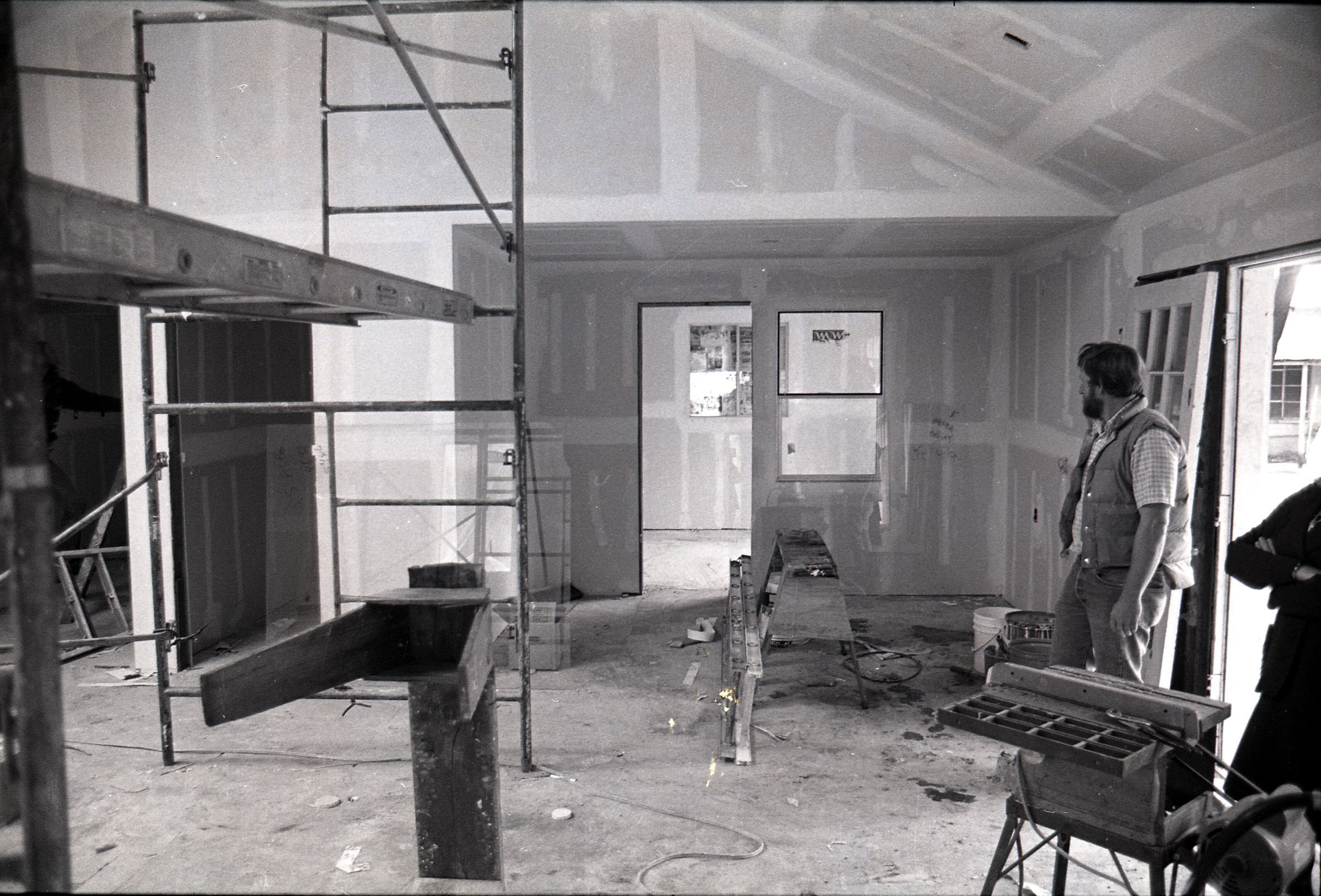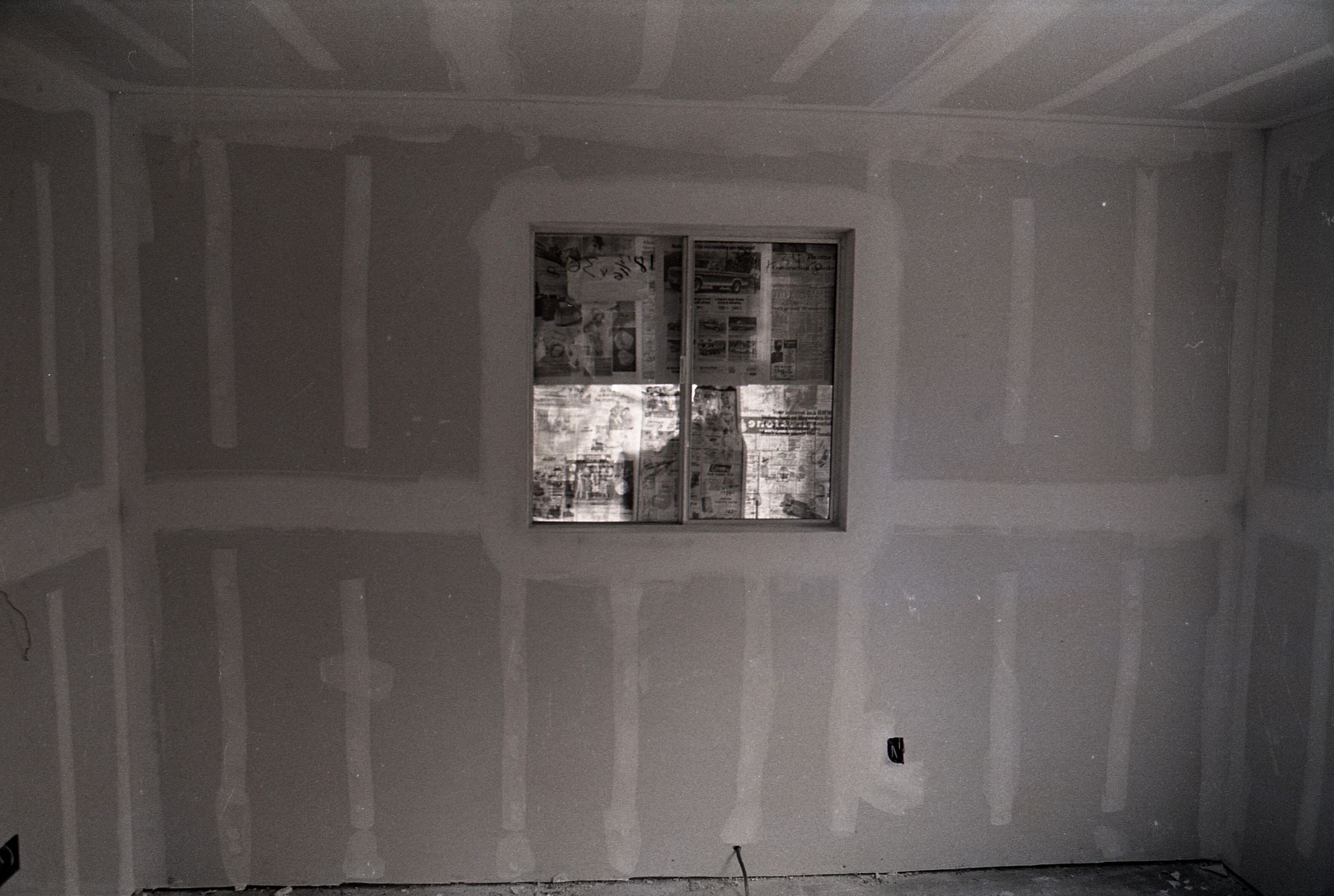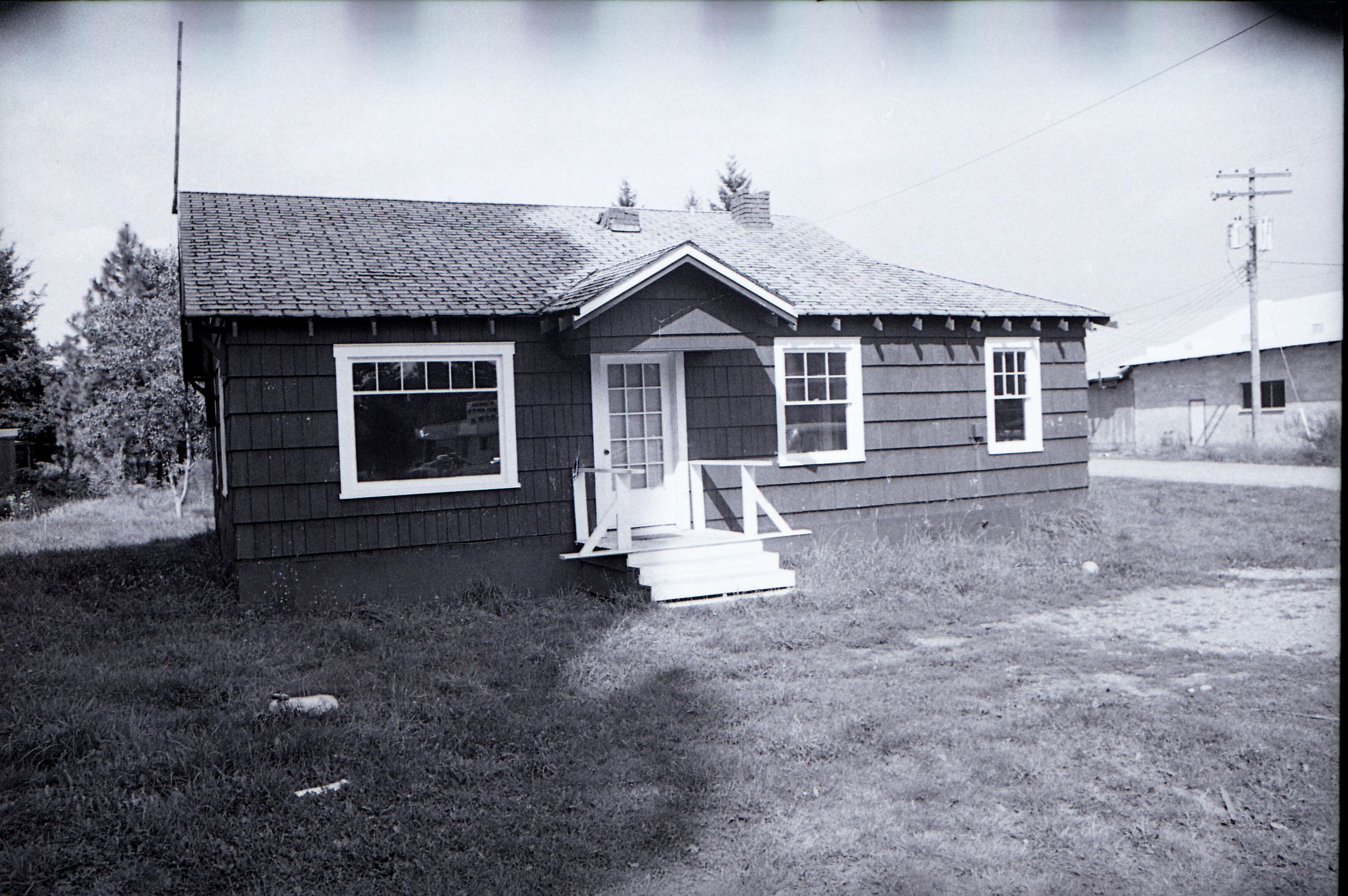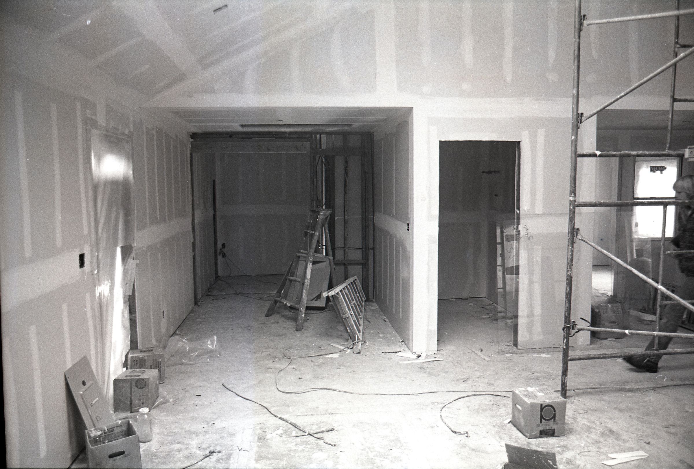 Lacey Leader new office, unknown date. These 9 B&W negative film strips were created for the Lacey Leader Newspaper. Showcased in this sleeve is the construction of a new Lacey Leader office building. The building is in several phases of construction in these photos, from construction such as carpentry of walls and doorways, to the finished office. There are also 2 portraits of an unknown man in this envelope.Made/Created