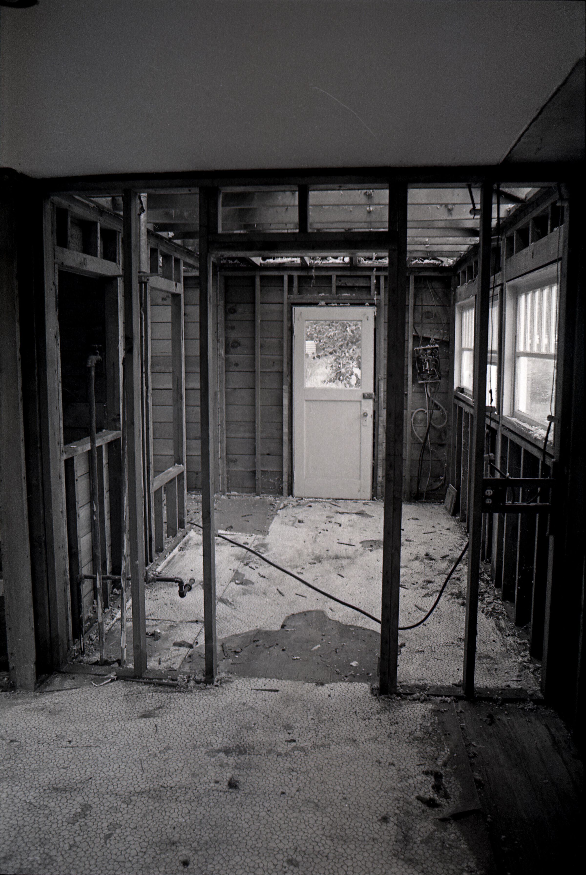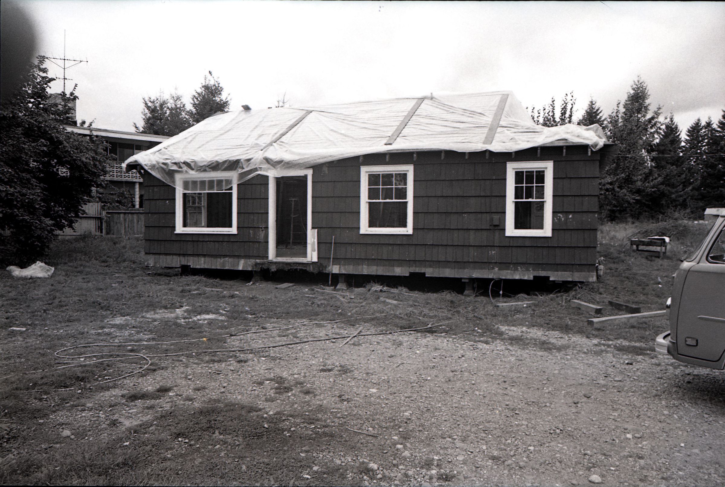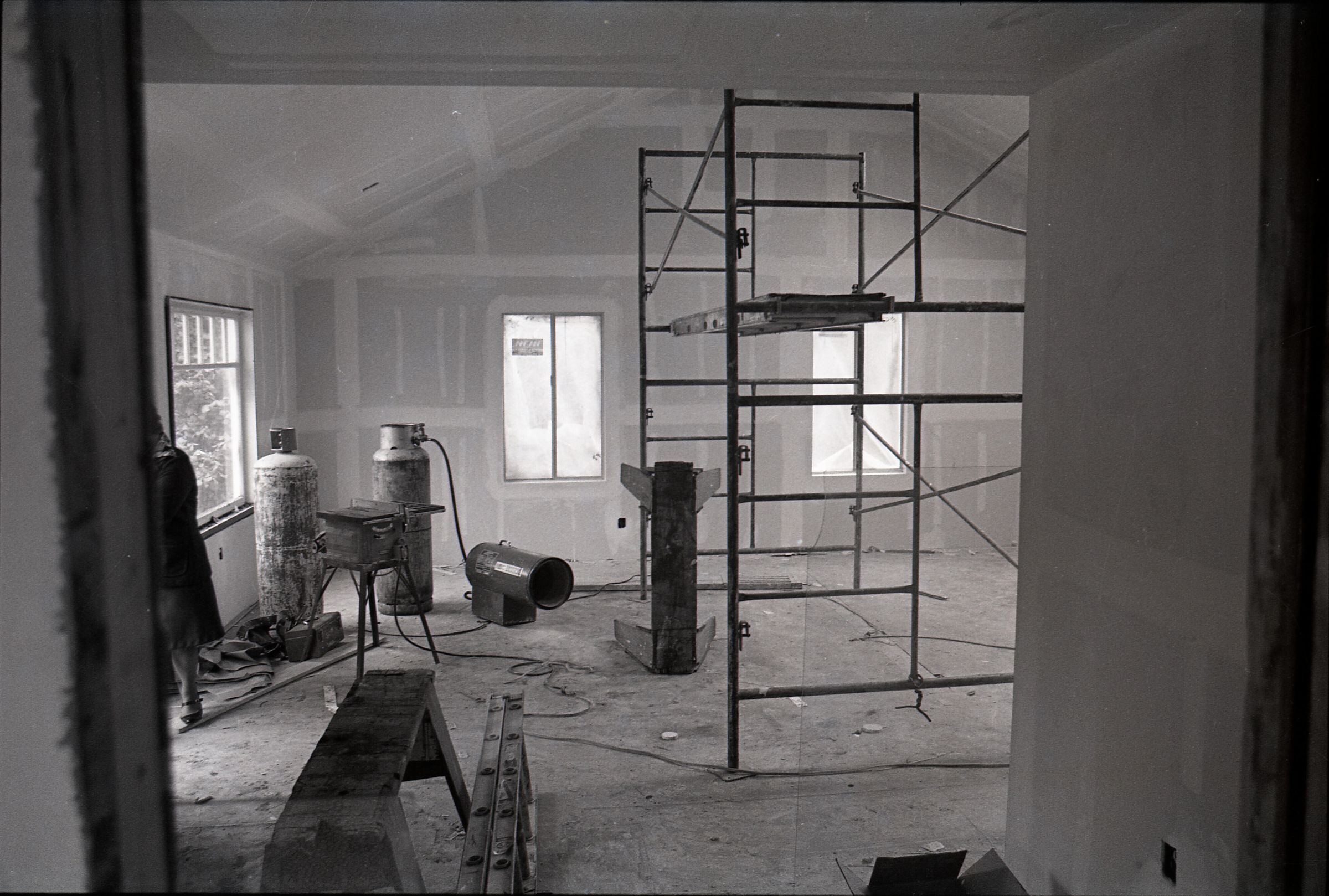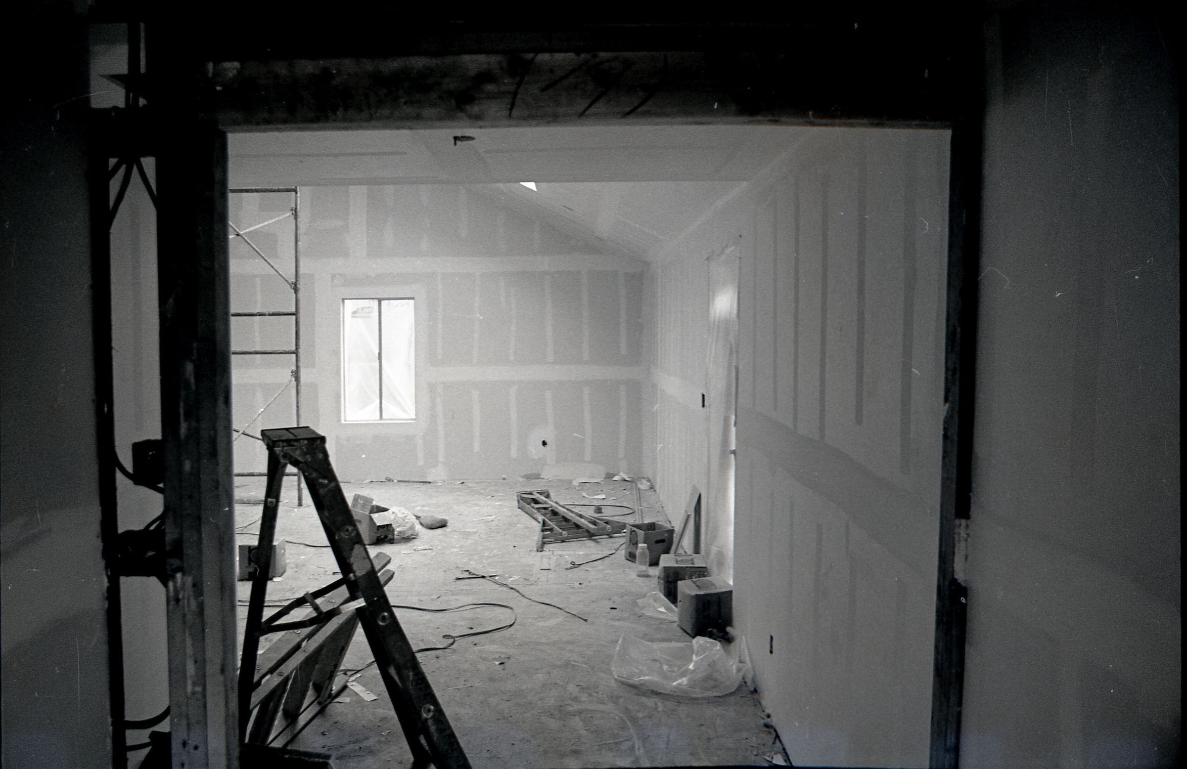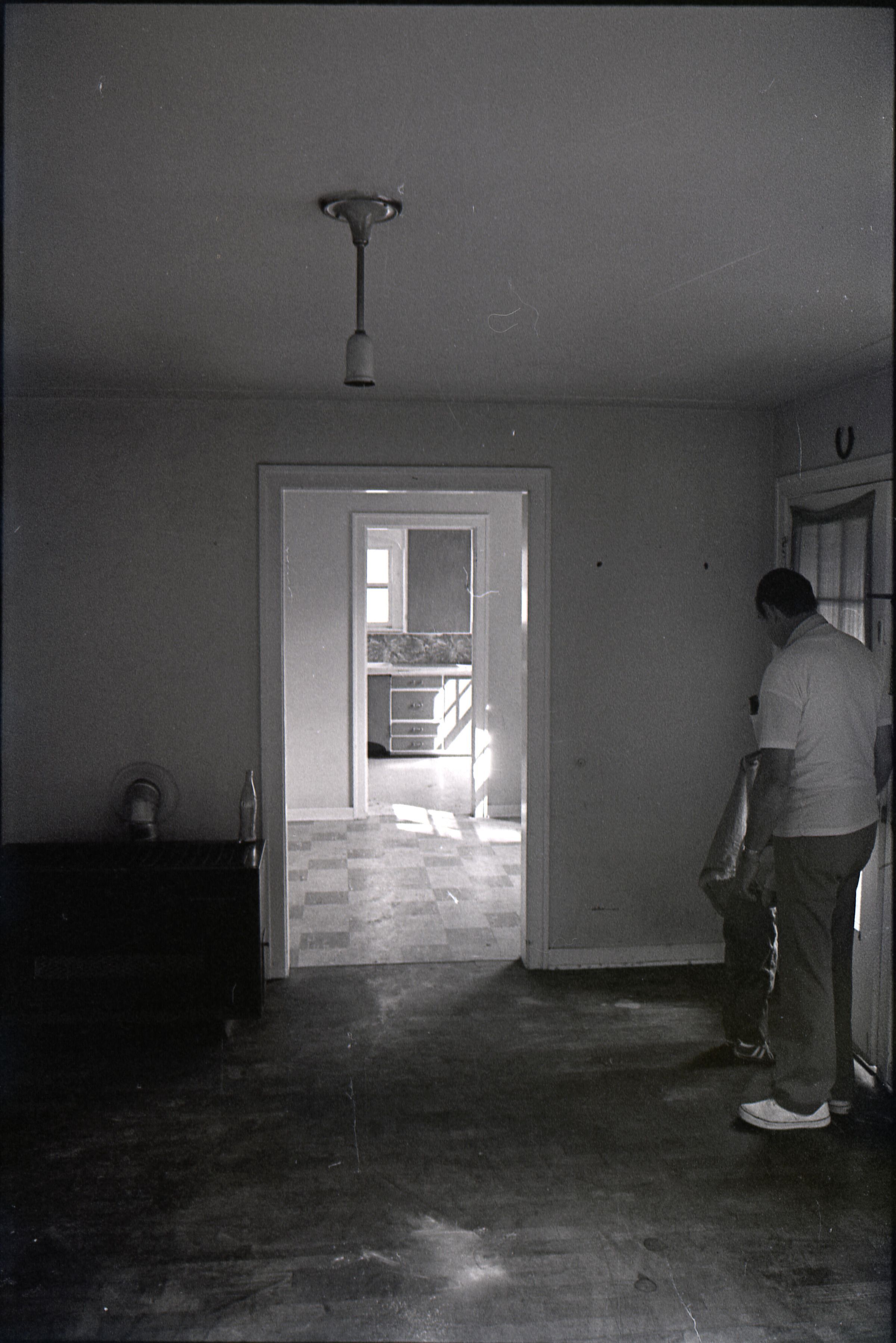 Lacey Leader new office, unknown date. These 9 B&W negative film strips were created for the Lacey Leader Newspaper. Showcased in this sleeve is the construction of a new Lacey Leader office building. The building is in several phases of construction in these photos, from construction such as carpentry of walls and doorways, to the finished office. There are also 2 portraits of an unknown man in this envelope.Made/Created