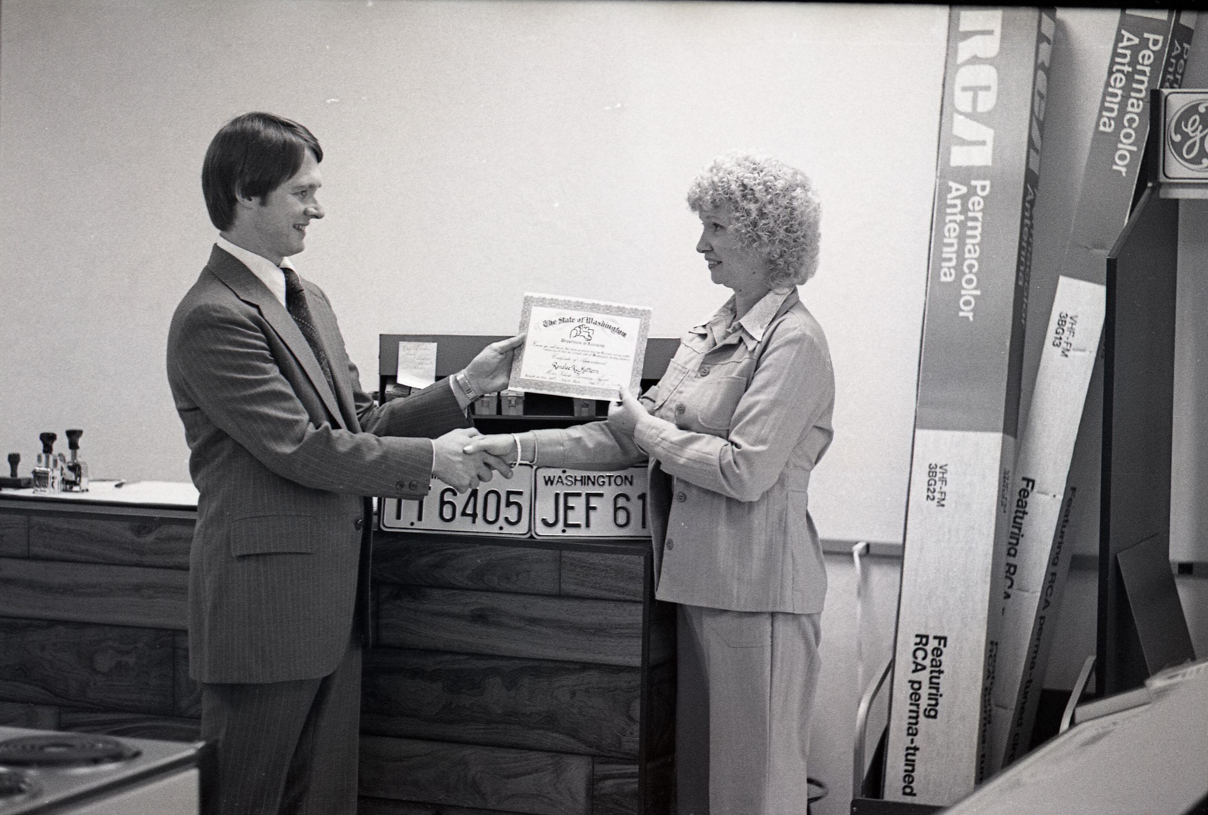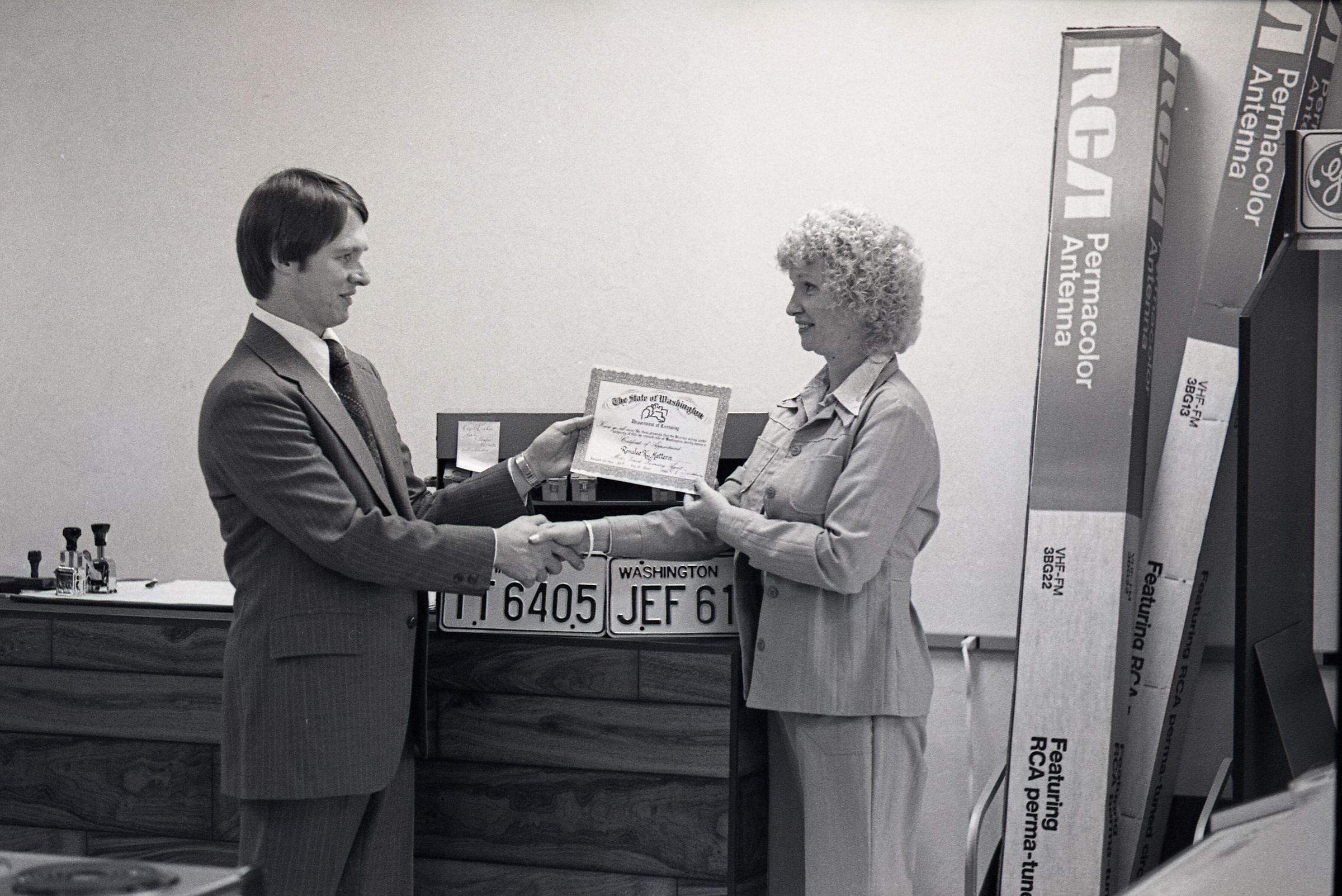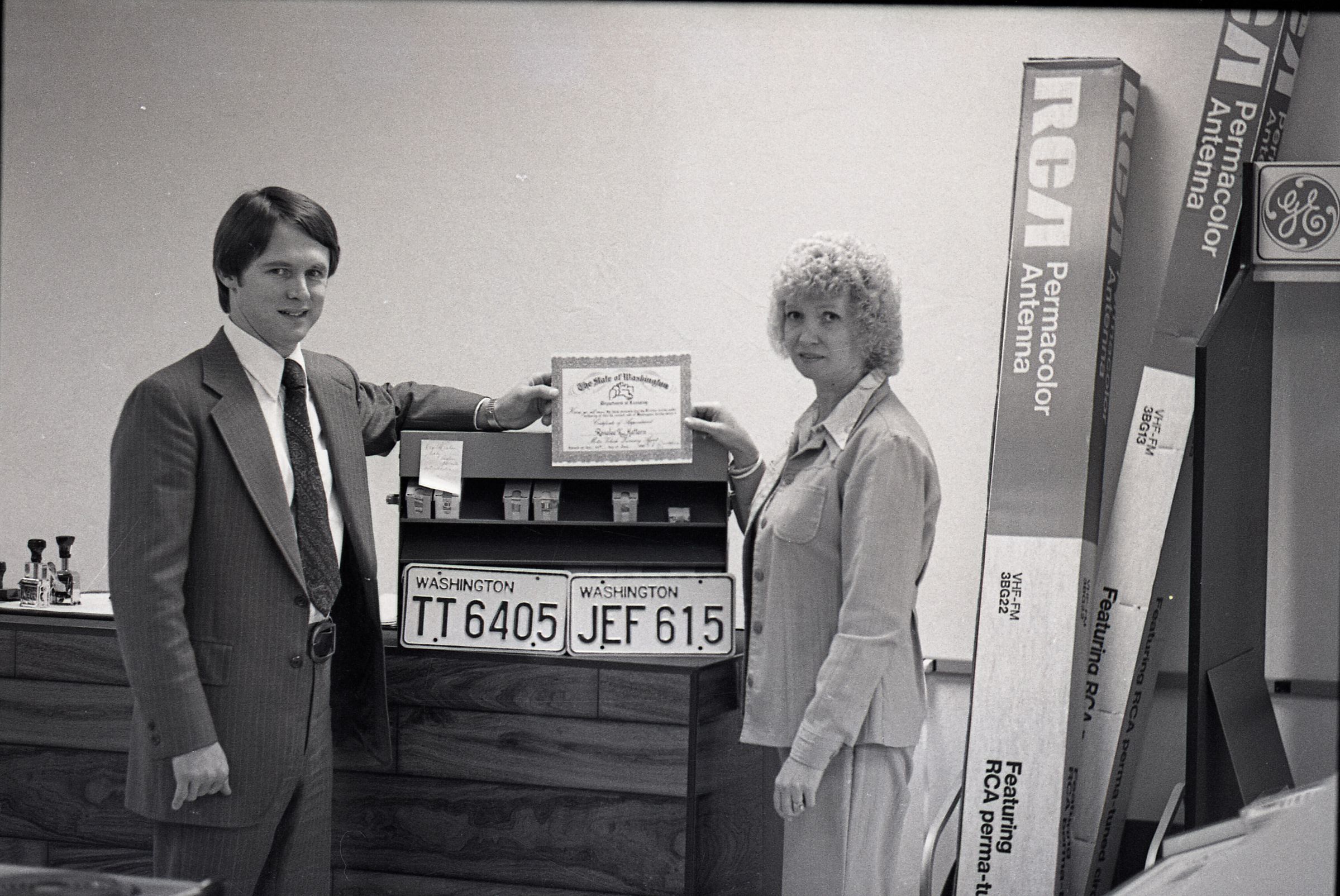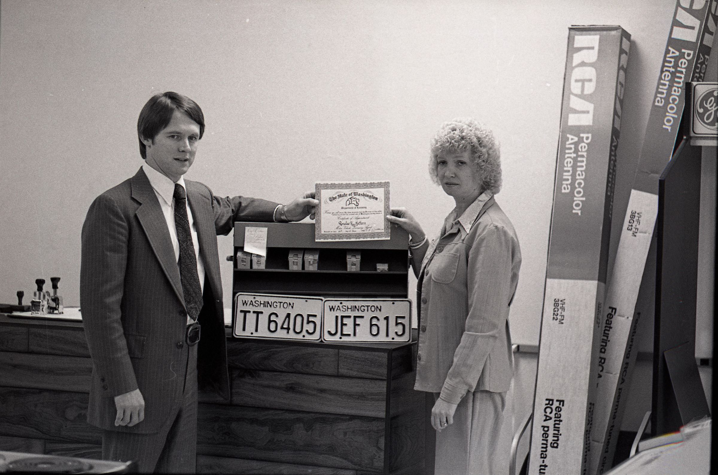 These 2 negative strips were made for the Lacey Leader Newspaper. Featured in these photos are 2 scenes. One is a set of photos of a woman handing a business certificate to a young man (Sam Reed) for a license renewal agency at McKinney Appliance 6723 Martin Way. The other set of photos features Sam Reed and a man described as Garry, standing in front of a large desk, containing a built in monitor. Frames 15, 16, 17, and 18 are all nearly identical photos of Sam Reed in the bottom left of the frame and a man named Greg behind him on the right. Frame 18 is different from the rest because Sam Reed is smiling. Sam is holding a booklet of papers in his left hand and gesturing with the same hand toward the monitor in front of him. Sam is wearing a nametag on a long sleeve button up shirt and dark slacks. To his right Garry is looking downward toward the monitor in front of him. His left hand is on the desk. He has a beard and is wearing a jacket over a button up shit, with a polka dot bowtie. It appears that he may be wearing bell bottom pants. Frame 17 and 18 Sam Reed (left) and Ronalee Mattern (right) are standing in front of a wooden desk and both holding a certificate of appointment from the Washington State Department of Licensing for Ronalee K Mattern (not Matten as is written on in the title). The pair are both facing slightly inward toward each other and looking in the direction of the camera. There are two Washington State license plates below the certificate that the pair is holding the first license plate (left) reads "TT6405" and the second reads "JEF615". To the left of the two people are several stamps and to the right are boxes of RCA antennas. Frames 19, 20, and 21 are identical photos that are very similar to frames 17 and 18, except that the pair are shaking hands while looking at each other, instead of the camera.